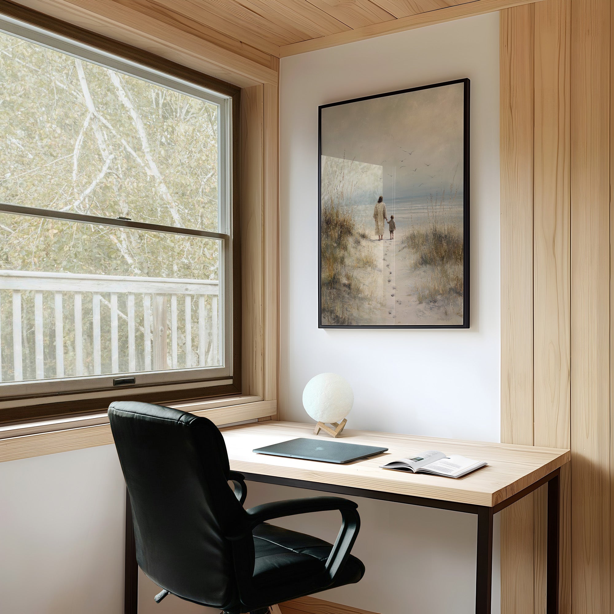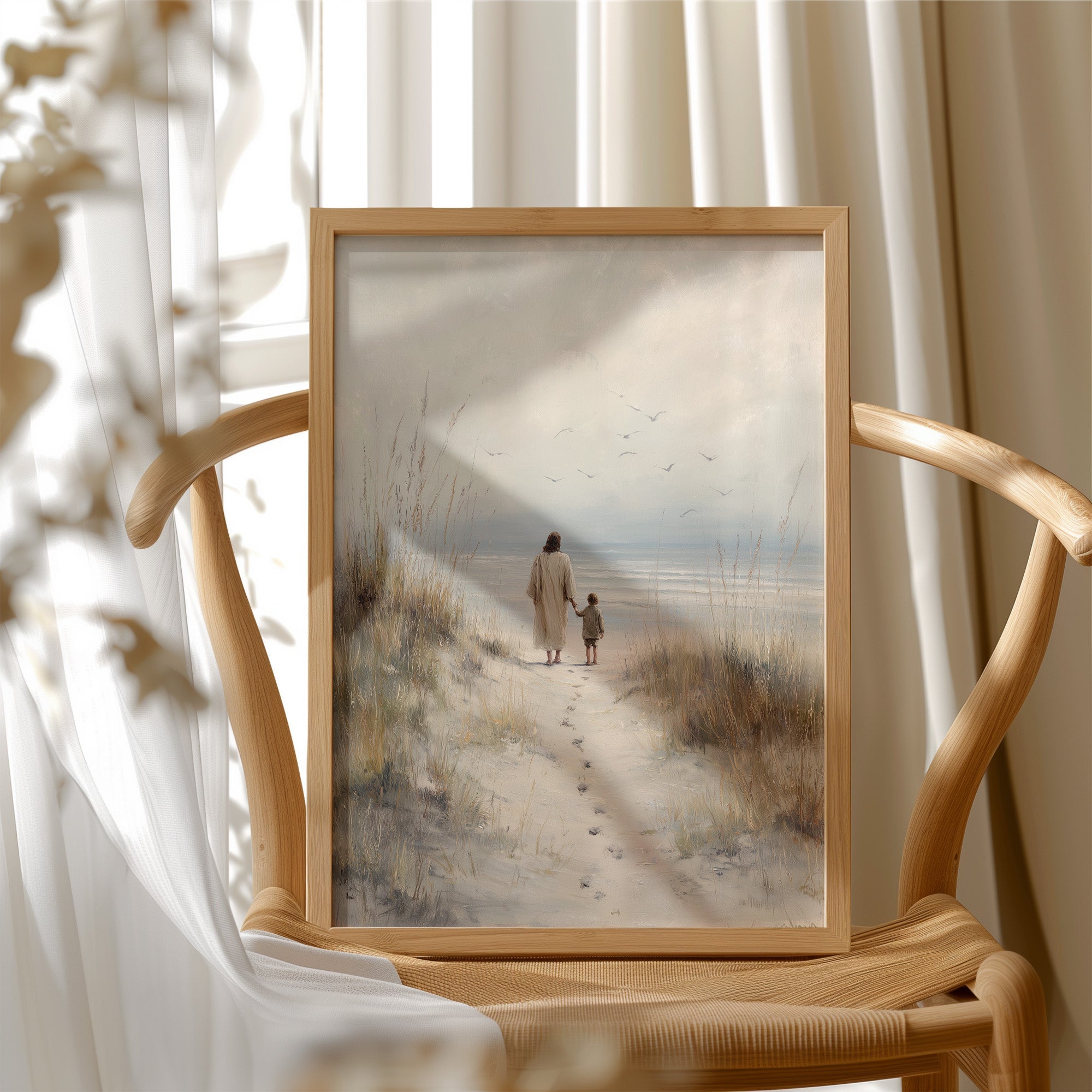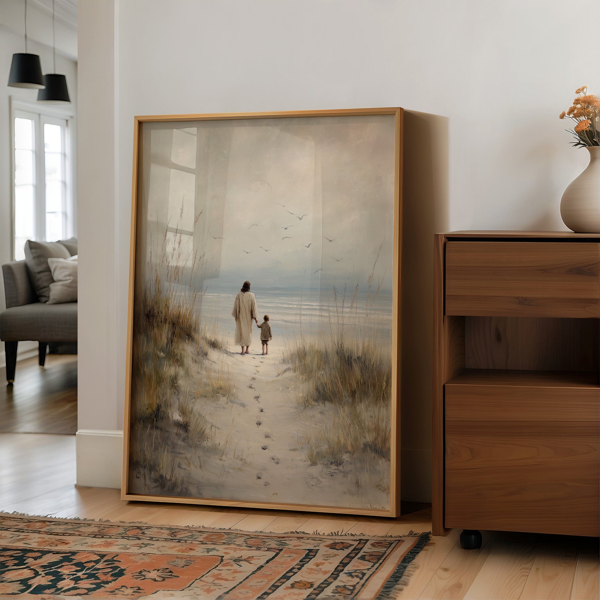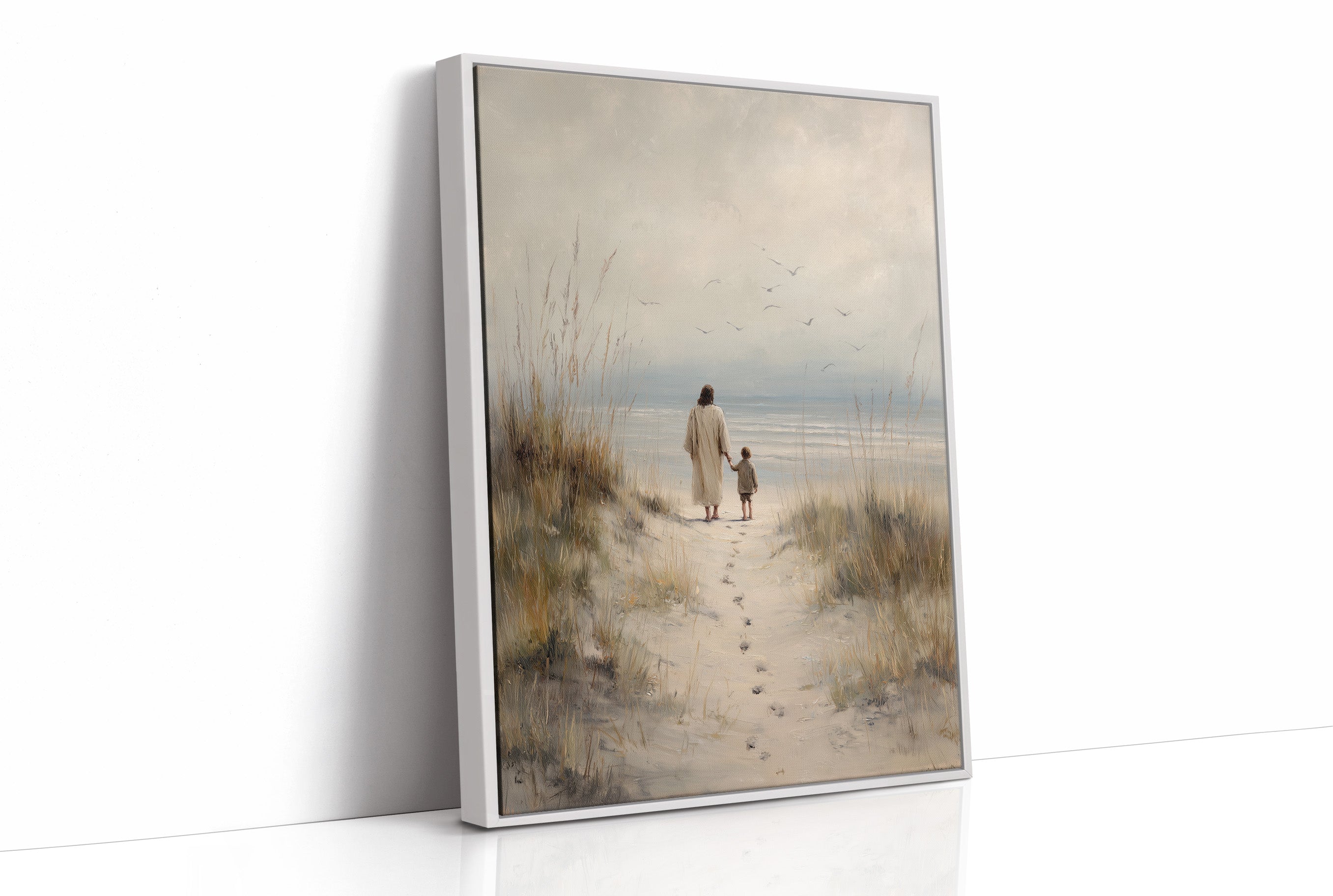 Gentle morning light bathes the sandy path where two figures walk hand in hand toward the endless horizon. Coastal grasses sway in the salt-tinged breeze, framing their journey through dunes that have witnessed countless stories. The muted palette of ivory, soft blue, and wheat creates a timeless scene of connection between generations, their footprints trailing behind as testament to shared moments. This serene coastal narrative brings tranquil elegance to living rooms or bedrooms where quiet contemplation is treasured.