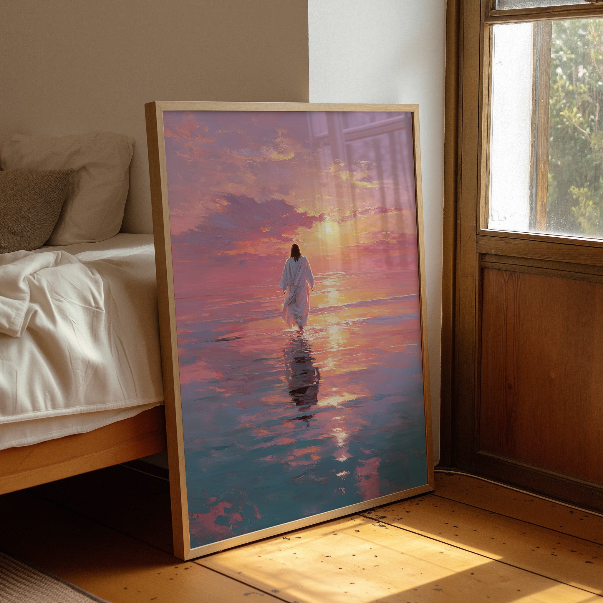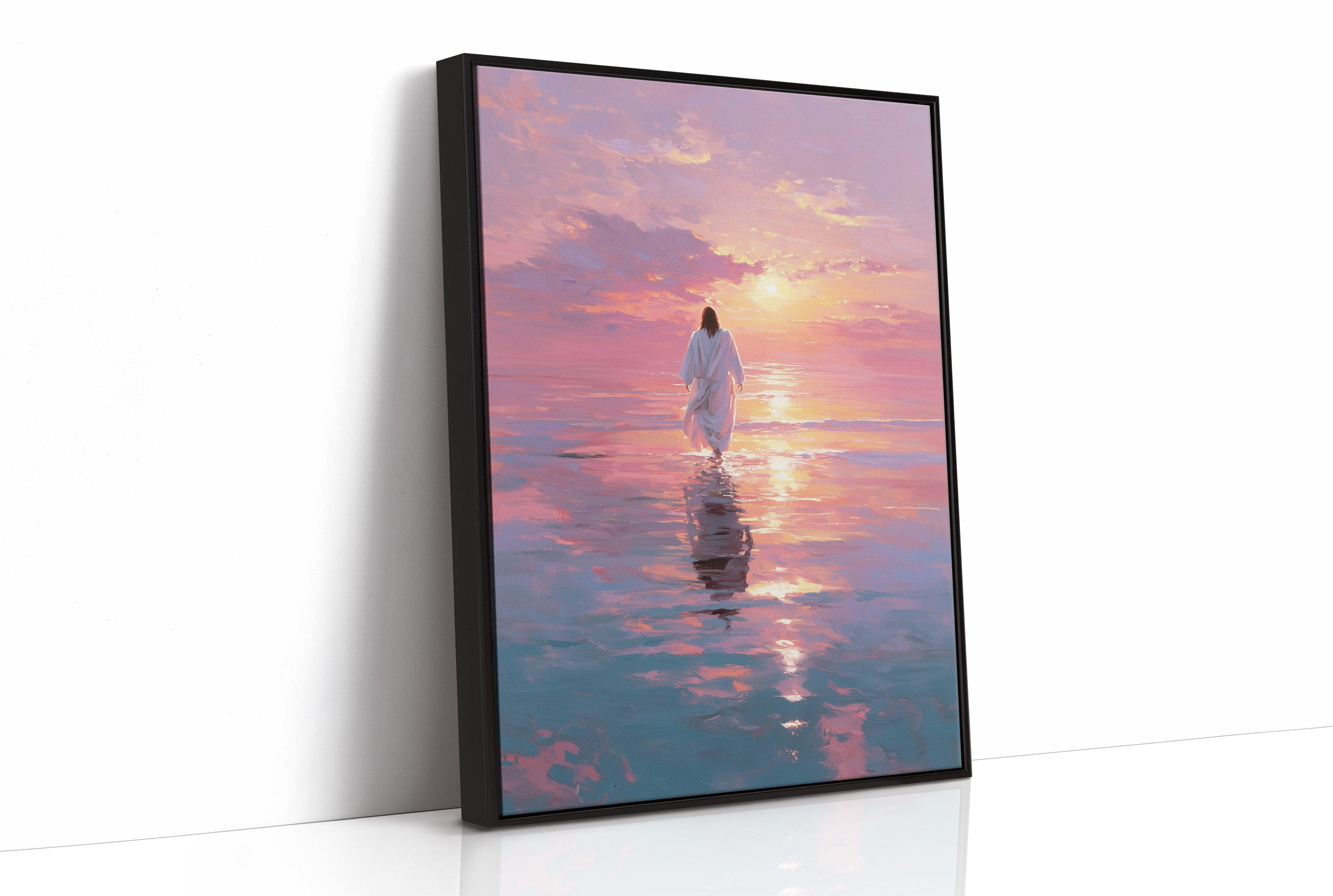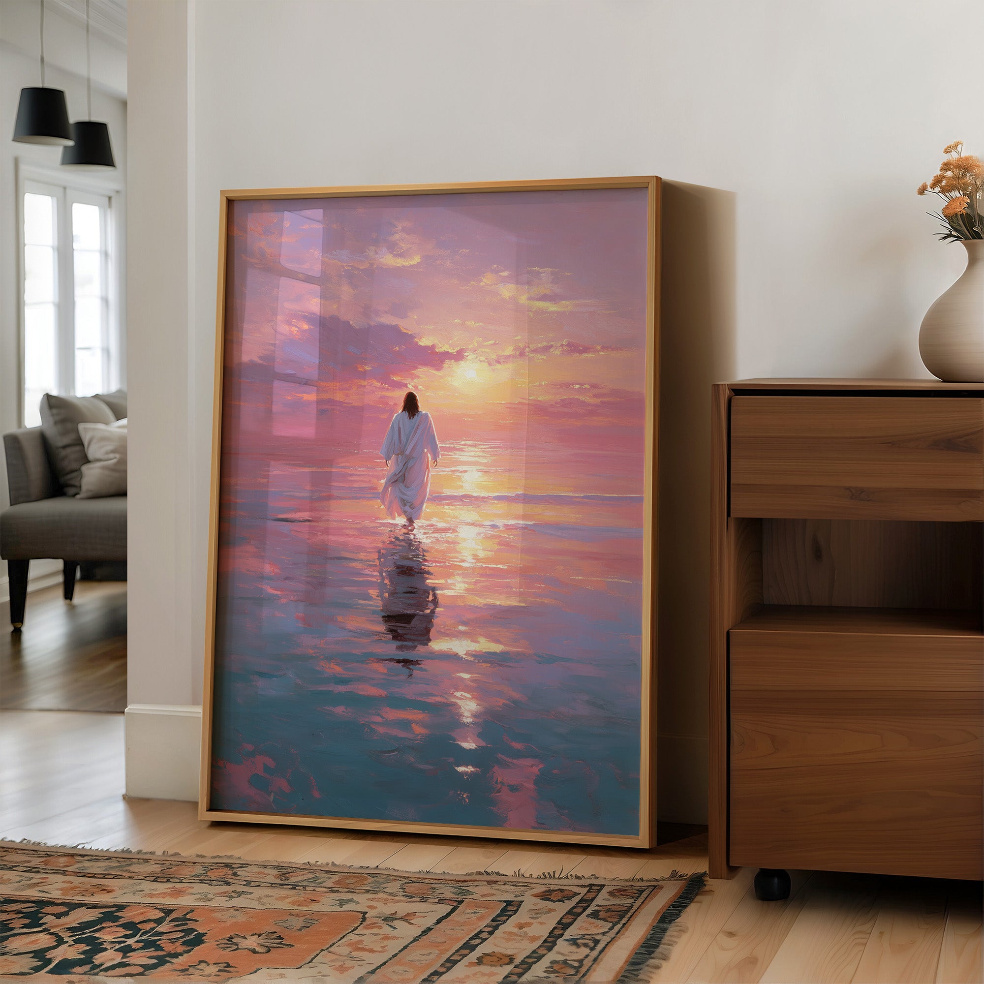 A solitary figure treads across a mirror-like sea painted in extraordinary hues of lavender, rose, and gold. The horizon melts where water meets sky, creating a transcendent moment where reality seems suspended in tranquil beauty. Gentle brushstrokes capture the rippling reflections dancing beneath white robes, suggesting both serenity and purpose in this journey across the illuminated waters. This piece brings a sense of peaceful contemplation to any living space, particularly perfect for a meditation corner or as a centering focal point in a bedroom.