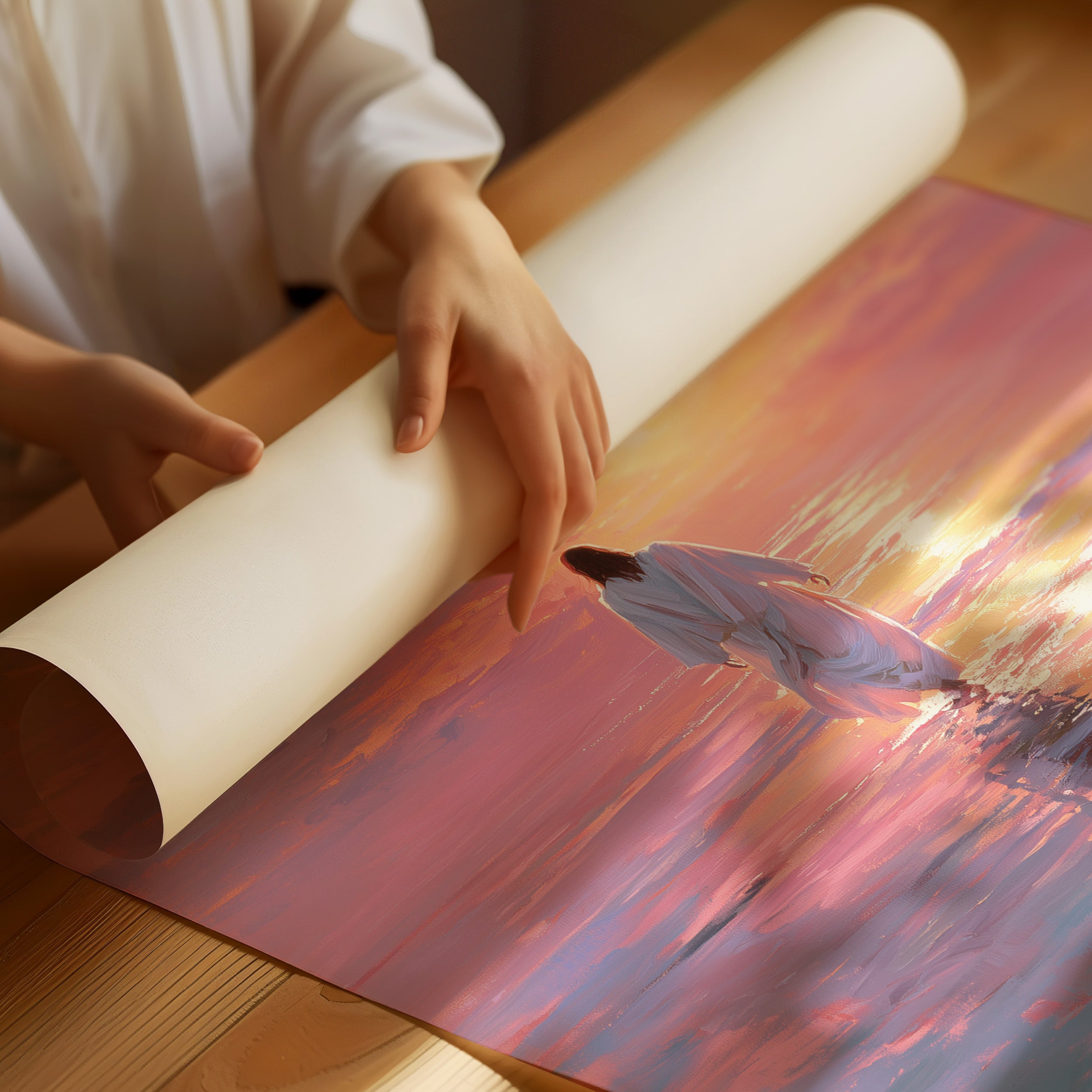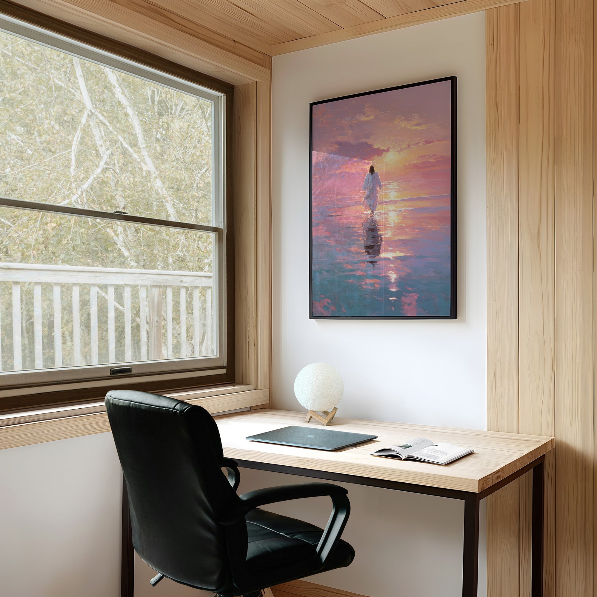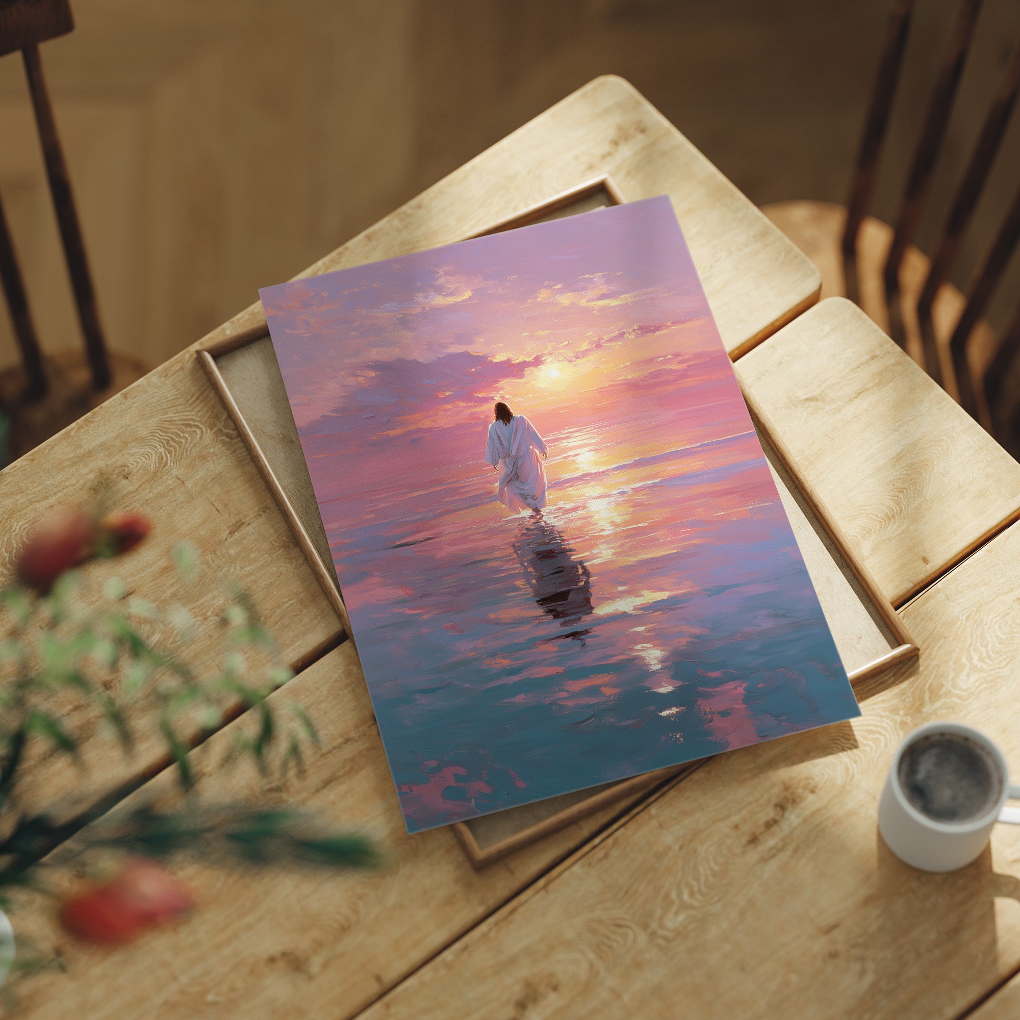 A solitary figure treads across a mirror-like sea painted in extraordinary hues of lavender, rose, and gold. The horizon melts where water meets sky, creating a transcendent moment where reality seems suspended in tranquil beauty. Gentle brushstrokes capture the rippling reflections dancing beneath white robes, suggesting both serenity and purpose in this journey across the illuminated waters. This piece brings a sense of peaceful contemplation to any living space, particularly perfect for a meditation corner or as a centering focal point in a bedroom.