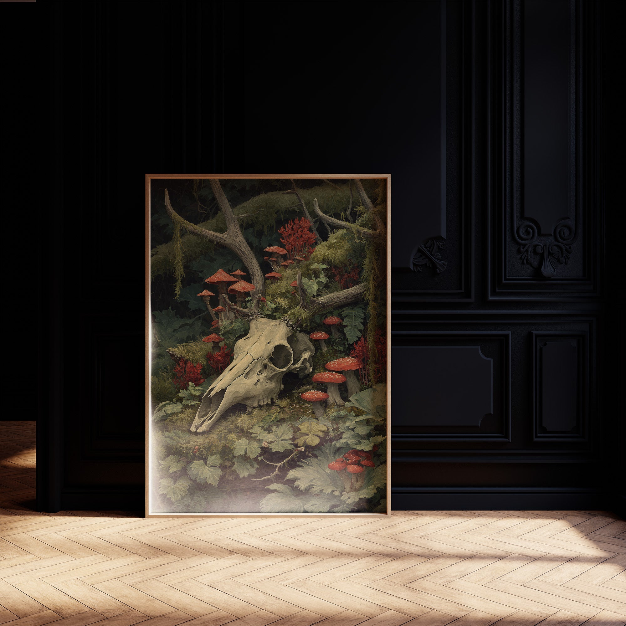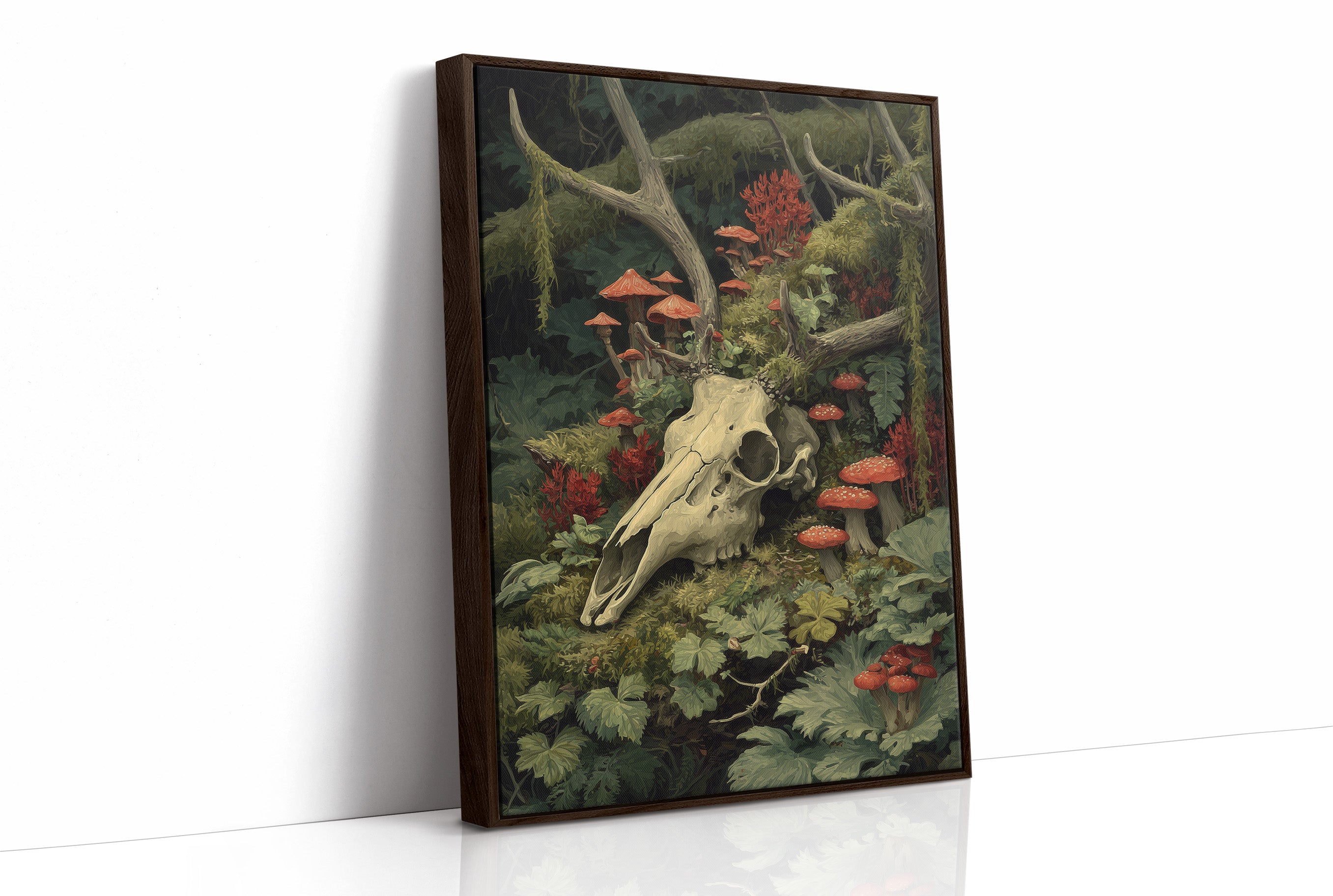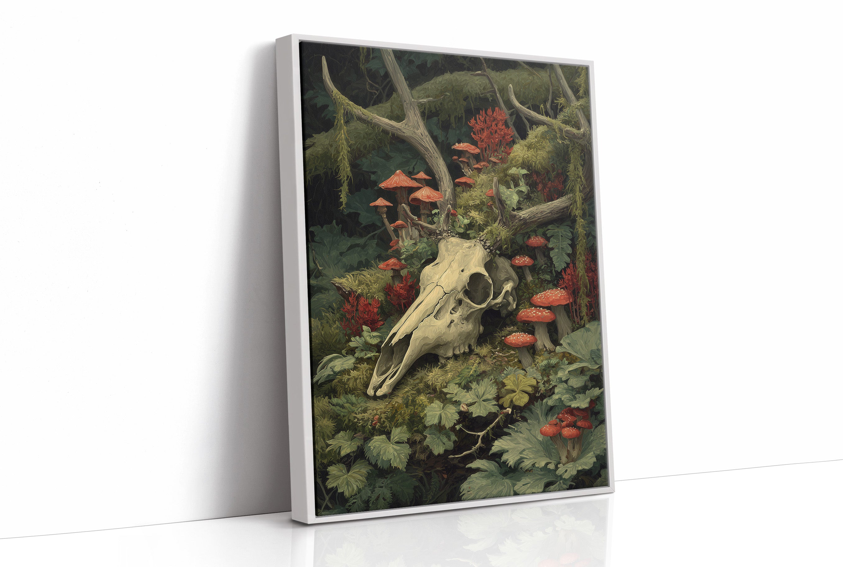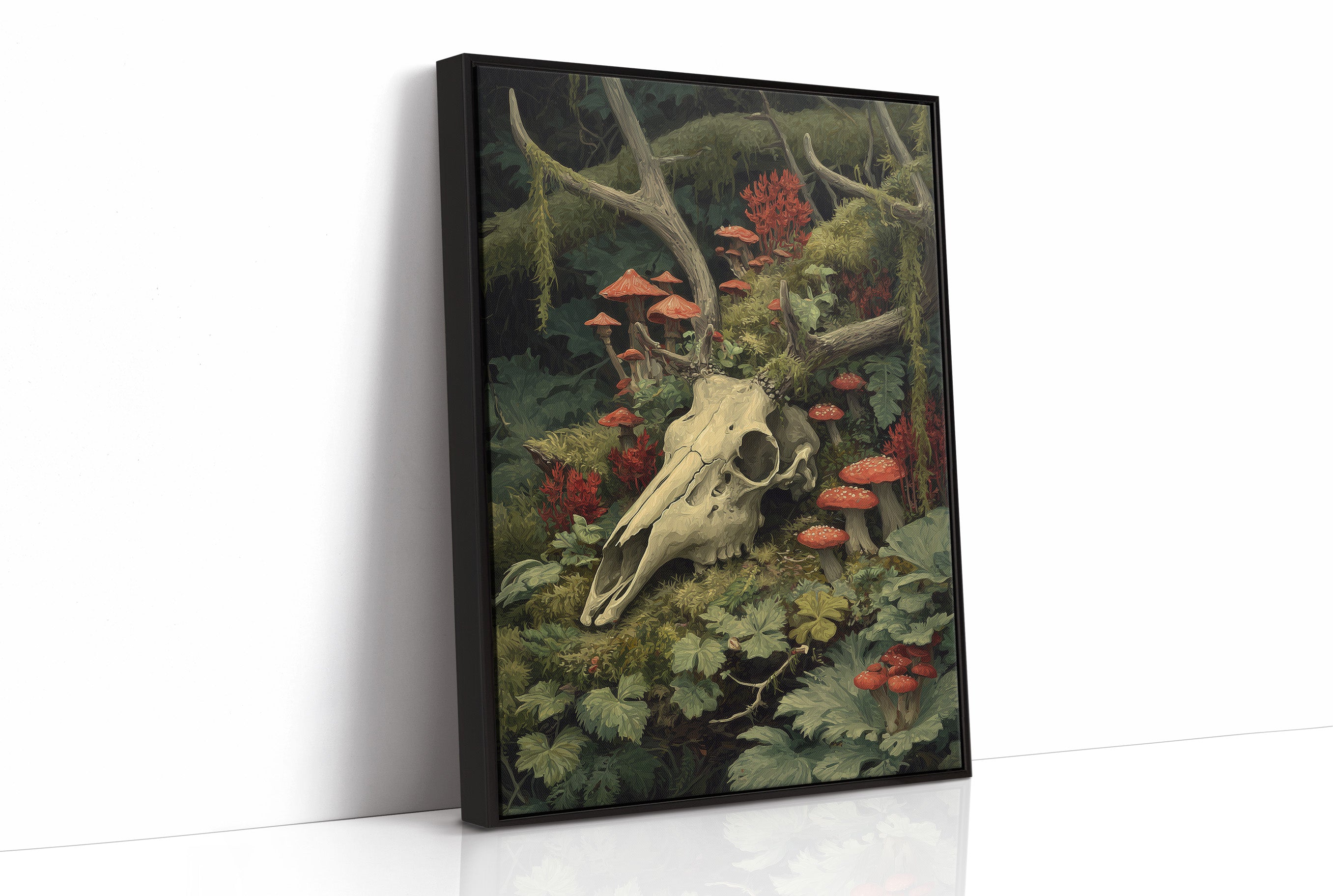 Crimson mushrooms punctuate the verdant forest floor, life emerging from decay in perfect balance. The bleached deer skull rests among moss-covered branches and delicate ferns, its hollow eyes witnessing the quiet persistence of nature's cycle. Rich emerald foliage cradles vibrant red toadstools, creating a hauntingly beautiful tableau of mortality and rebirth. This striking piece brings dramatic natural history into sophisticated spaces. Perfect for a moody study, dramatic dining room, or as a bold statement in minimalist interiors where its rich woodland palette can command attention.