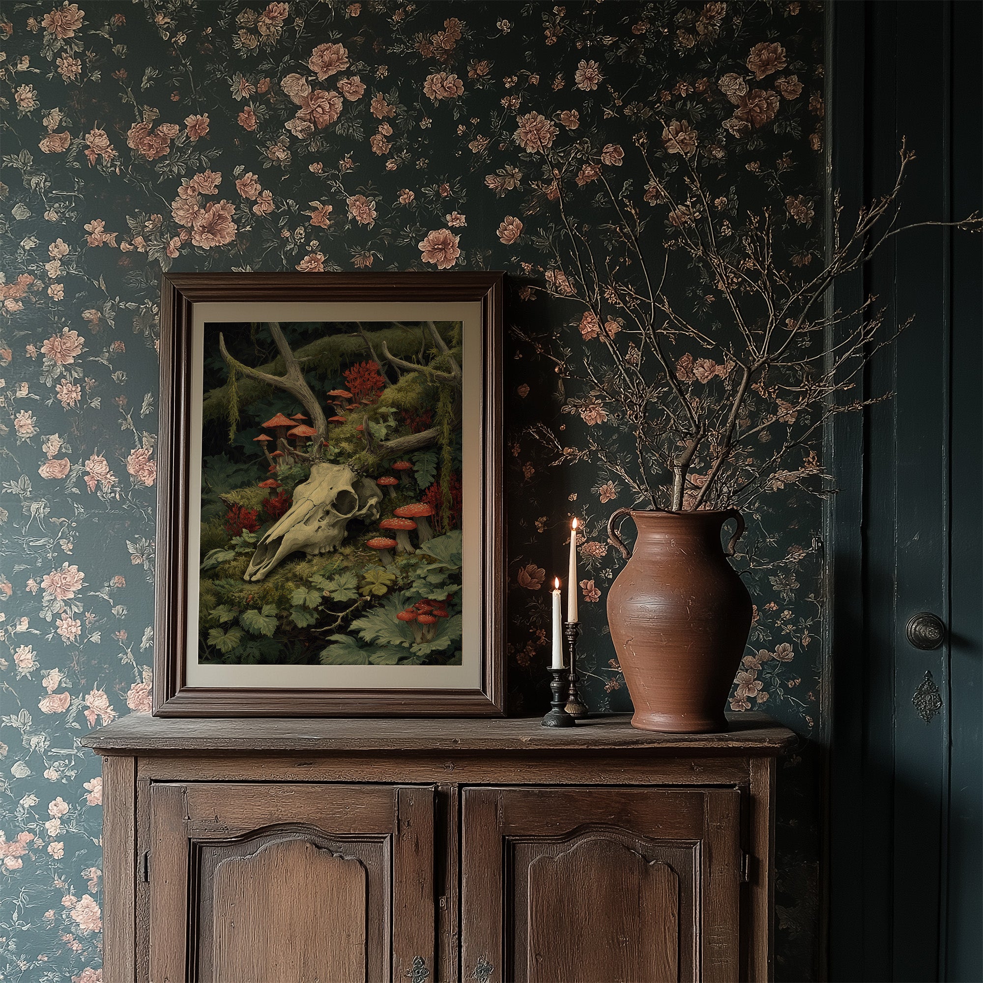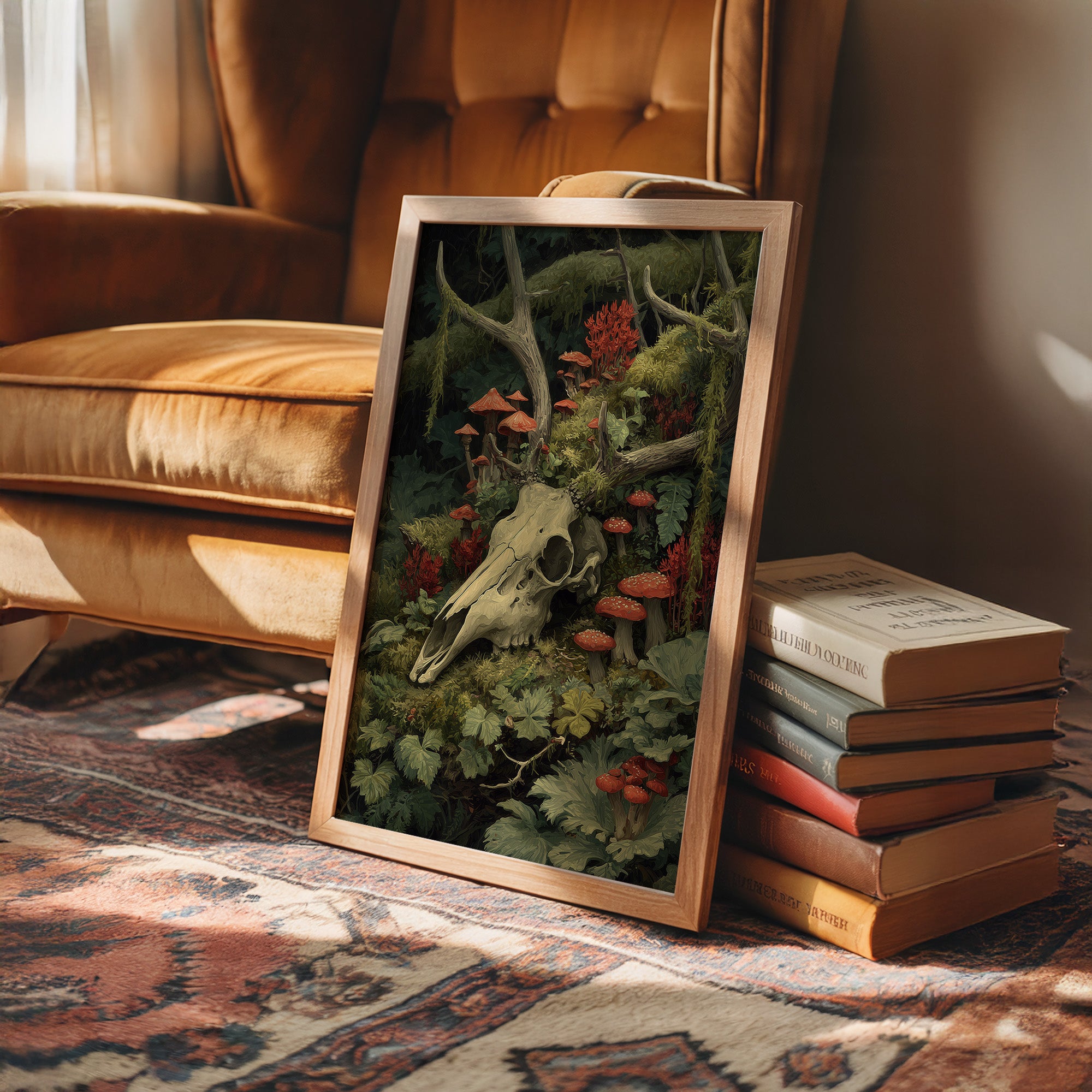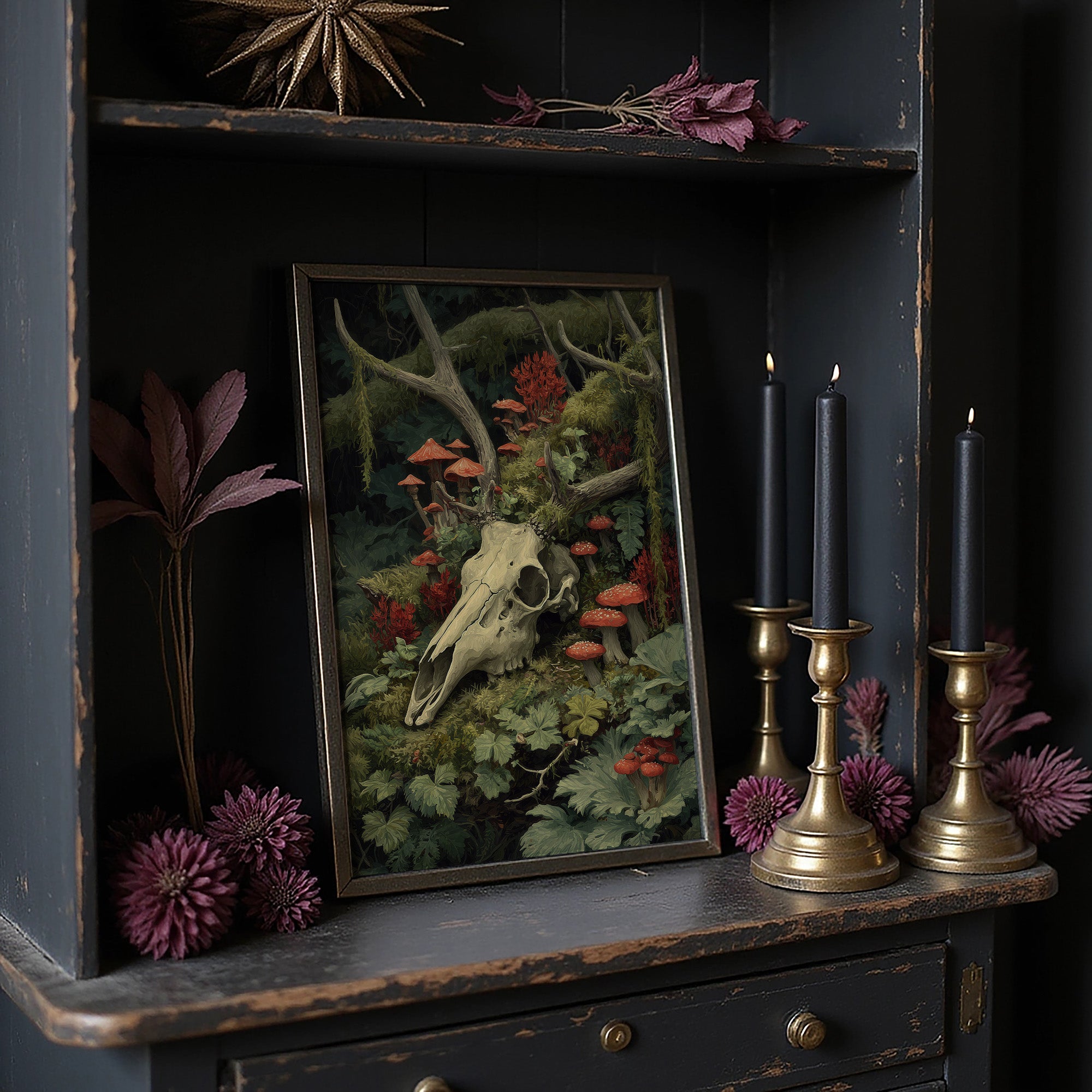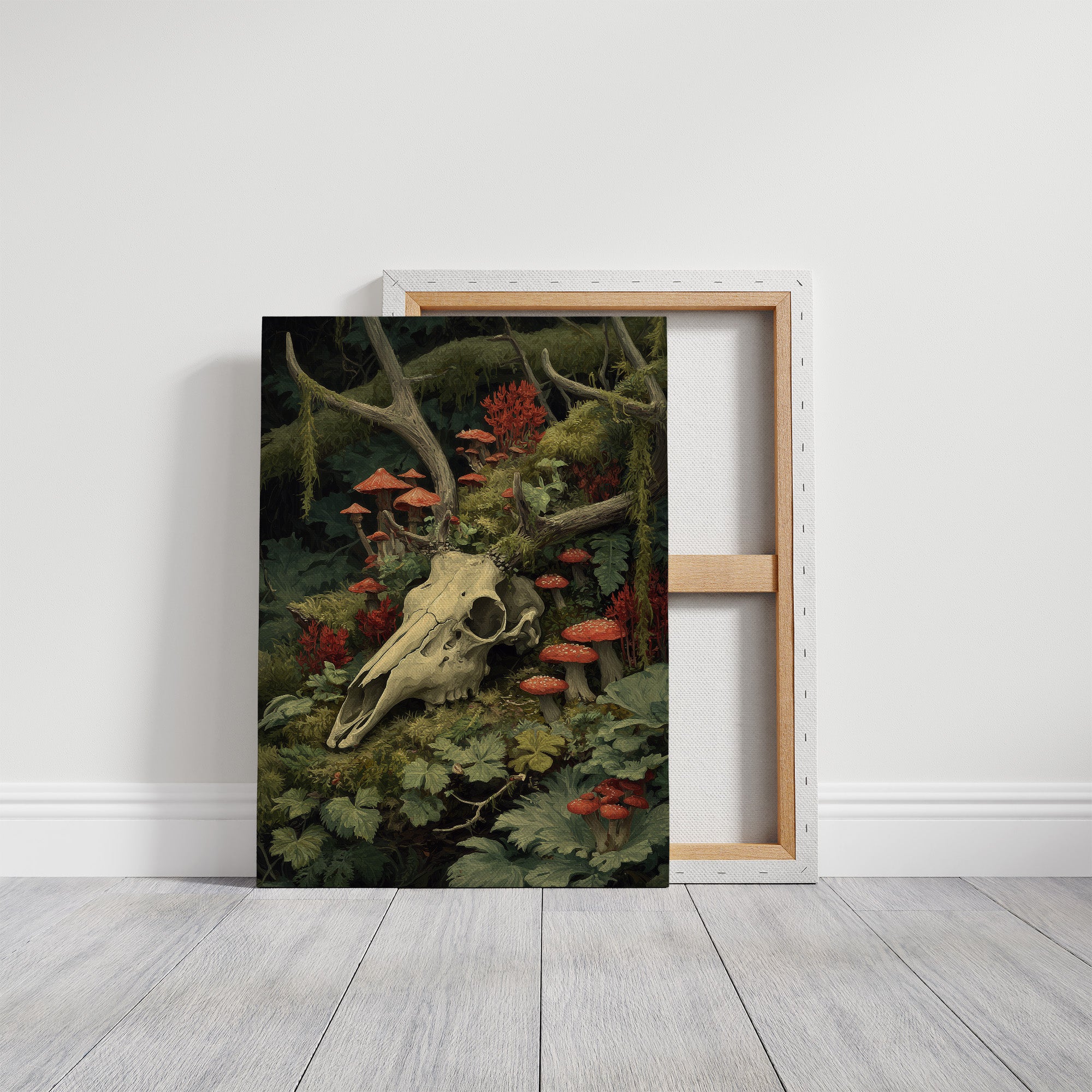 Crimson mushrooms punctuate the verdant forest floor, life emerging from decay in perfect balance. The bleached deer skull rests among moss-covered branches and delicate ferns, its hollow eyes witnessing the quiet persistence of nature's cycle. Rich emerald foliage cradles vibrant red toadstools, creating a hauntingly beautiful tableau of mortality and rebirth. This striking piece brings dramatic natural history into sophisticated spaces. Perfect for a moody study, dramatic dining room, or as a bold statement in minimalist interiors where its rich woodland palette can command attention.