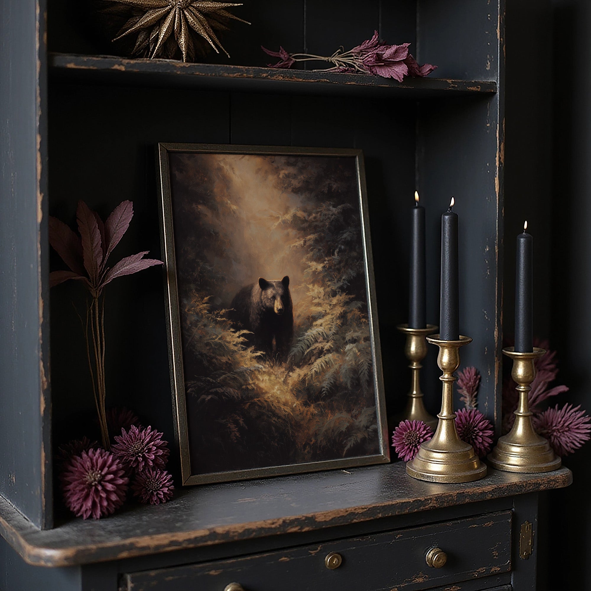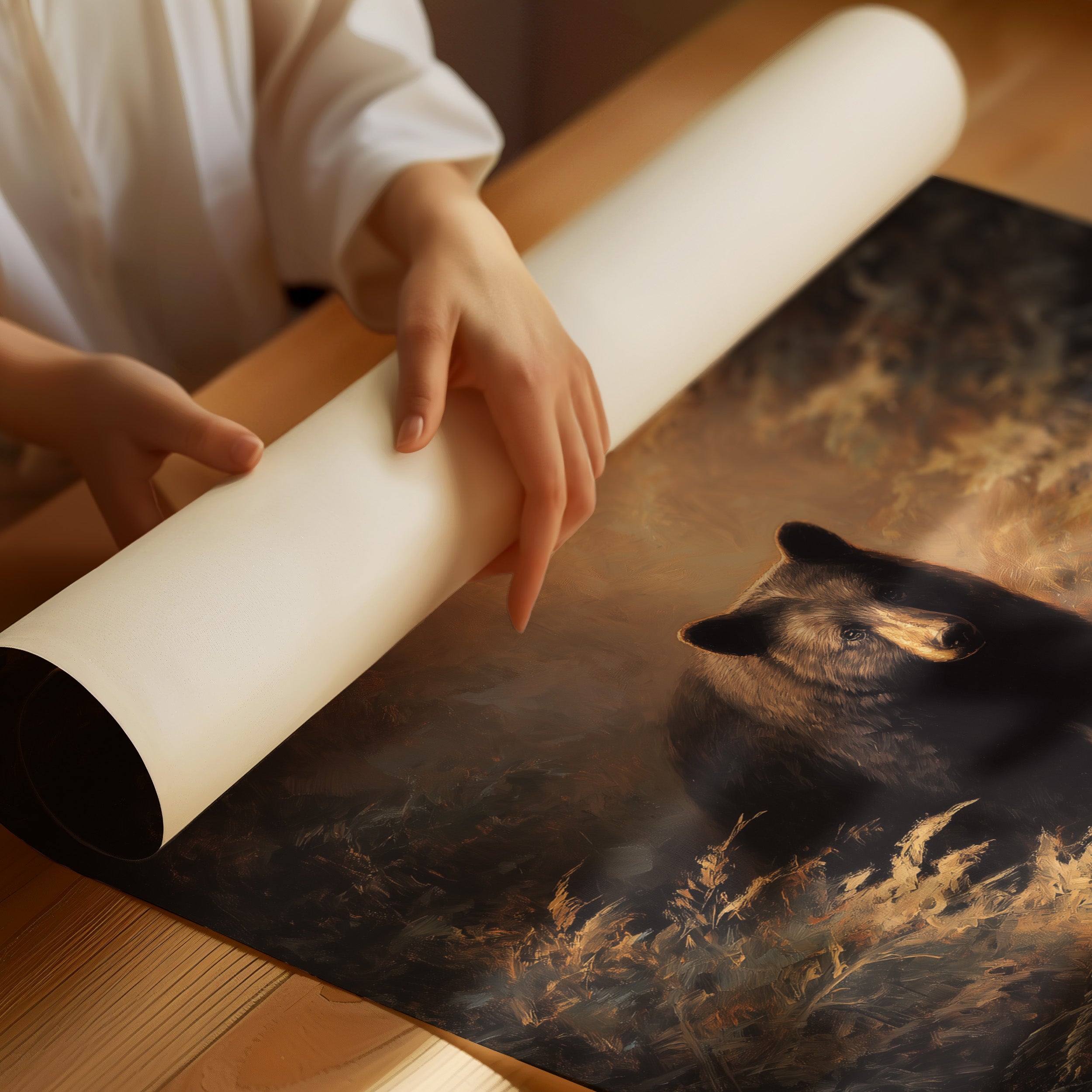 Golden light filters through ancient trees, illuminating the watchful gaze of a black bear as it emerges from the woodland shadows. The atmospheric painting captures that breathtaking moment when wilderness and majesty converge, with warm amber tones creating a dreamlike quality against the cool forest depths. This striking portrait brings untamed nature into refined spaces with quiet power.