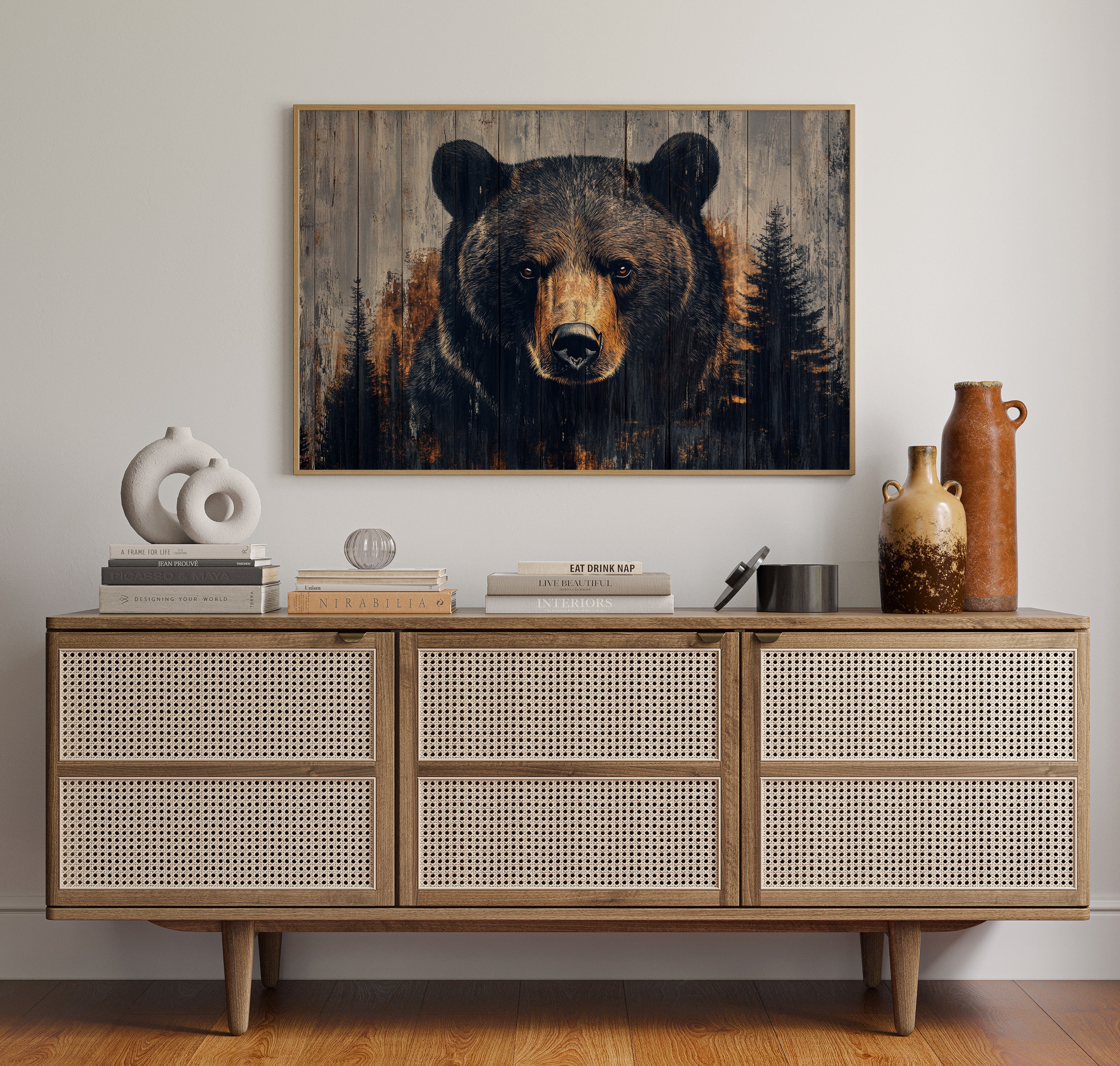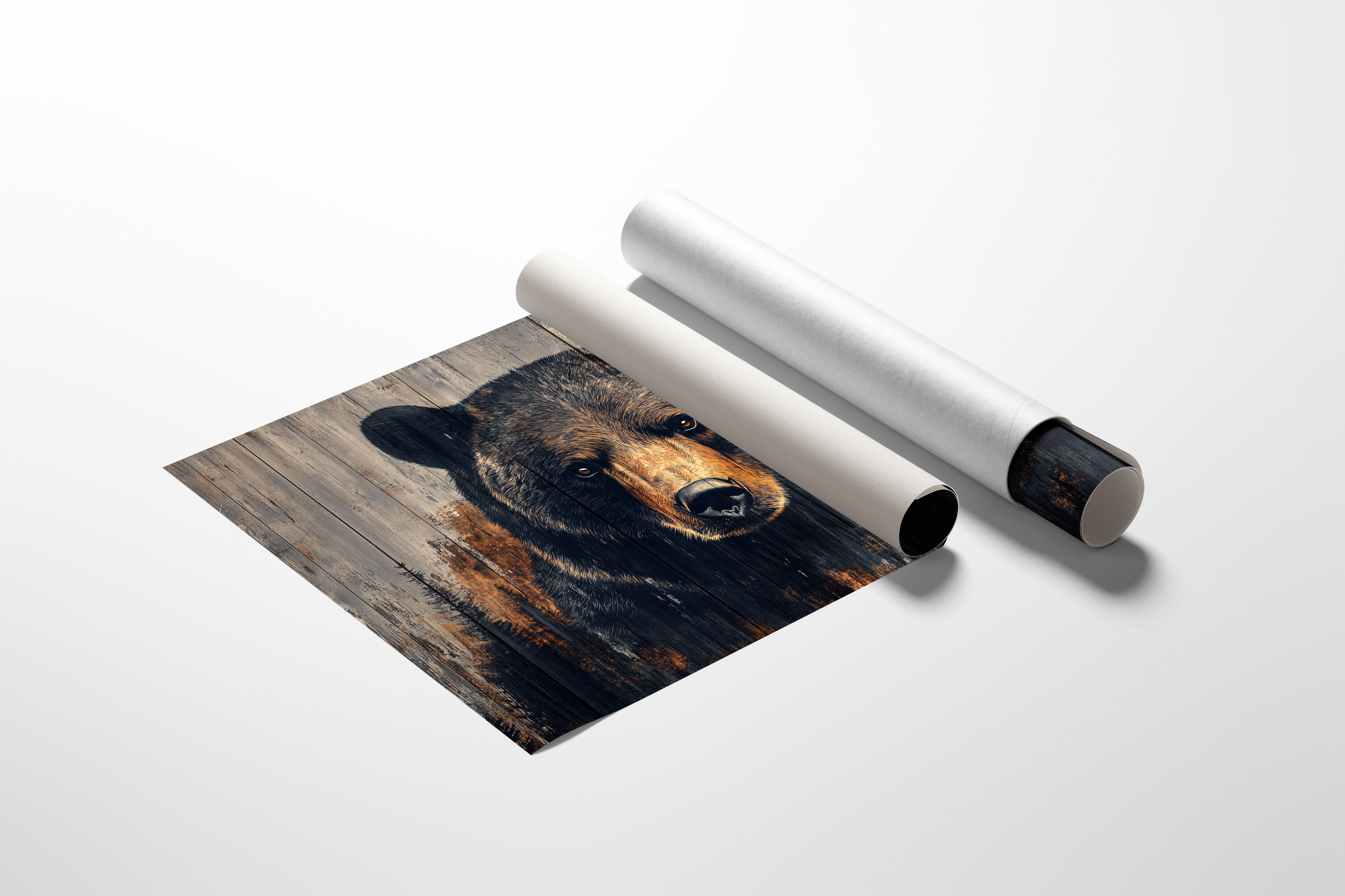 Piercing eyes meet yours through weathered planks, where a black bear's gaze holds centuries of wild wisdom. The textured fur catches amber light against dark wood, creating a striking contrast between untamed nature and rustic artistry. Pine silhouettes stand sentinel in the background, while copper-toned weathering creates an ethereal atmosphere that speaks to both strength and vulnerability.