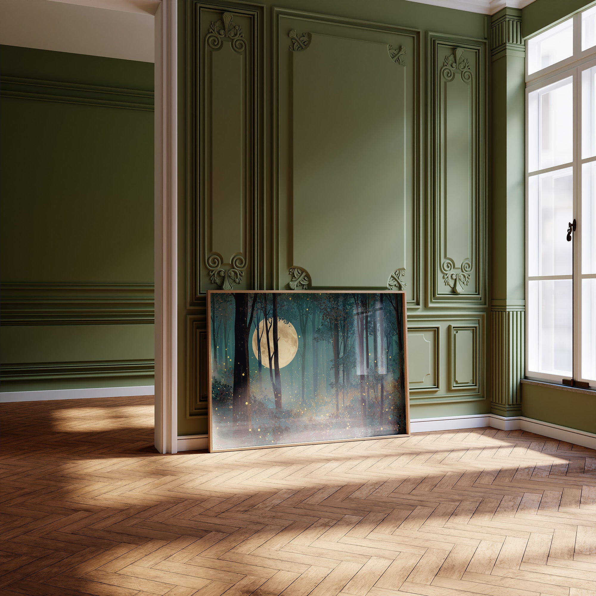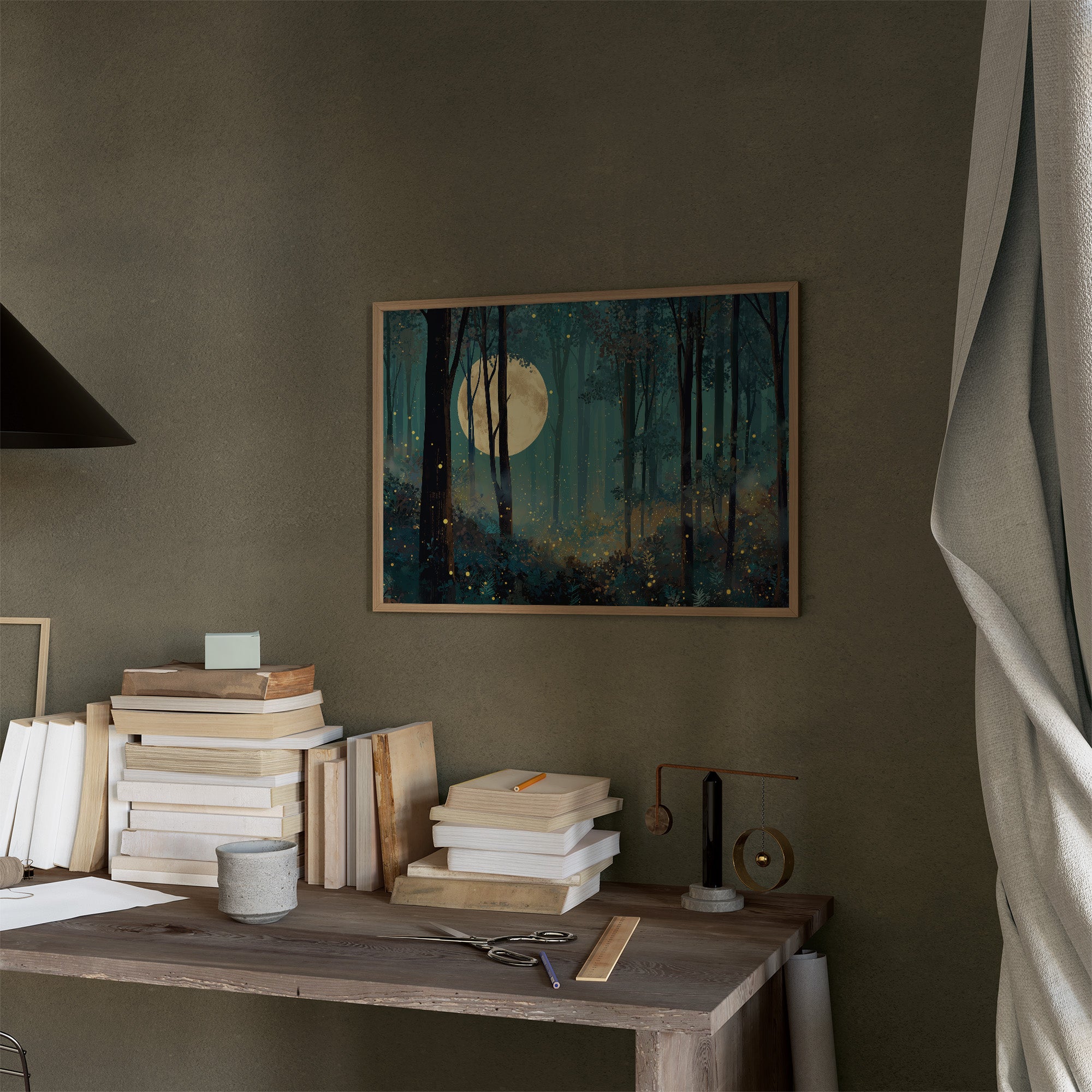 A tranquil forest bathes in the ethereal light of a full moon, where luminous fireflies dance like scattered stars among shadowy trees. Teal and turquoise hues blend with deep navy silhouettes, creating a mysterious woodland sanctuary where reality and fantasy converge. This contemplative scene rests elegantly against wooden bookshelves filled with literary treasures, bringing a touch of enchantment to a scholarly space.