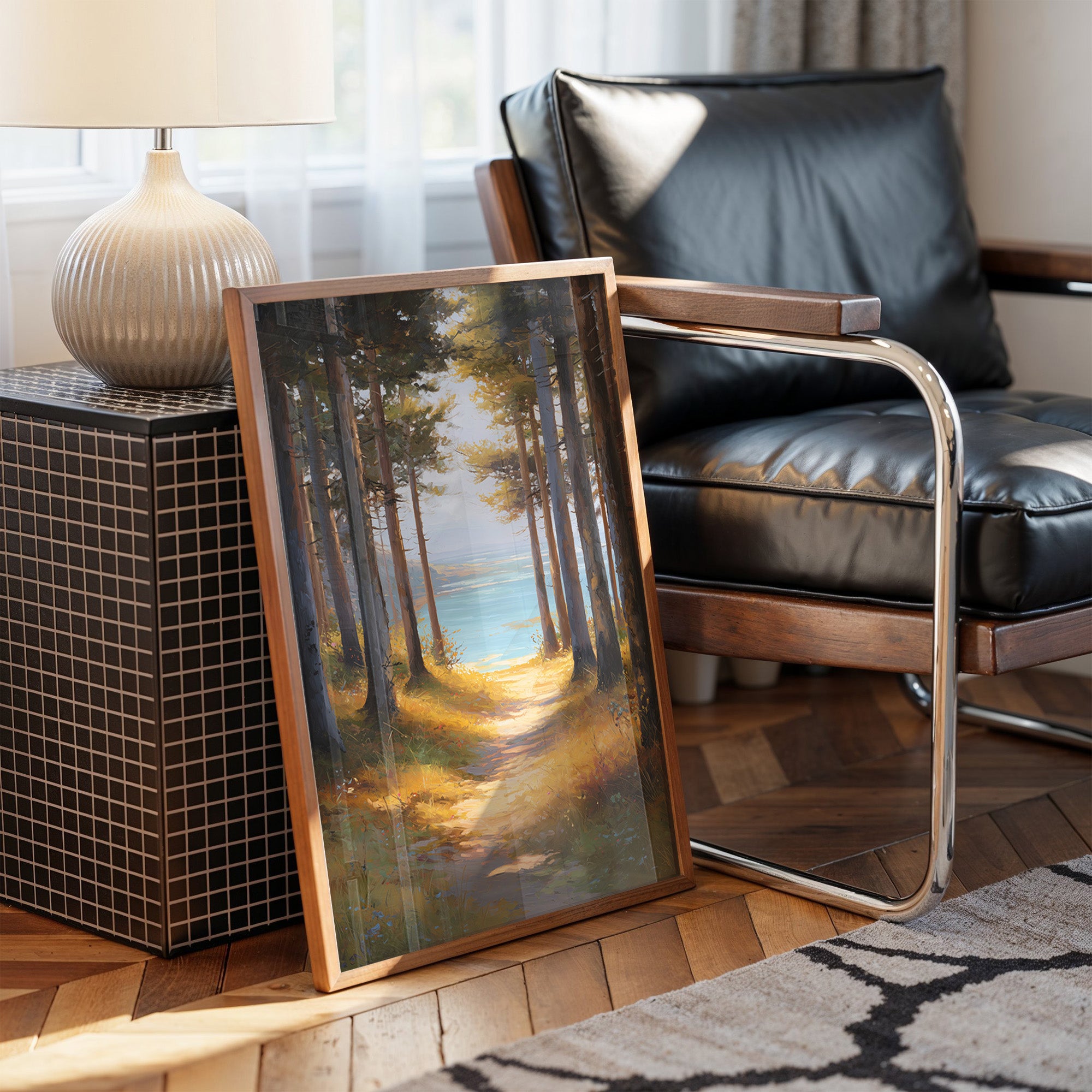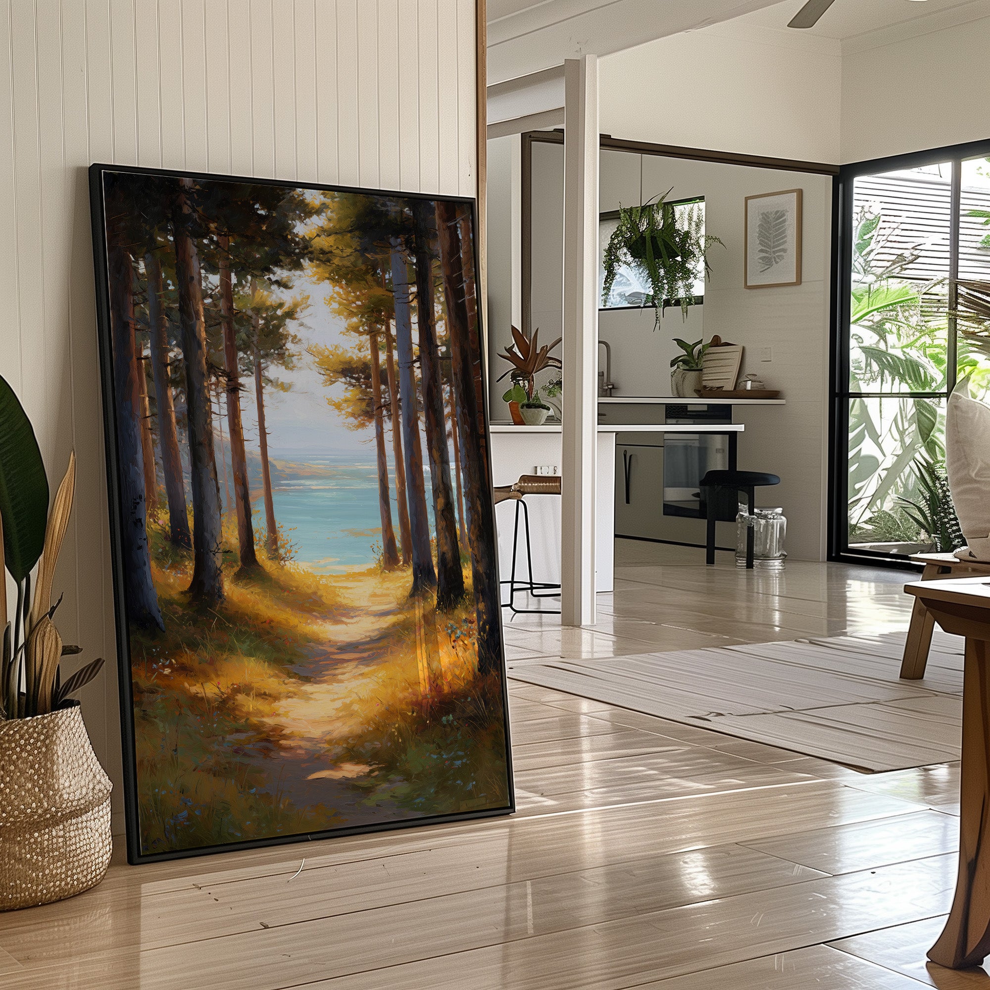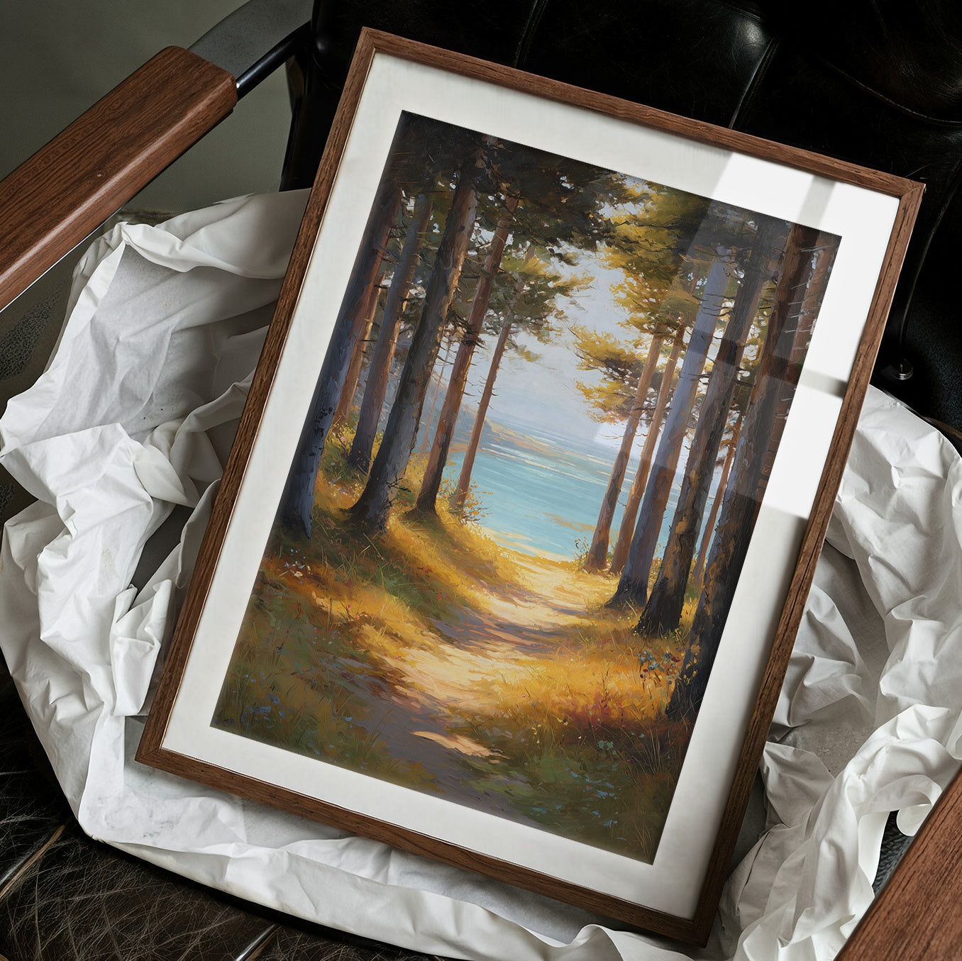 Sunlight filters through tall pines, illuminating a golden path that beckons toward tranquil blue waters. The warm amber forest floor contrasts with the cool turquoise lake glimpsed between the trees, creating a perfect moment of natural harmony. The painting captures that magical threshold where woodland meets shoreline, inviting the viewer to step into this serene escape. This piece brings a sense of calm adventure to a reading nook, home office, or any space where you dream of peaceful retreats.