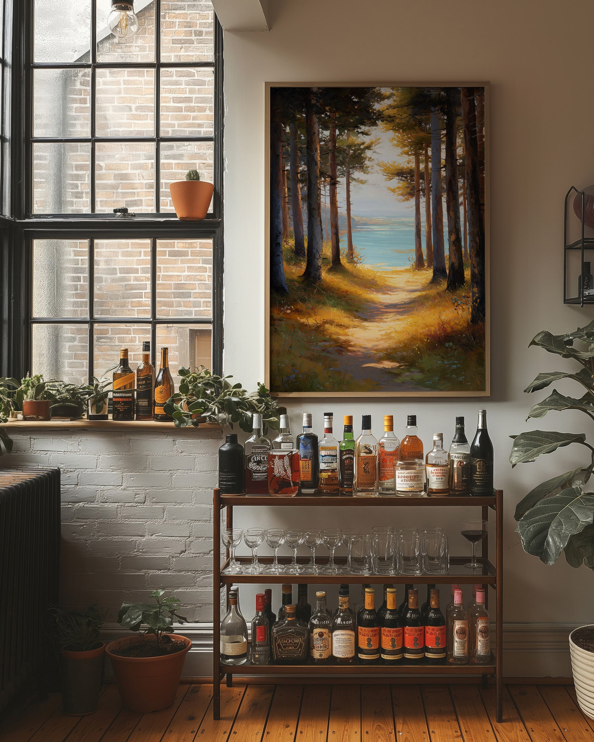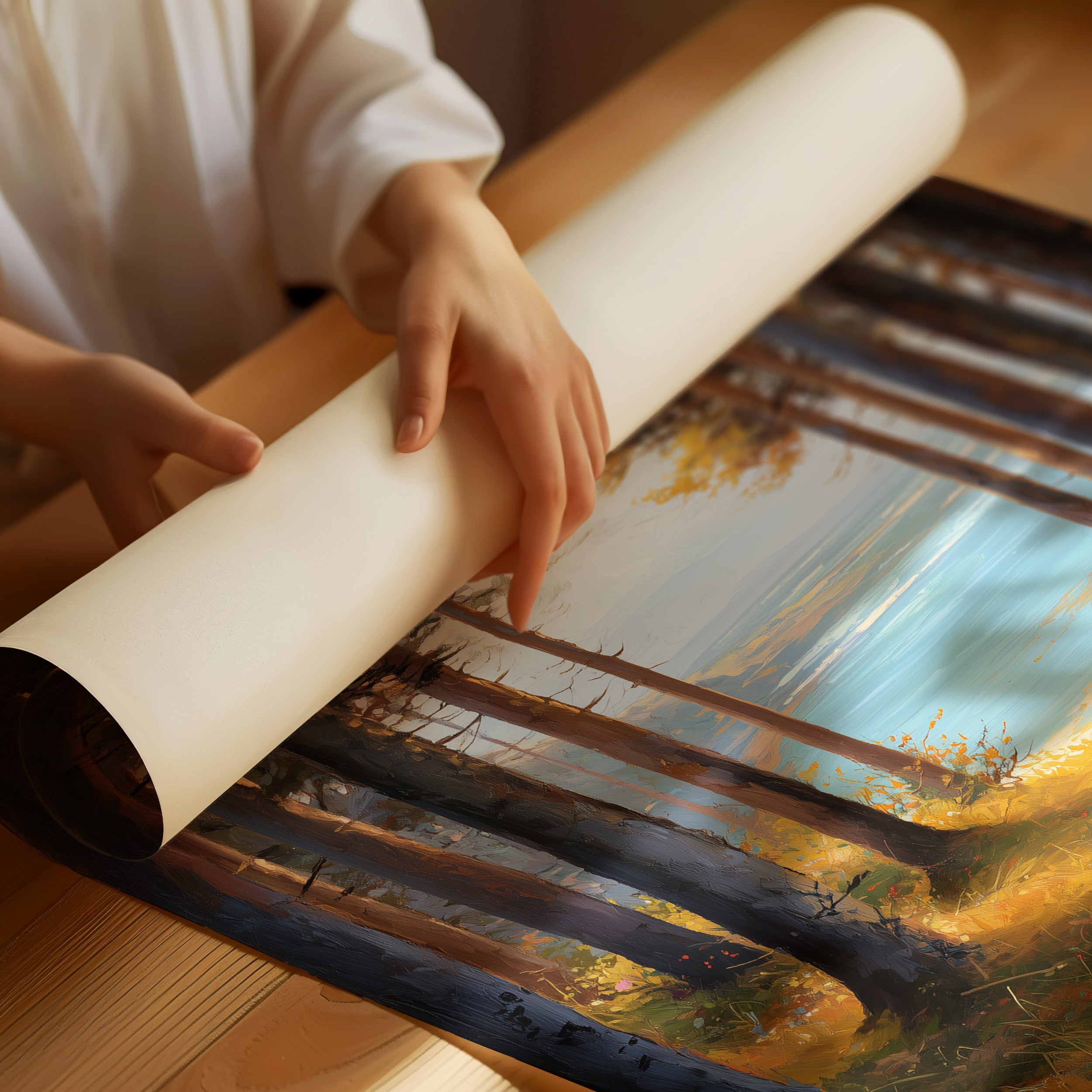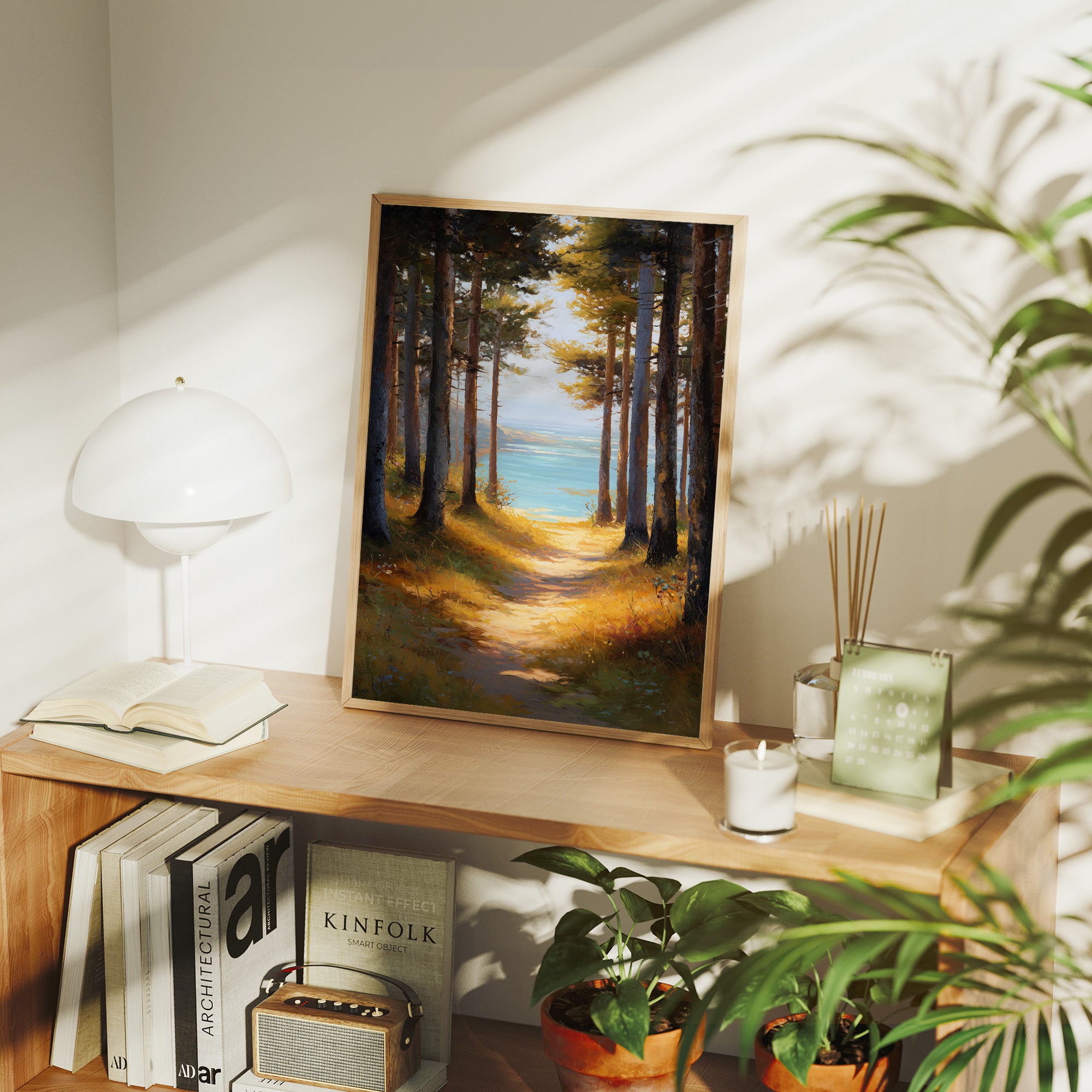 Sunlight filters through tall pines, illuminating a golden path that beckons toward tranquil blue waters. The warm amber forest floor contrasts with the cool turquoise lake glimpsed between the trees, creating a perfect moment of natural harmony. The painting captures that magical threshold where woodland meets shoreline, inviting the viewer to step into this serene escape. This piece brings a sense of calm adventure to a reading nook, home office, or any space where you dream of peaceful retreats.