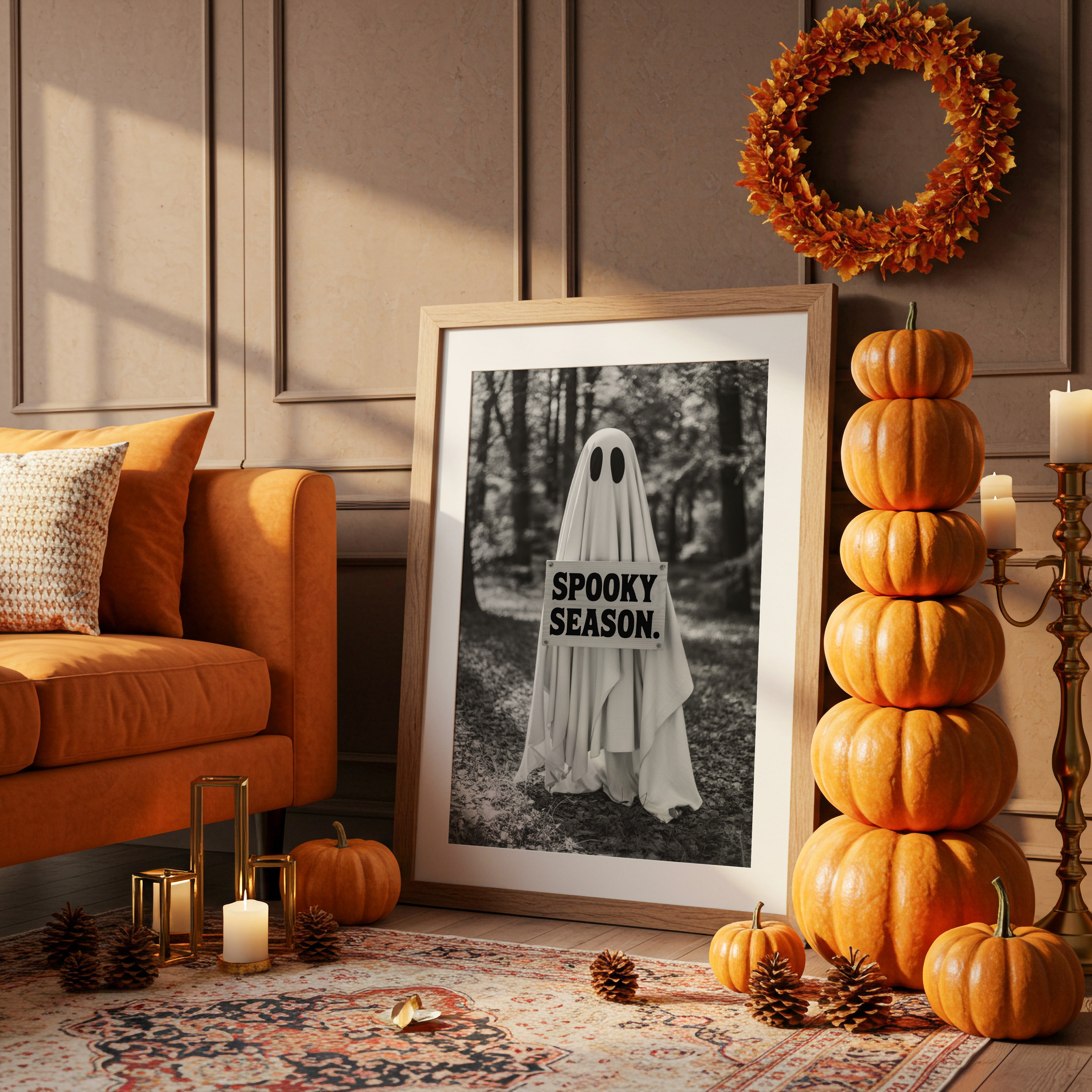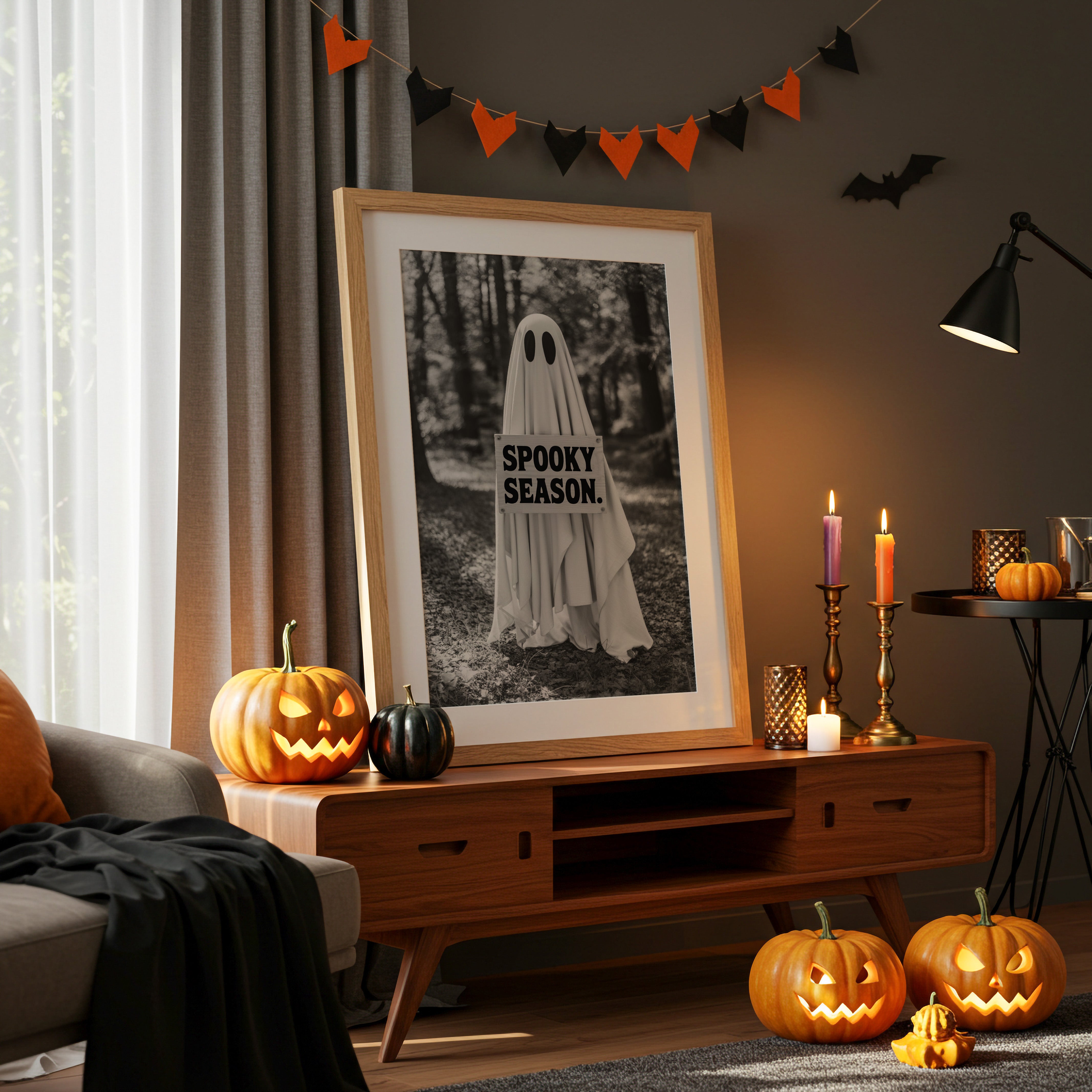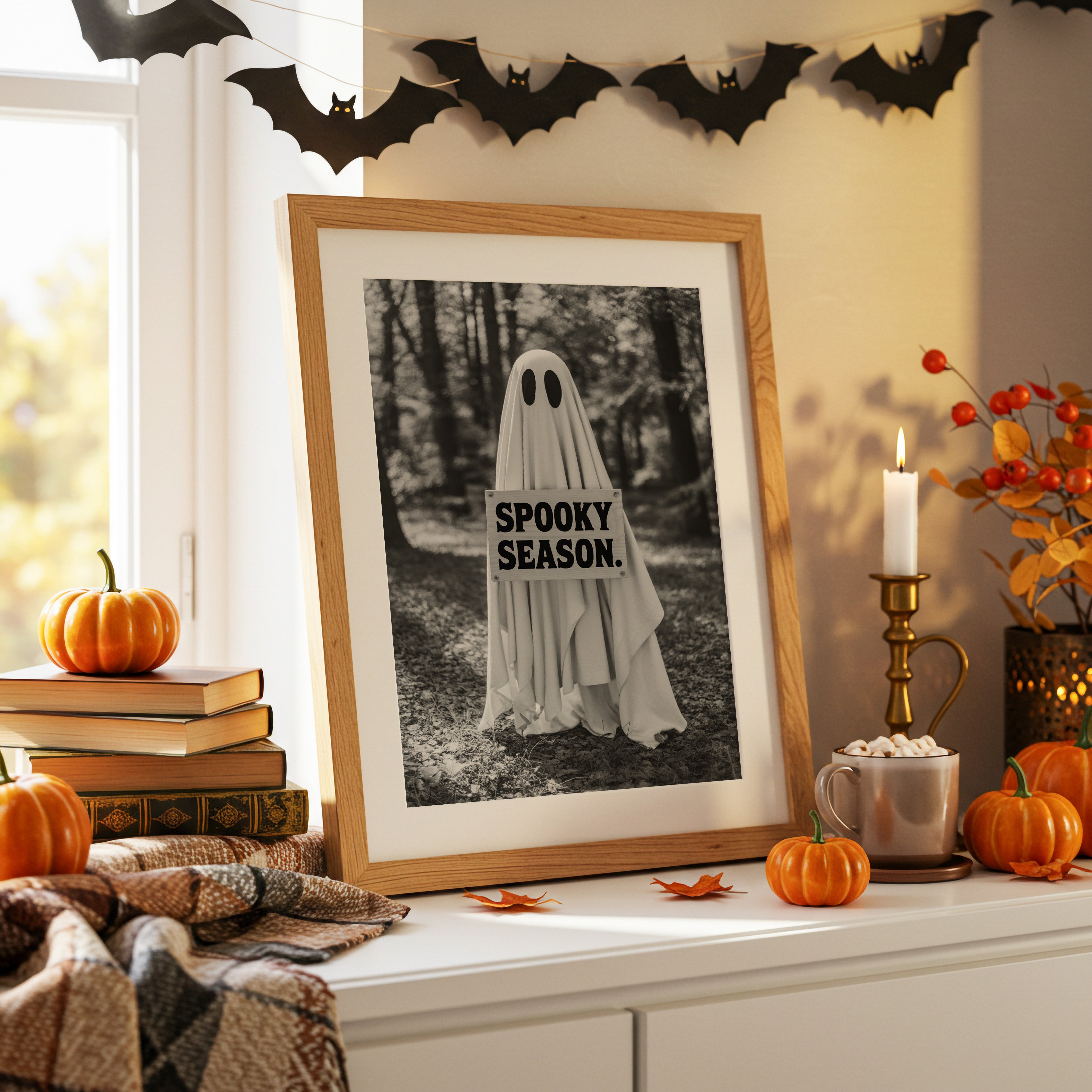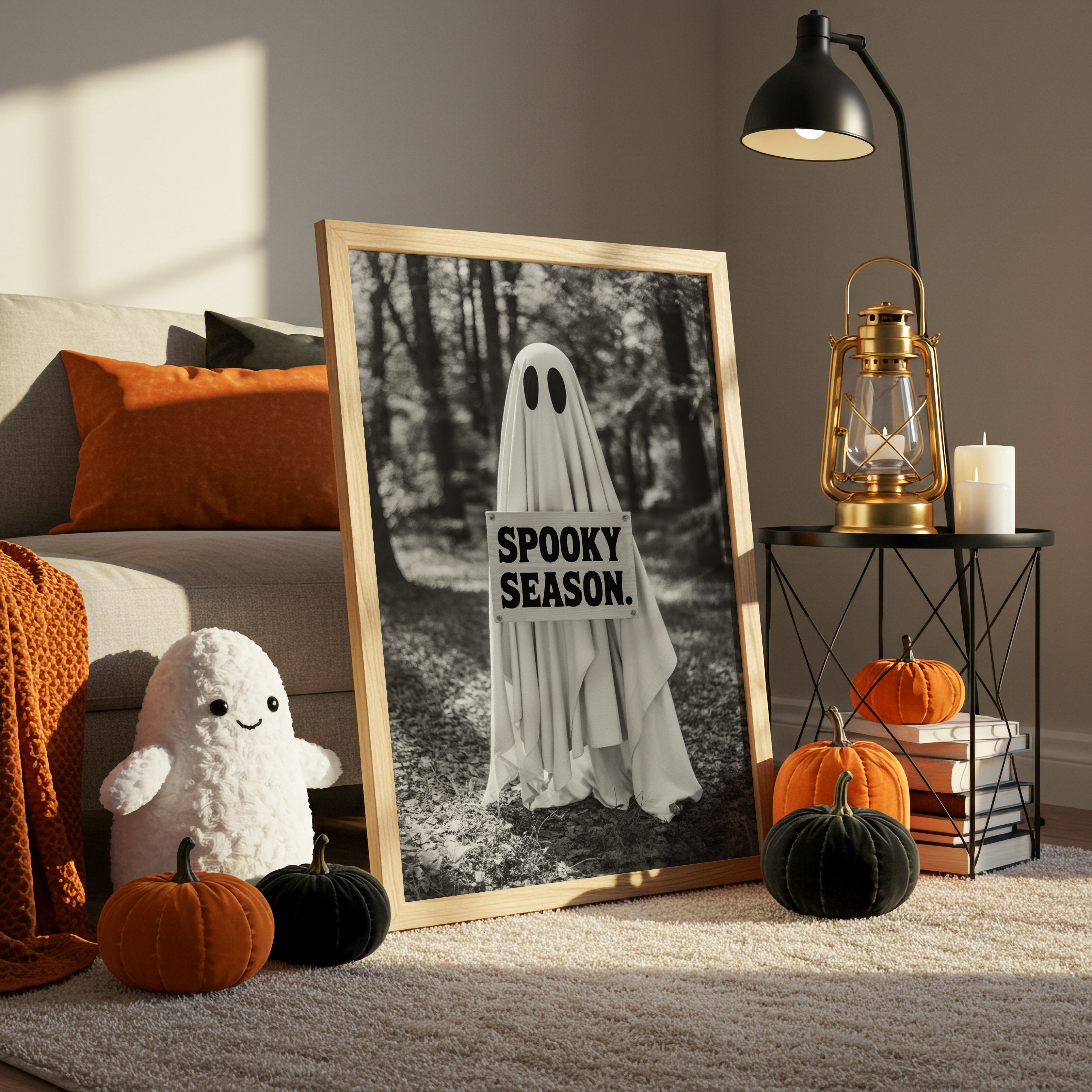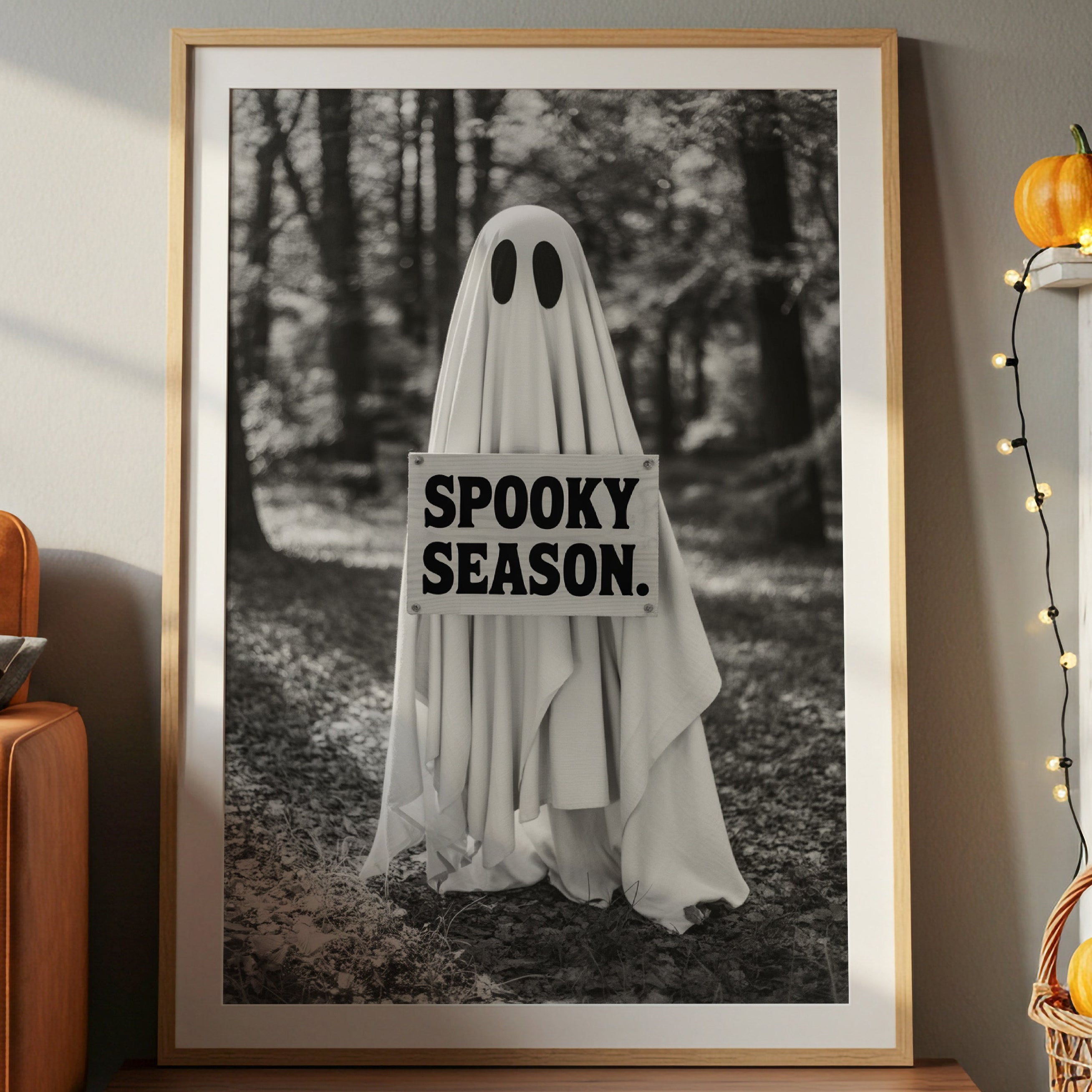 A solitary ghost stands sentinel in the dappled forest light, holding its proclamation with charming conviction. The monochromatic palette enhances the playful eeriness, with crisp white fabric contrasting against the soft blur of woodland shadows. This whimsical specter captures the perfect balance between nostalgic Halloween tradition and contemporary humor, inviting smiles rather than screams. This piece brings seasonal character to entryways, living spaces, or anywhere that could use a touch of festive mischief.