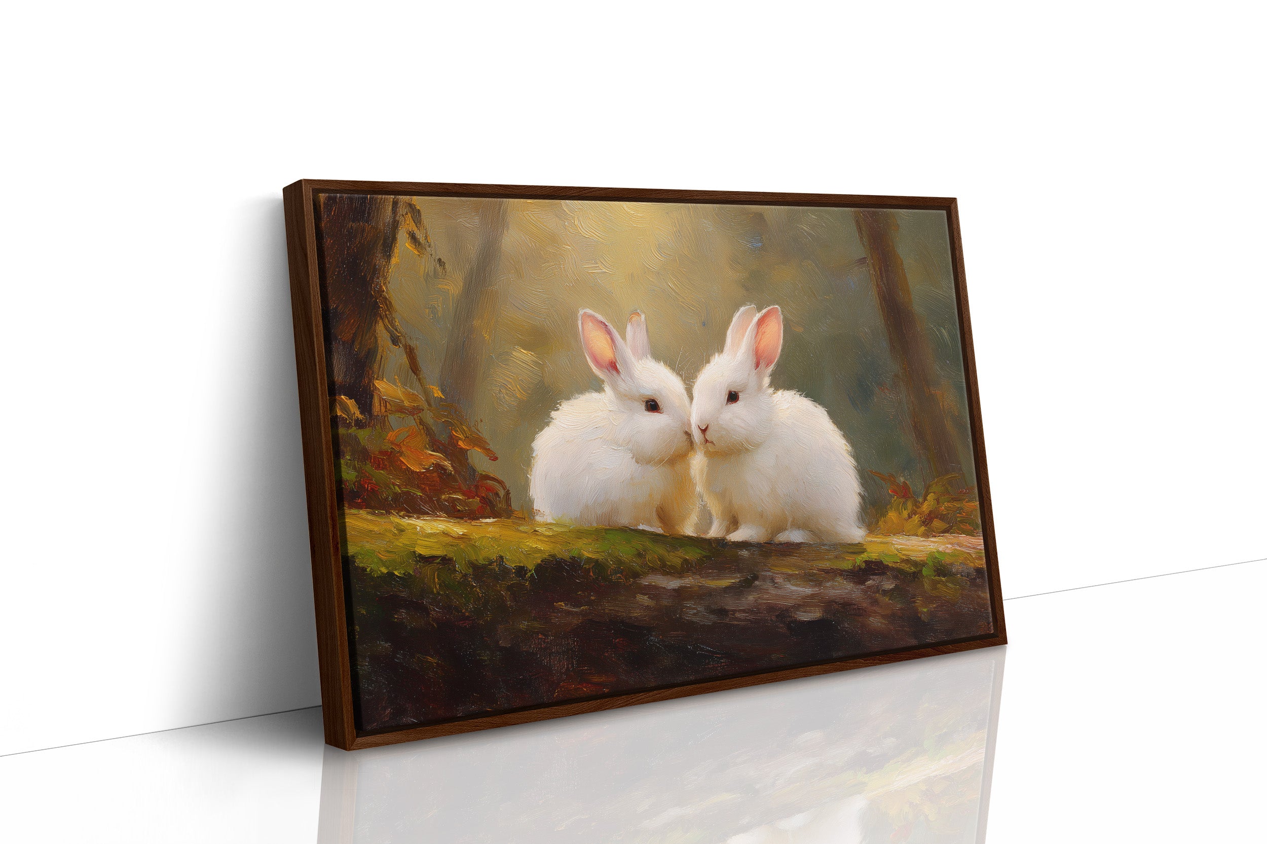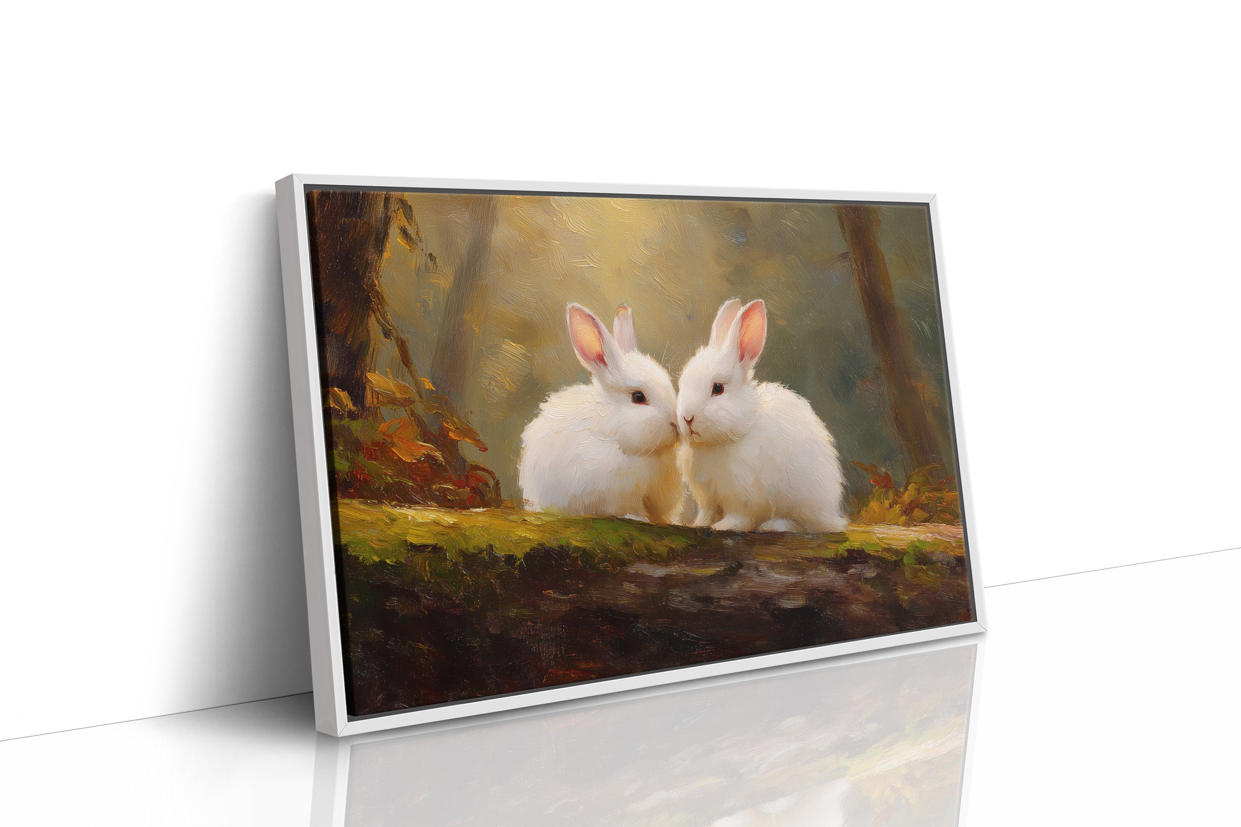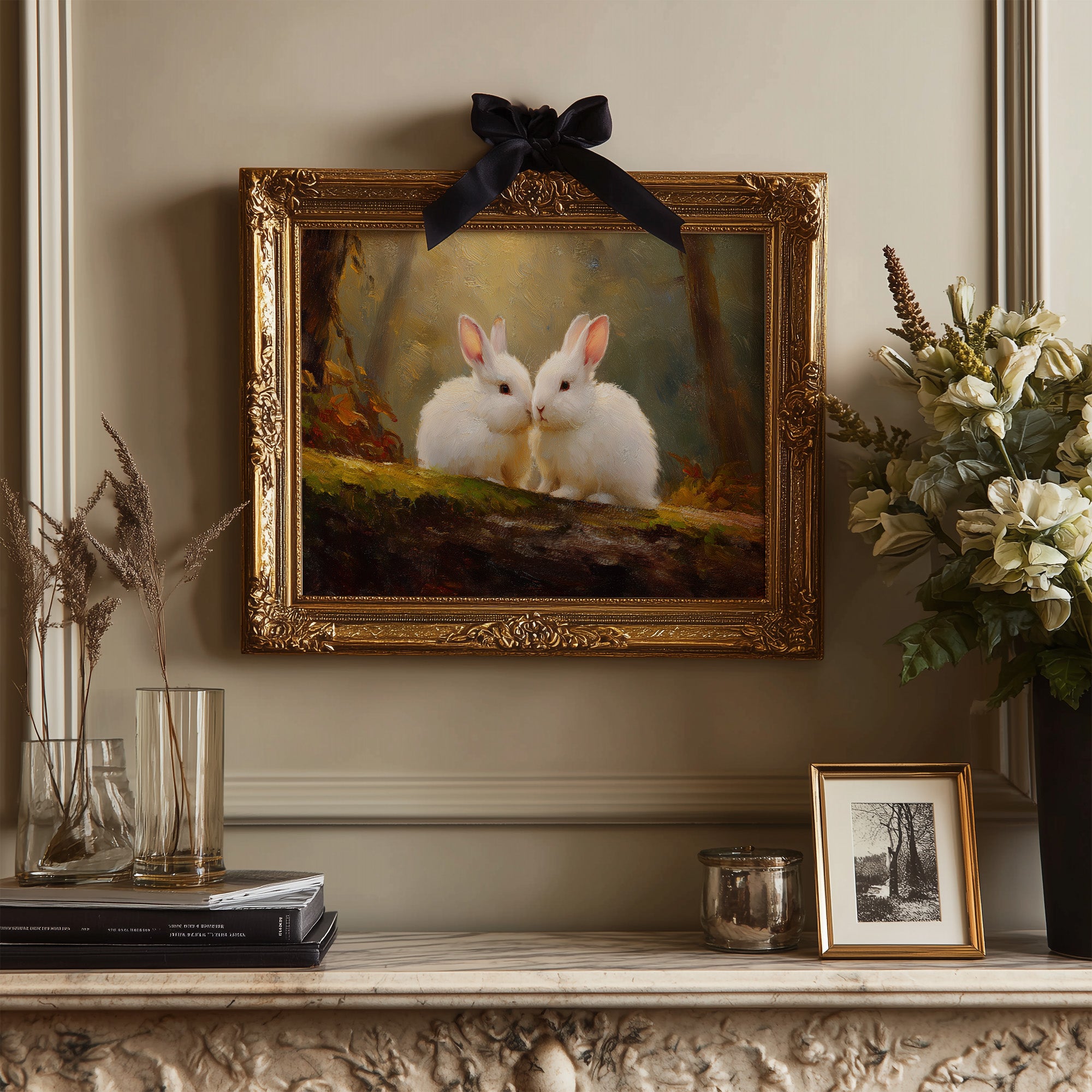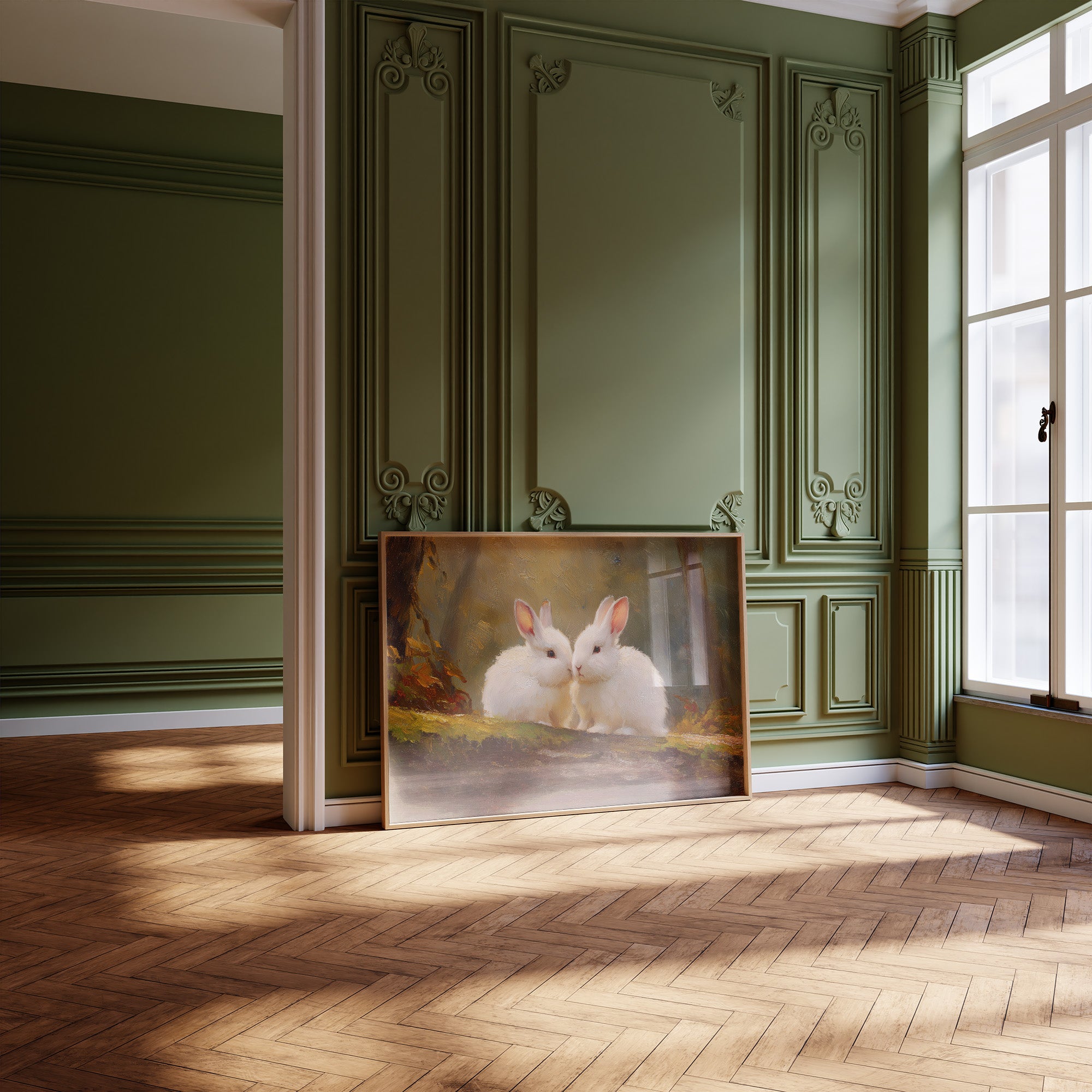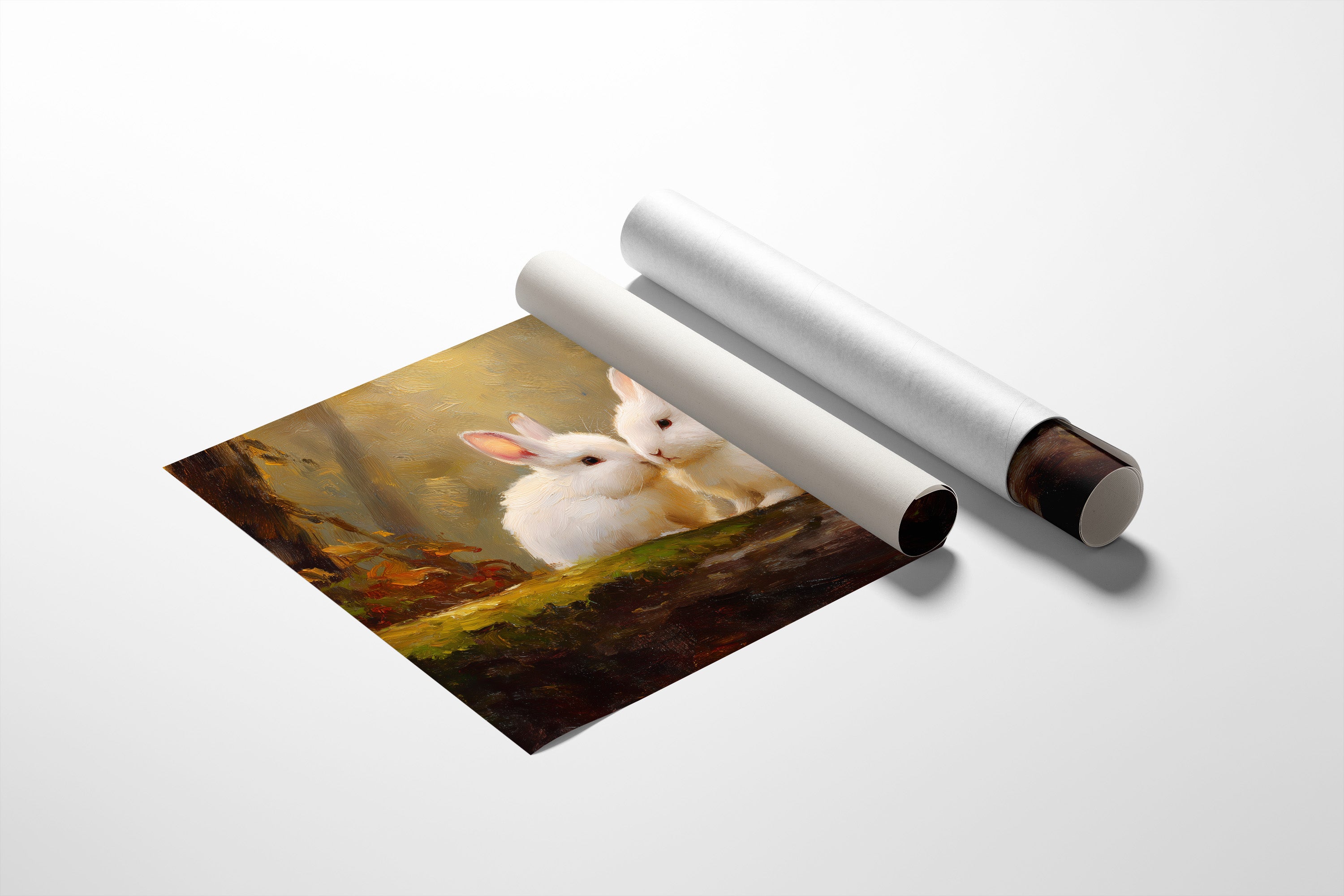 Soft white fur catches golden light as two rabbits huddle close, sharing secrets only woodland creatures know. The painterly brushstrokes create a dreamlike forest atmosphere where autumn leaves scatter beneath their delicate paws, the warm earth tones contrasting with their snow-white coats. This intimate portrait finds its perfect home in a reading nook or study, bringing a touch of storybook enchantment to spaces where imagination thrives.