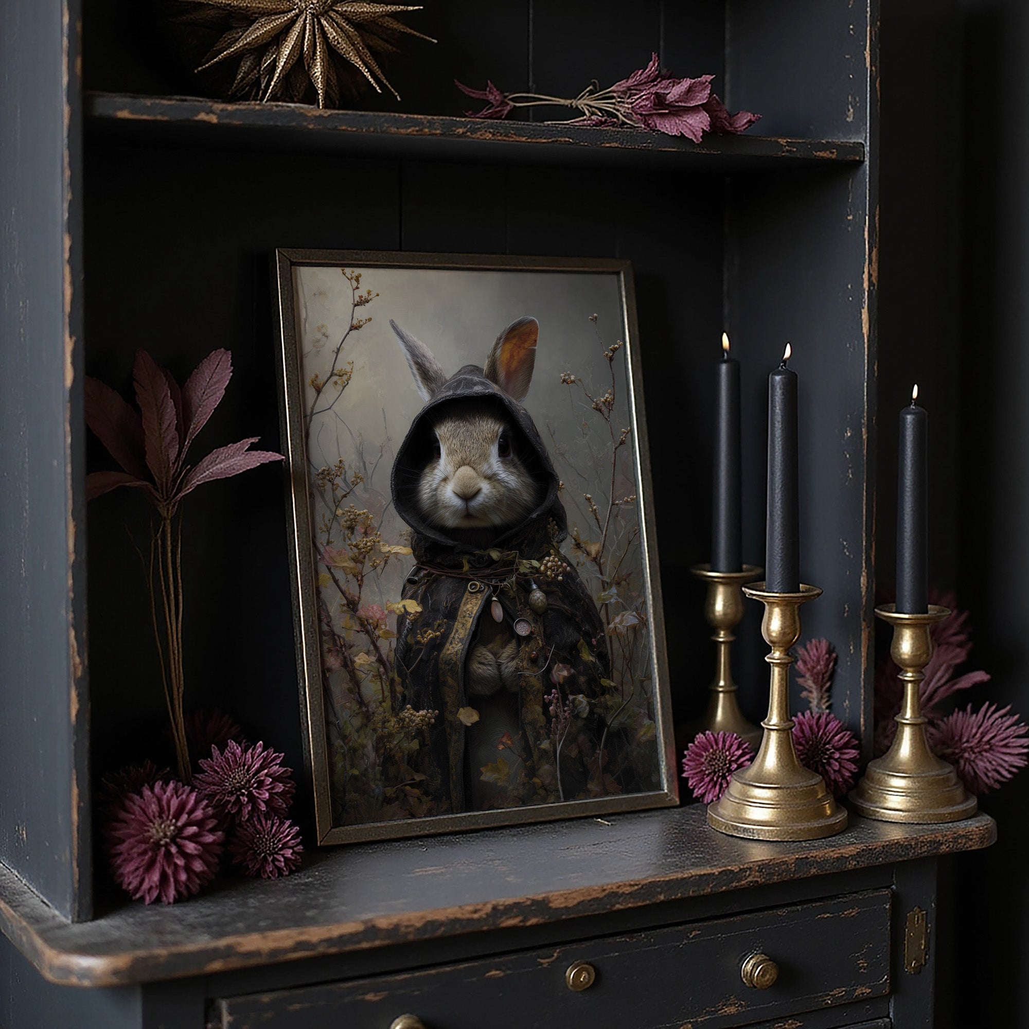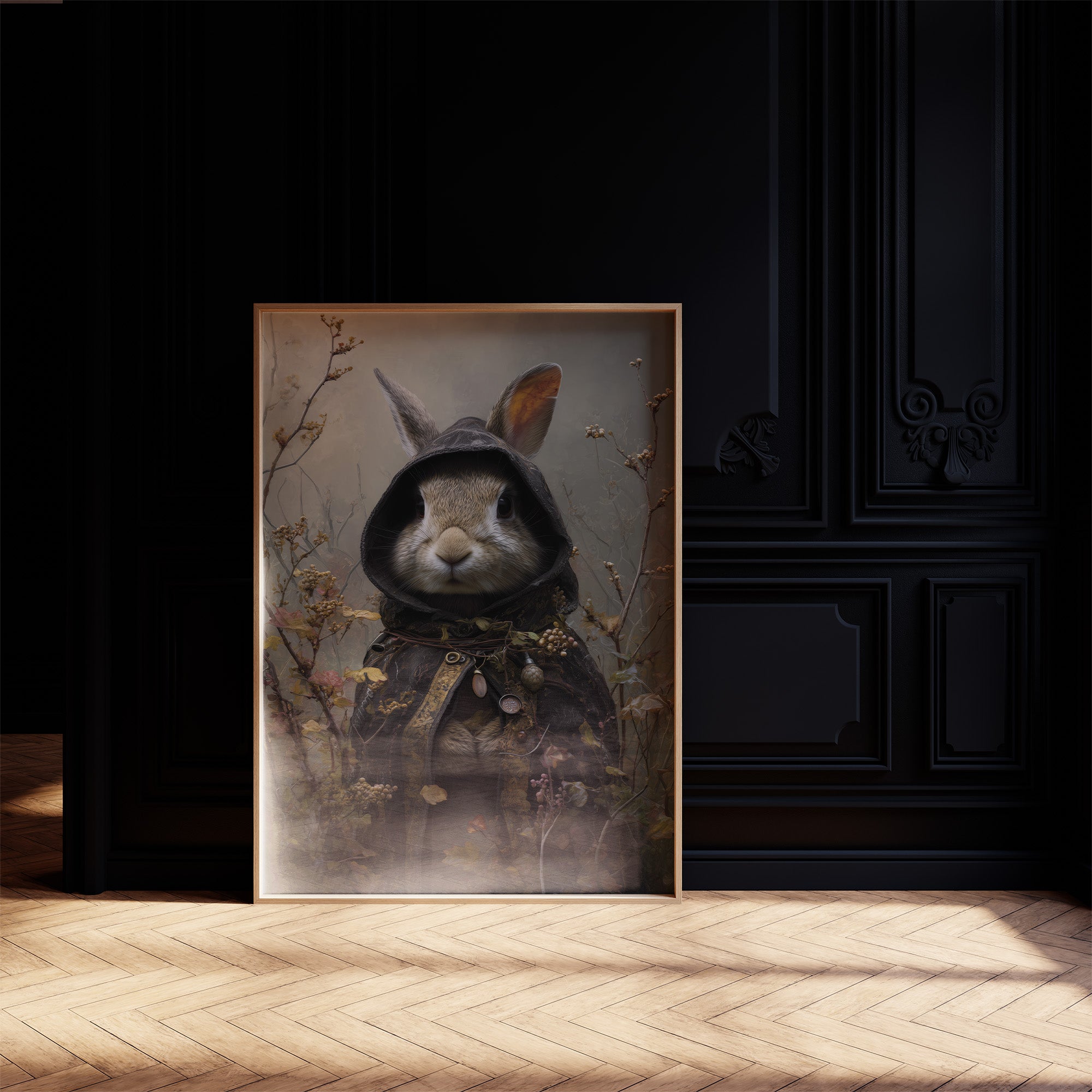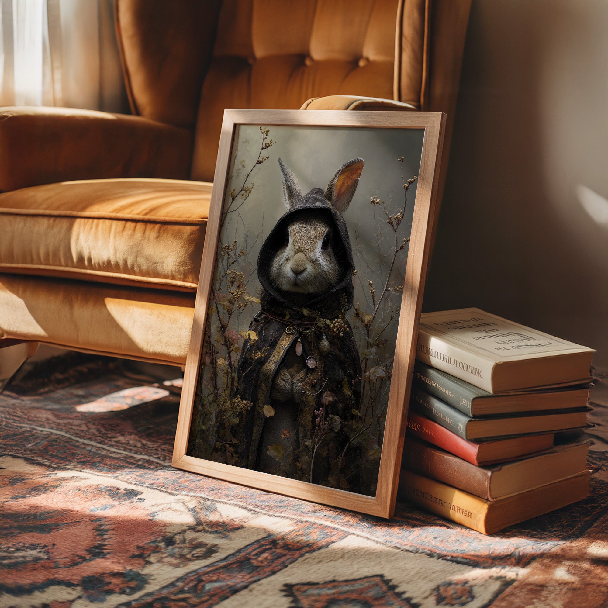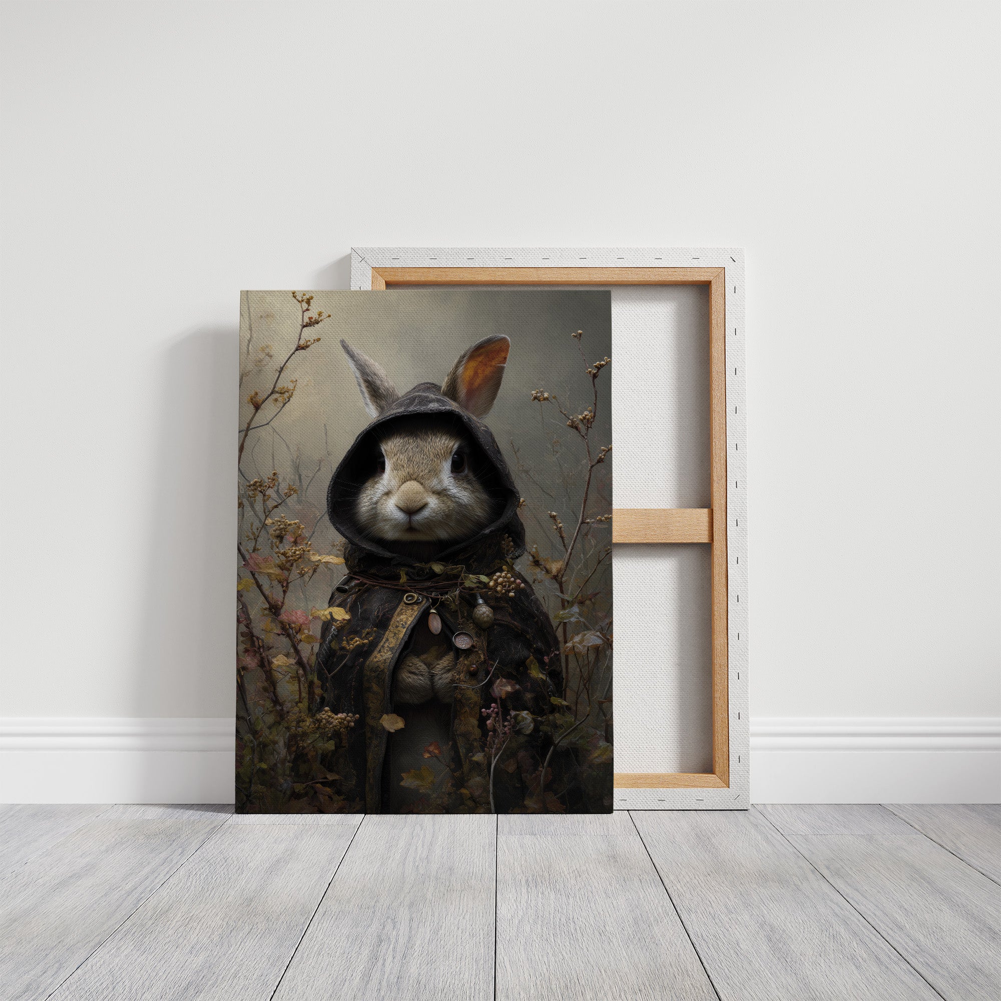 A gentle-eyed rabbit peers out from beneath a mysterious hooded cloak, its gaze direct yet innocent against a backdrop of muted wilderness. The intricate details of its garmentadorned with medallions and woodland treasurestell stories of secret journeys through forgotten meadows. Dried flora frames this woodland sentinel, creating an enchanted portrait that balances whimsy with a touch of medieval solemnity.