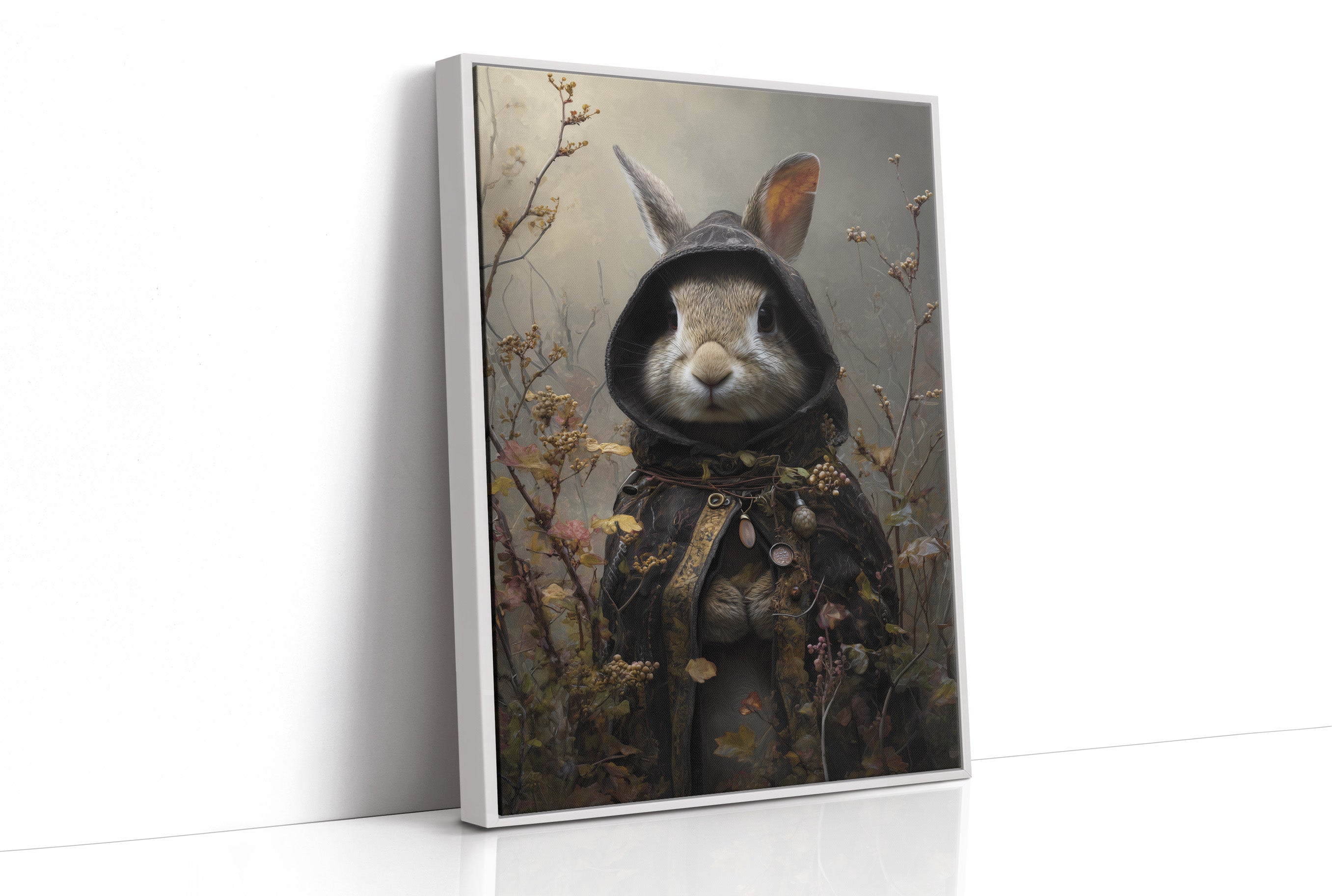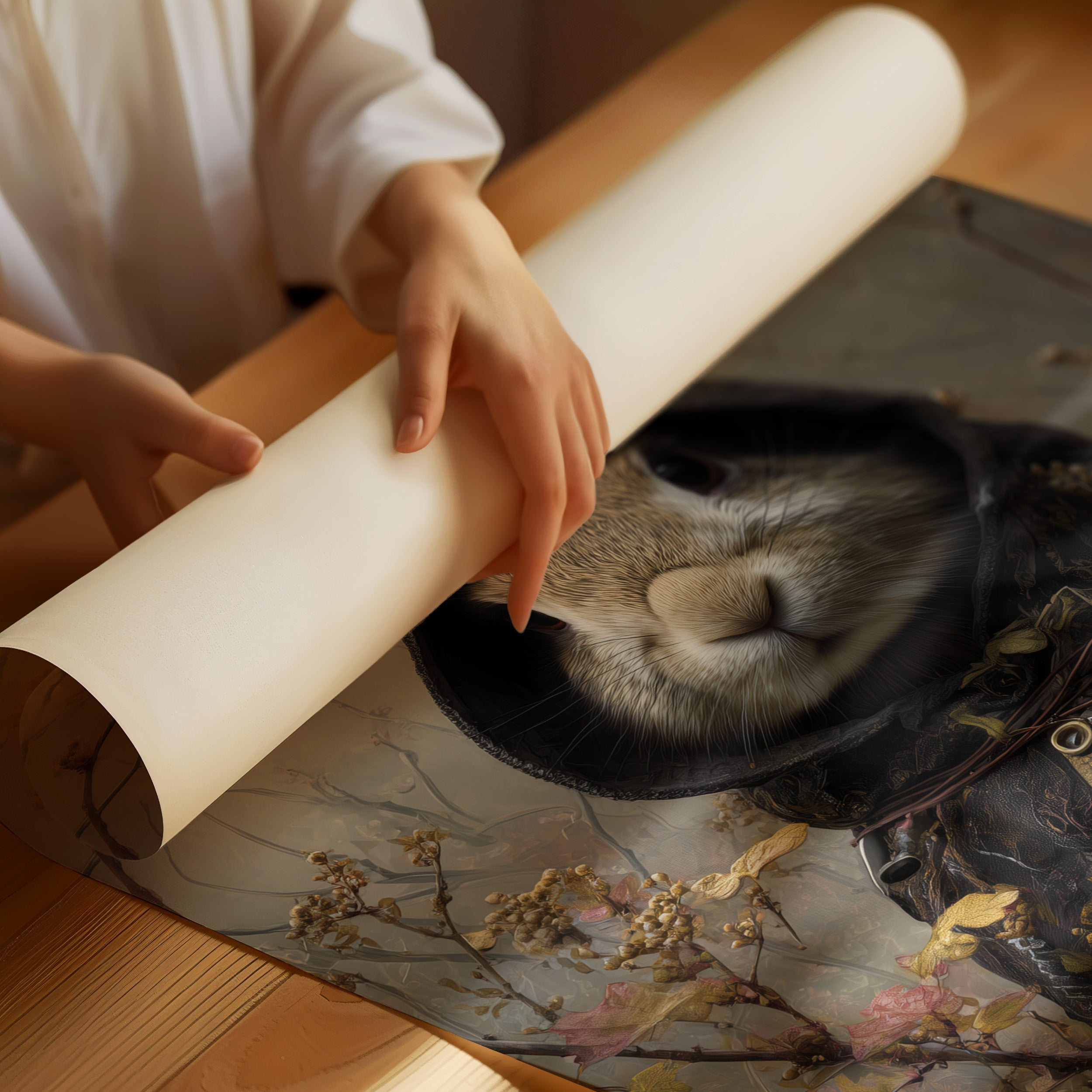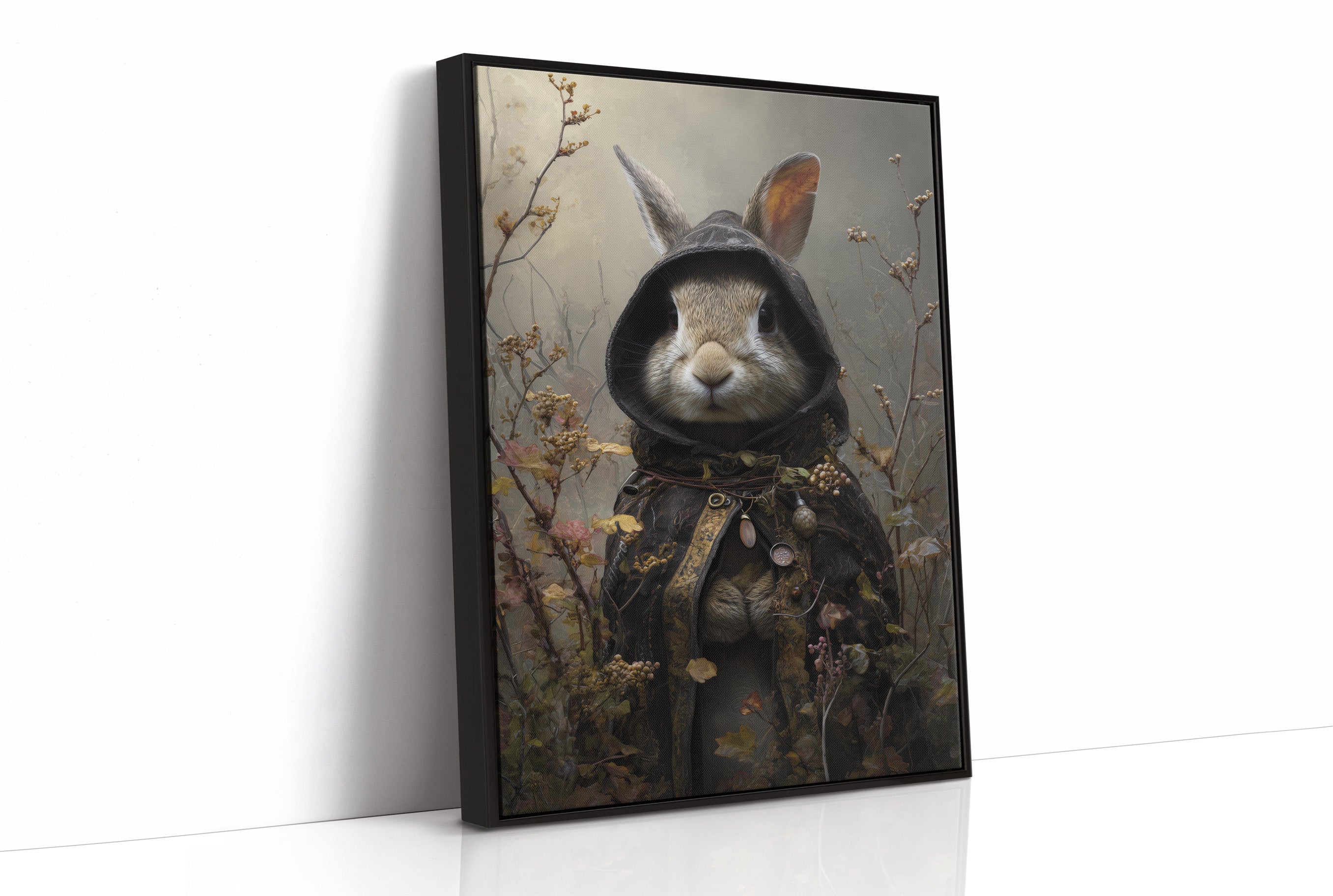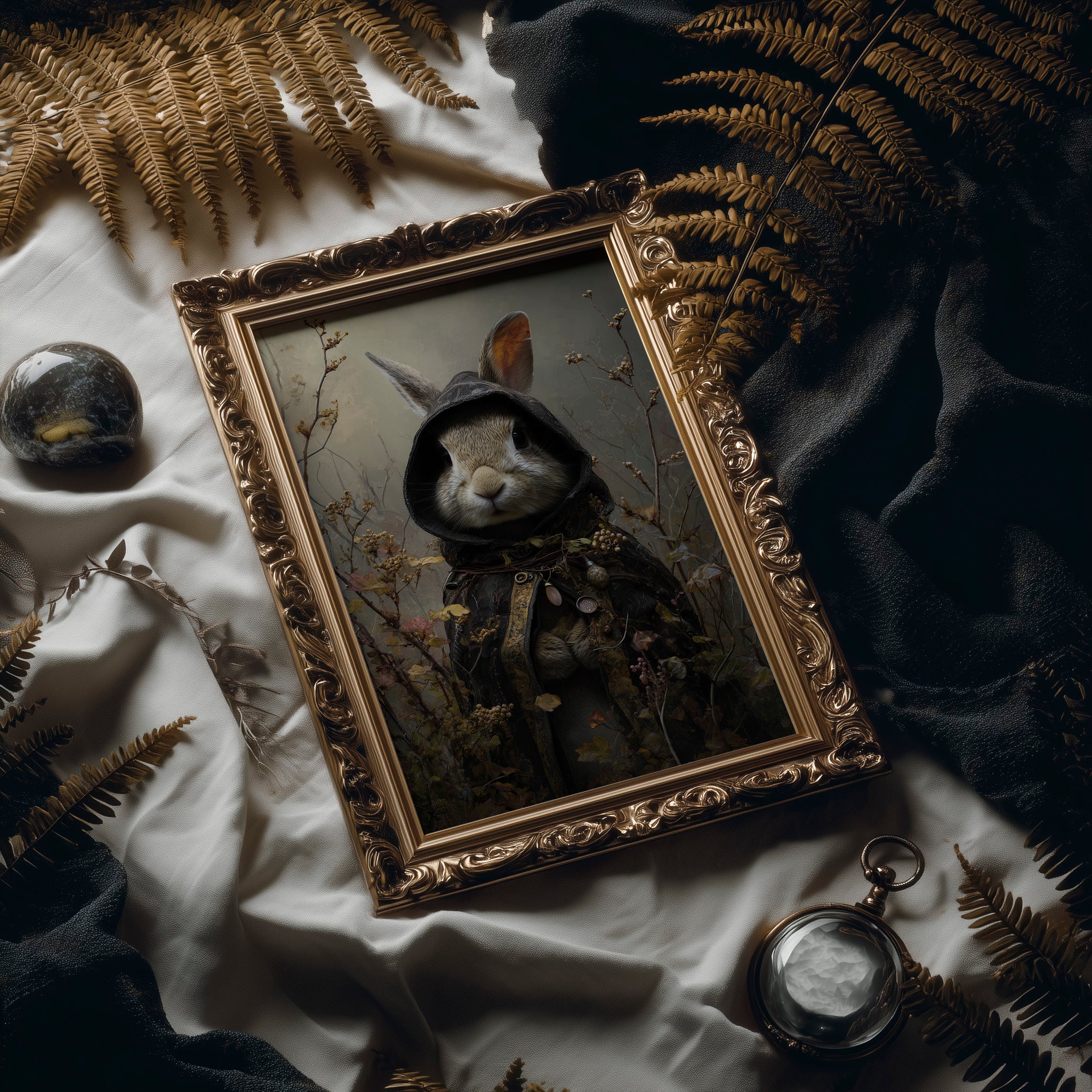 A gentle-eyed rabbit peers out from beneath a mysterious hooded cloak, its gaze direct yet innocent against a backdrop of muted wilderness. The intricate details of its garmentadorned with medallions and woodland treasurestell stories of secret journeys through forgotten meadows. Dried flora frames this woodland sentinel, creating an enchanted portrait that balances whimsy with a touch of medieval solemnity.