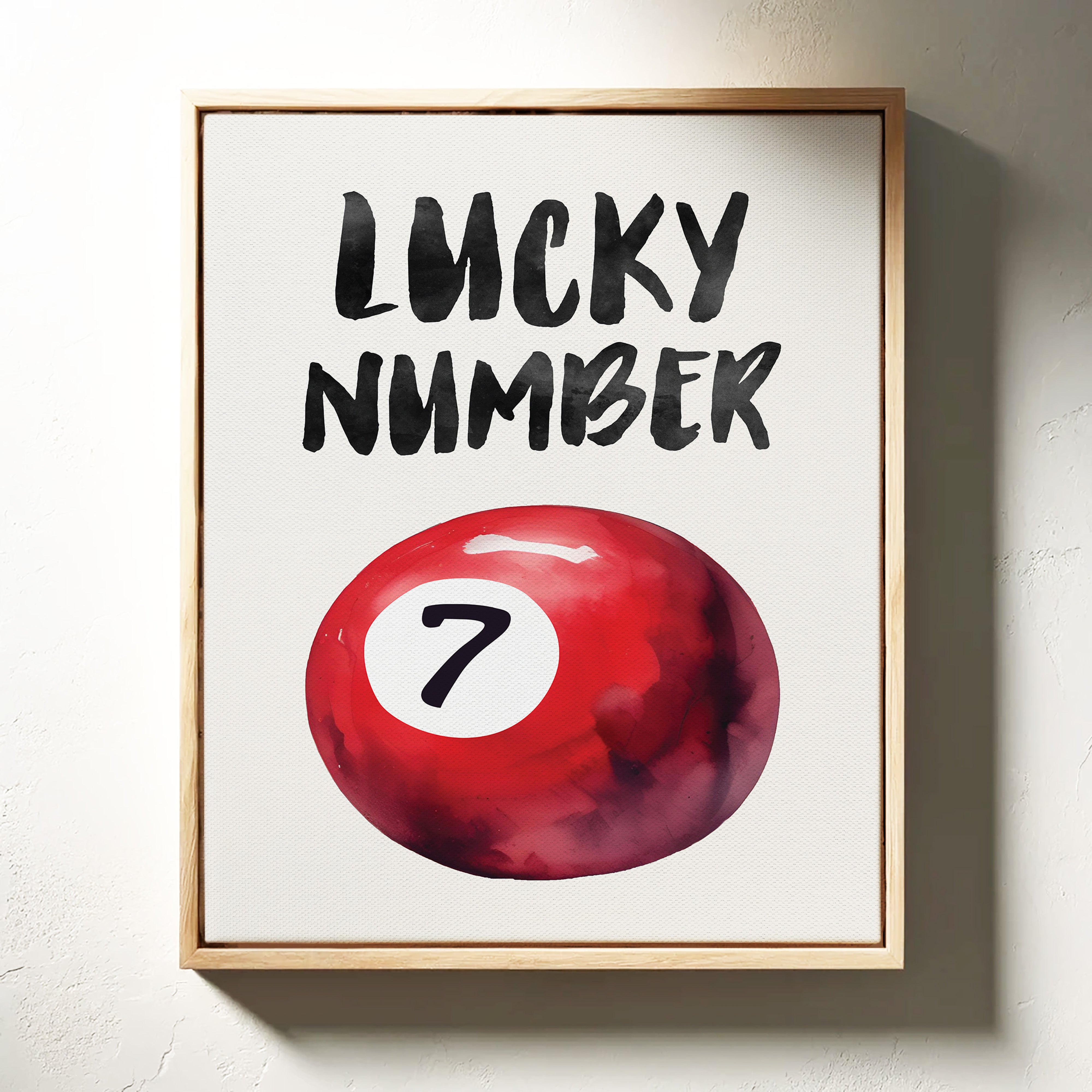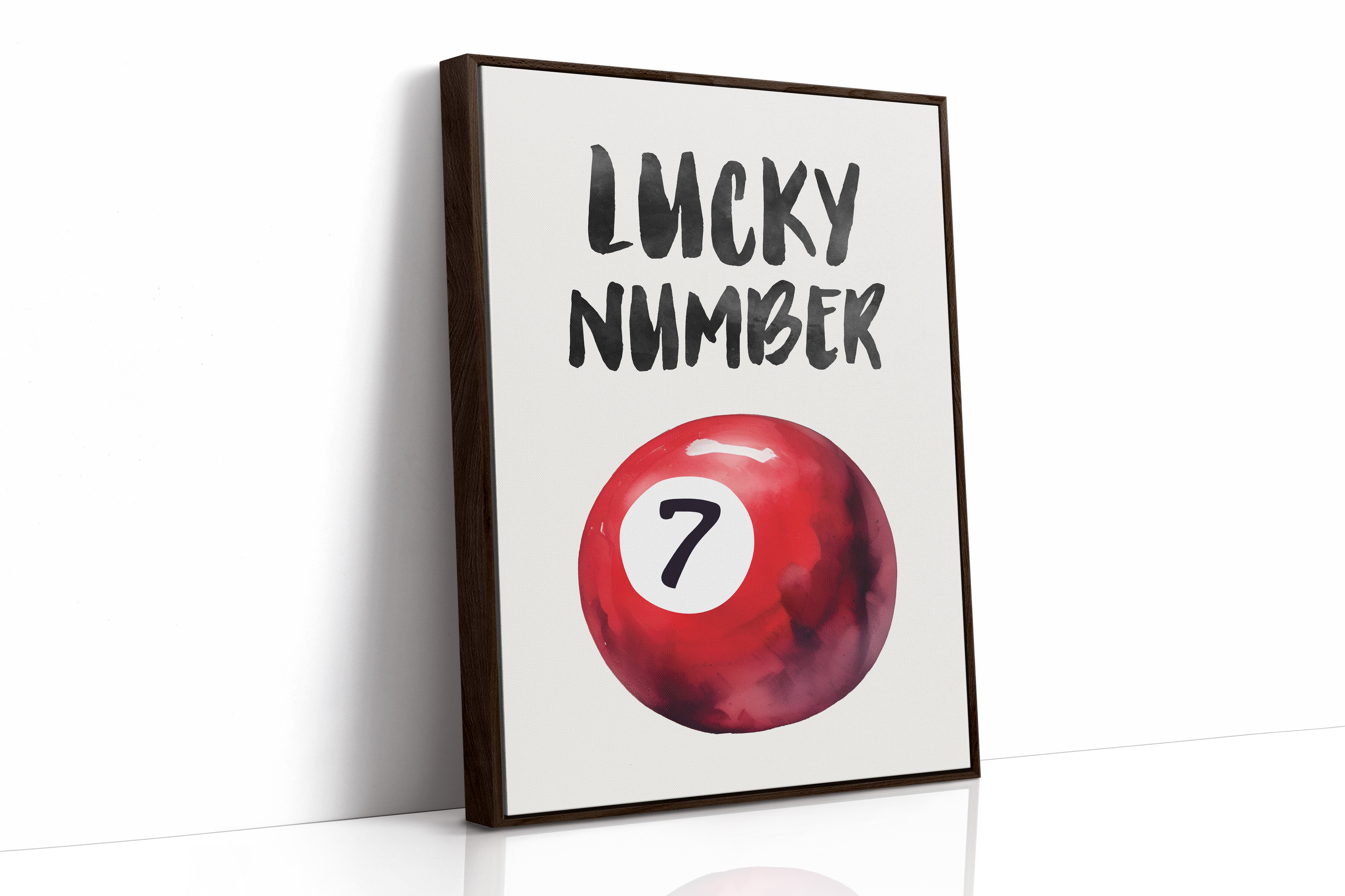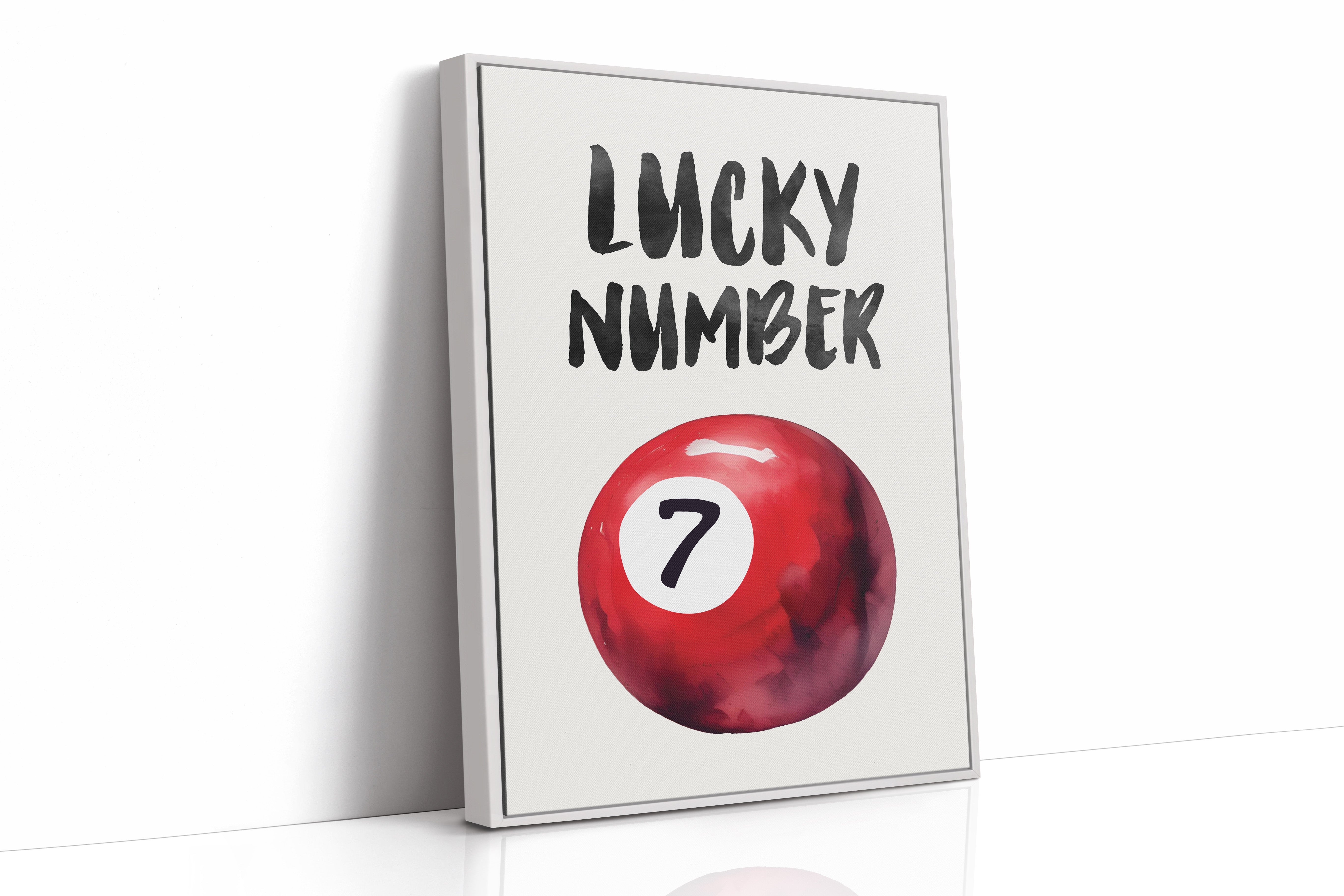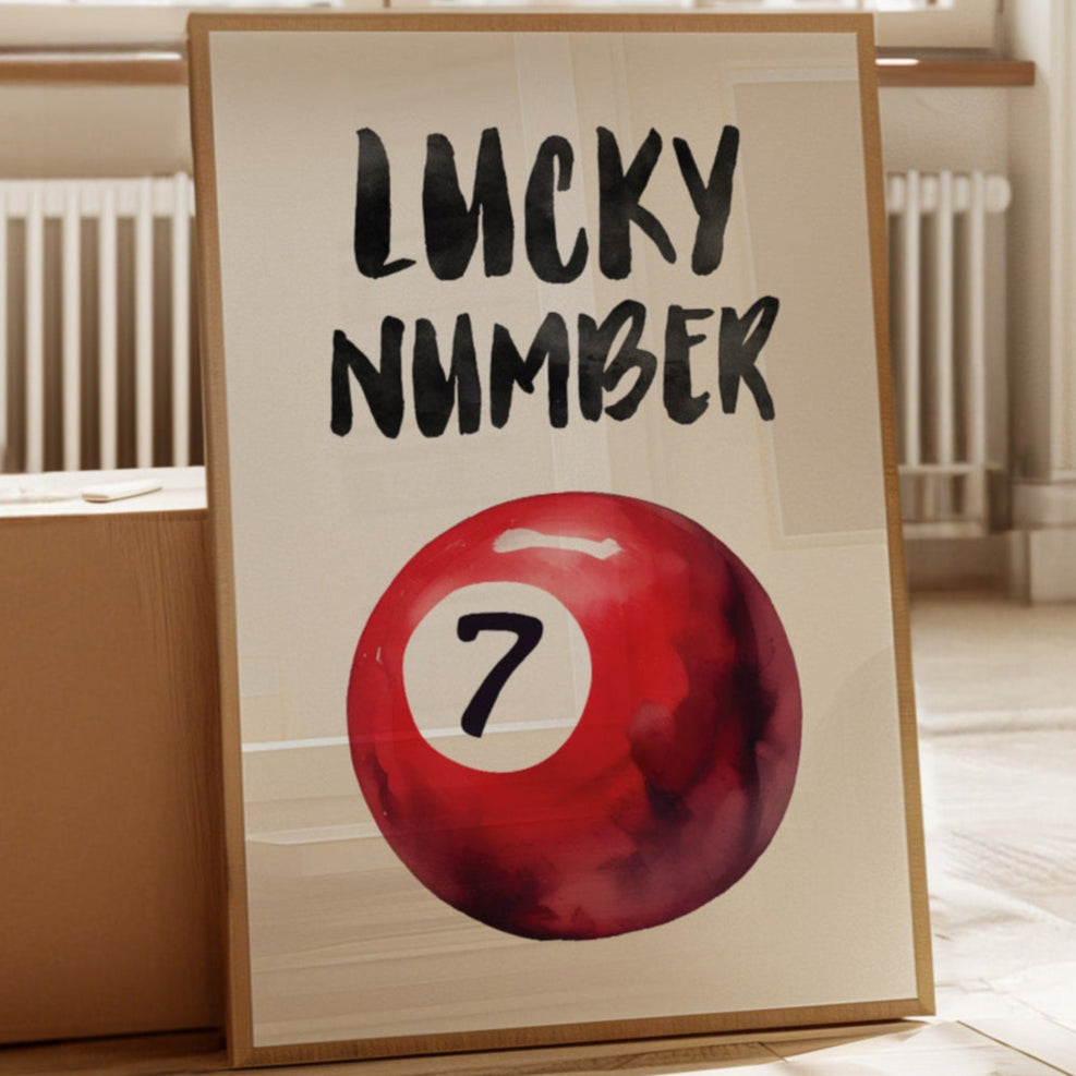 A bold splash of red against pristine white, capturing that electric moment when luck feels tangible and real. This striking contemporary piece brings retro pool hall charm into modern minimalist design. The rich crimson sphere seems to float in space, its number seven holding court like a king's crown, while bold brush-stroked letters dance above with playful confidence. Perfect for adding a spark of personality to clean-lined spaces, this piece bridges nostalgia and now with effortless style. Makes an ideal focal point for a home office, game room, or any space that could use a touch of lucky charm energy.