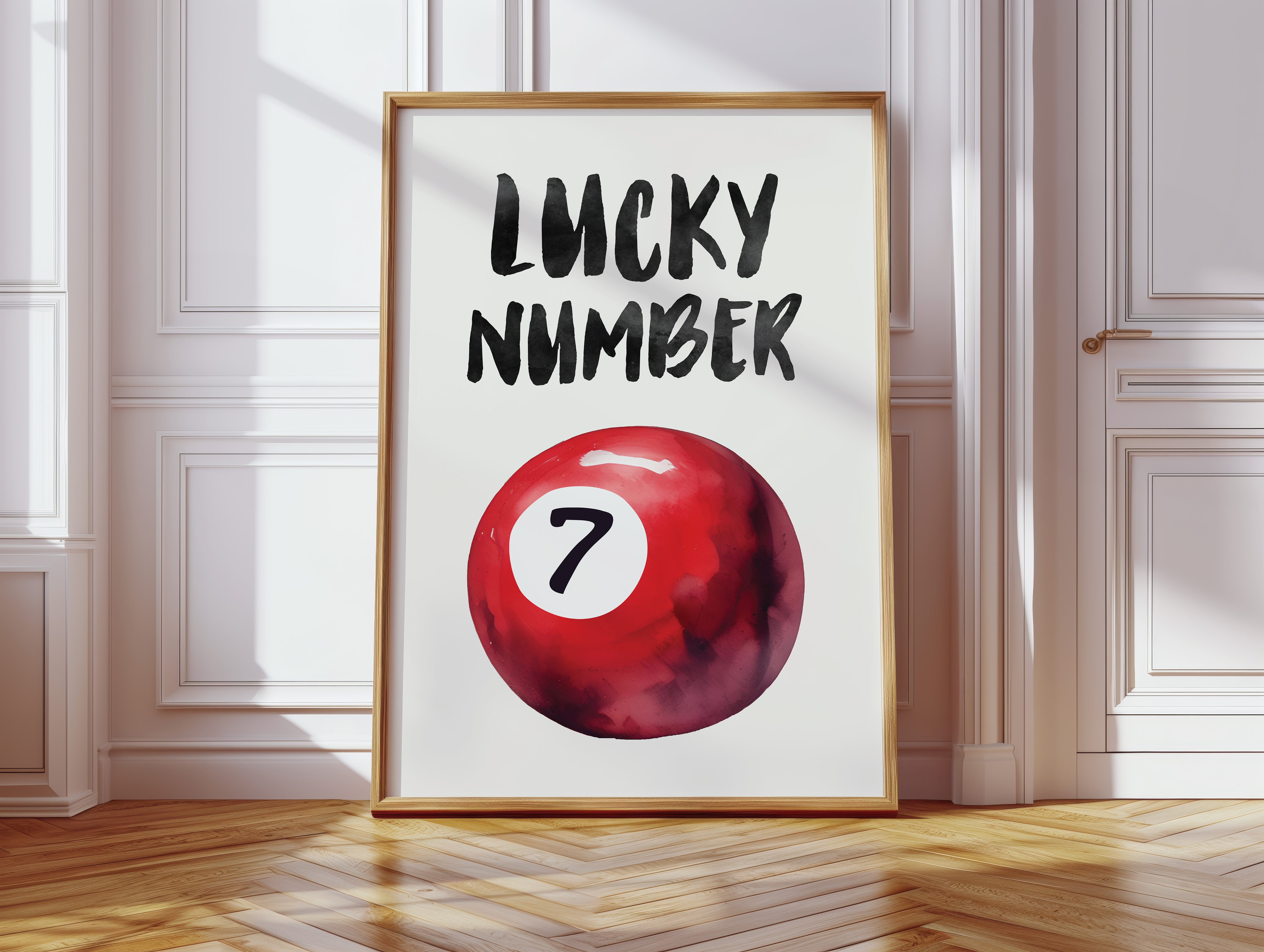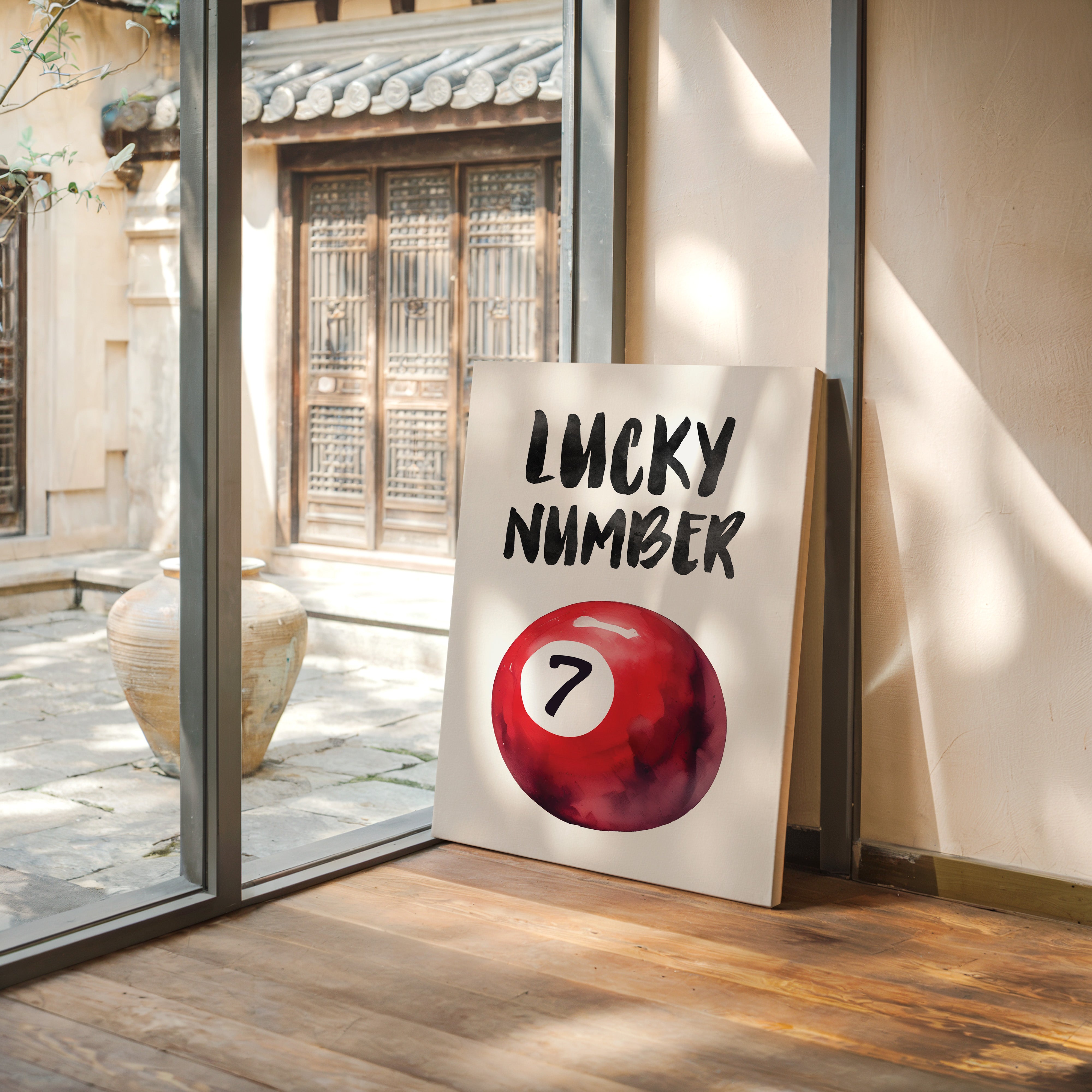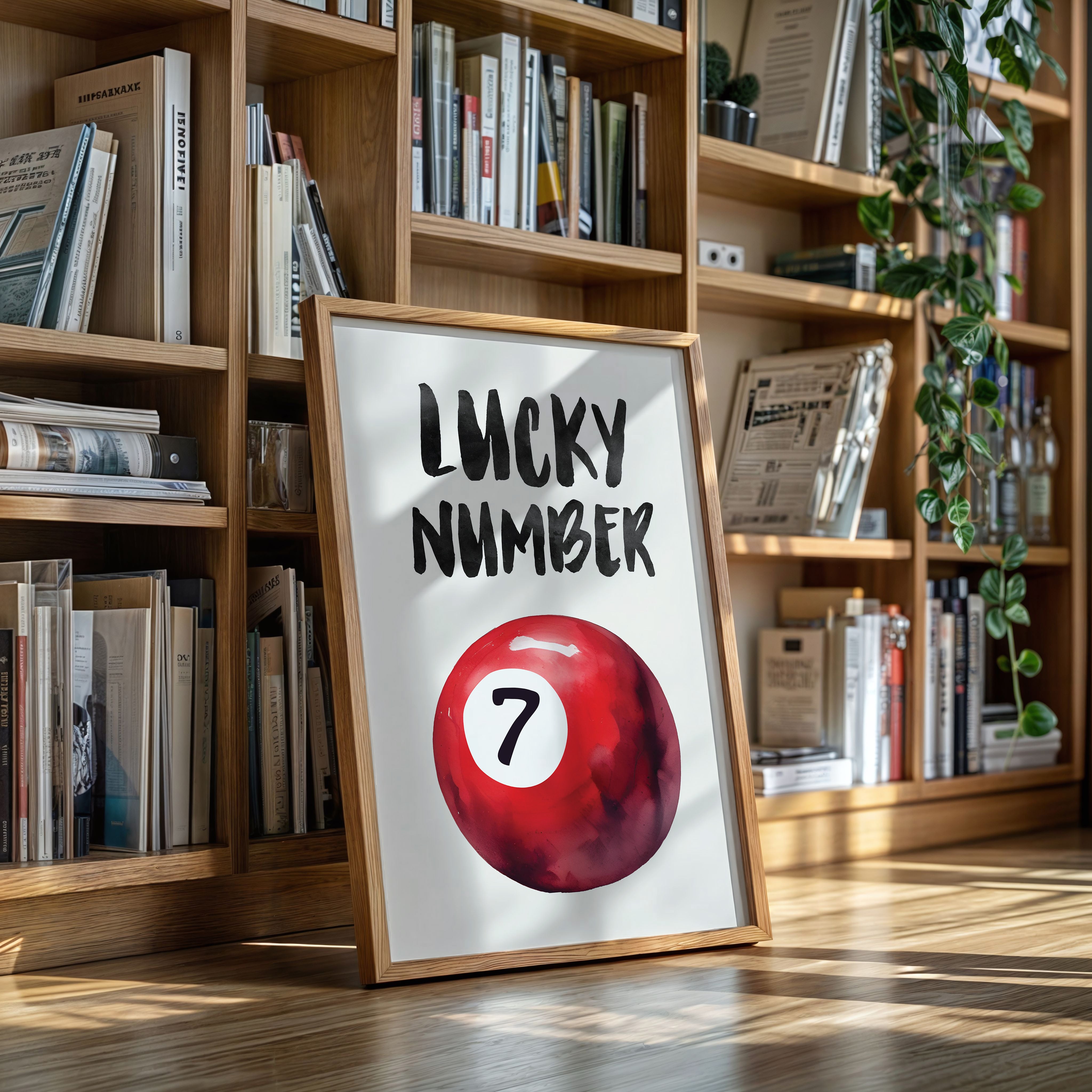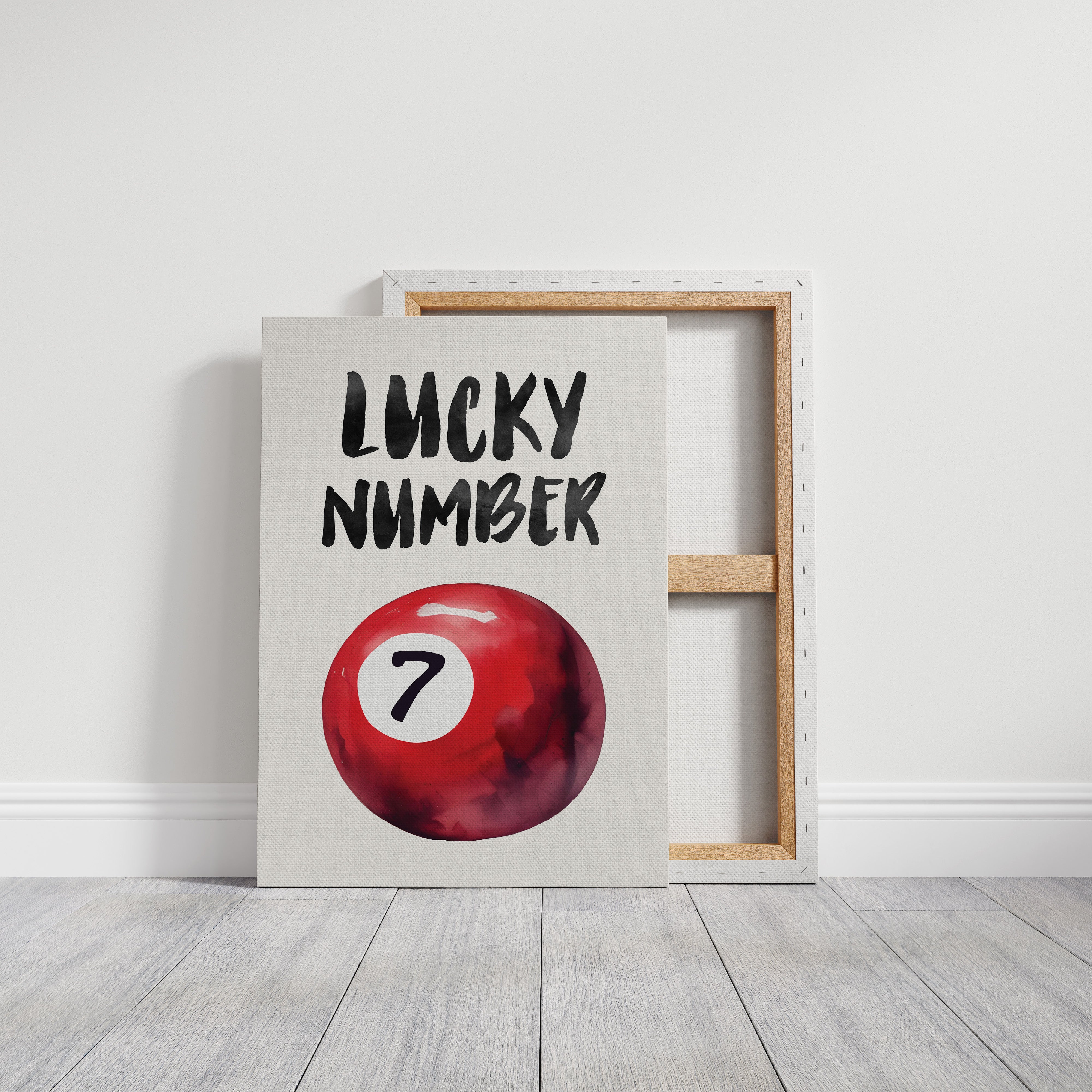 A bold splash of red against pristine white, capturing that electric moment when luck feels tangible and real. This striking contemporary piece brings retro pool hall charm into modern minimalist design. The rich crimson sphere seems to float in space, its number seven holding court like a king's crown, while bold brush-stroked letters dance above with playful confidence. Perfect for adding a spark of personality to clean-lined spaces, this piece bridges nostalgia and now with effortless style. Makes an ideal focal point for a home office, game room, or any space that could use a touch of lucky charm energy.