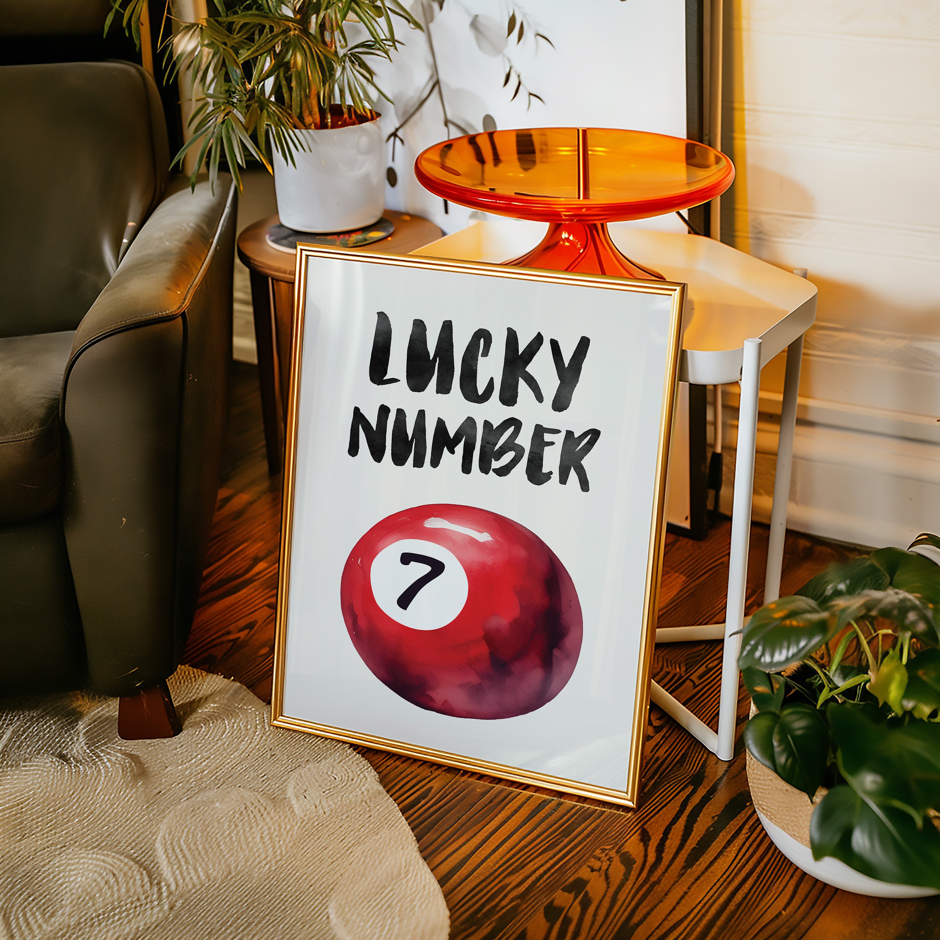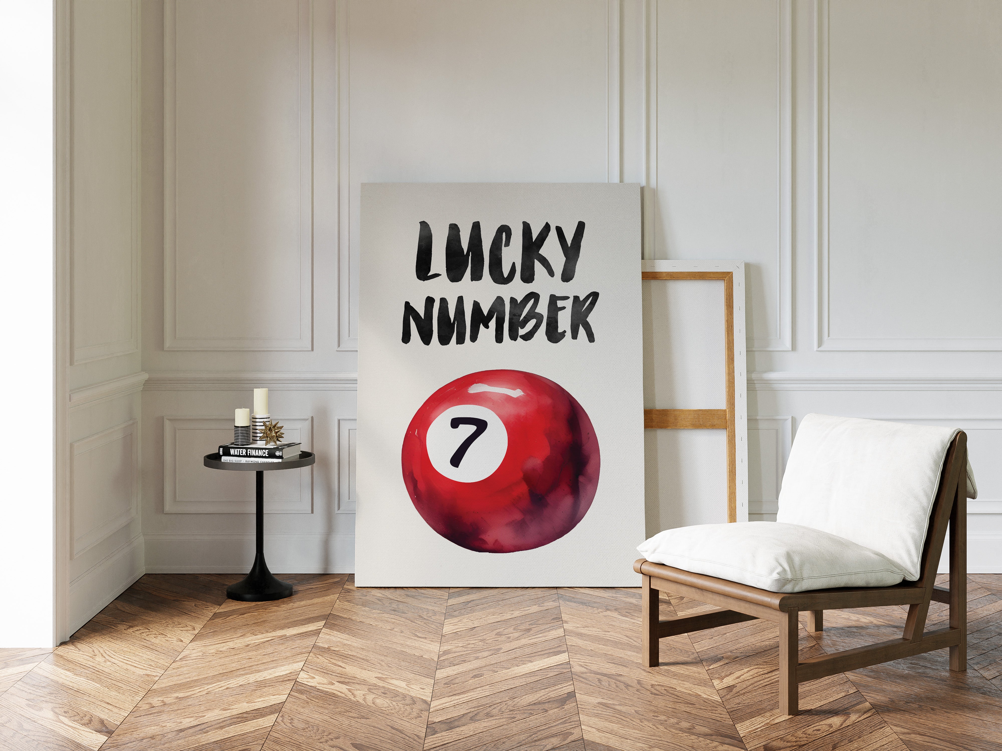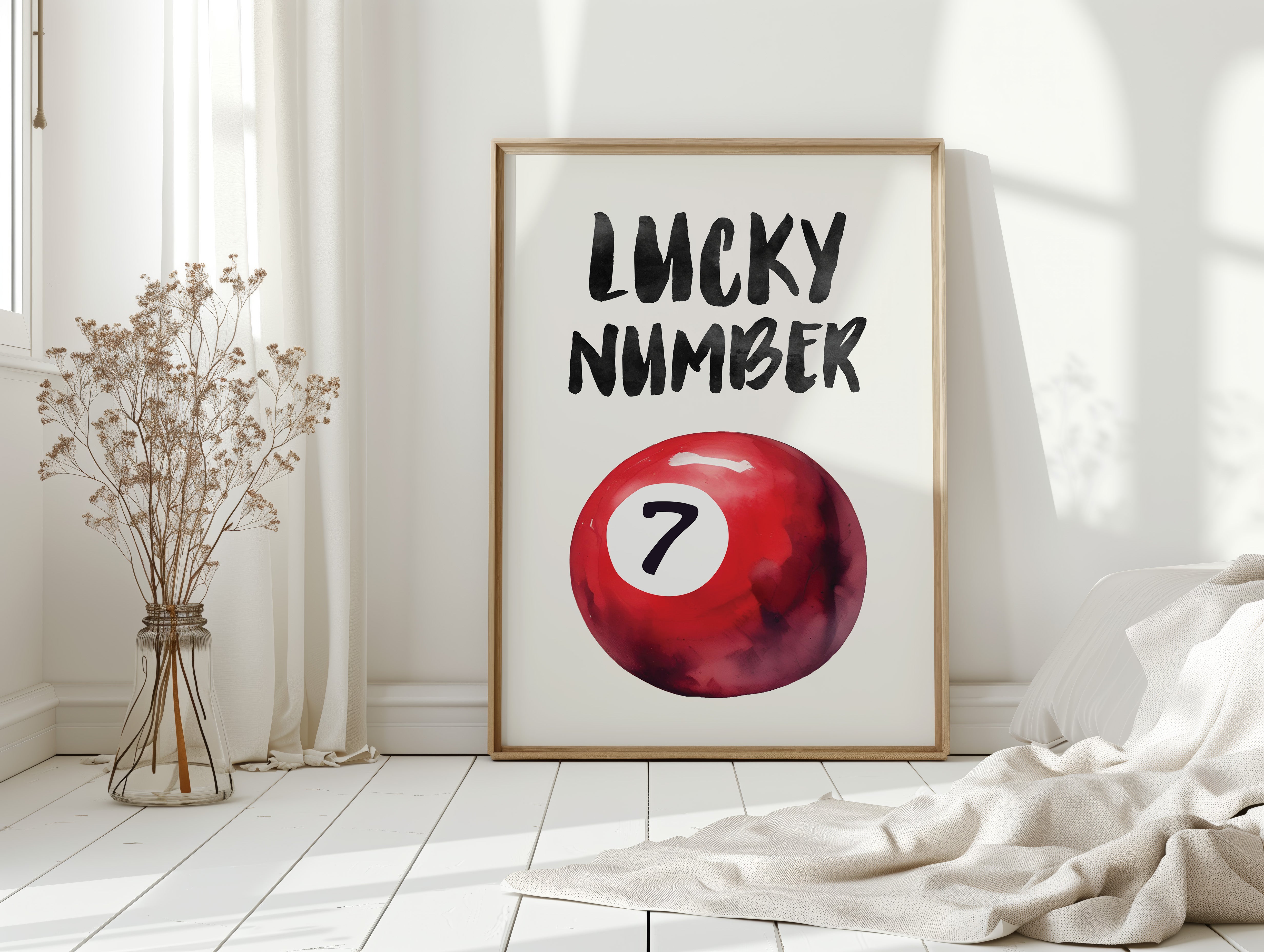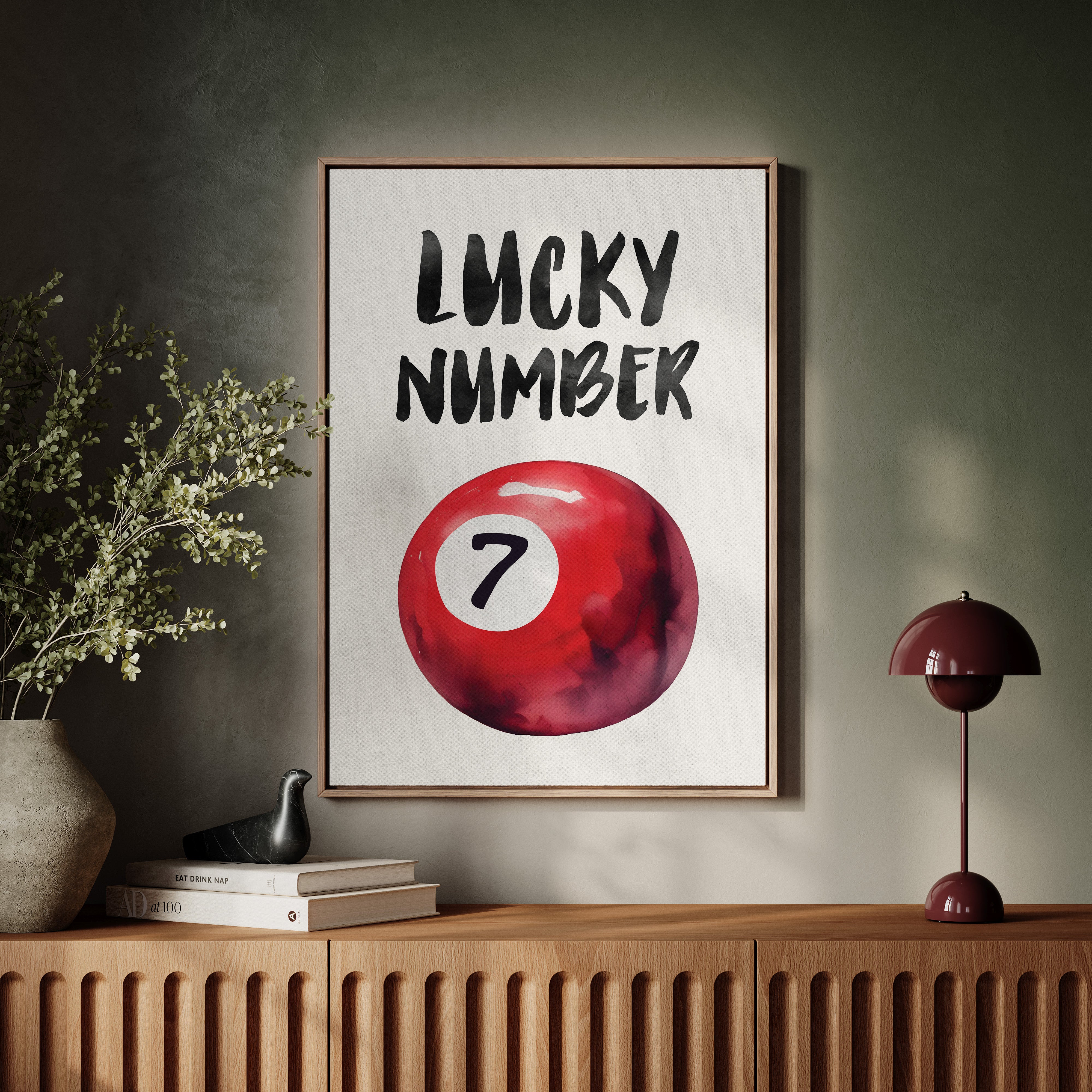 A bold splash of red against pristine white, capturing that electric moment when luck feels tangible and real. This striking contemporary piece brings retro pool hall charm into modern minimalist design. The rich crimson sphere seems to float in space, its number seven holding court like a king's crown, while bold brush-stroked letters dance above with playful confidence. Perfect for adding a spark of personality to clean-lined spaces, this piece bridges nostalgia and now with effortless style. Makes an ideal focal point for a home office, game room, or any space that could use a touch of lucky charm energy.