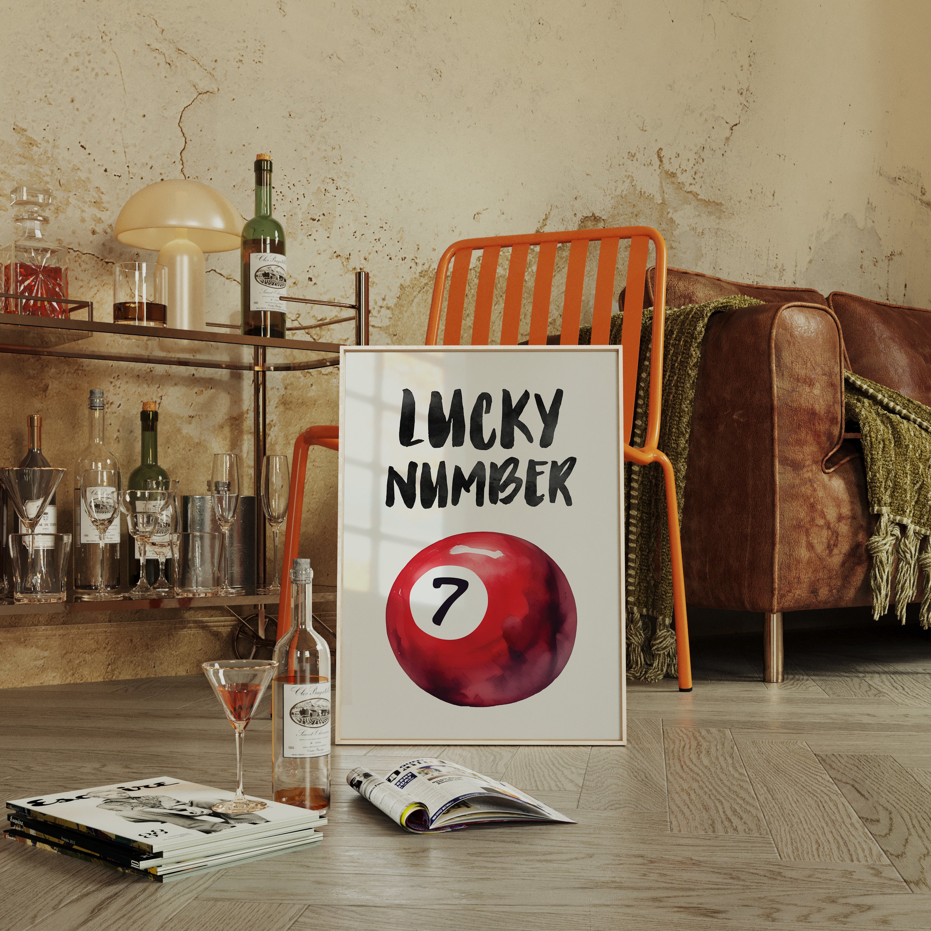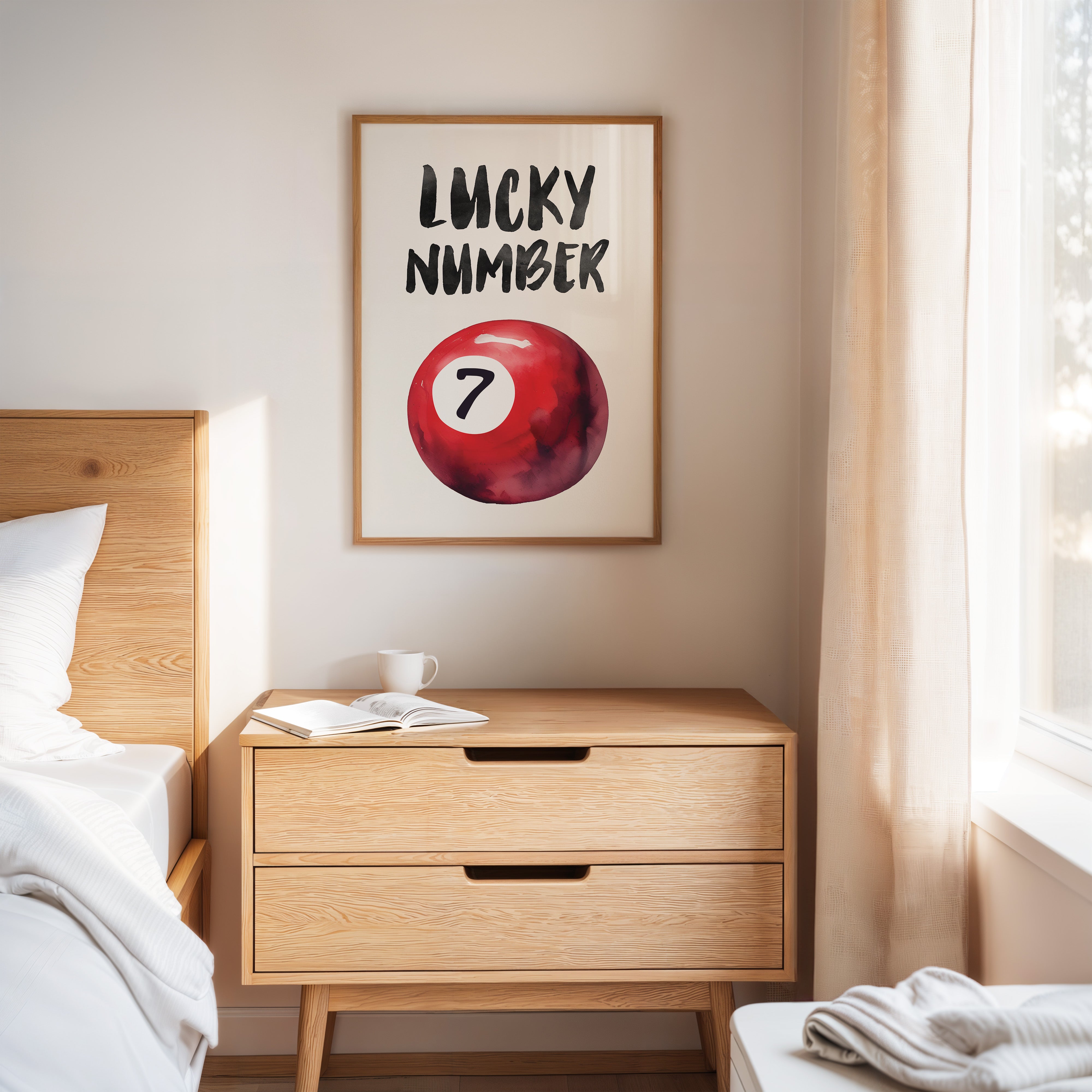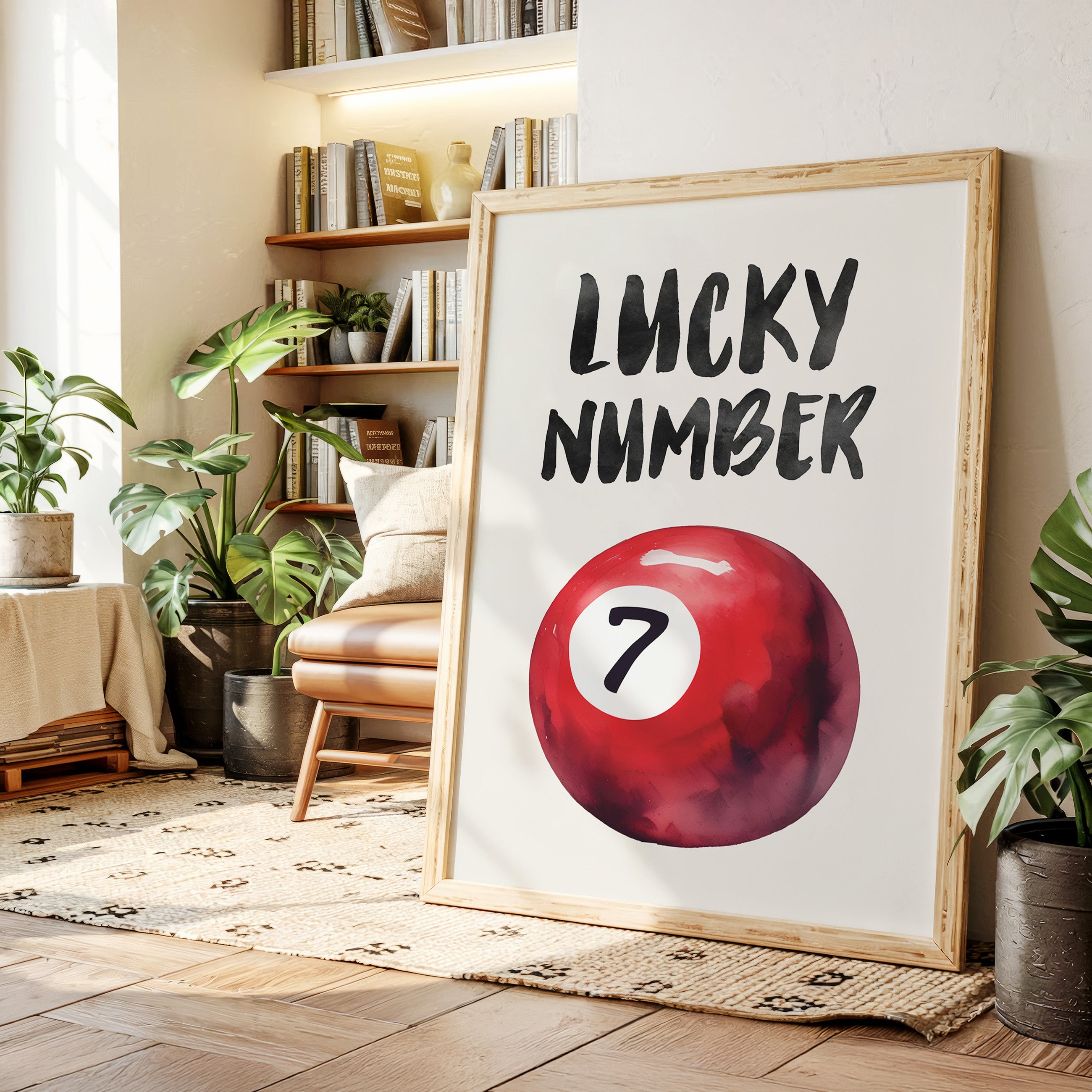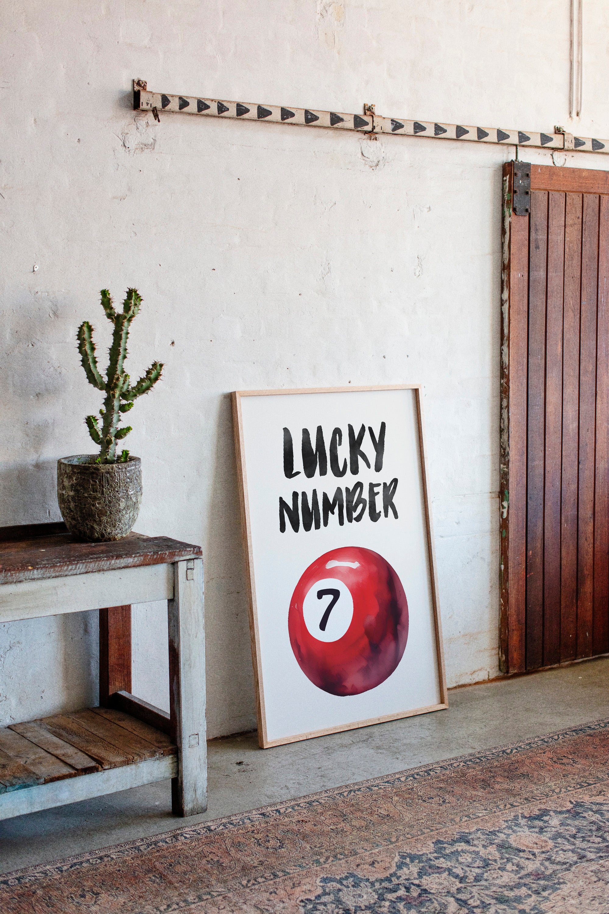 A bold splash of red against pristine white, capturing that electric moment when luck feels tangible and real. This striking contemporary piece brings retro pool hall charm into modern minimalist design. The rich crimson sphere seems to float in space, its number seven holding court like a king's crown, while bold brush-stroked letters dance above with playful confidence. Perfect for adding a spark of personality to clean-lined spaces, this piece bridges nostalgia and now with effortless style. Makes an ideal focal point for a home office, game room, or any space that could use a touch of lucky charm energy.
