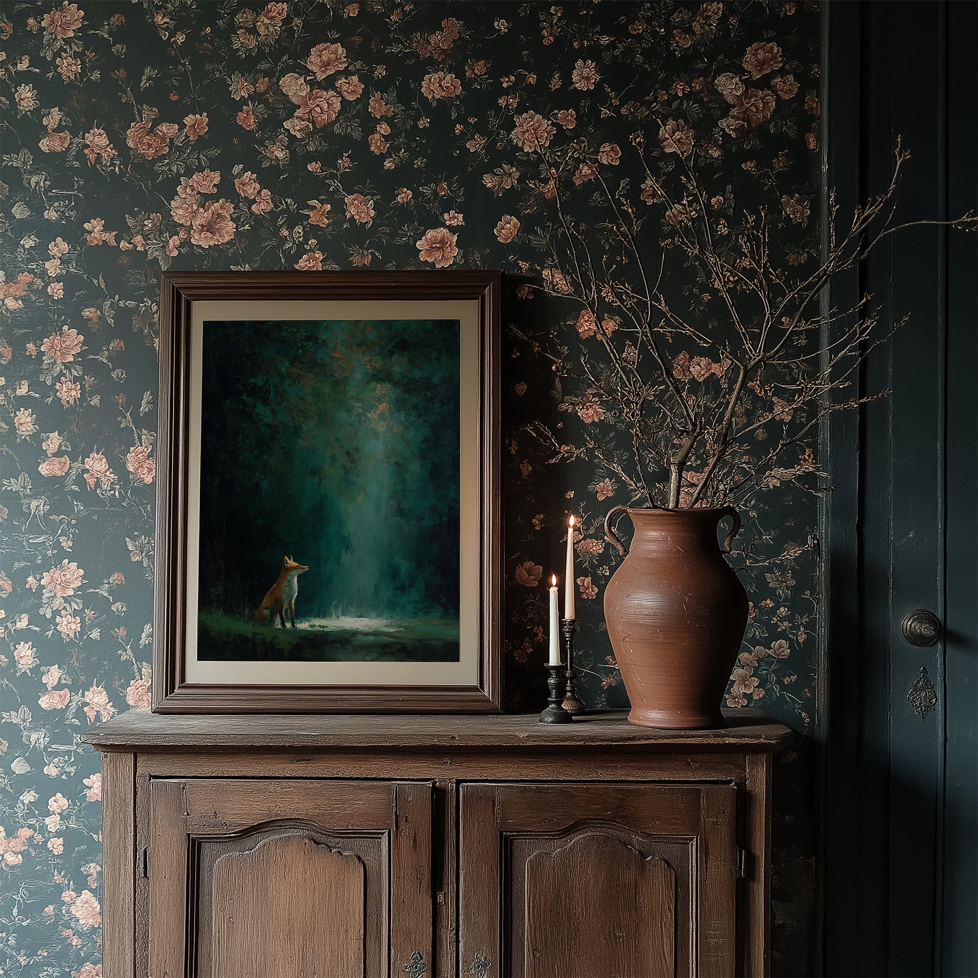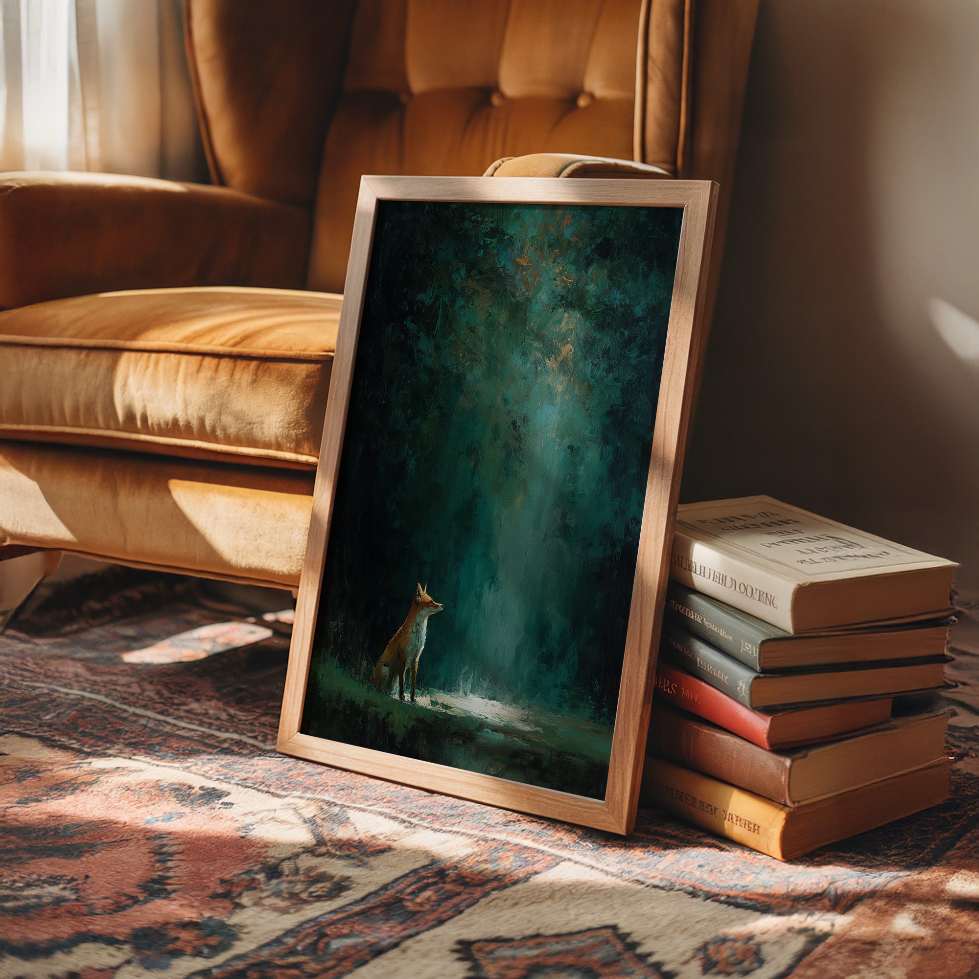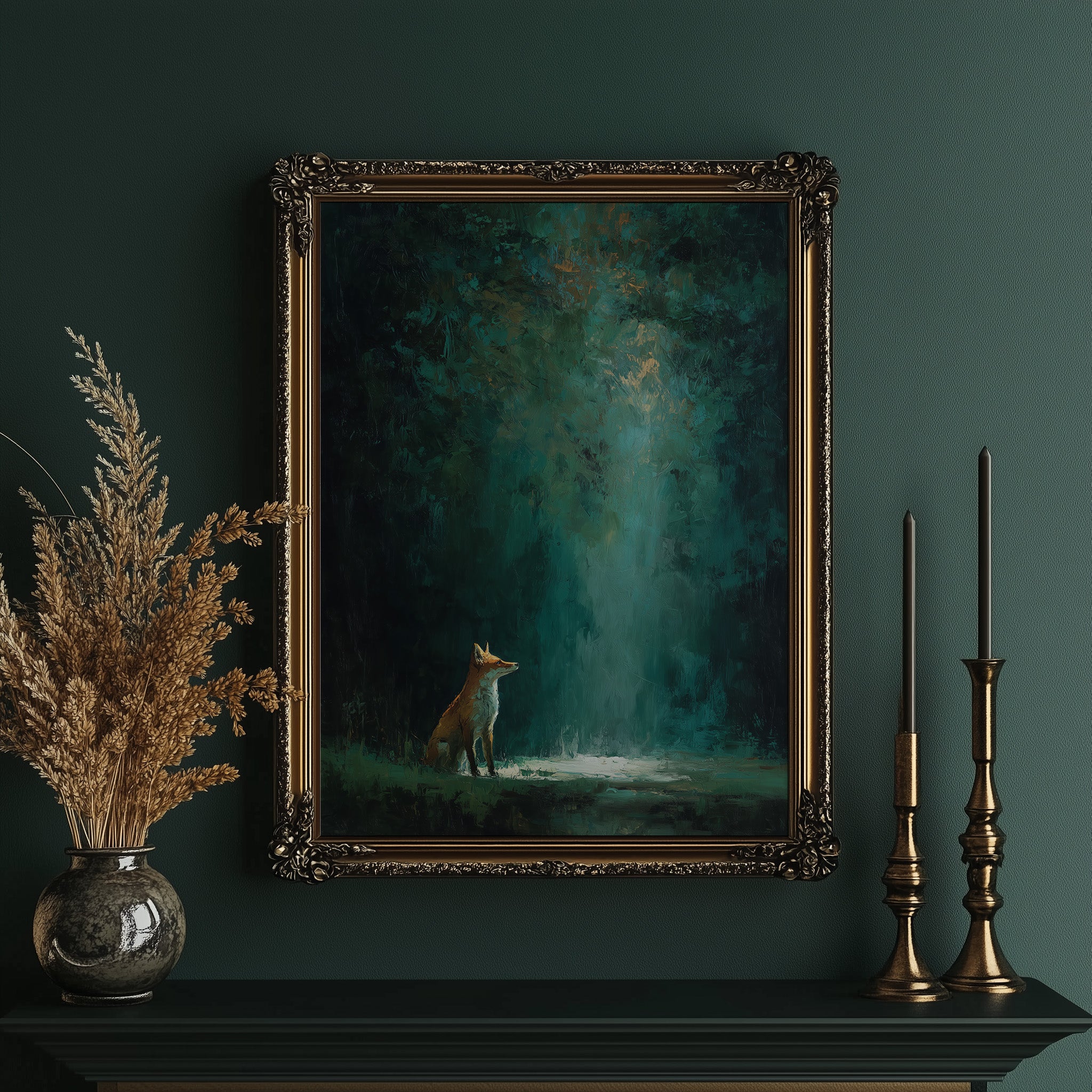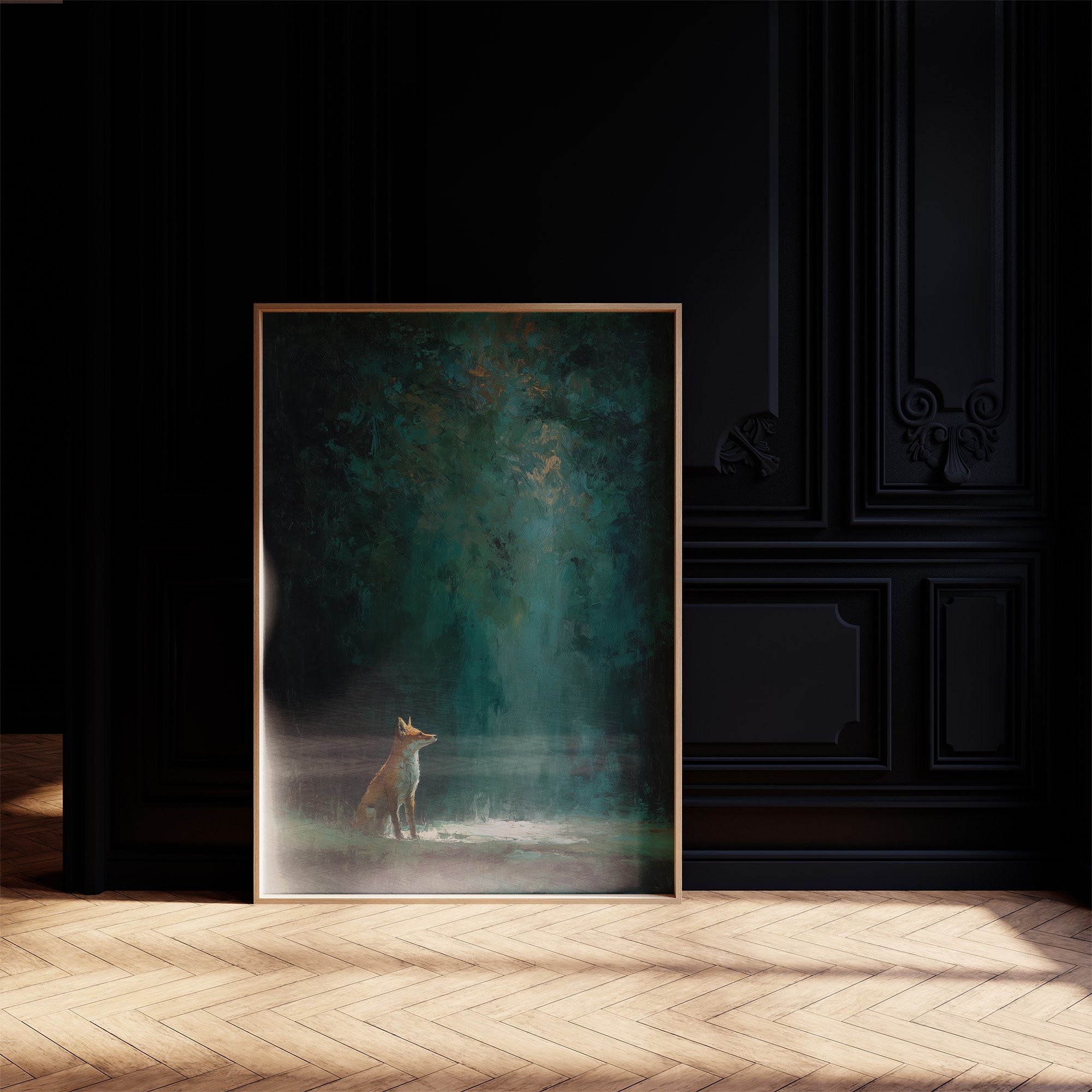 A solitary fox pauses in a pool of ethereal light, its russet coat luminous against the misty forest floor. Deep emerald and teal tones cascade from above, creating a mystical canopy where reality blurs with fantasy. The atmospheric painting captures that fleeting moment between dusk and darkness, where wilderness holds its secrets in hushed reverence. This contemplative piece brings woodland enchantment to sophisticated spaces, creating a focal point that invites both conversation and quiet reflection.