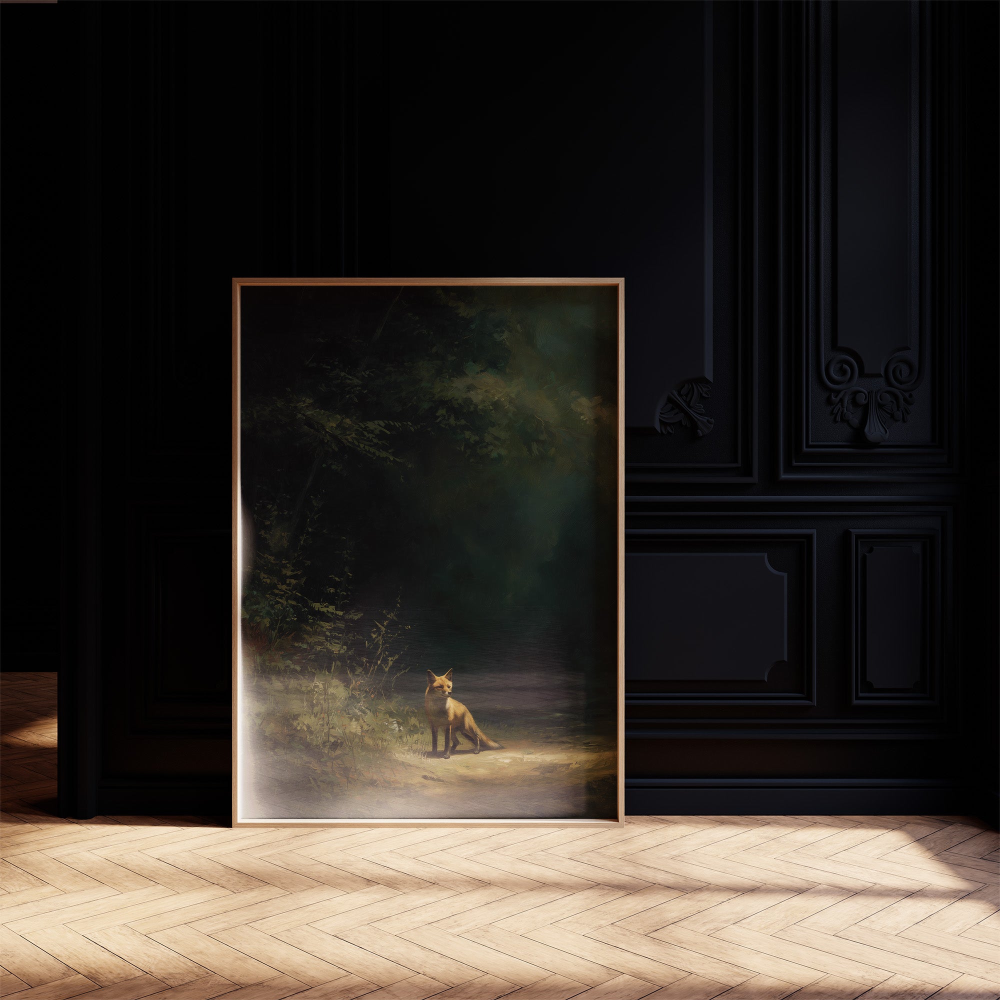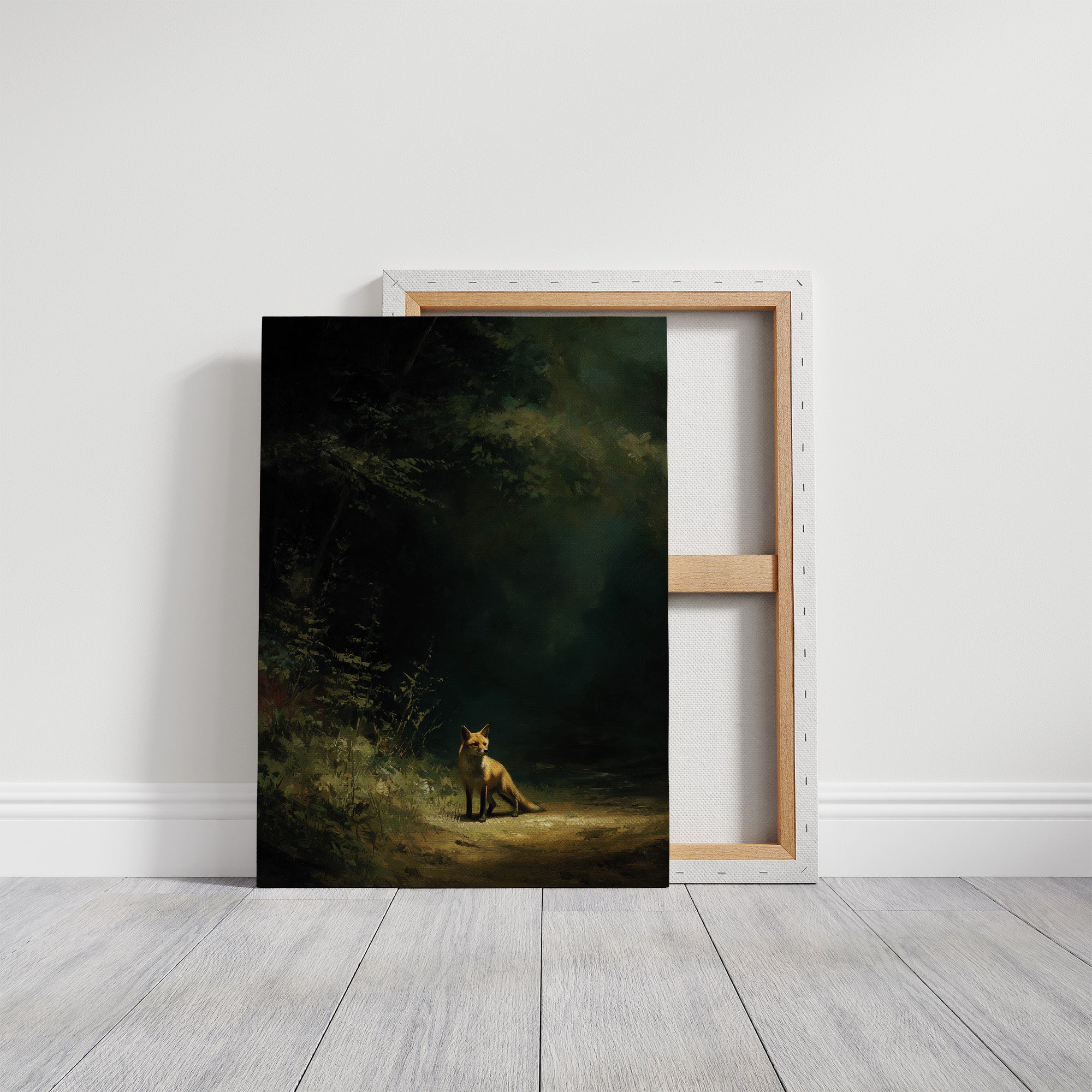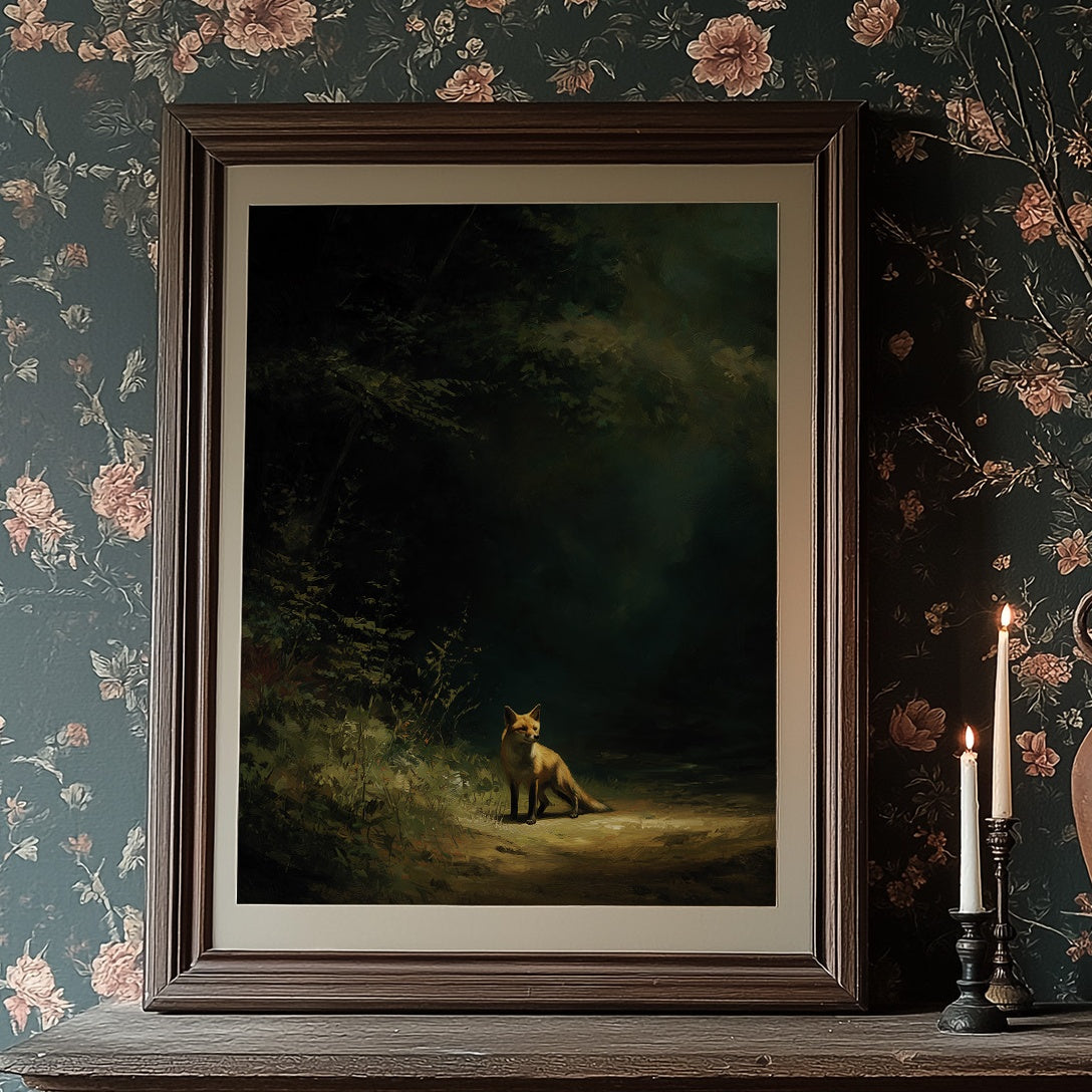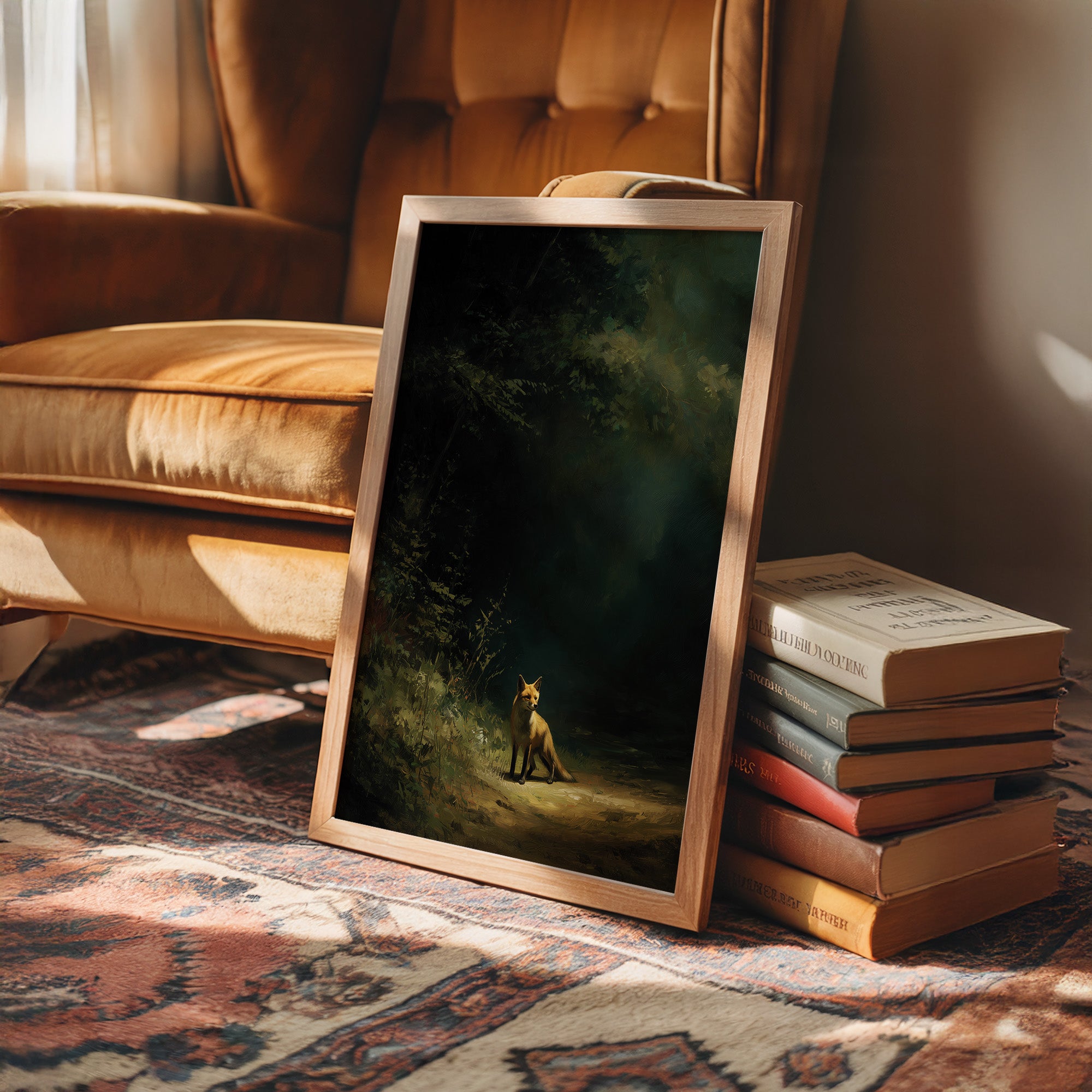 A solitary fox pauses in a pool of light, caught between shadow and illumination. The mysterious woodland scene evokes a moment of perfect stillness, where time seems suspended in the misty emerald darkness. Deep forest greens and earthy tones create a dreamlike atmosphere, the fox's amber coat glowing against the ethereal backdrop like a beacon in twilight. This atmospheric piece brings a touch of woodland mystique to formal living spaces or studies where contemplative art creates conversation.