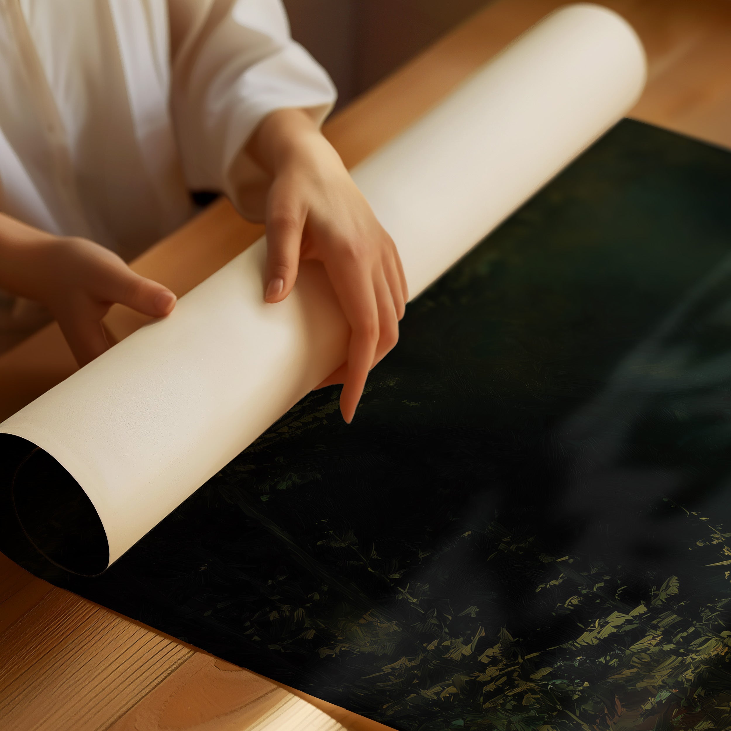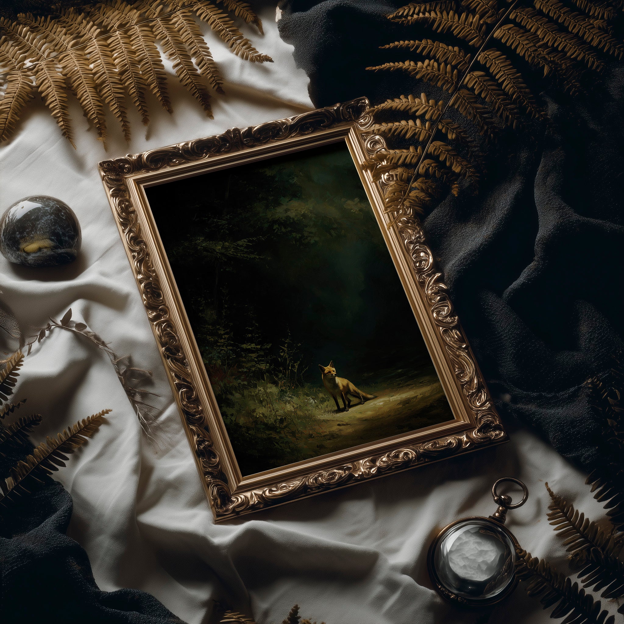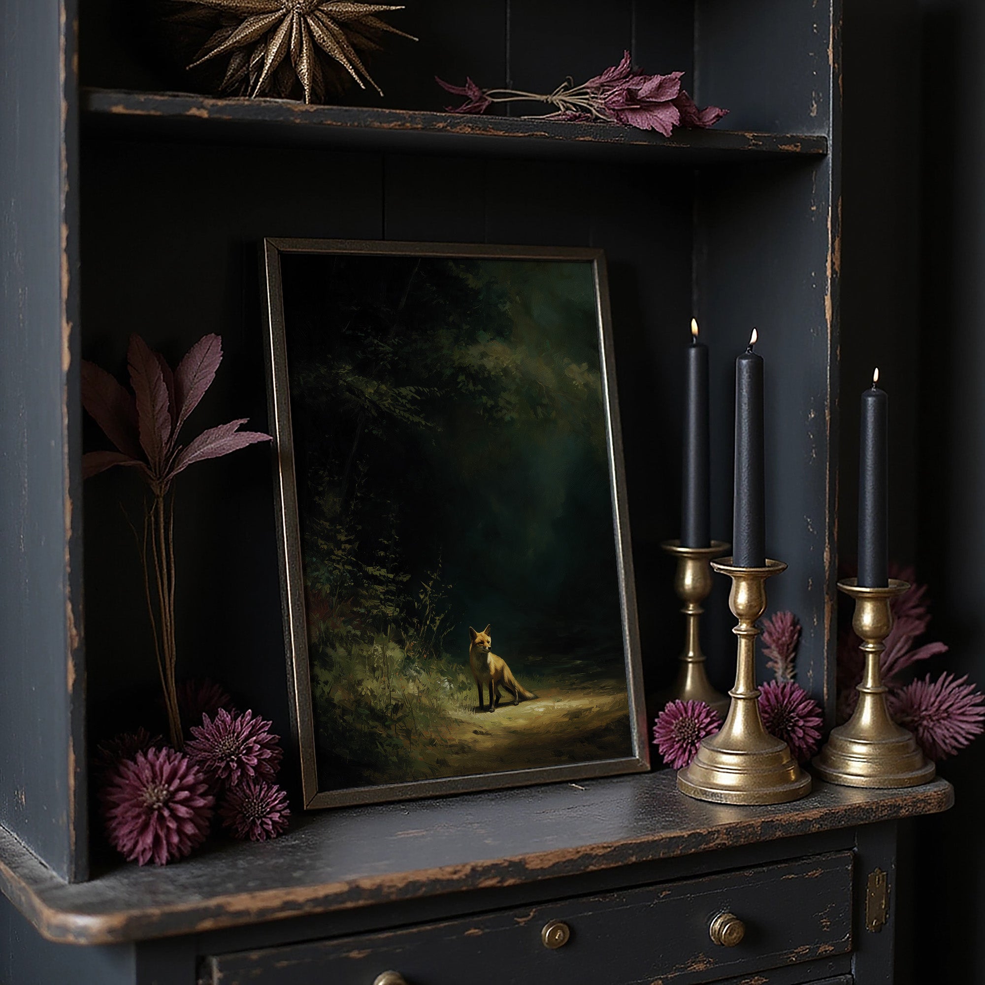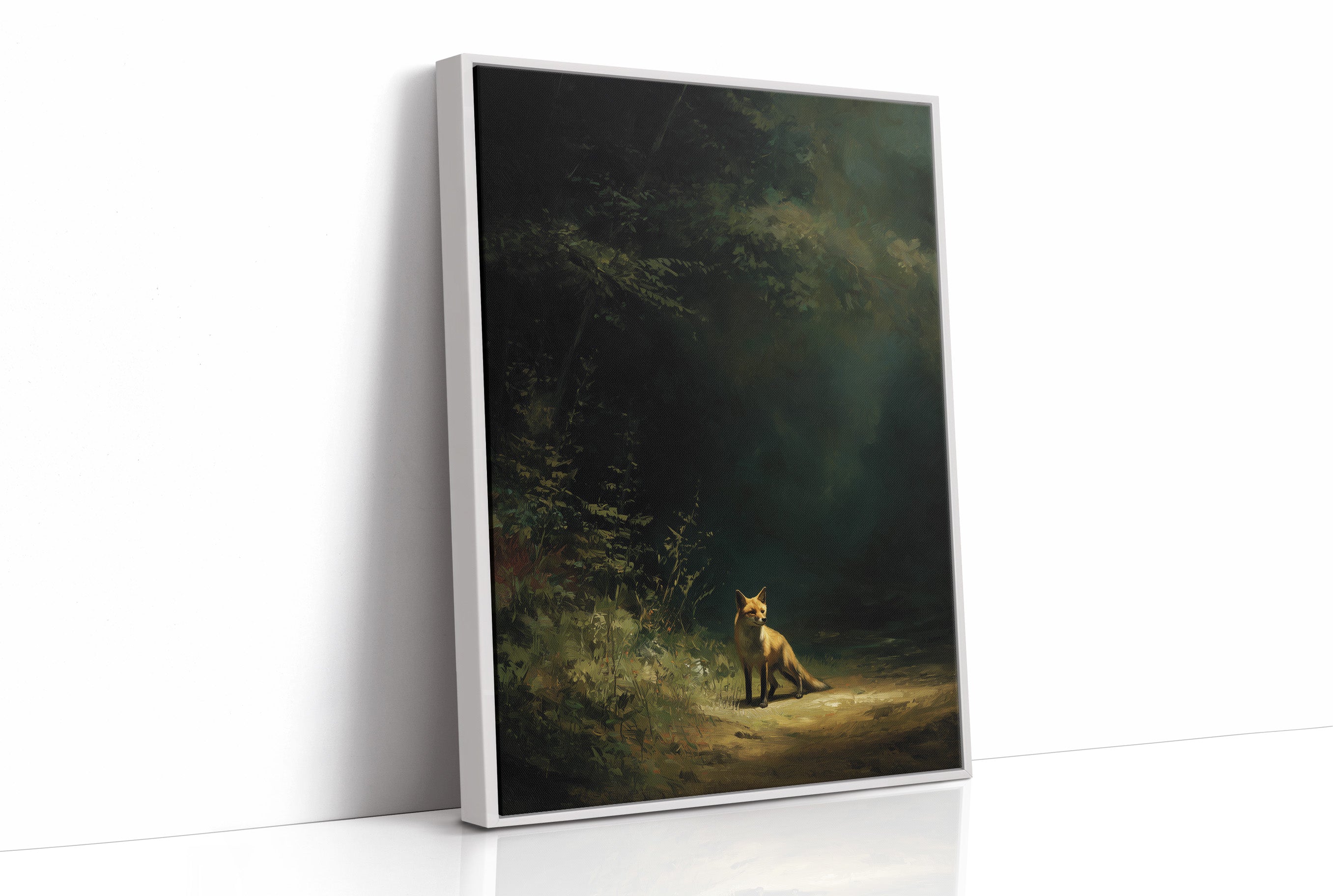 A solitary fox pauses in a pool of light, caught between shadow and illumination. The mysterious woodland scene evokes a moment of perfect stillness, where time seems suspended in the misty emerald darkness. Deep forest greens and earthy tones create a dreamlike atmosphere, the fox's amber coat glowing against the ethereal backdrop like a beacon in twilight. This atmospheric piece brings a touch of woodland mystique to formal living spaces or studies where contemplative art creates conversation.