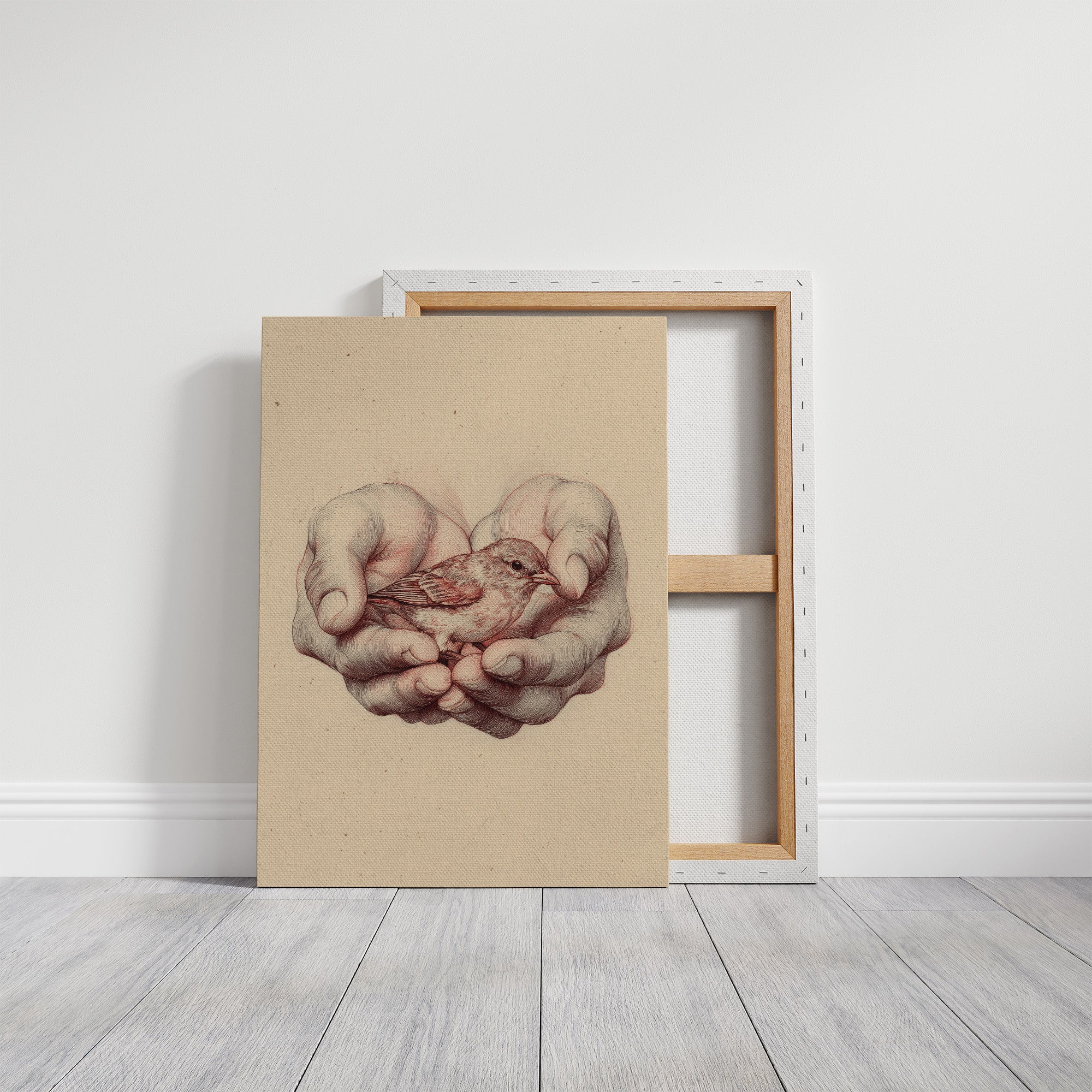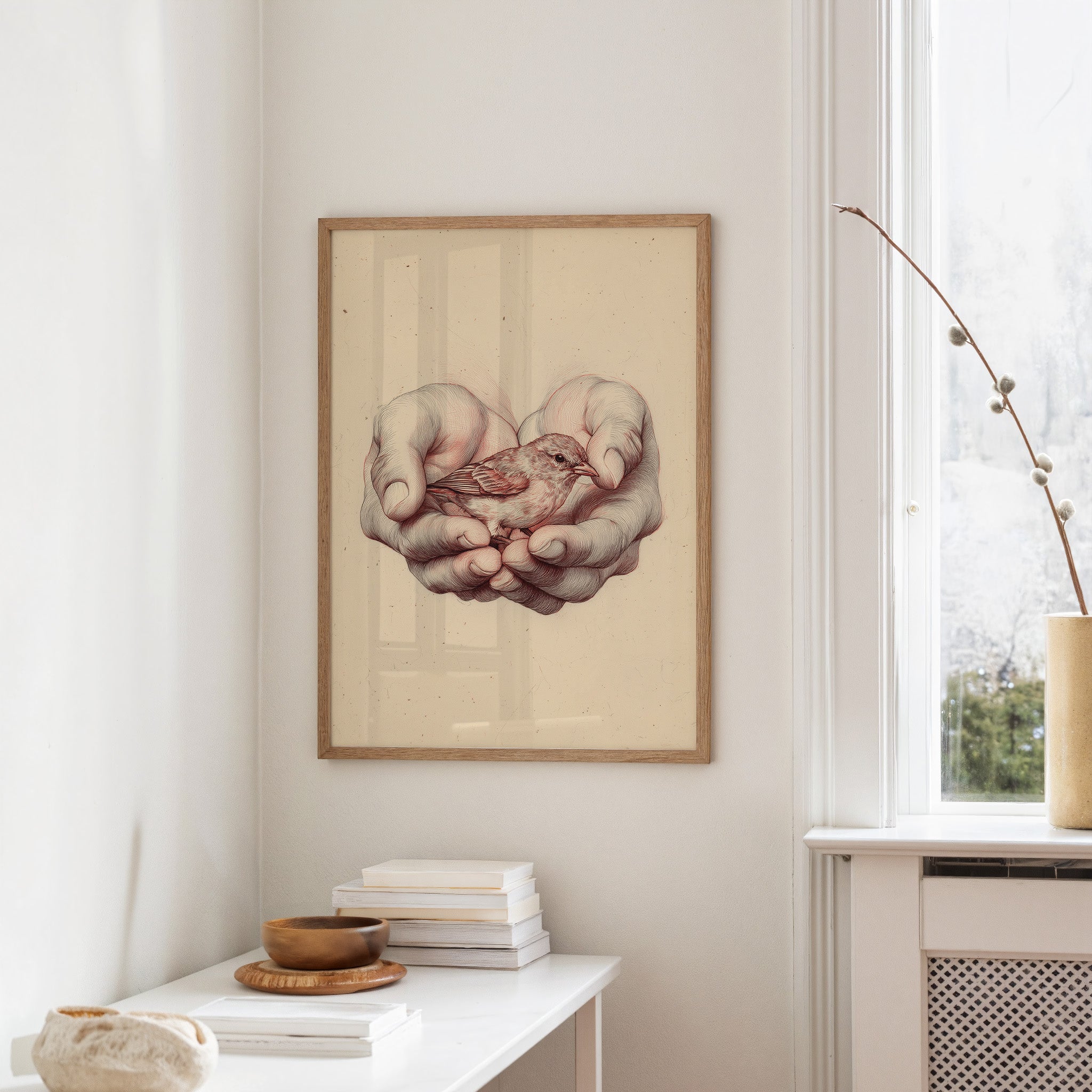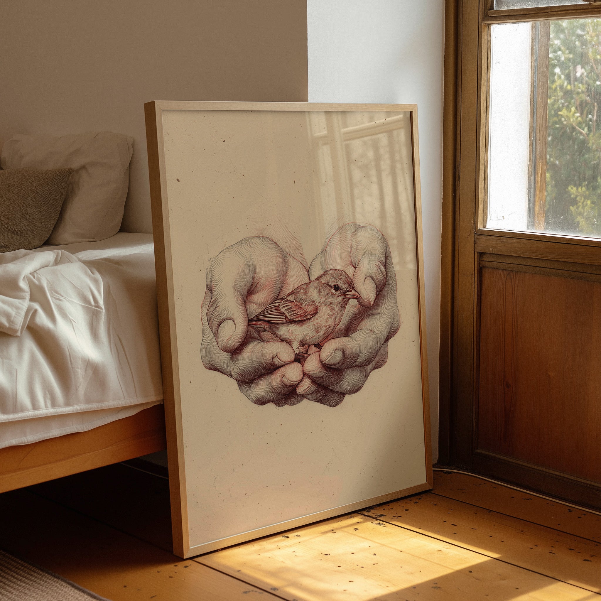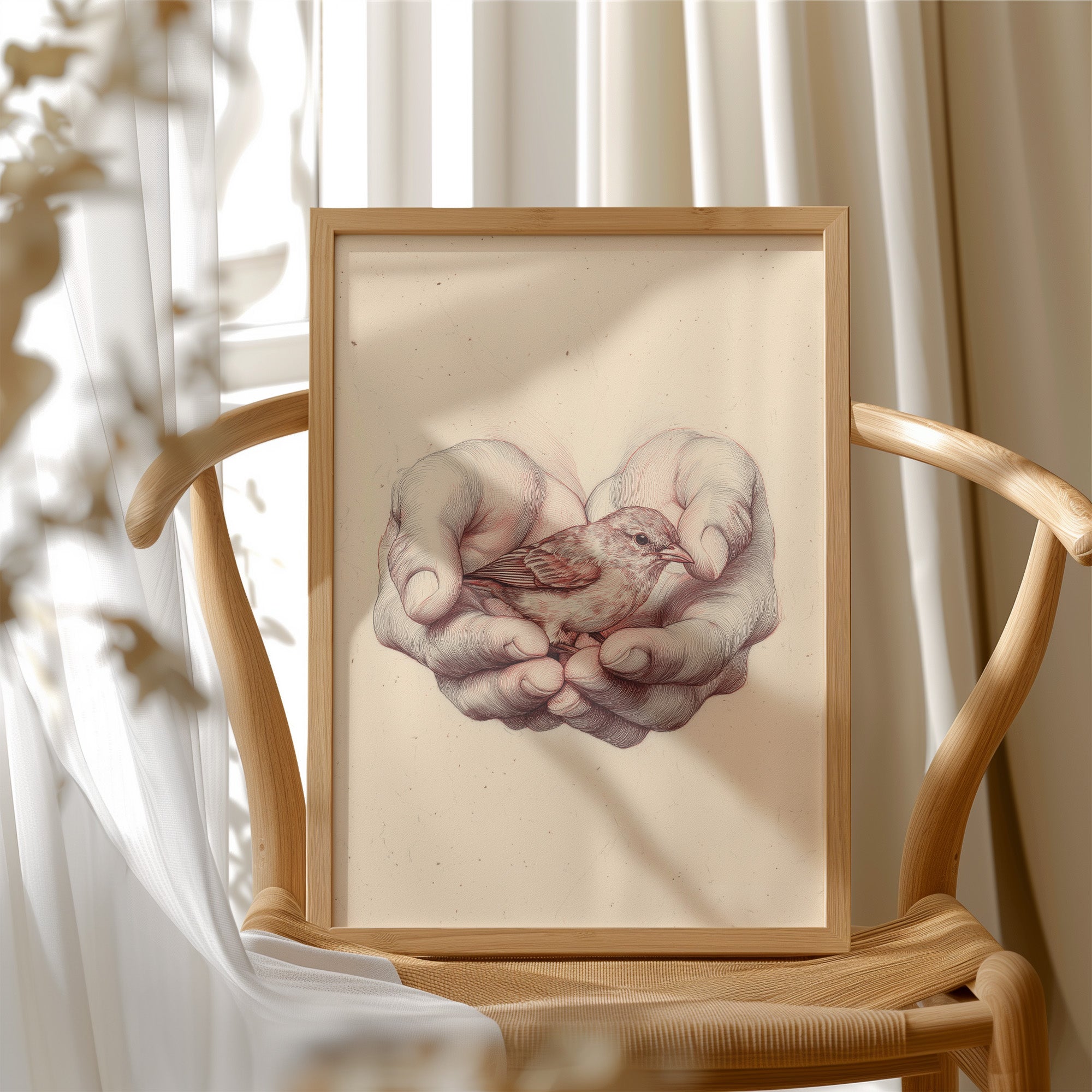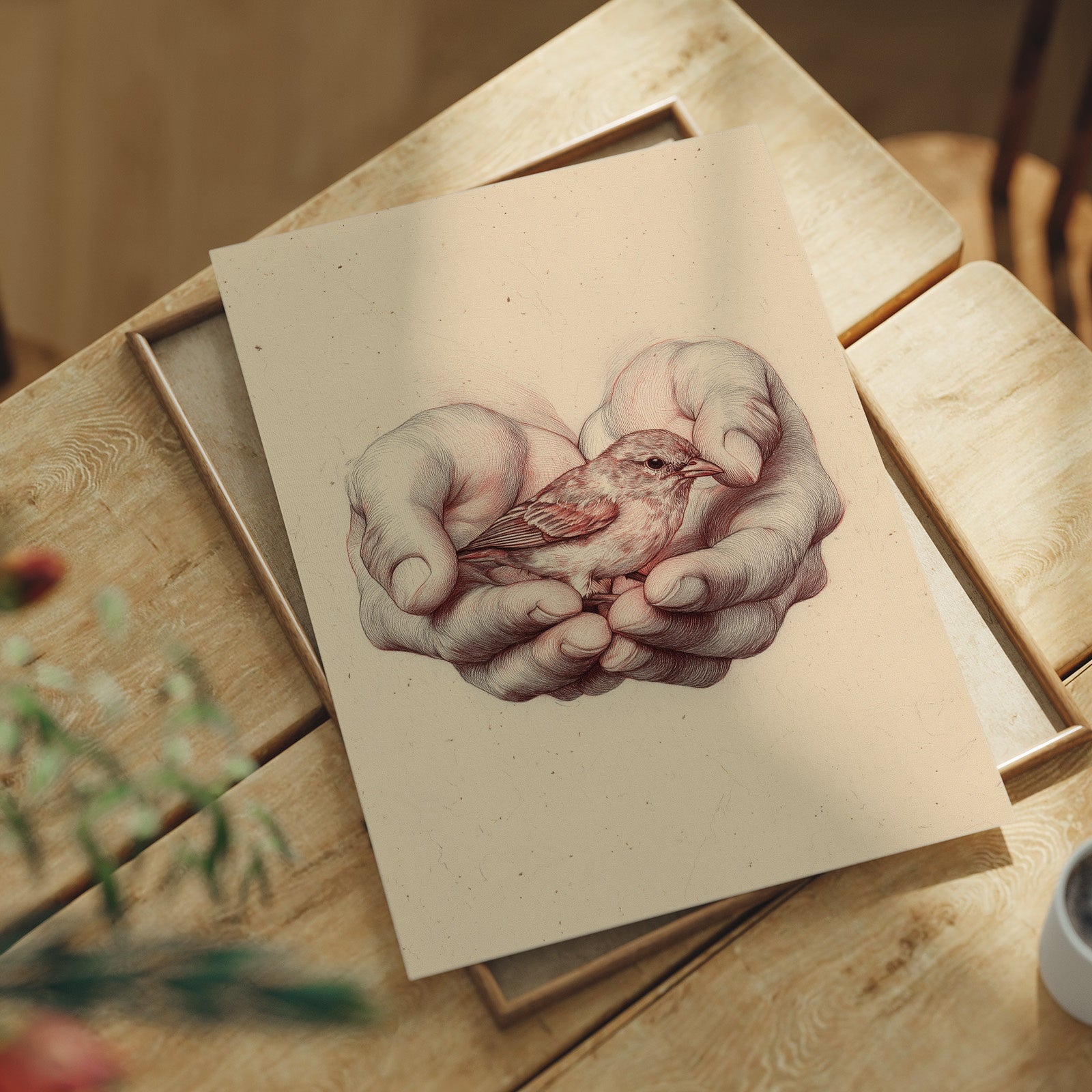 A delicate sparrow rests in cupped palms, vulnerable yet protected in this moment of tender connection. The detailed illustration captures every feather of the small bird and each line of the hands that cradle it, rendered in soft pinks and browns against cream-colored paper. This thoughtful piece speaks to the gentle relationship between humanity and nature, a visual poem about stewardship and care.