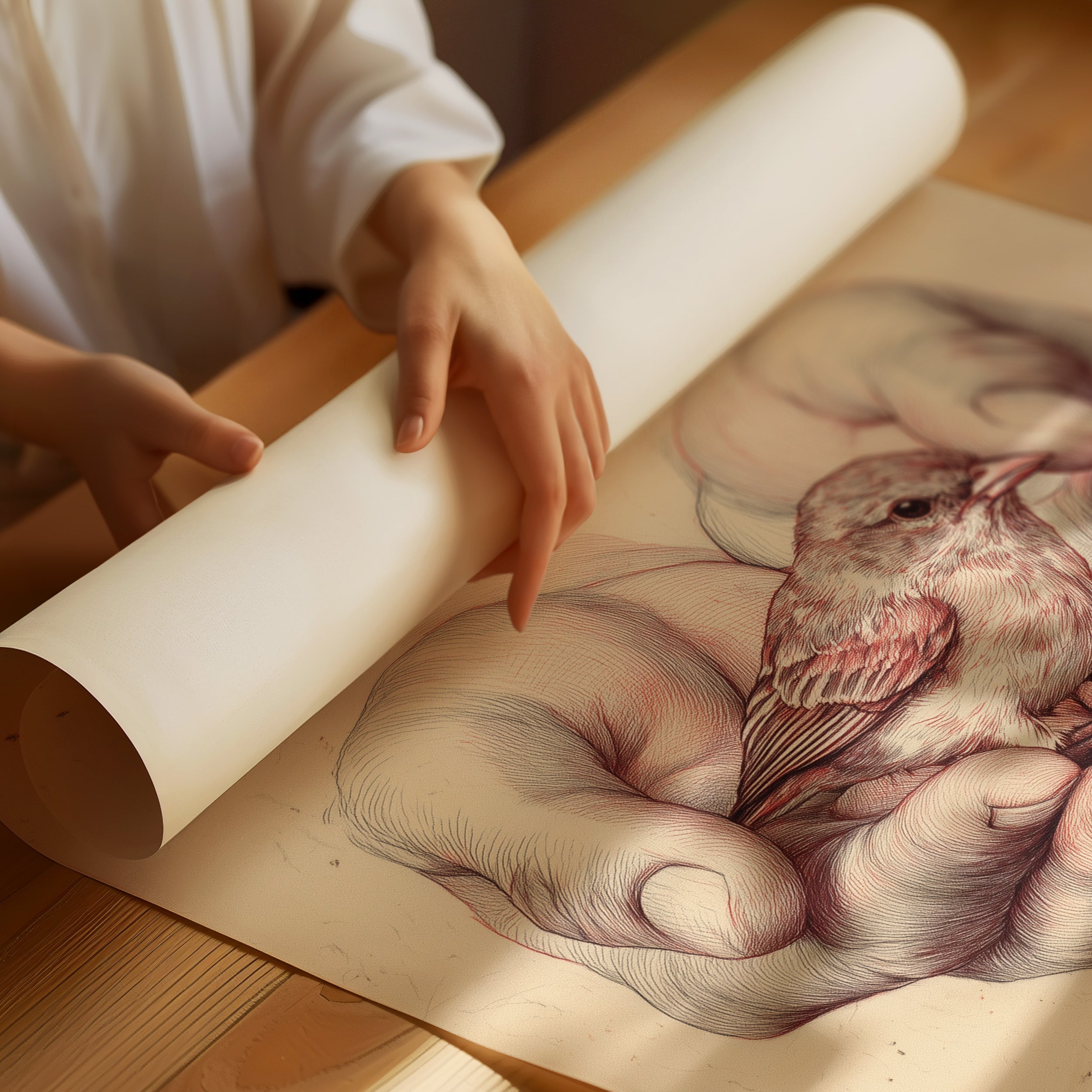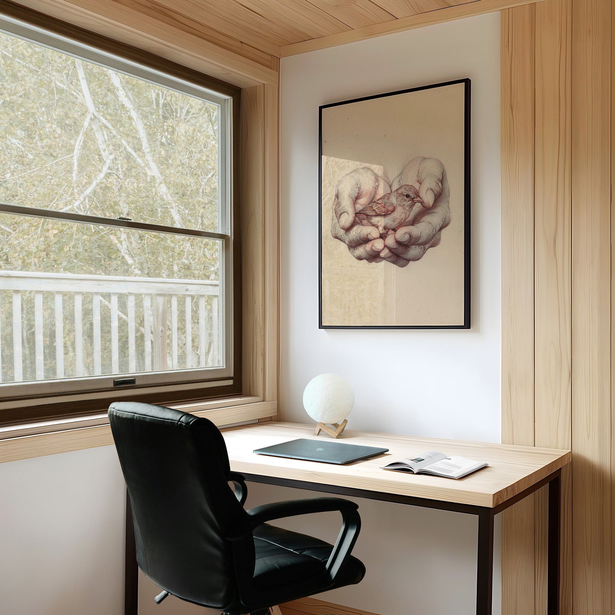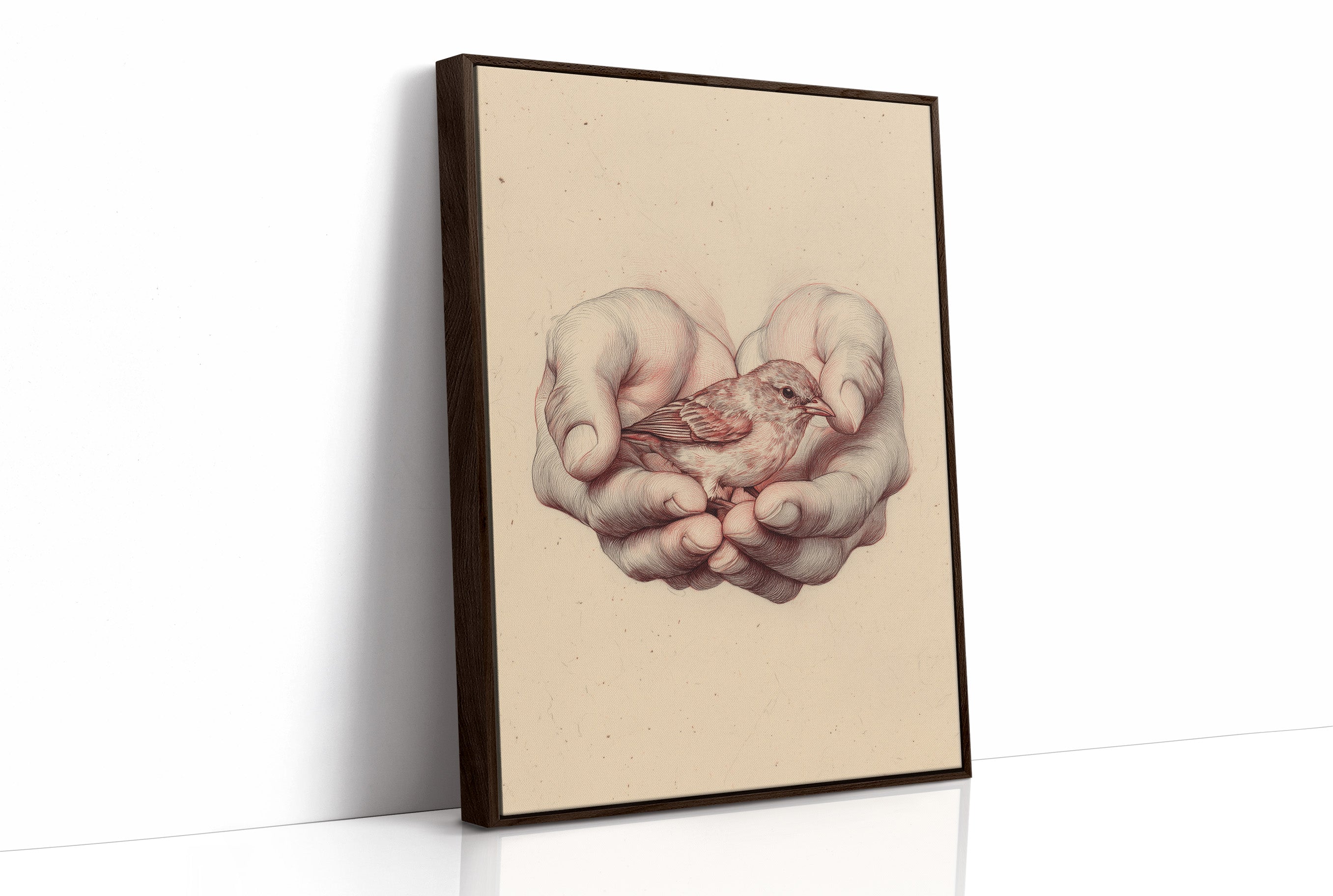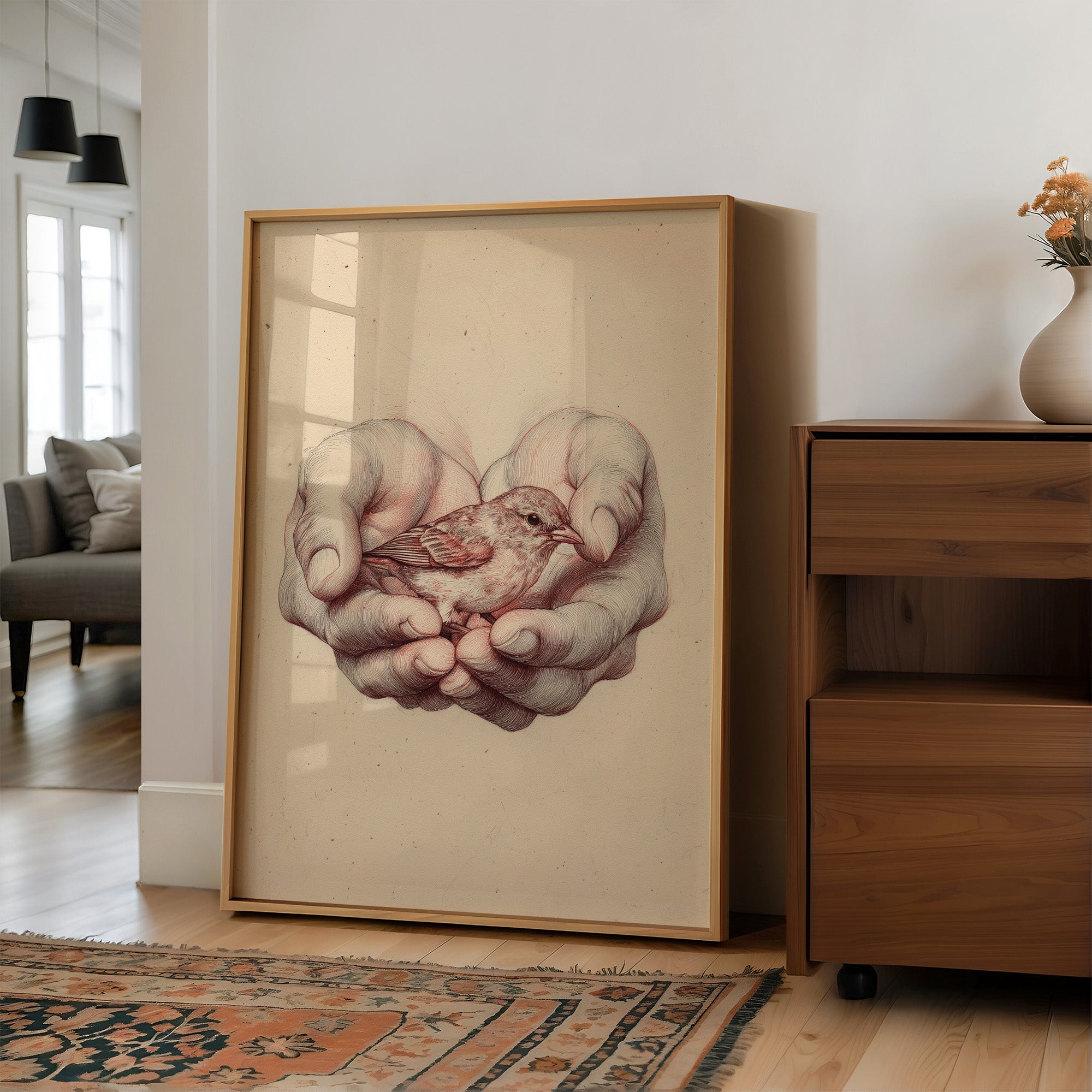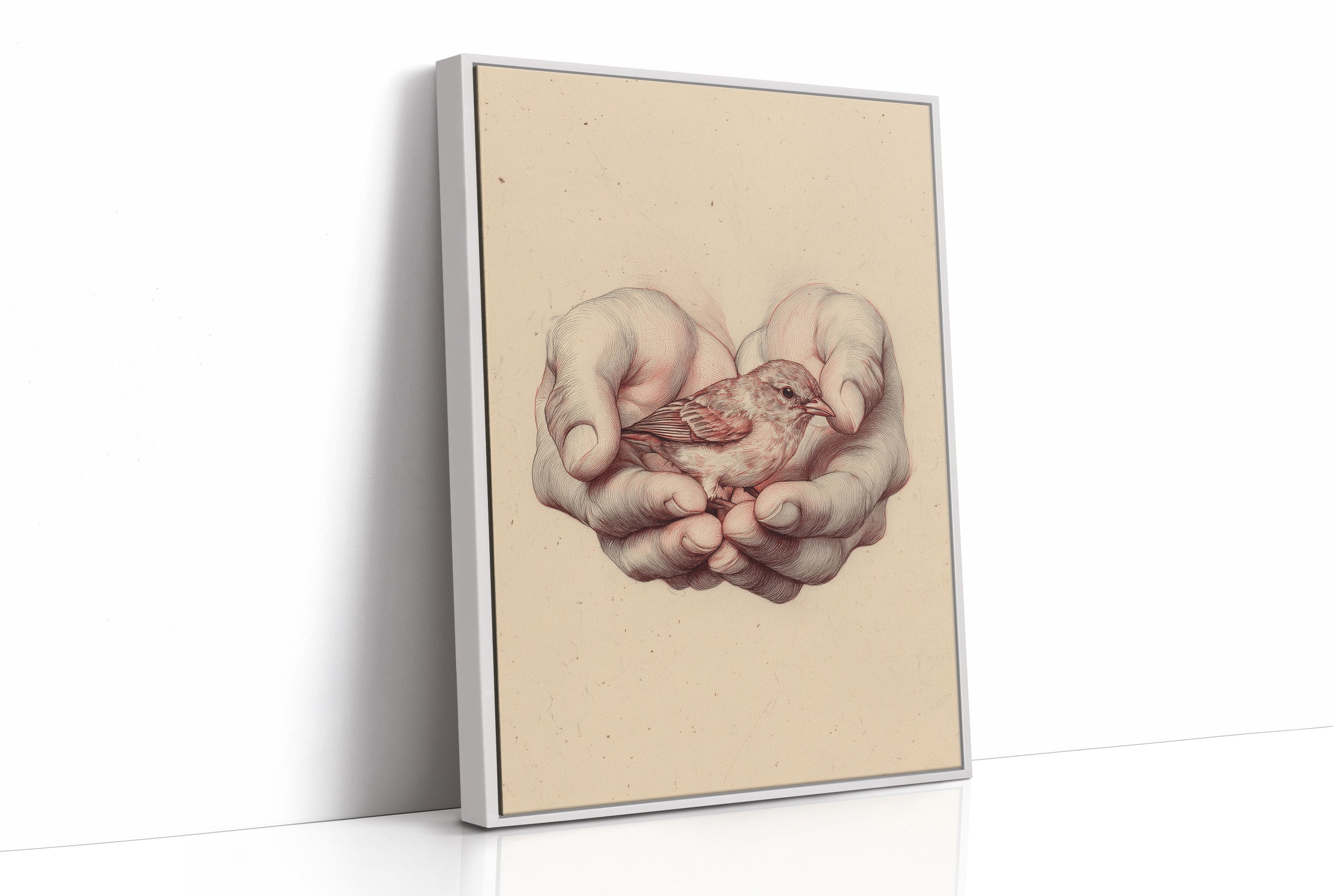 A delicate sparrow rests in cupped palms, vulnerable yet protected in this moment of tender connection. The detailed illustration captures every feather of the small bird and each line of the hands that cradle it, rendered in soft pinks and browns against cream-colored paper. This thoughtful piece speaks to the gentle relationship between humanity and nature, a visual poem about stewardship and care.