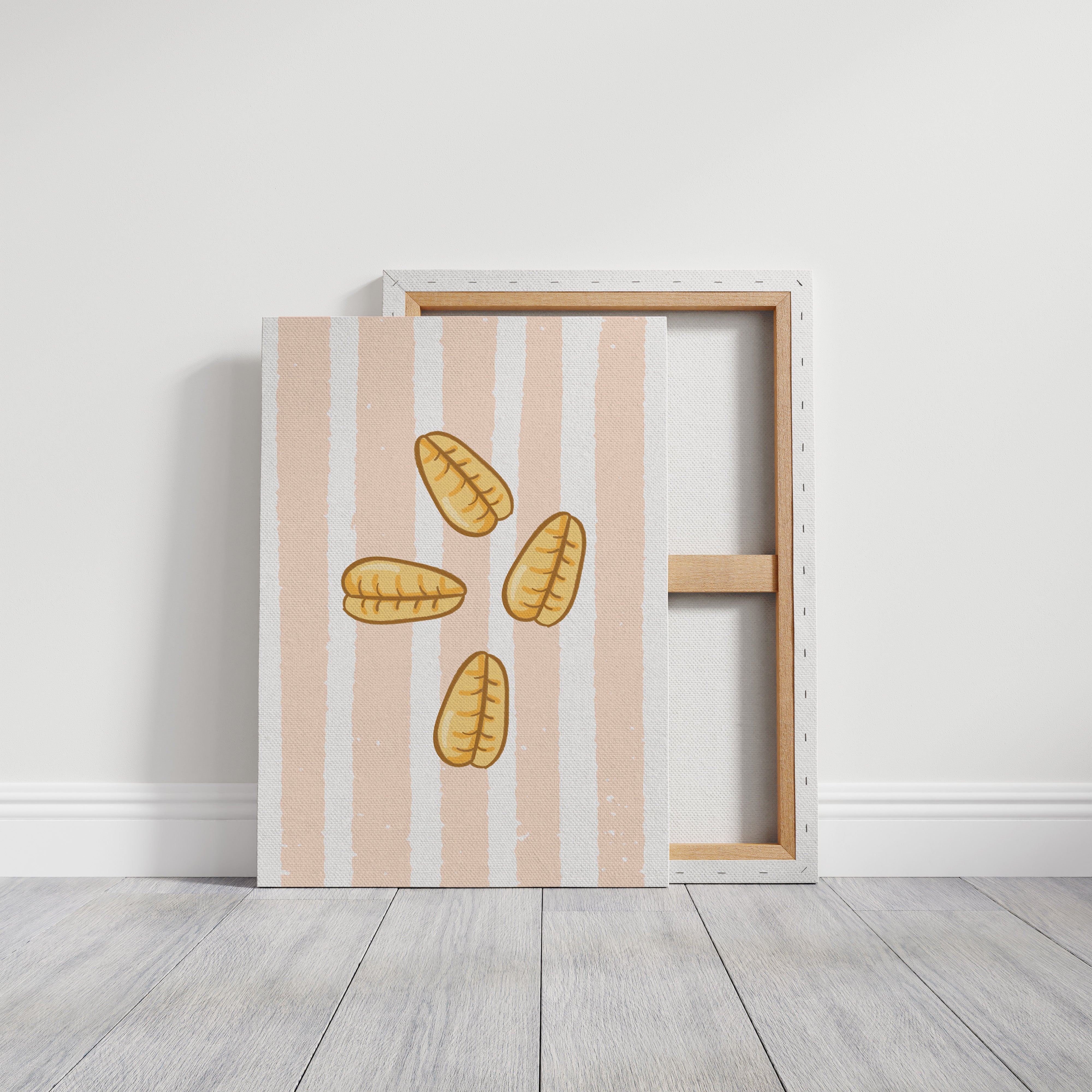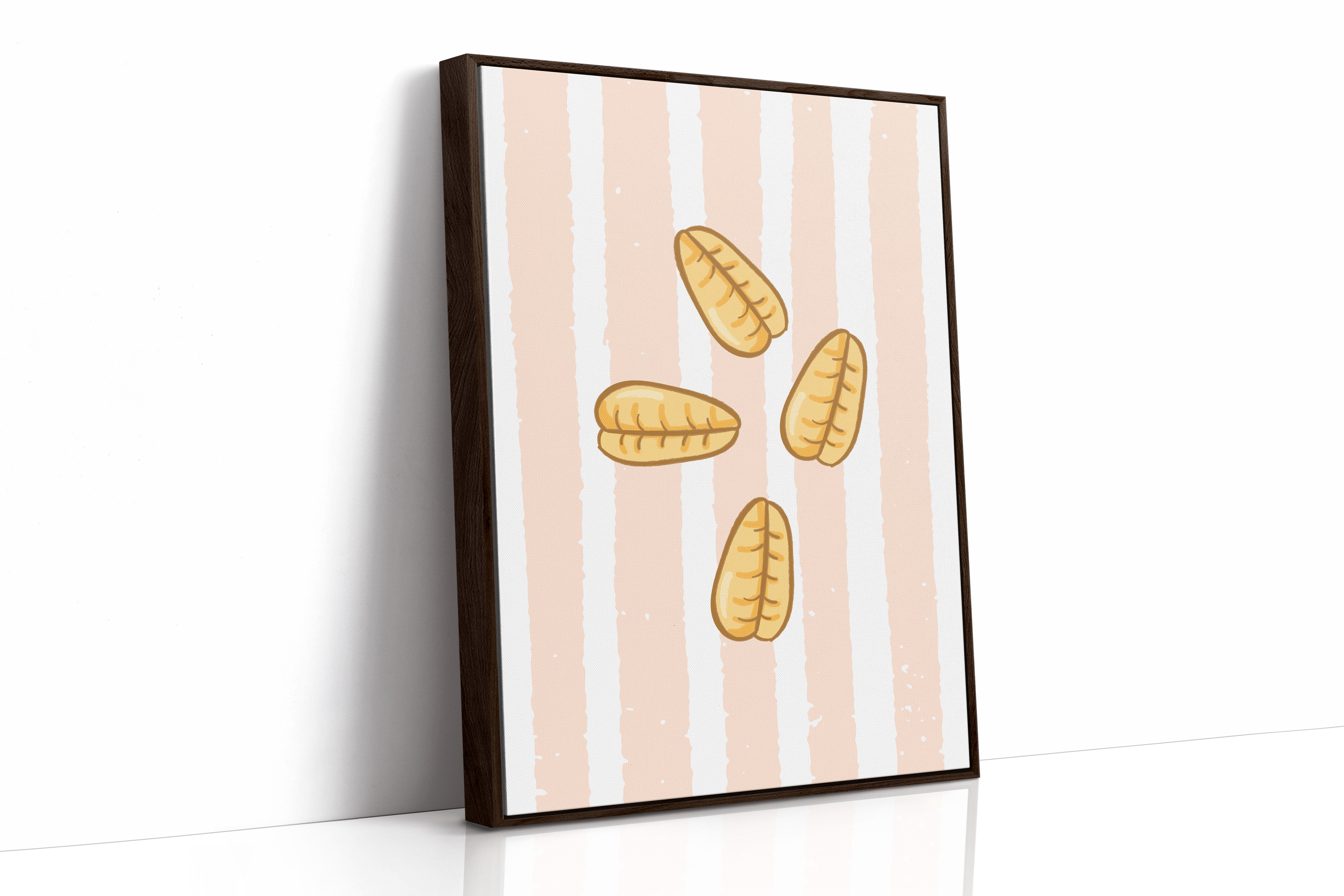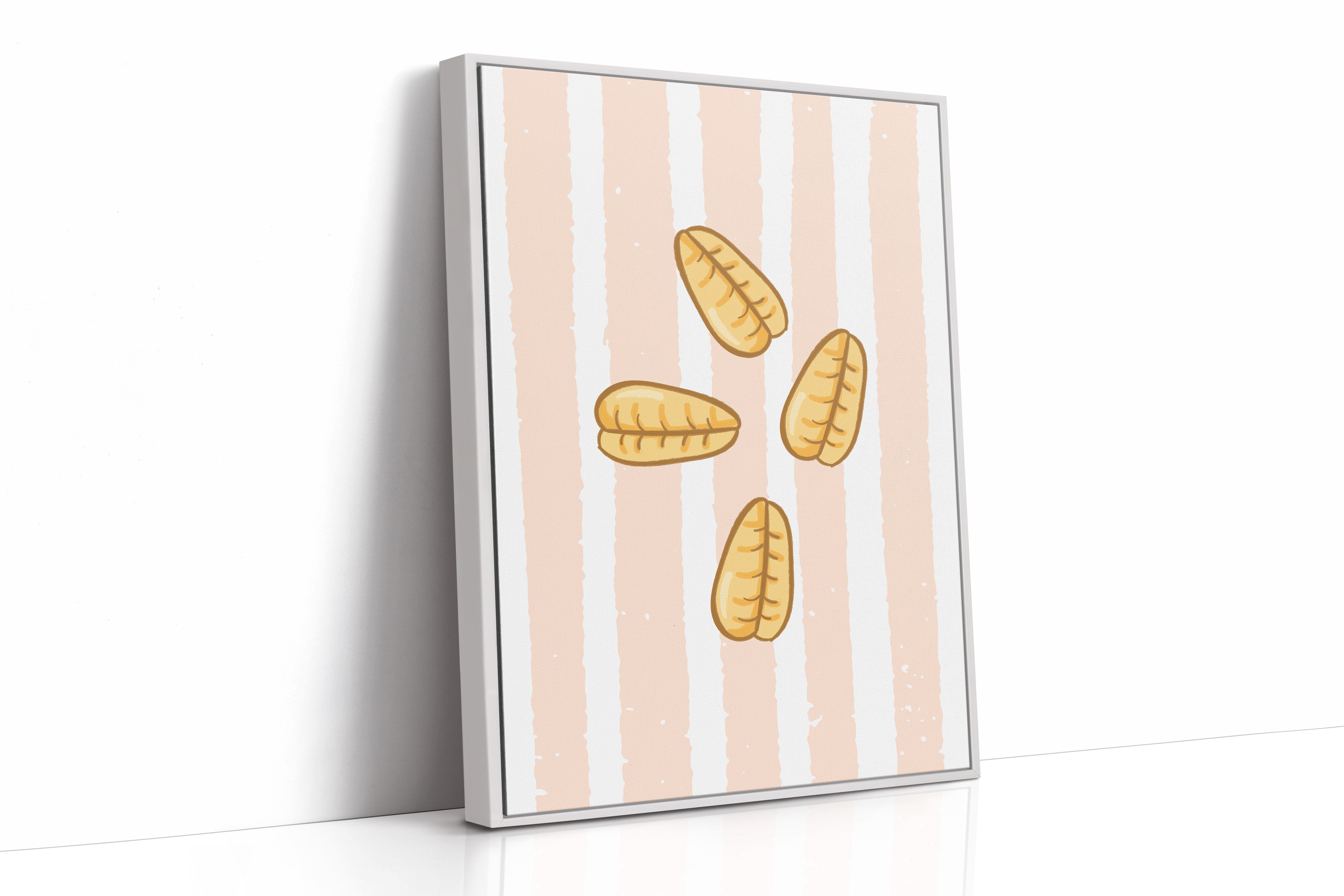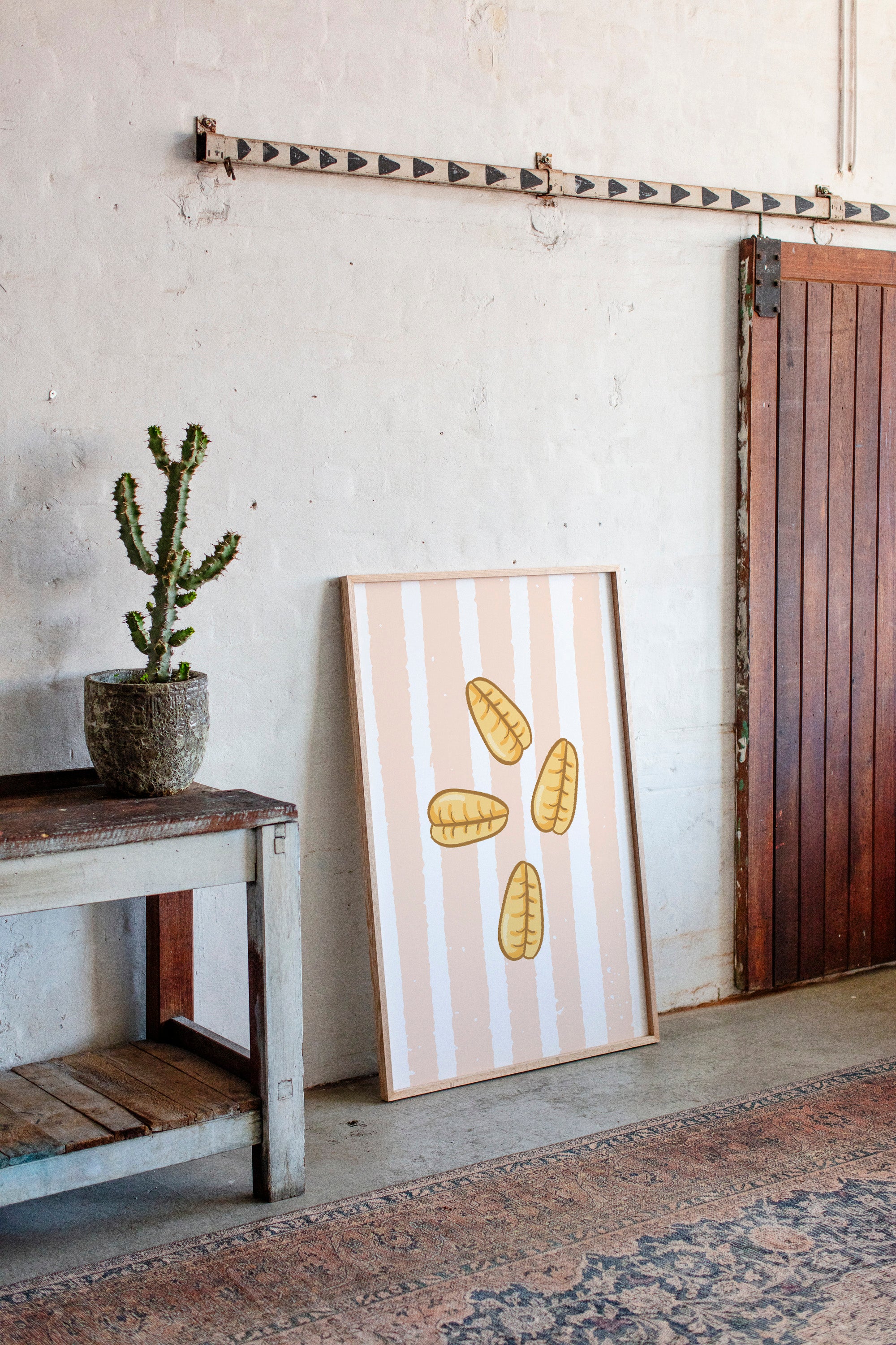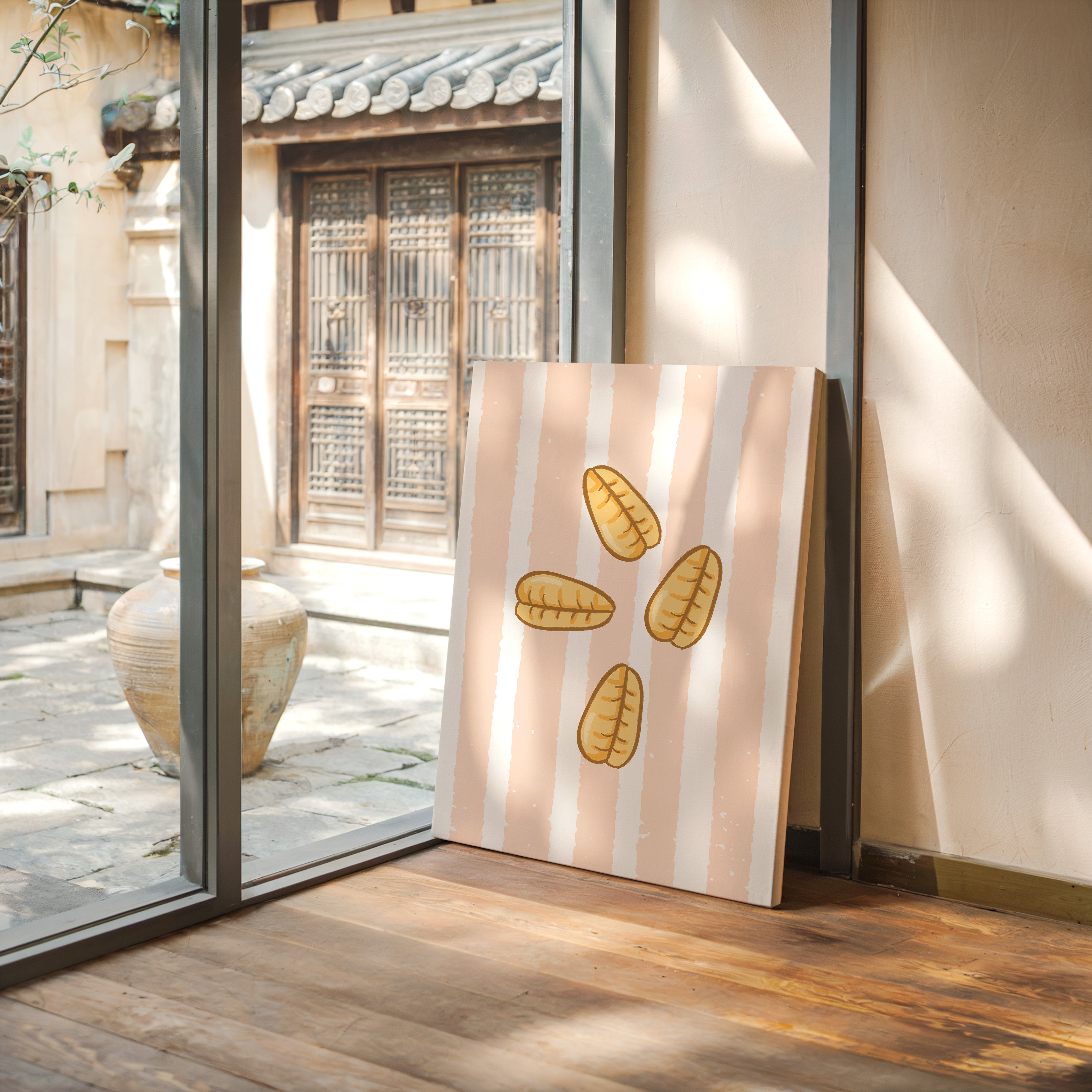 The aroma of fresh-baked bread wafts through striped sunlight, as golden baguettes dance weightlessly against a backdrop of blush pink stripes. This playful piece from our Contemporary collection captures the whimsical spirit of French cafe culture with minimalist charm. Each artfully sketched loaf seems to defy gravity, their warm golden-brown crusts scored with delicate lines that catch the morning light. The soft peach and white striped background creates a dreamy, ethereal quality that transforms a simple breakfast staple into something magical. Perfect for adding a touch of Parisian charm to a kitchen, dining room, or any space where good food and conversation flow freely. The piece invites viewers to slow down and savor life's simple pleasures, one crusty bite at a time.