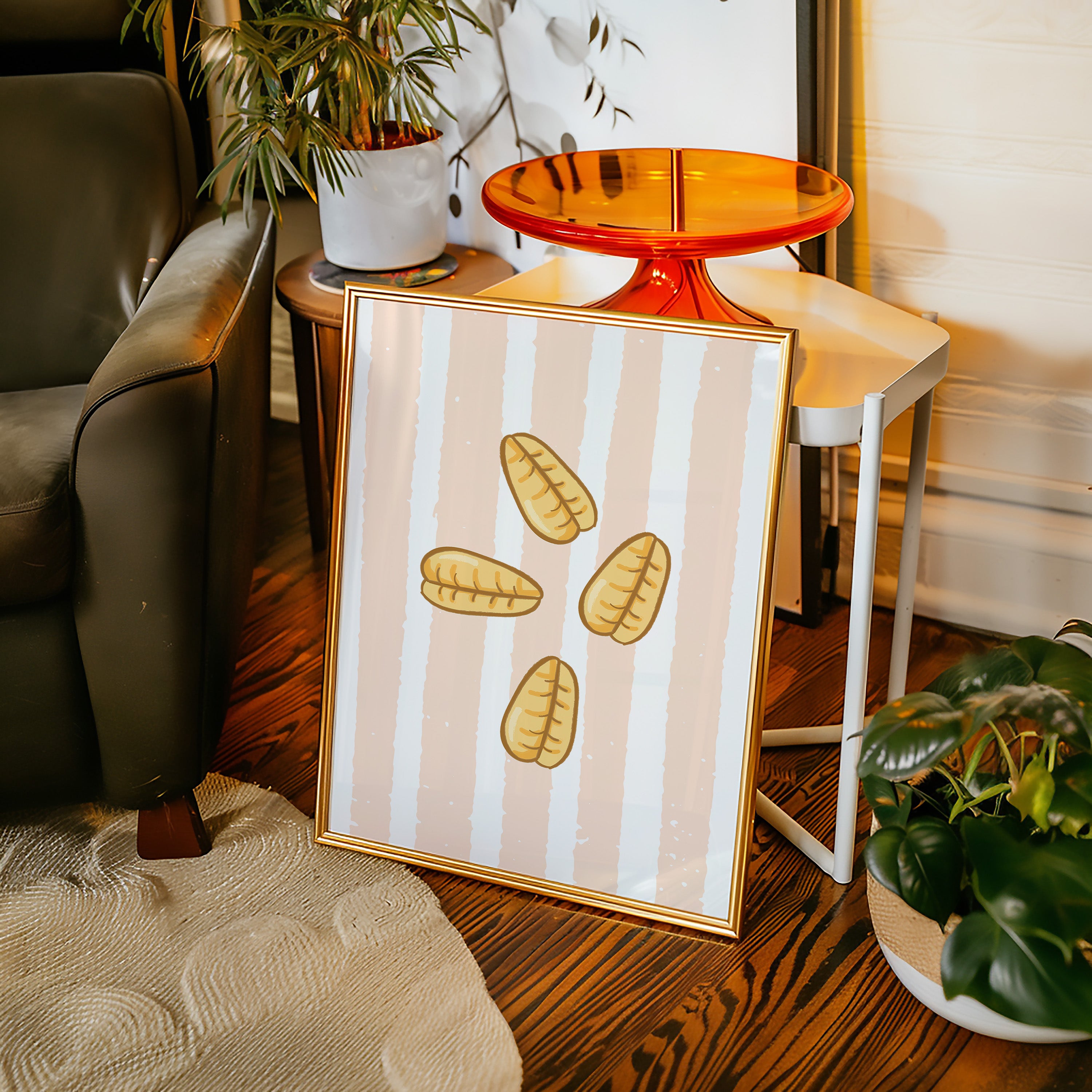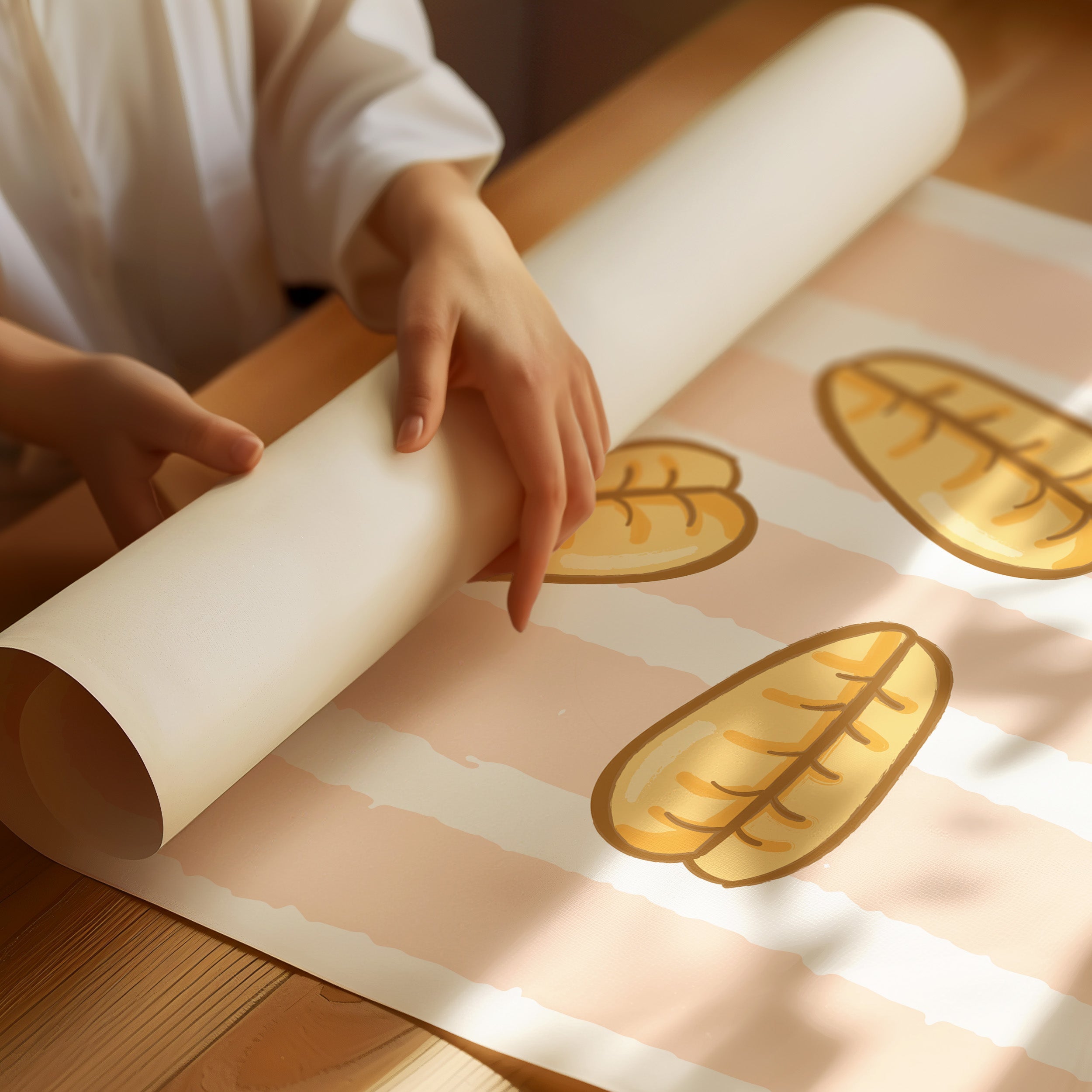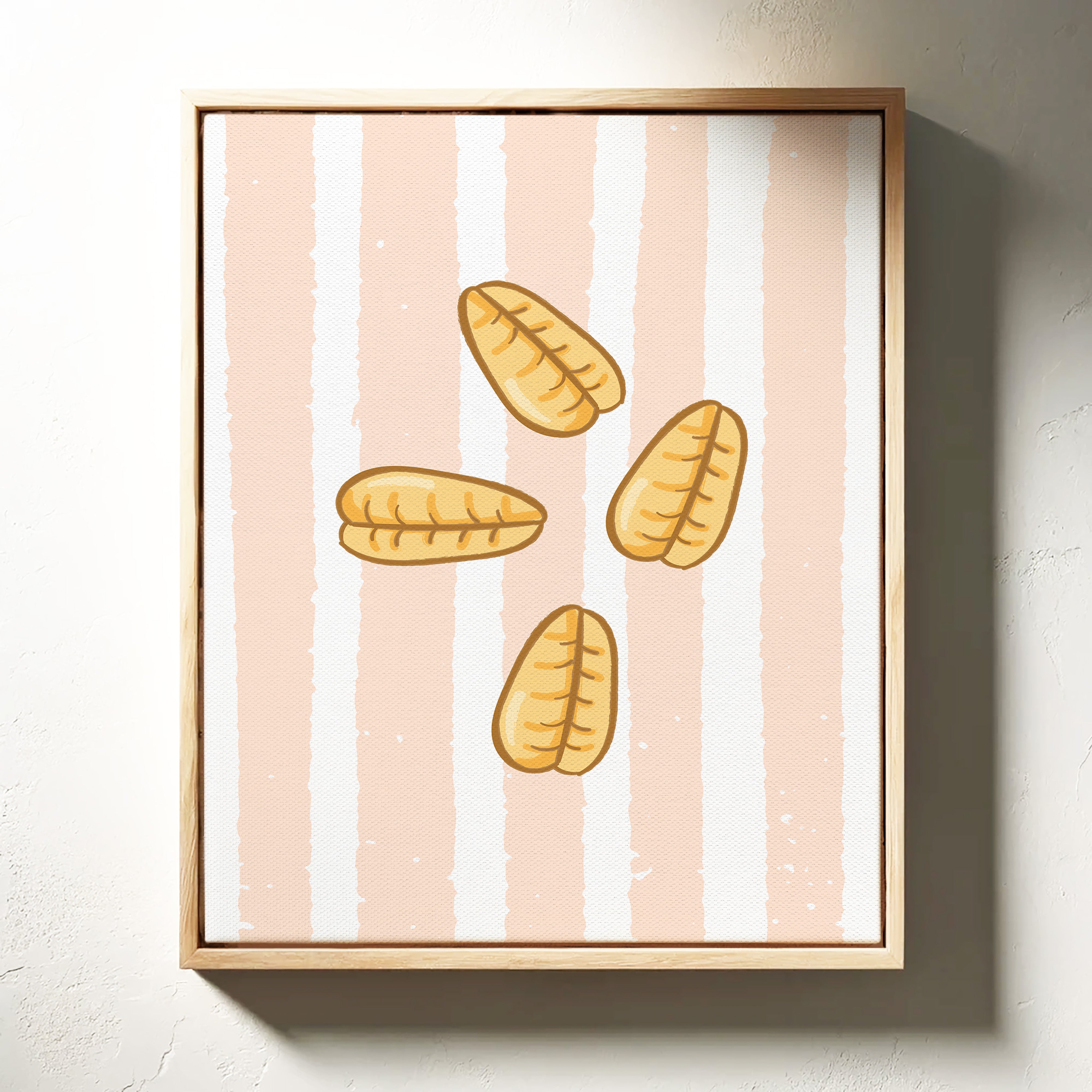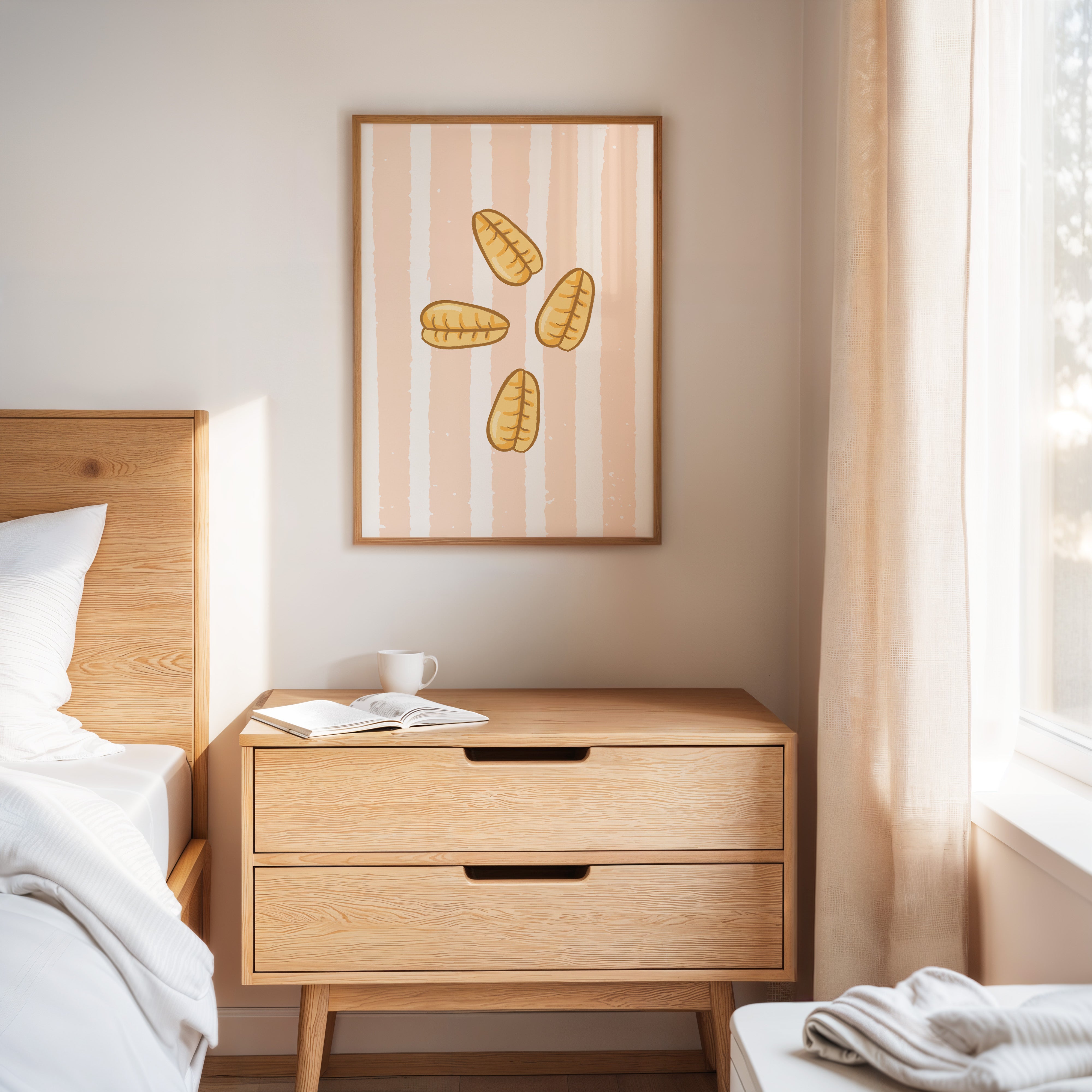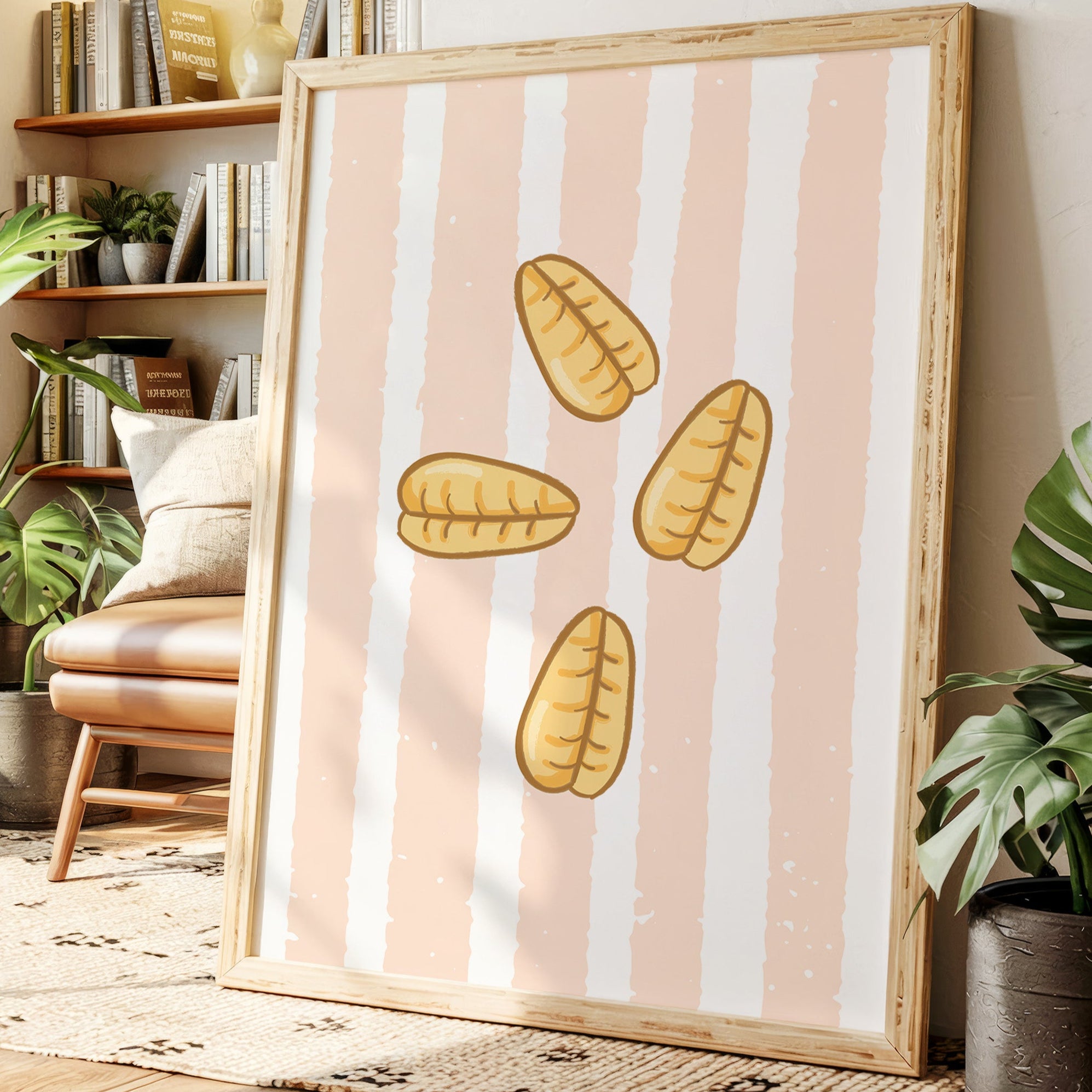 The aroma of fresh-baked bread wafts through striped sunlight, as golden baguettes dance weightlessly against a backdrop of blush pink stripes. This playful piece from our Contemporary collection captures the whimsical spirit of French cafe culture with minimalist charm. Each artfully sketched loaf seems to defy gravity, their warm golden-brown crusts scored with delicate lines that catch the morning light. The soft peach and white striped background creates a dreamy, ethereal quality that transforms a simple breakfast staple into something magical. Perfect for adding a touch of Parisian charm to a kitchen, dining room, or any space where good food and conversation flow freely. The piece invites viewers to slow down and savor life's simple pleasures, one crusty bite at a time.