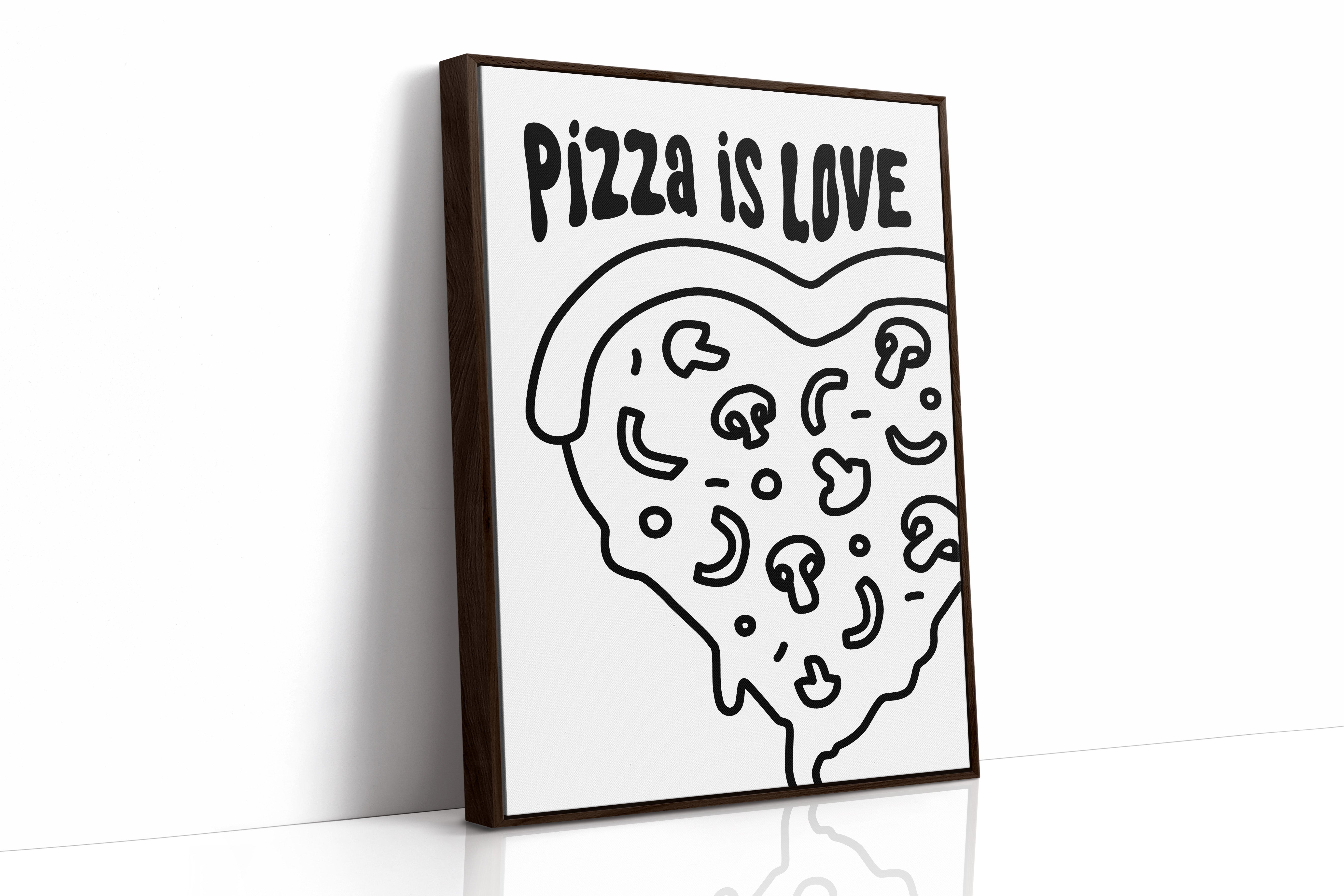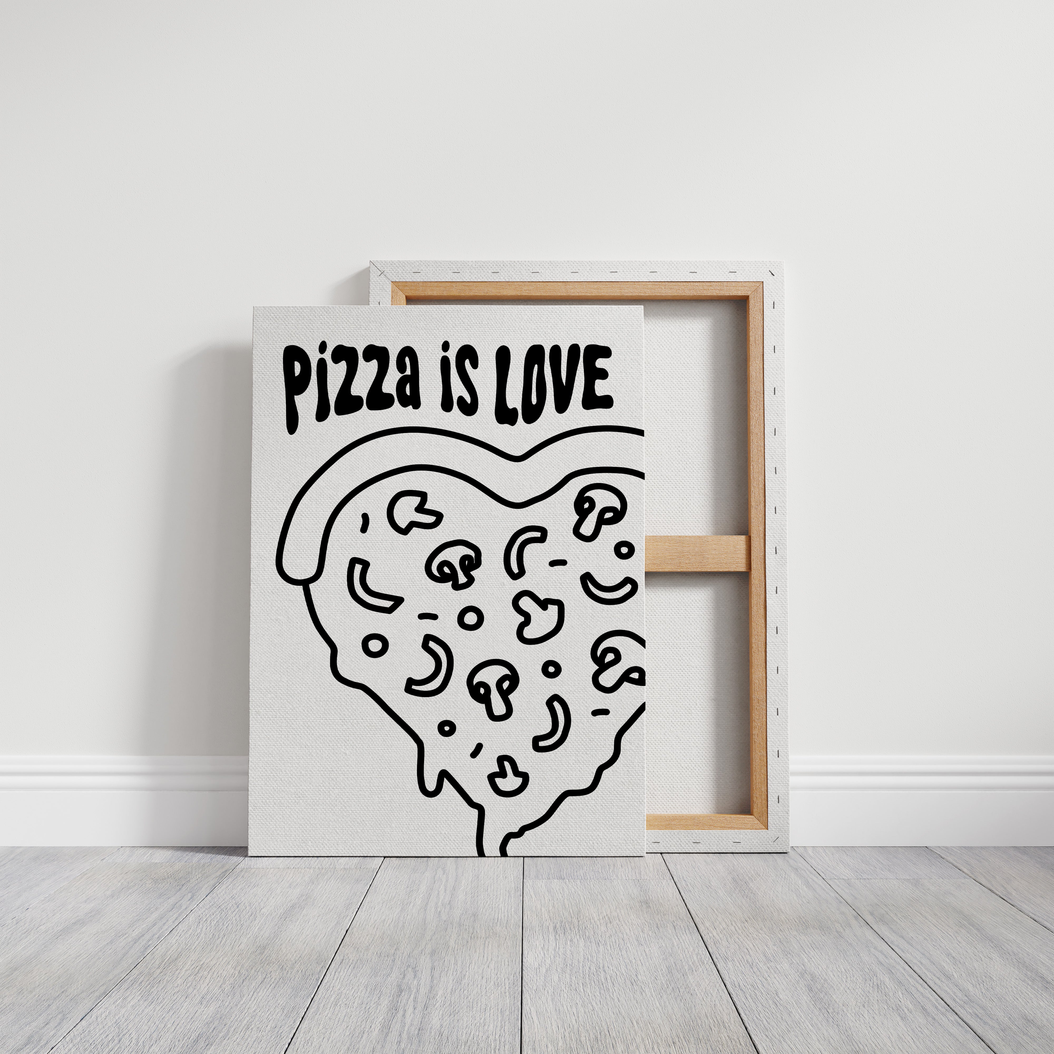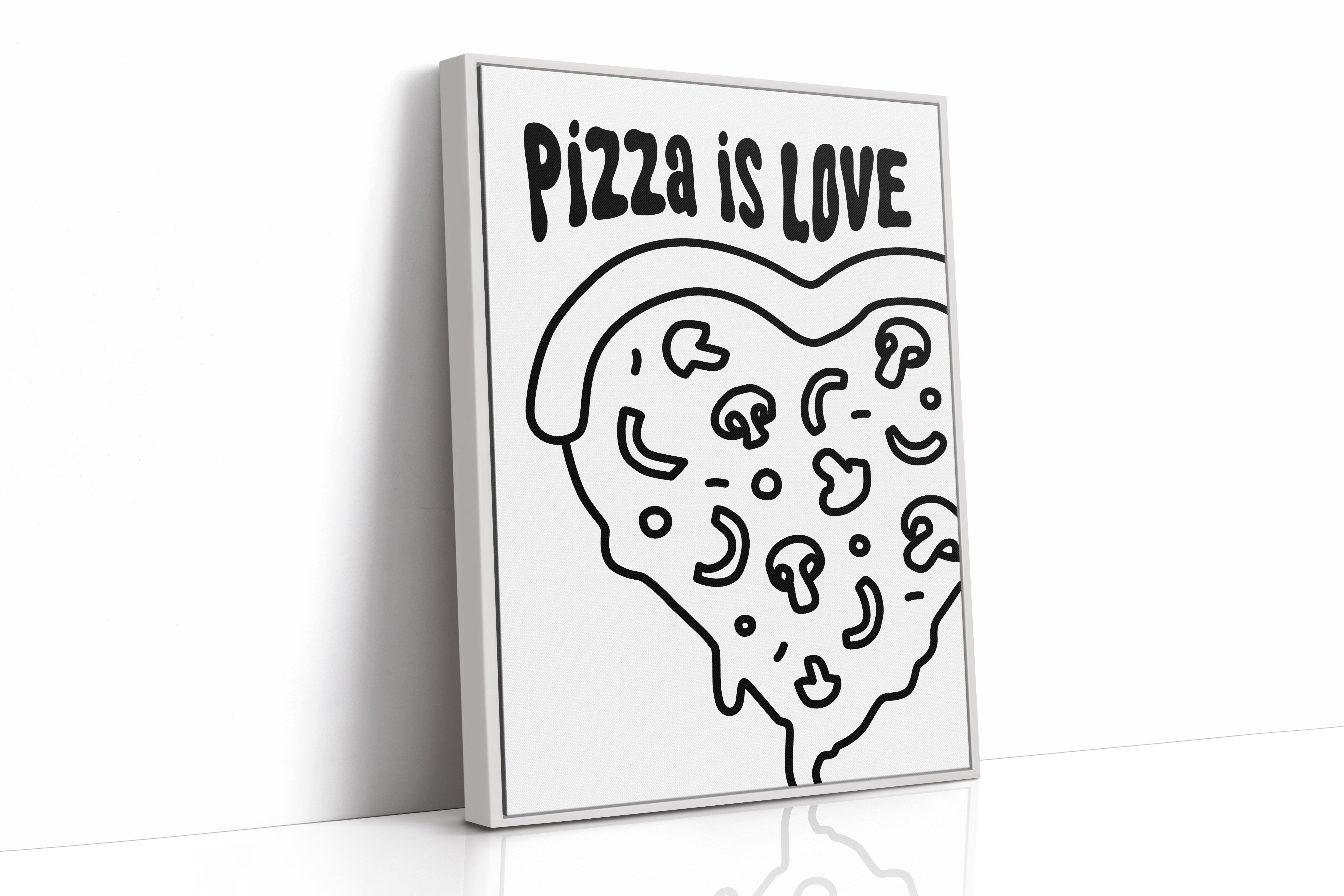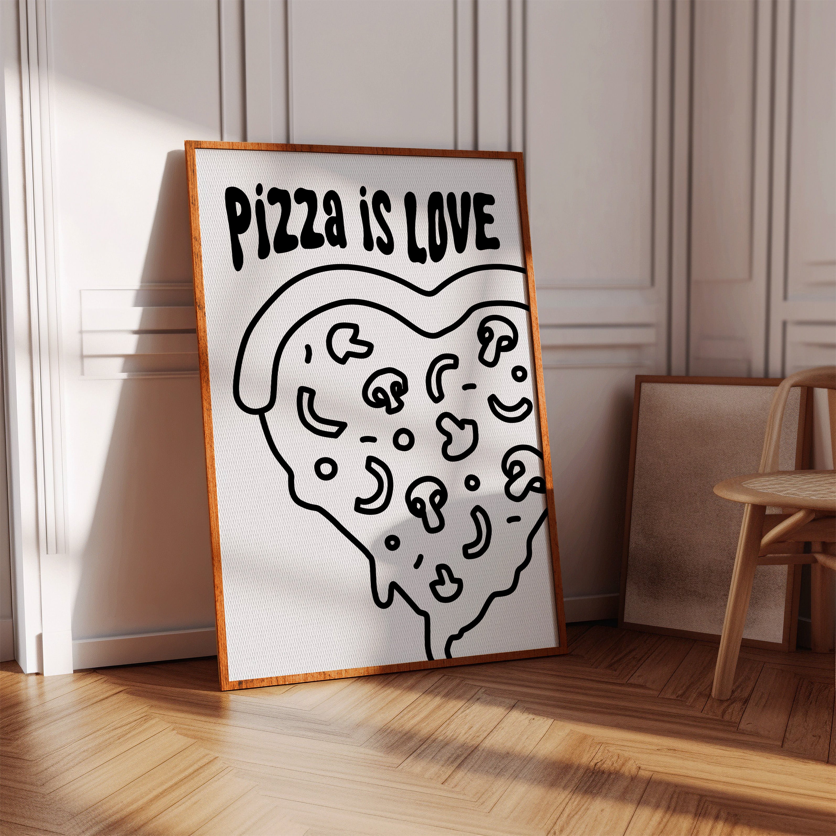 Simple lines dance across stark white space, forming a heartfelt ode to everyone's favorite comfort food. This playful piece from our Contemporary collection marries minimalist design with maximum personality. Bold black strokes transform a pizza slice into a symbol of happiness, where every topping becomes a tiny celebration and every curve tells a story of shared meals and laughter. Perfect for bringing a touch of whimsy to modern kitchen spaces or adding character to dining room walls. Let this piece remind you that sometimes the simplest pleasures make the sweetest memories.