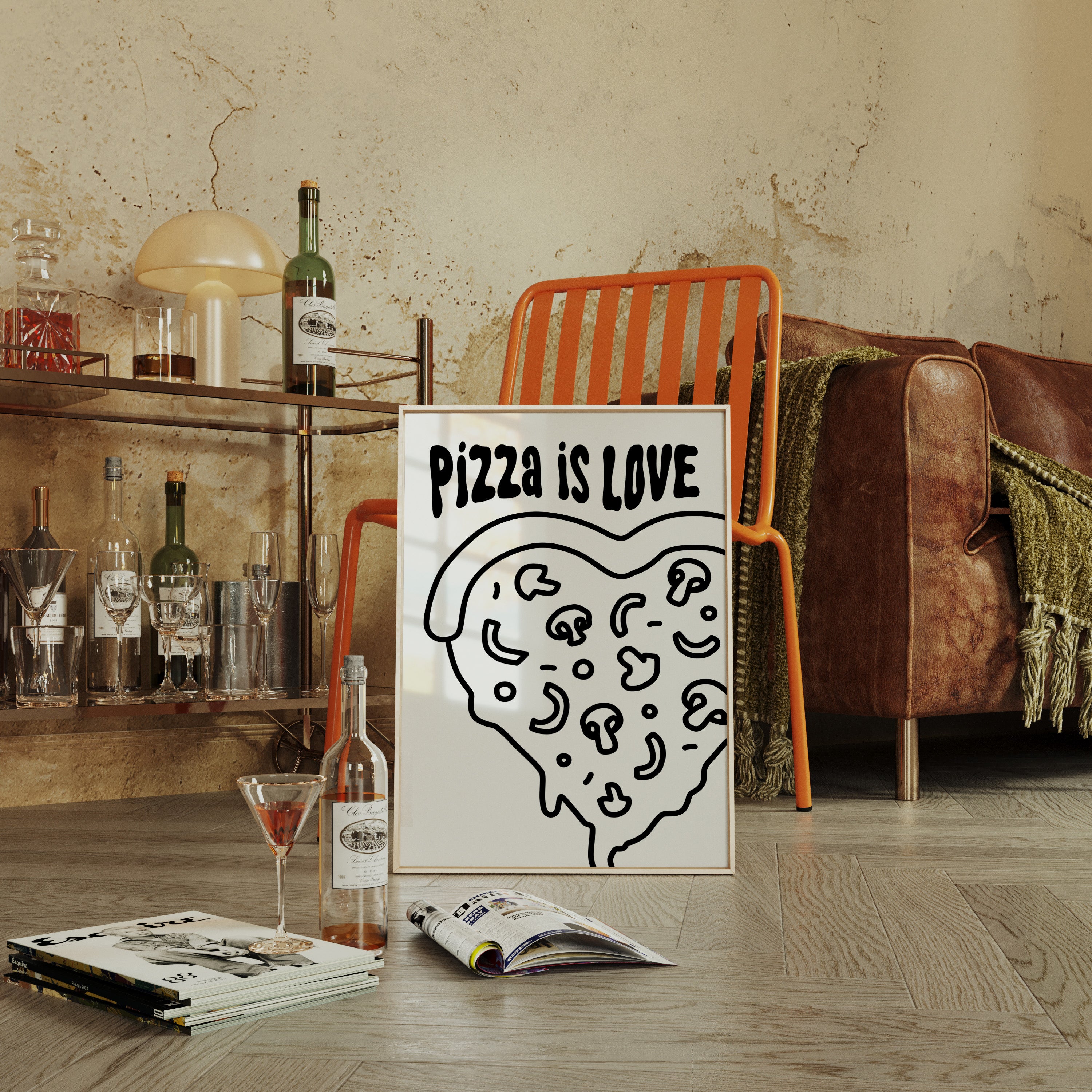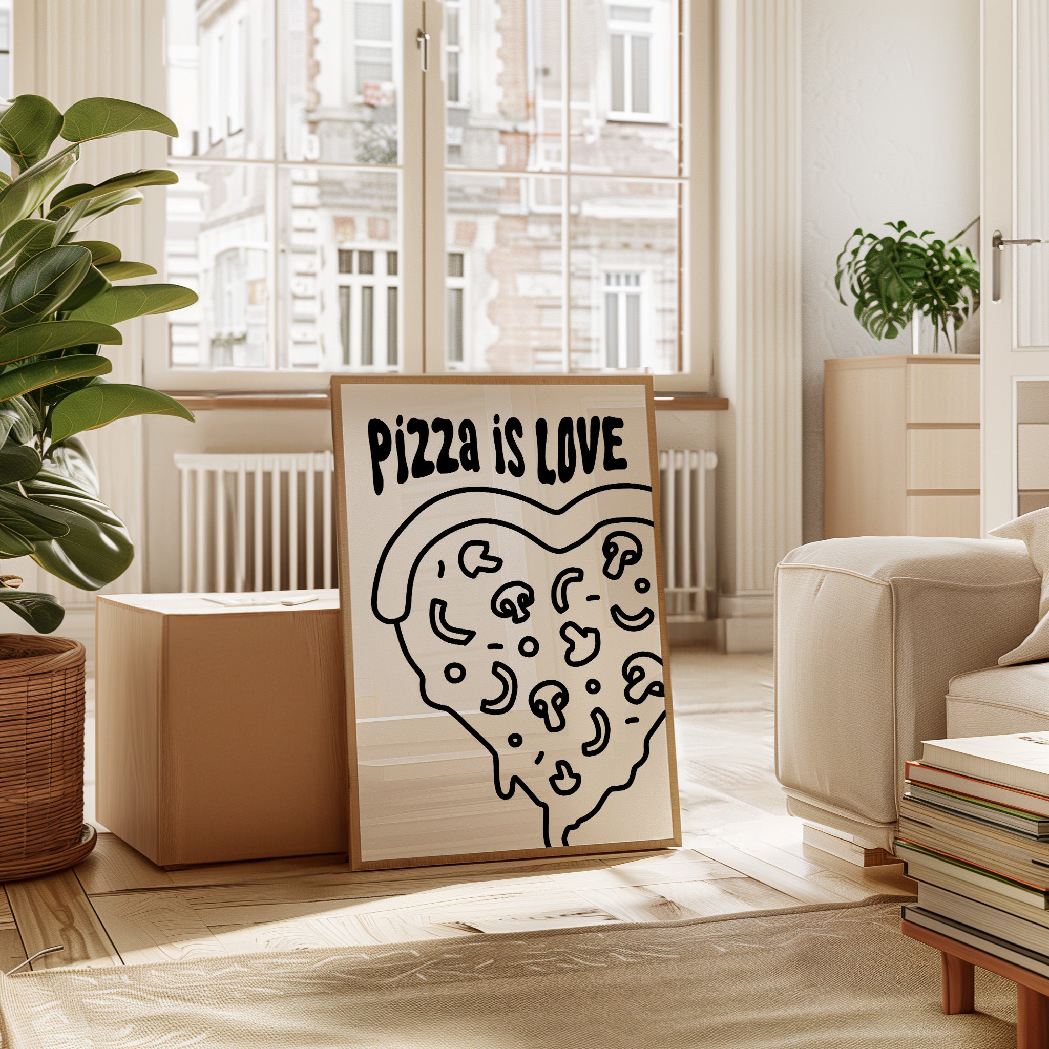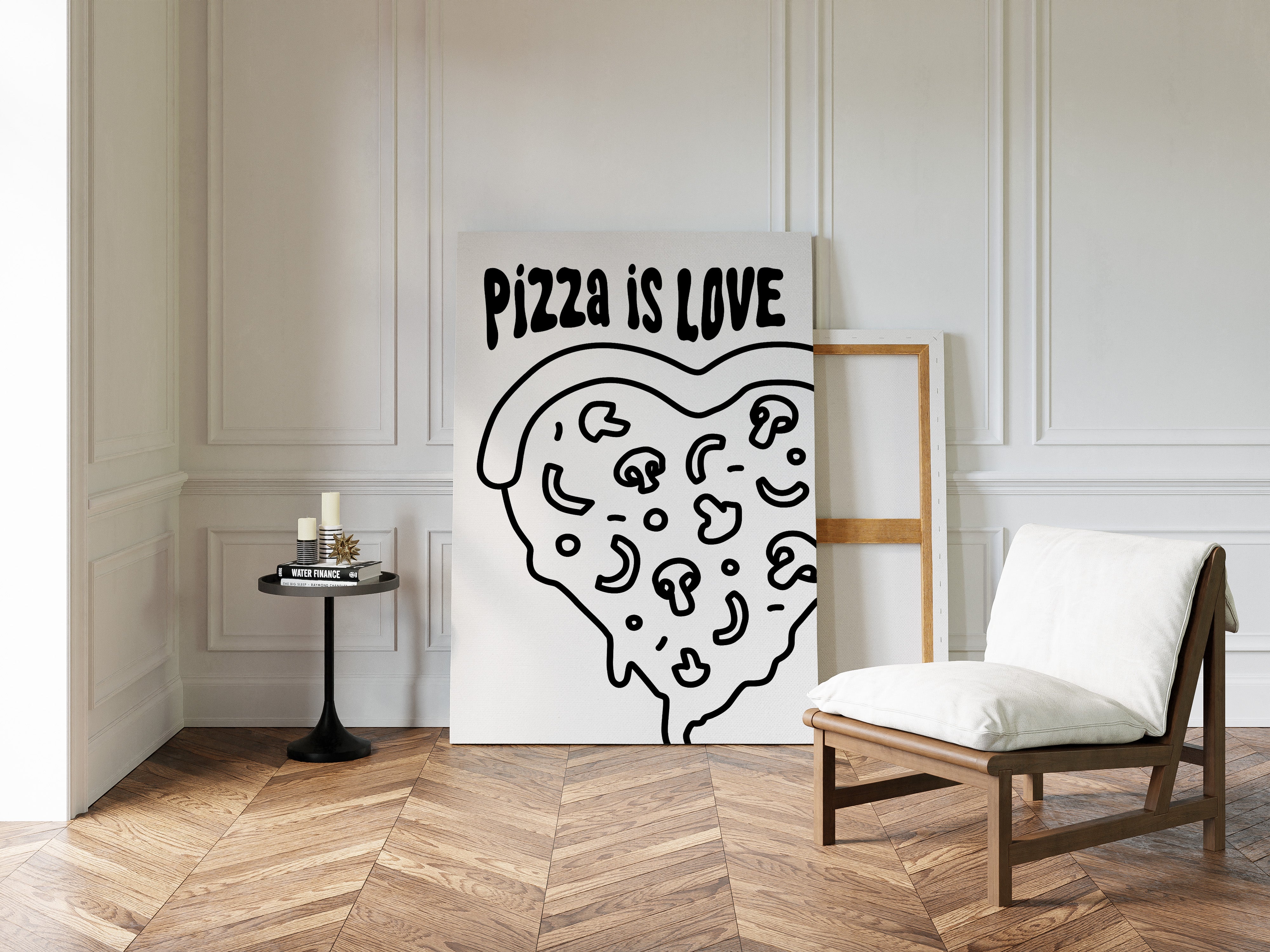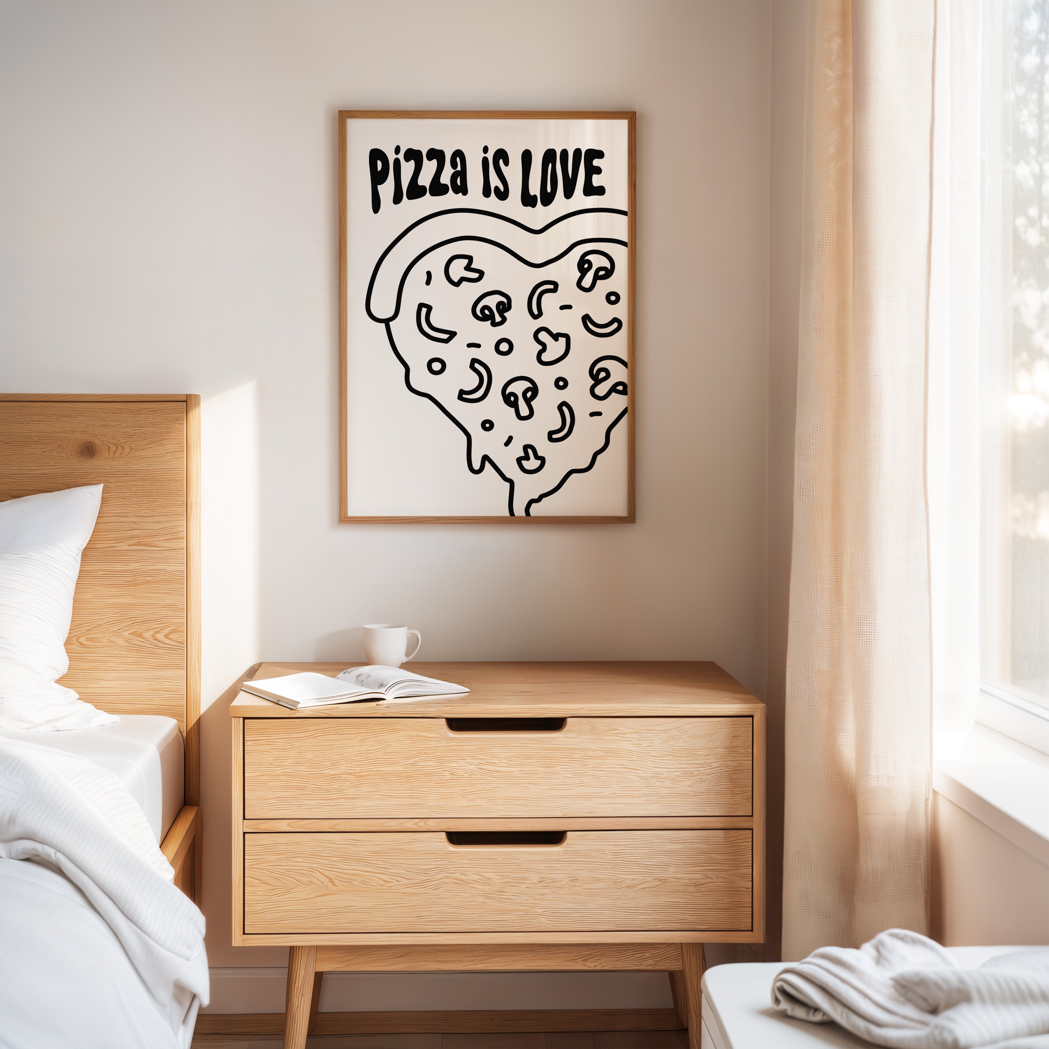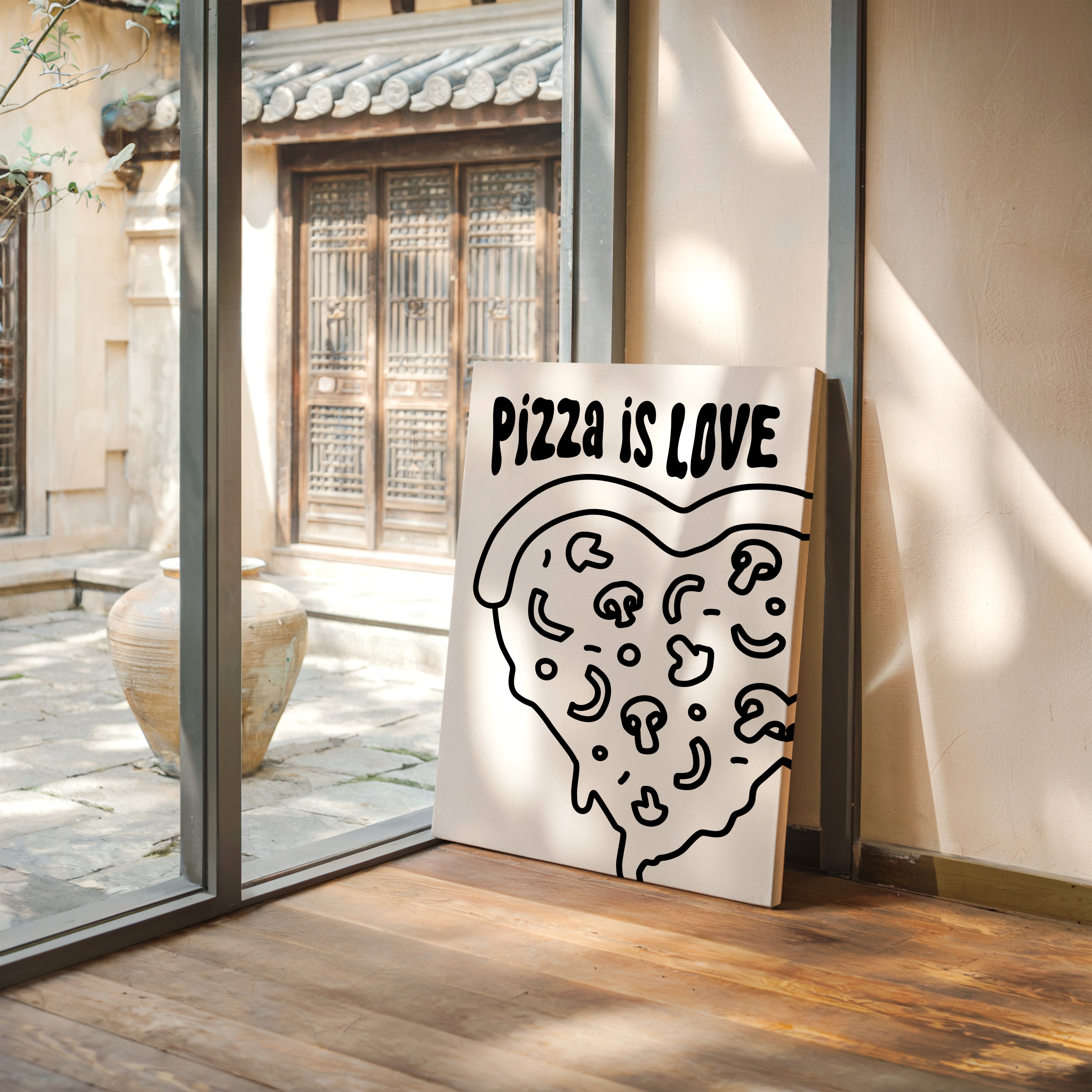 Simple lines dance across stark white space, forming a heartfelt ode to everyone's favorite comfort food. This playful piece from our Contemporary collection marries minimalist design with maximum personality. Bold black strokes transform a pizza slice into a symbol of happiness, where every topping becomes a tiny celebration and every curve tells a story of shared meals and laughter. Perfect for bringing a touch of whimsy to modern kitchen spaces or adding character to dining room walls. Let this piece remind you that sometimes the simplest pleasures make the sweetest memories.