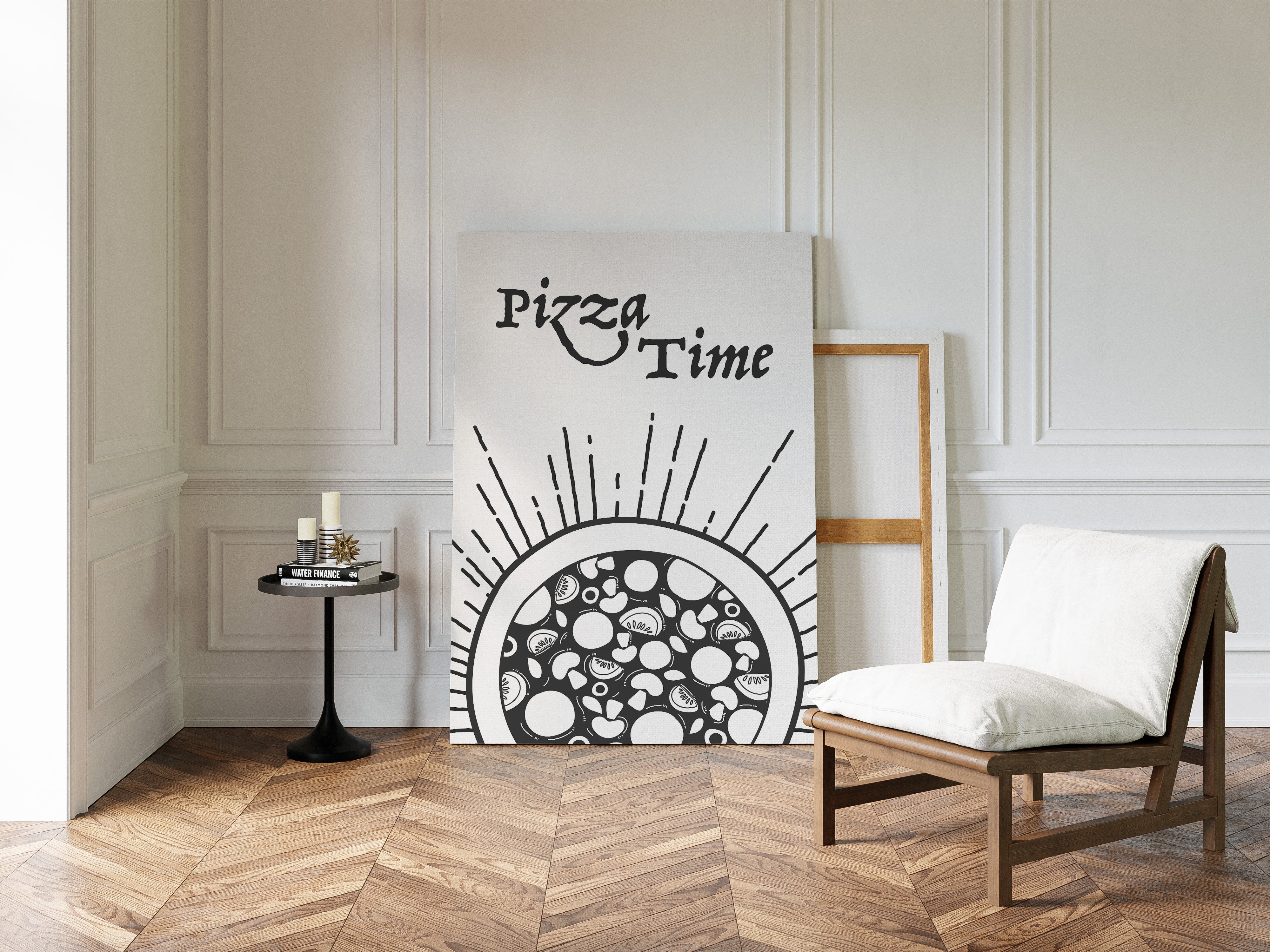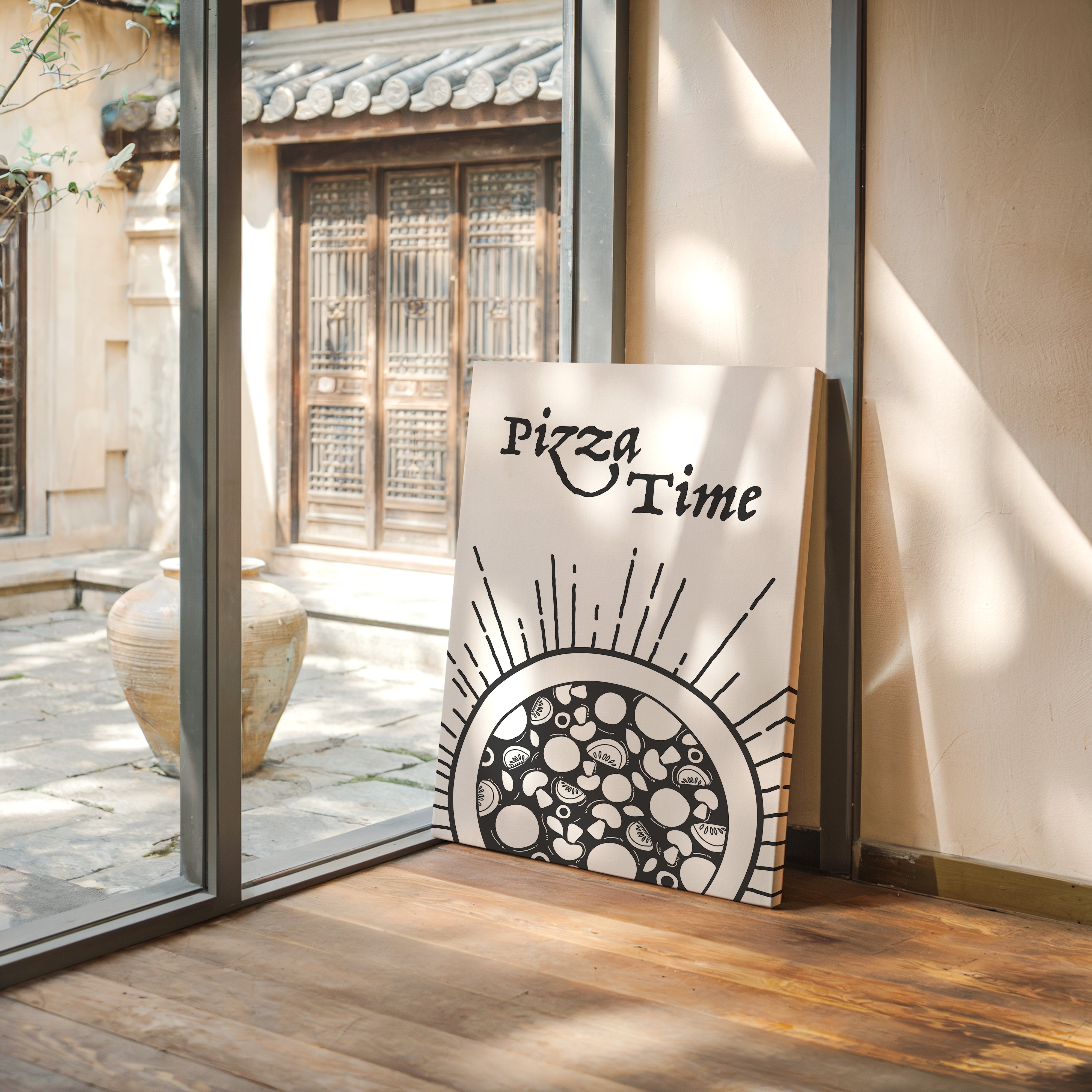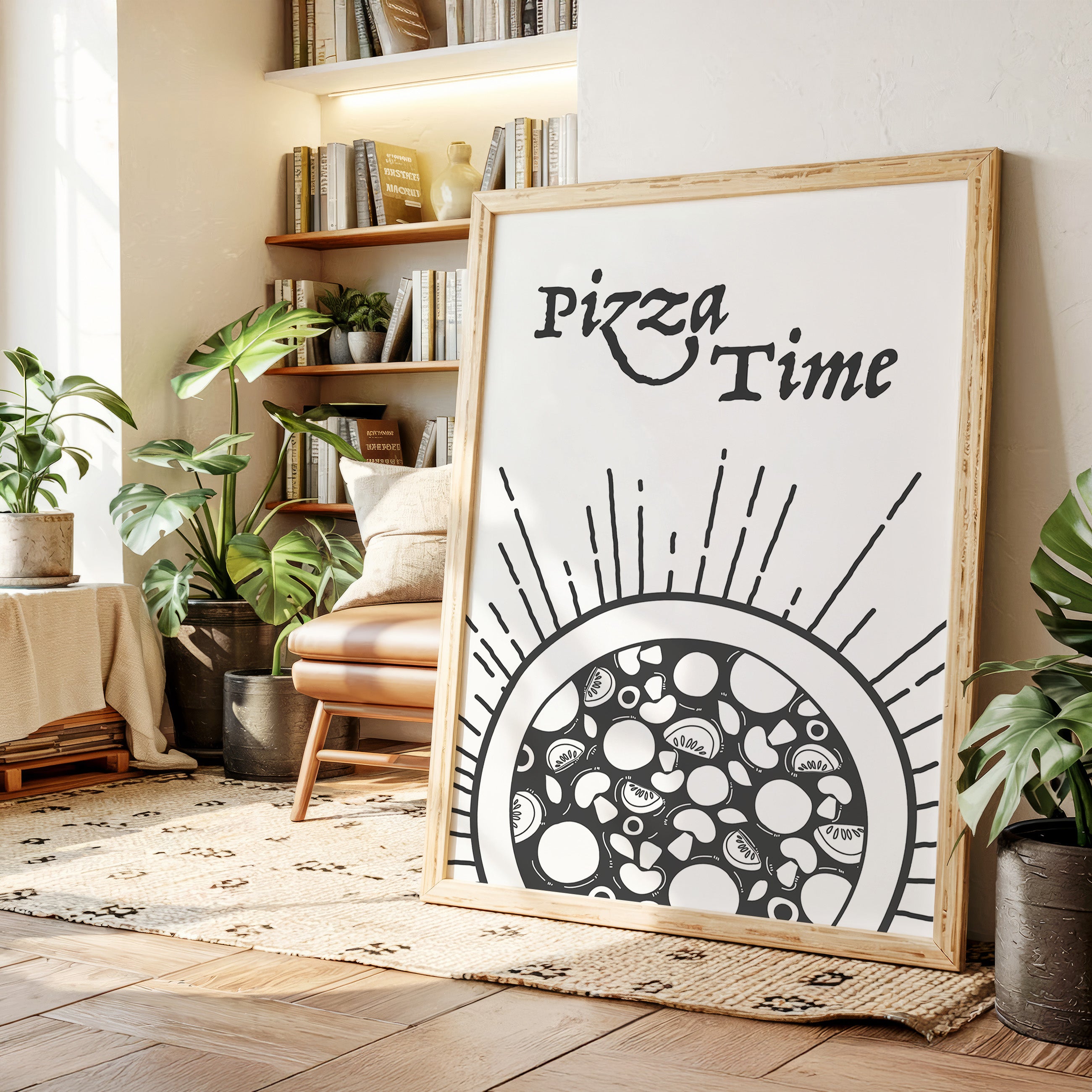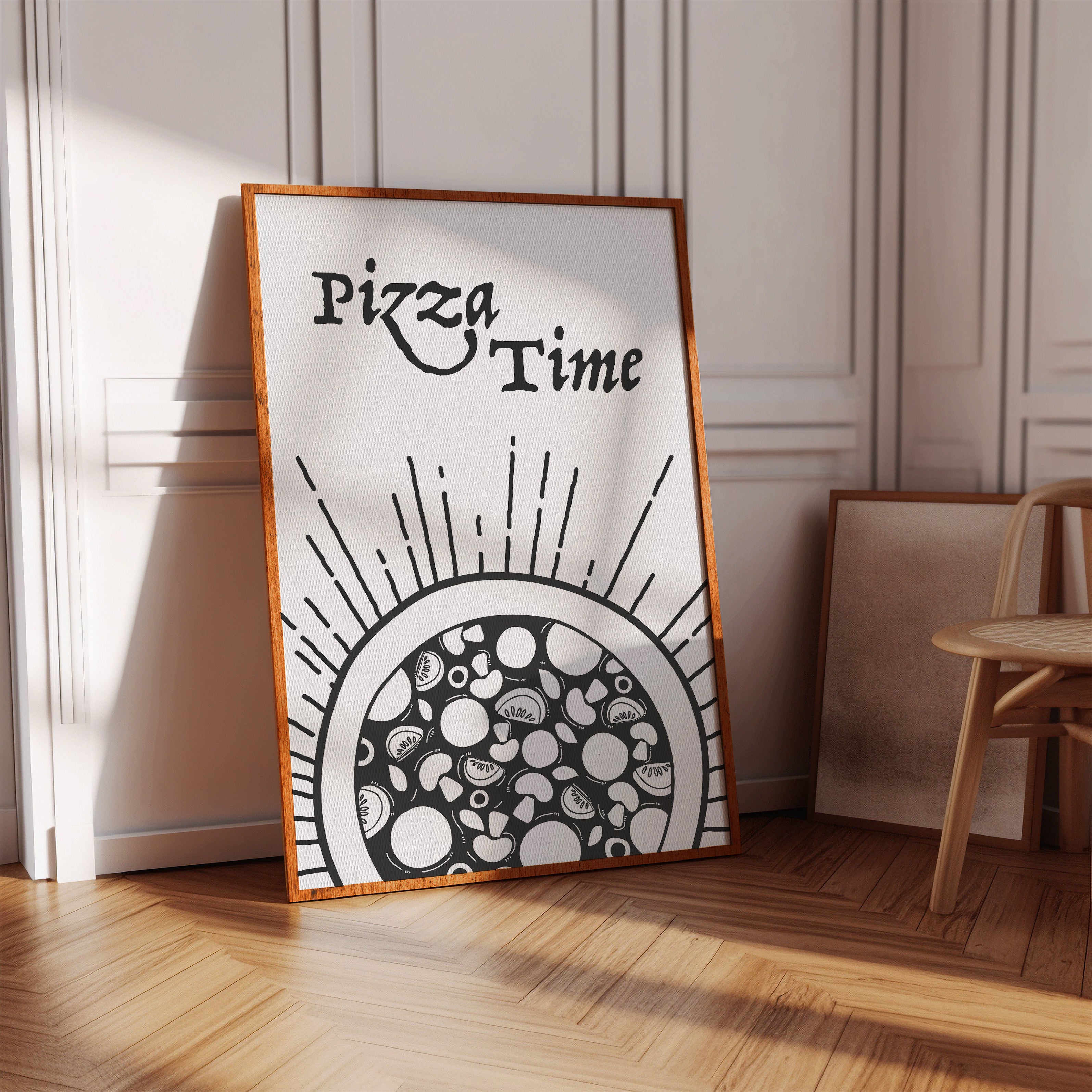 A playful burst of monochromatic energy radiates from a perfectly composed pizza, its toppings creating a delightful pattern against the stark background. This piece from our Contemporary collection celebrates the simple joy of casual dining with bold, graphic confidence. The radiating lines surrounding the circular form create a sun-like burst of enthusiasm, while the carefully arranged toppings dance across the surface in a whimsical choreography of mushrooms, tomatoes, and olives. Perfect for adding a touch of culinary charm to modern kitchen spaces or dining areas, this piece speaks to both food lovers and design enthusiasts. The minimalist black and white palette ensures this celebration of everyday moments remains sophisticatedly timeless.
