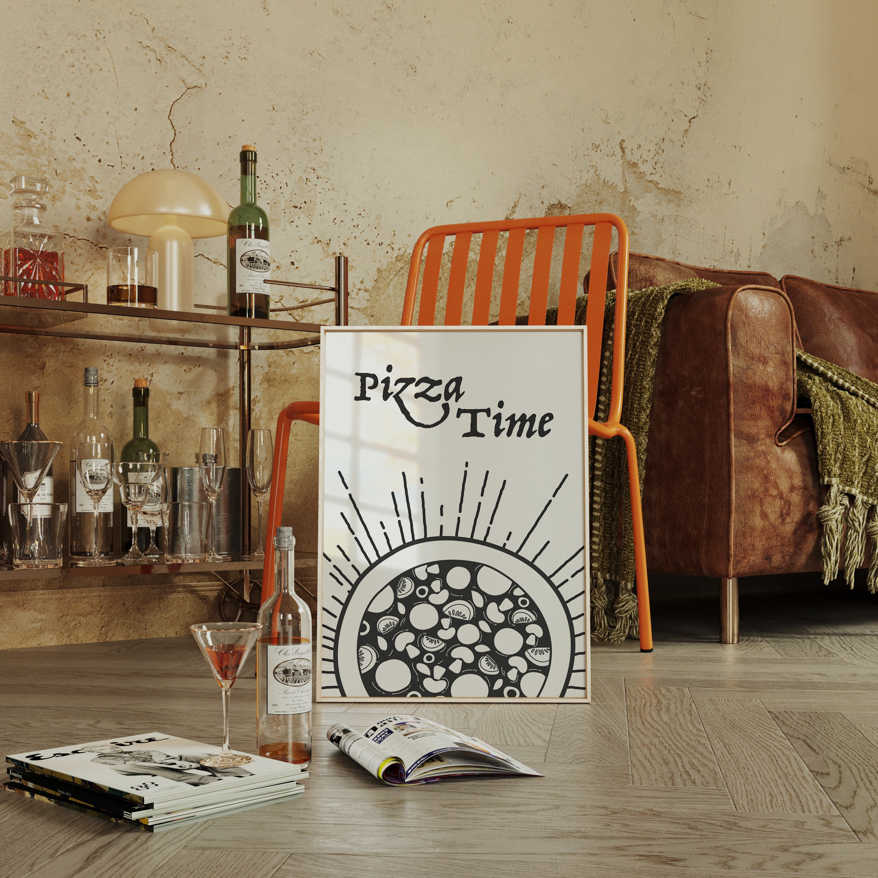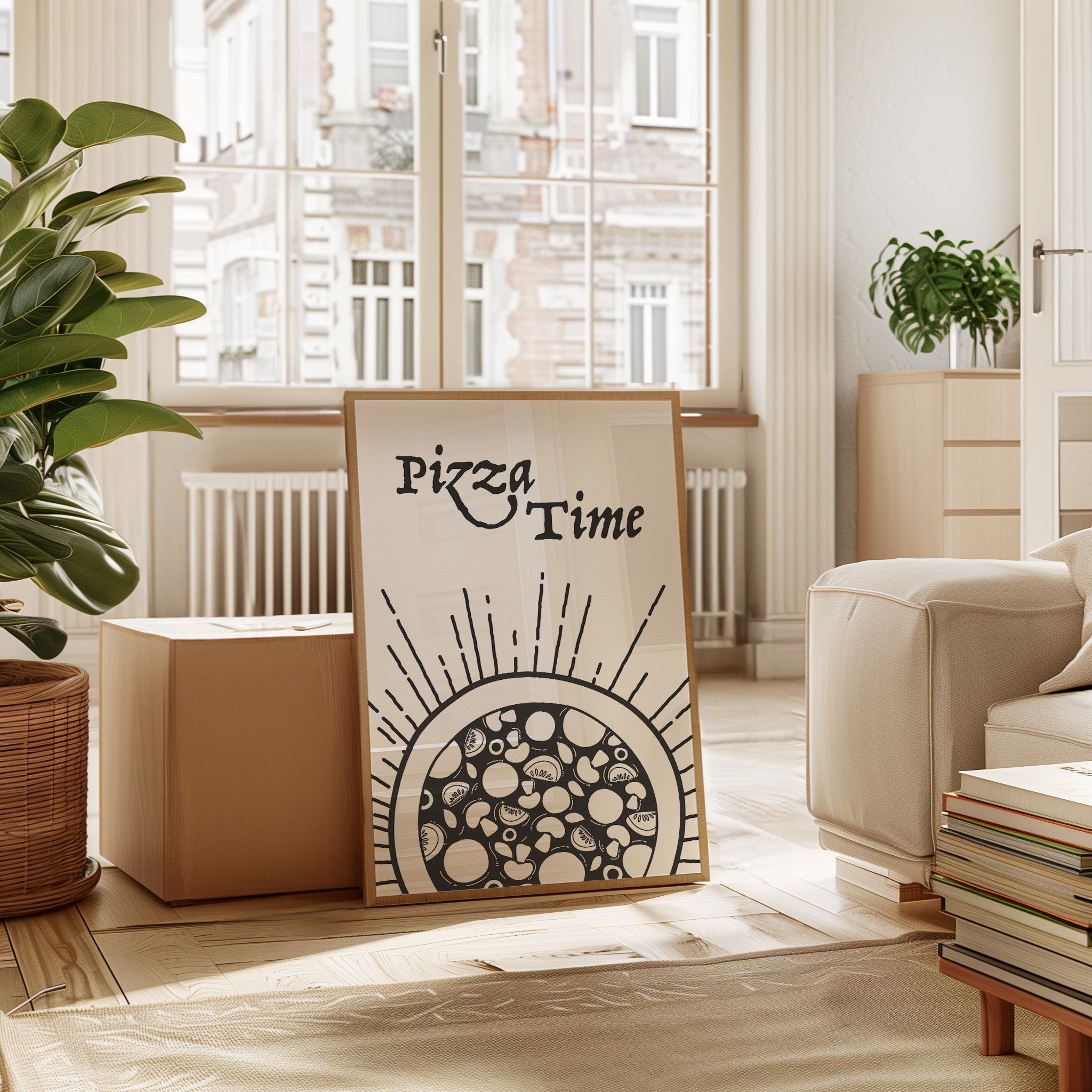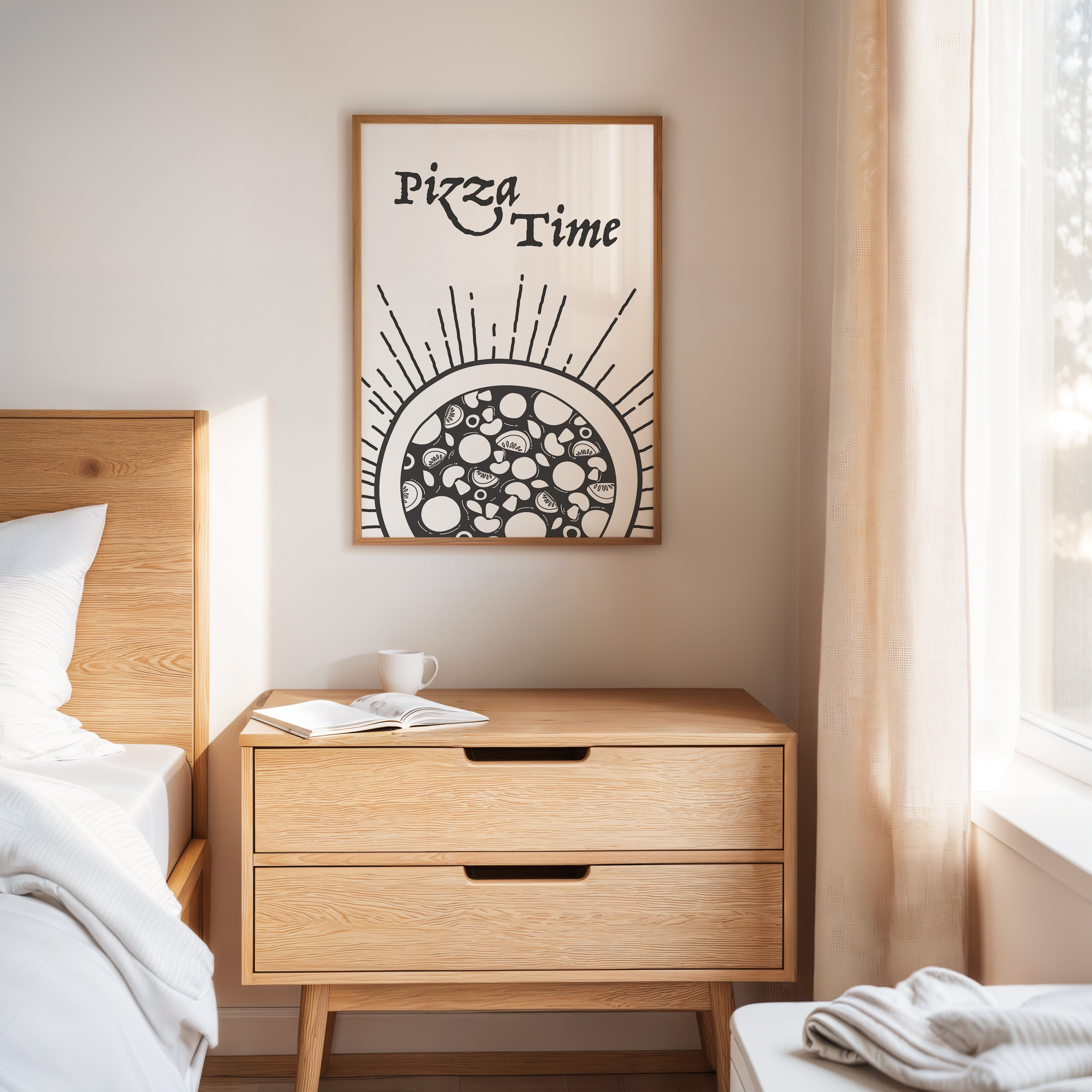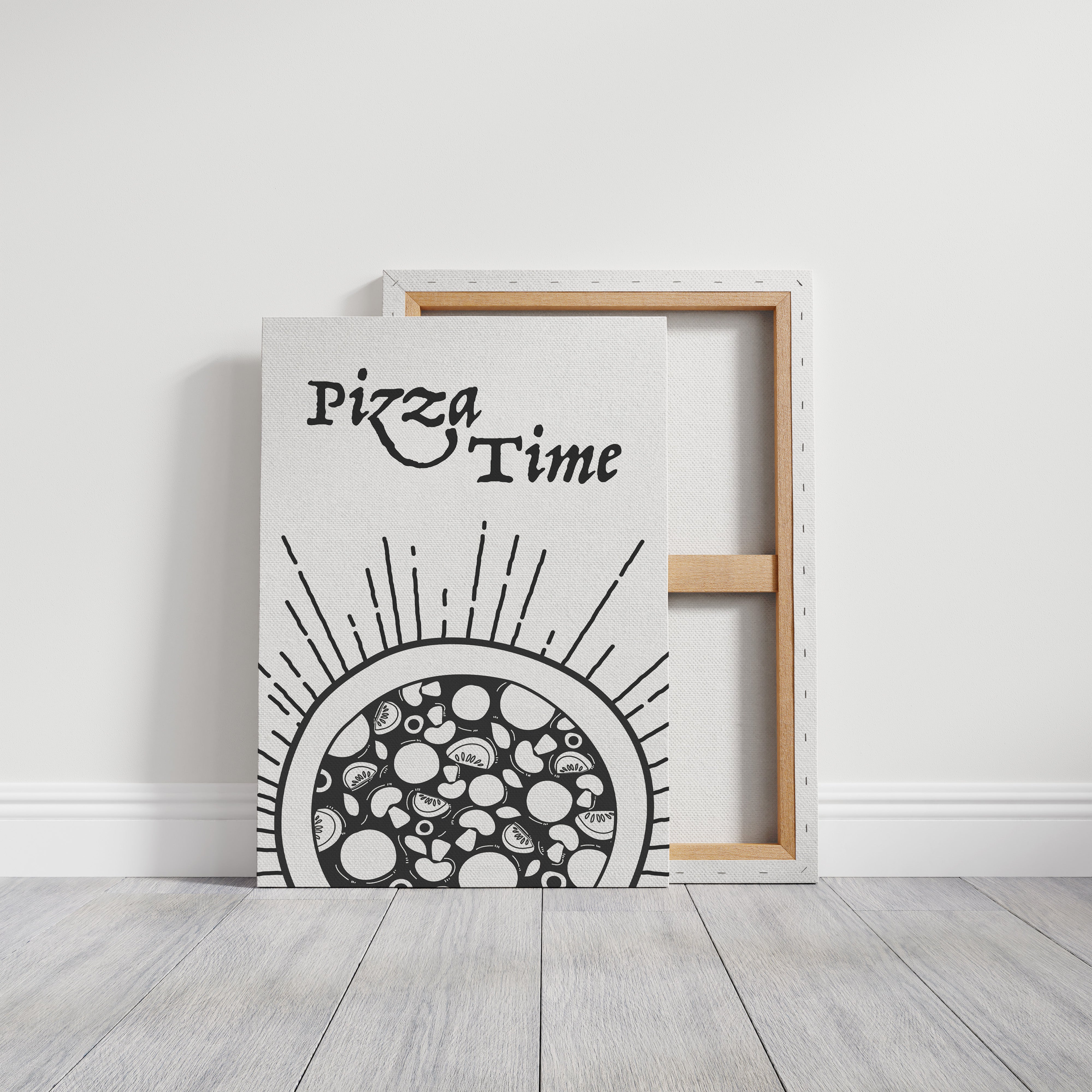 A playful burst of monochromatic energy radiates from a perfectly composed pizza, its toppings creating a delightful pattern against the stark background. This piece from our Contemporary collection celebrates the simple joy of casual dining with bold, graphic confidence. The radiating lines surrounding the circular form create a sun-like burst of enthusiasm, while the carefully arranged toppings dance across the surface in a whimsical choreography of mushrooms, tomatoes, and olives. Perfect for adding a touch of culinary charm to modern kitchen spaces or dining areas, this piece speaks to both food lovers and design enthusiasts. The minimalist black and white palette ensures this celebration of everyday moments remains sophisticatedly timeless.