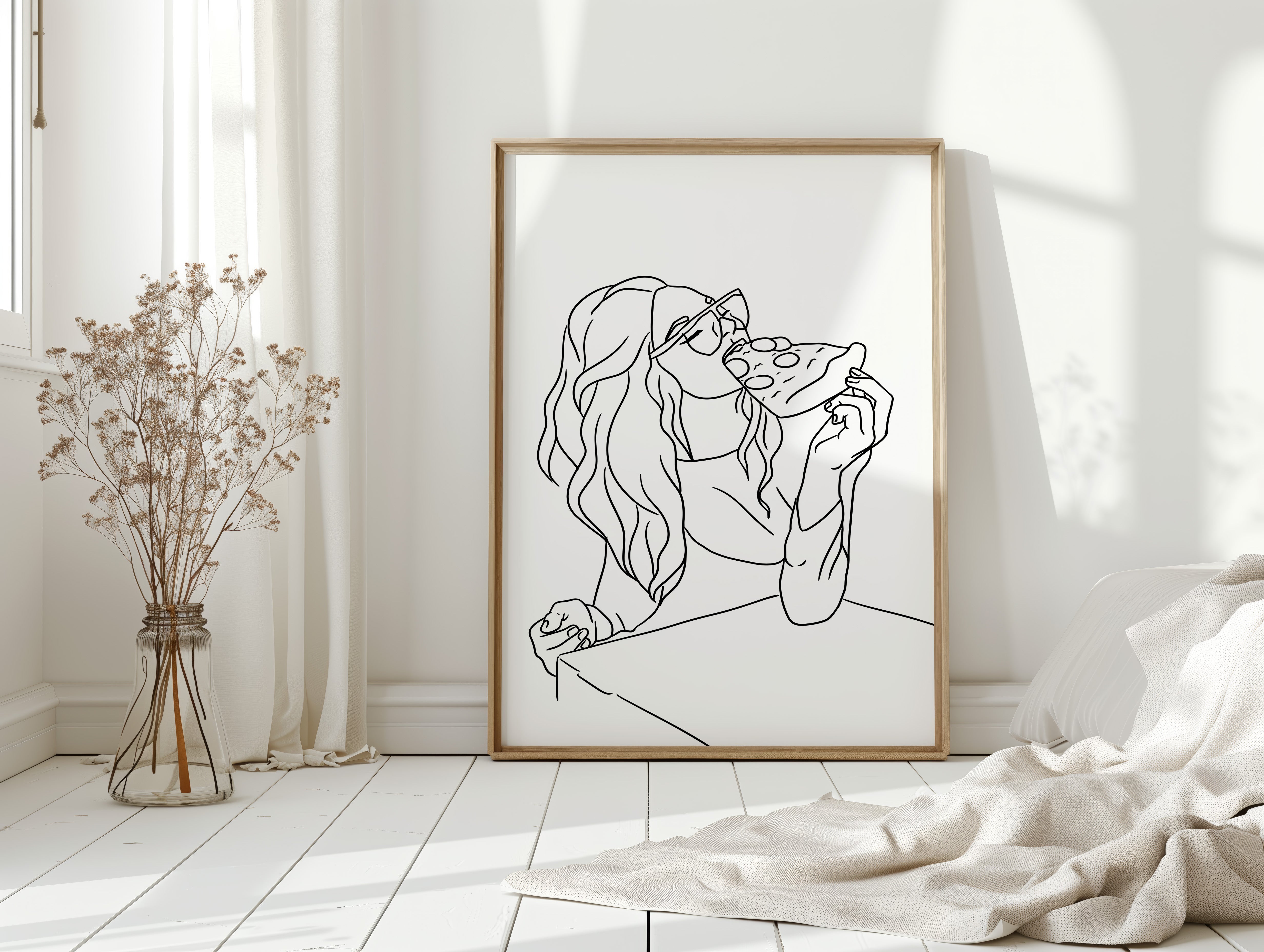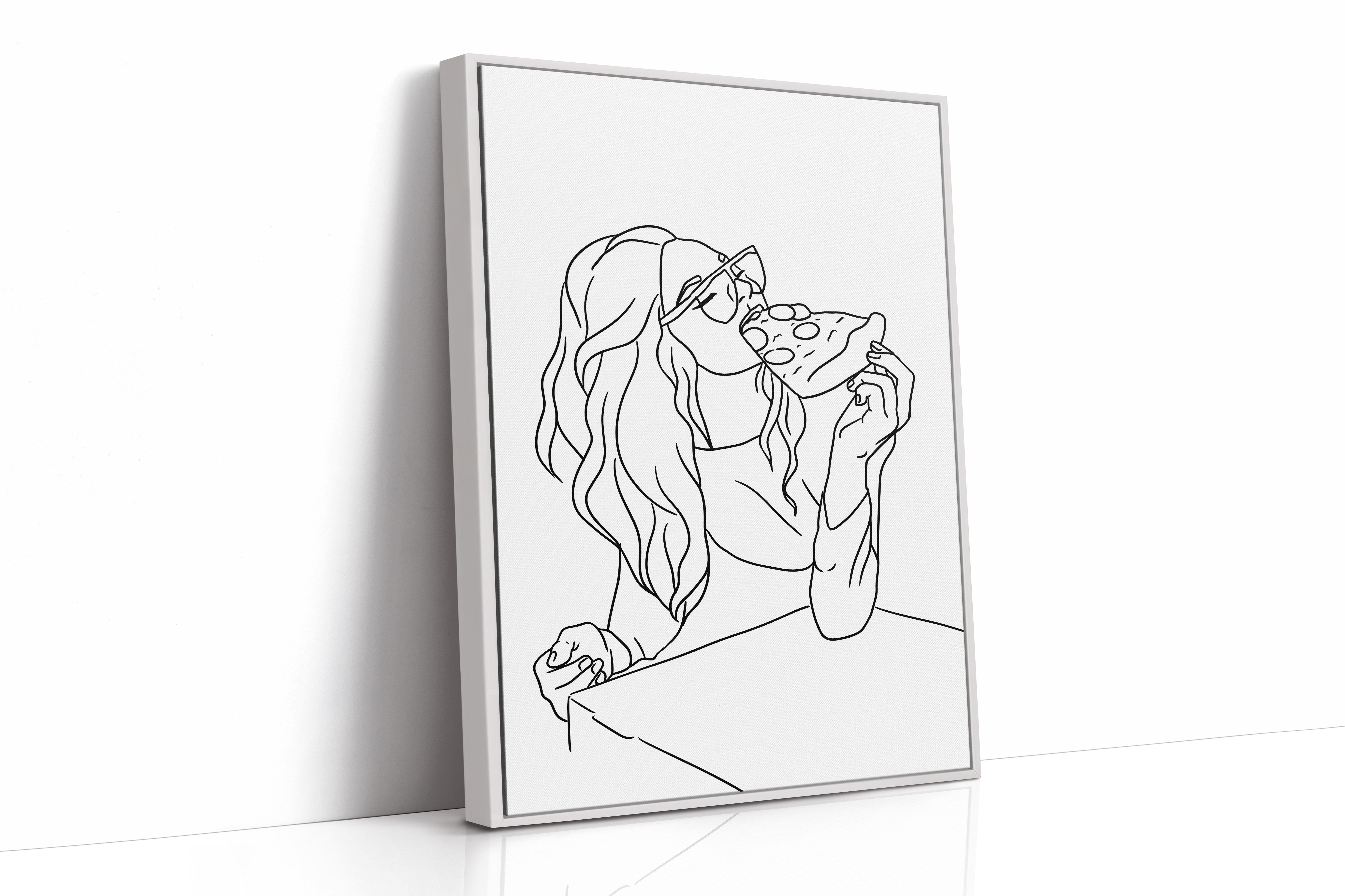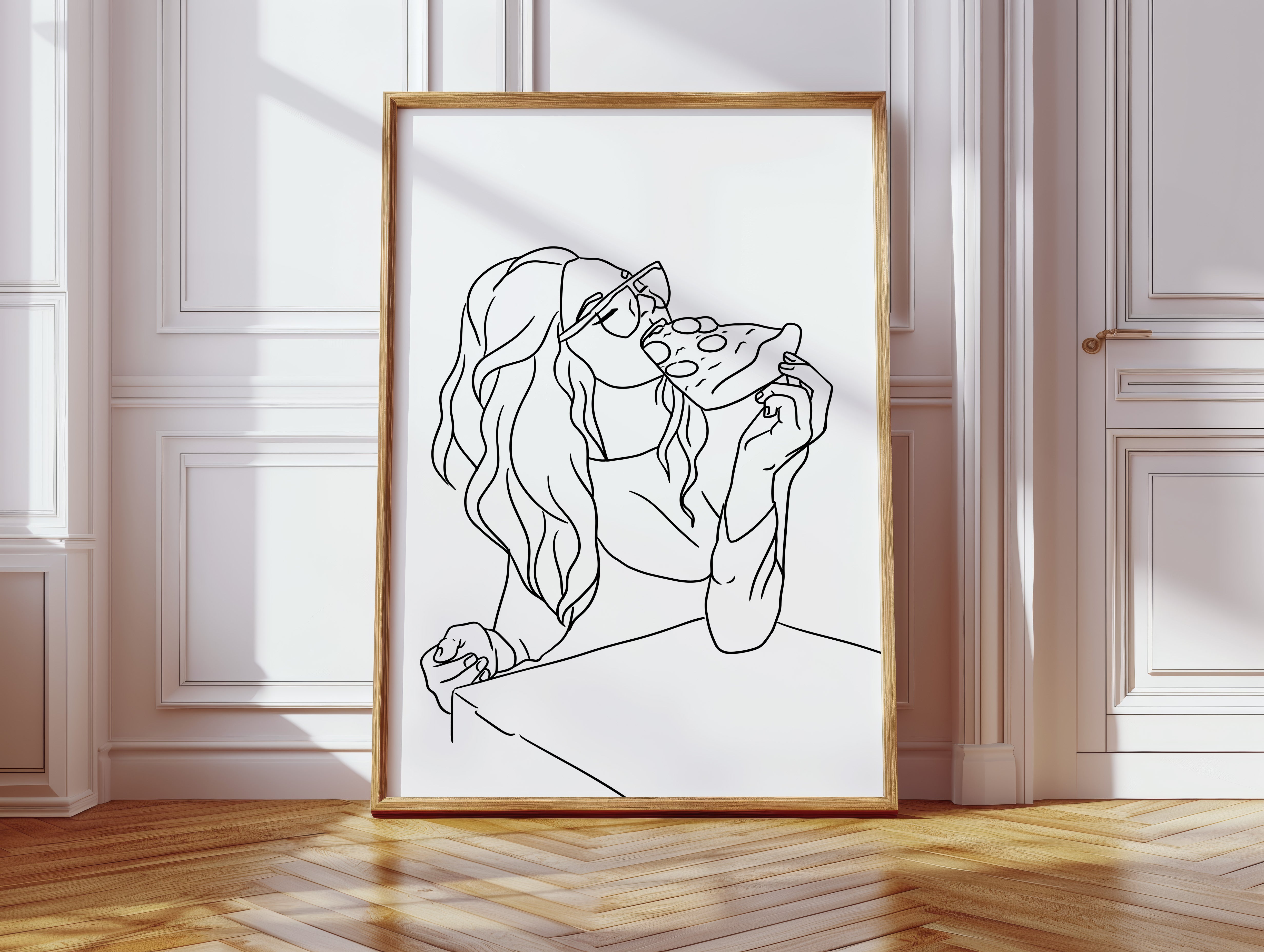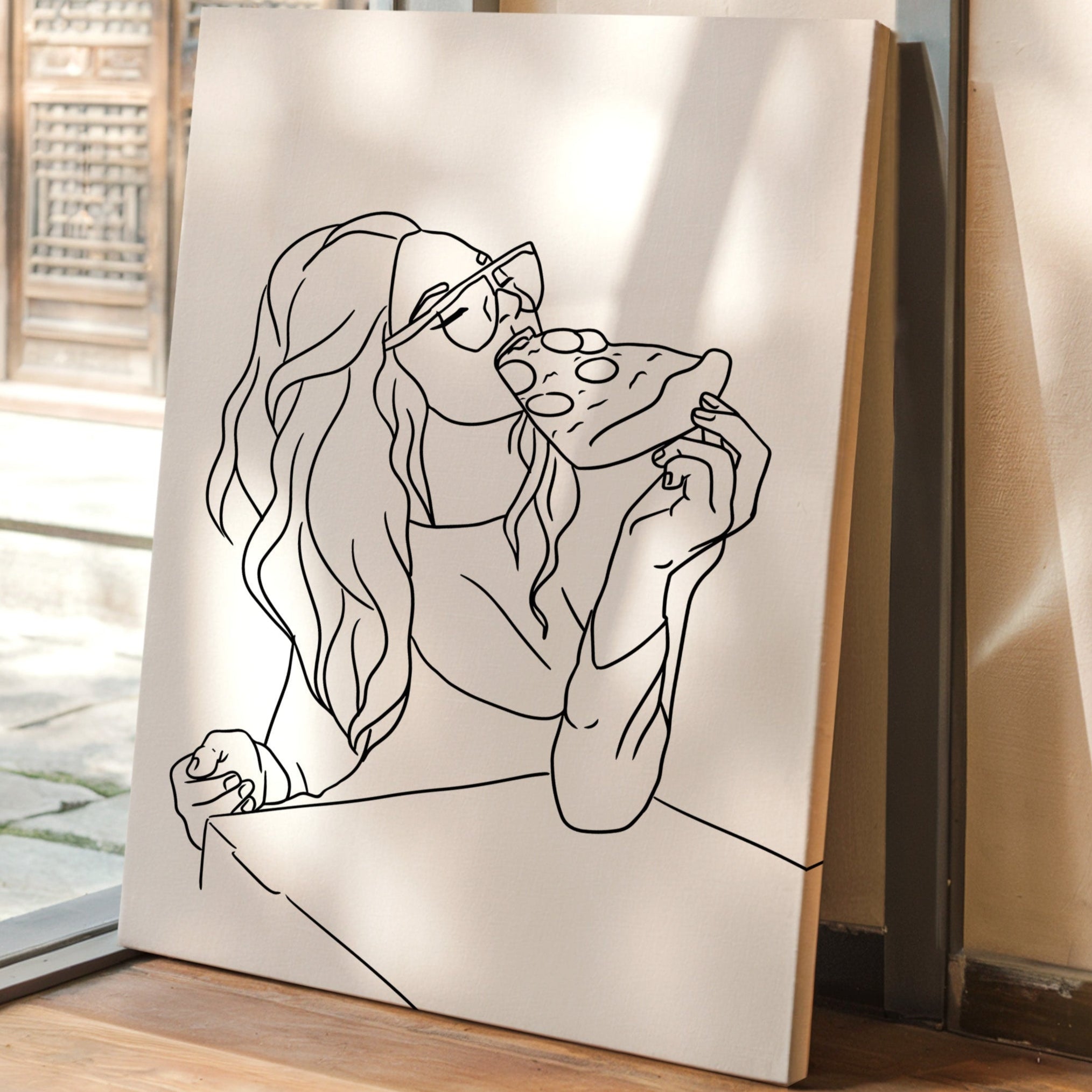 A slice of pure joy captured in clean lines, where casual indulgence meets carefree spirit. This piece belongs to our Contemporary collection, celebrating modern moments with minimalist charm. Long waves cascade freely while sunglasses catch imagined light, creating a scene of unrestrained pleasure in life's simple delights. The composition speaks to that perfect moment when weekend freedom meets culinary satisfaction. Perfect for adding personality to a dining room or bringing a touch of fun sophistication to a modern kitchen space. The minimalist black and white design makes every line count in telling this delicious story.