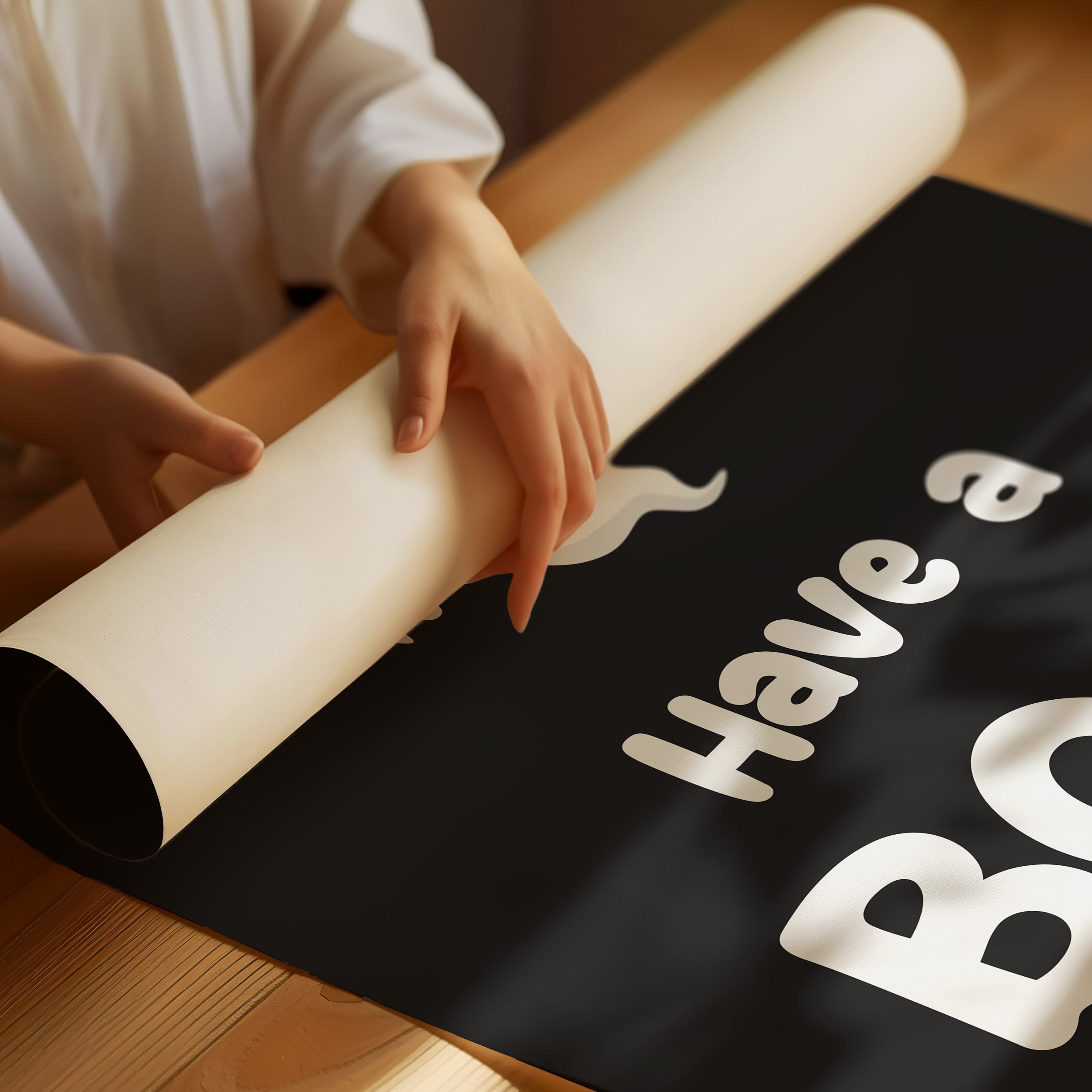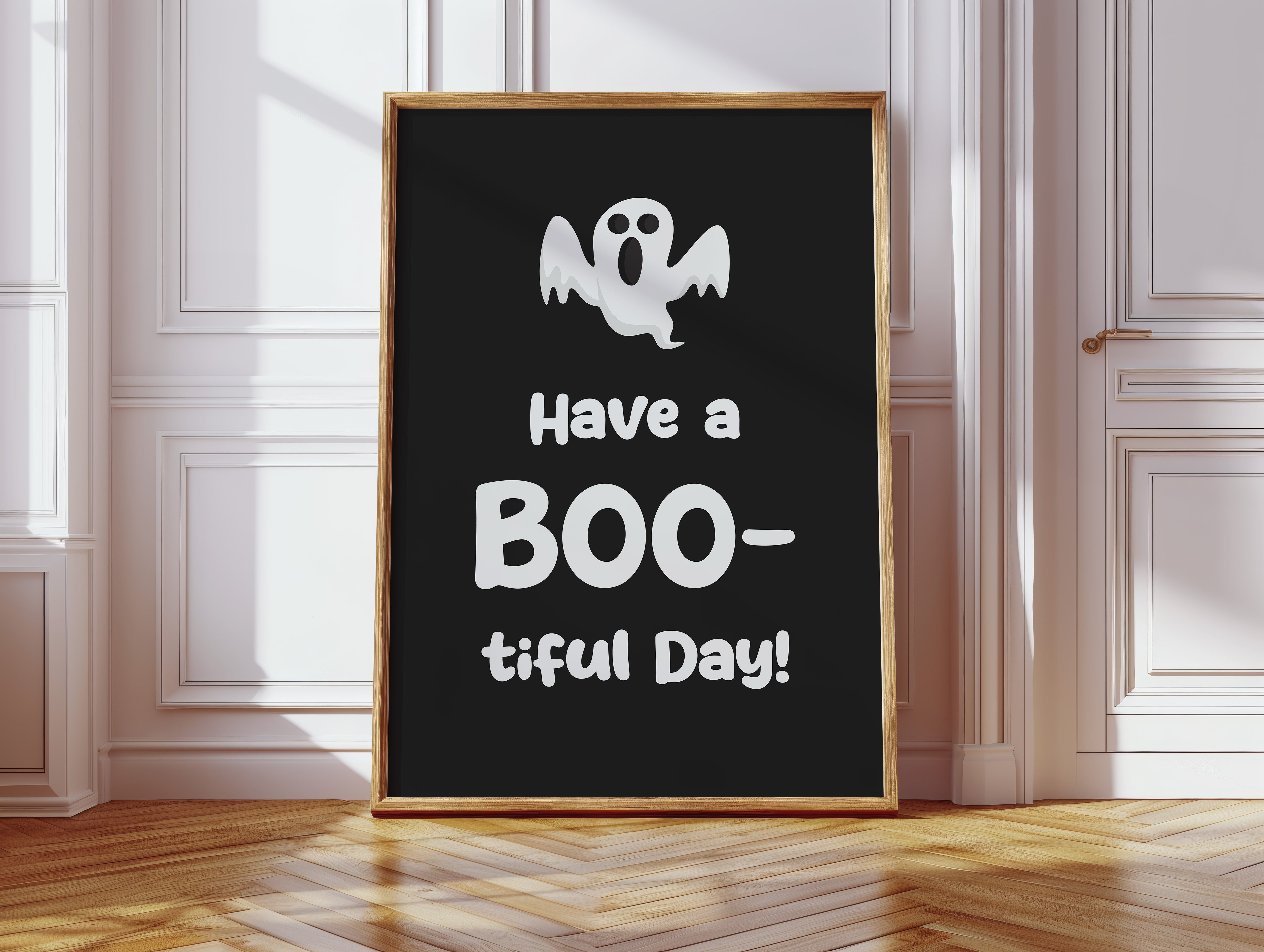 A charming white ghost floats playfully above bold, cheerful typography, creating an endearing moment of whimsy and warmth. This piece from our Contemporary collection brings a modern twist to traditional Halloween imagery with its minimalist design and clever wordplay. The stark contrast between the ghostly figure and deep black background creates a striking visual impact, while the rounded, friendly features of the spirit transform what could be spooky into something delightfully approachable. Perfect for adding a touch of seasonal charm to a child's room or creating a welcoming Halloween display in any modern home. The piece invites smiles rather than scares, making every day just a little more 'boo-tiful'.