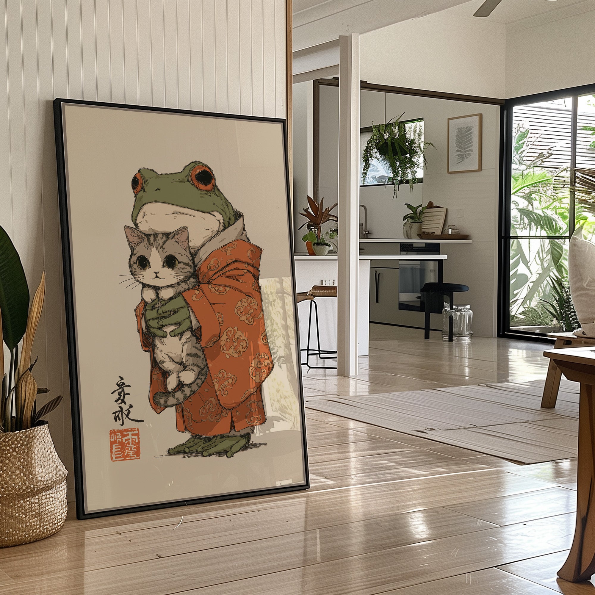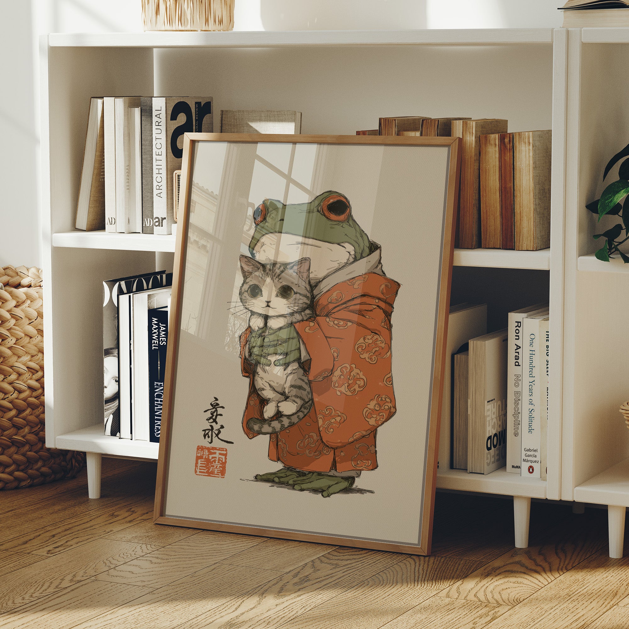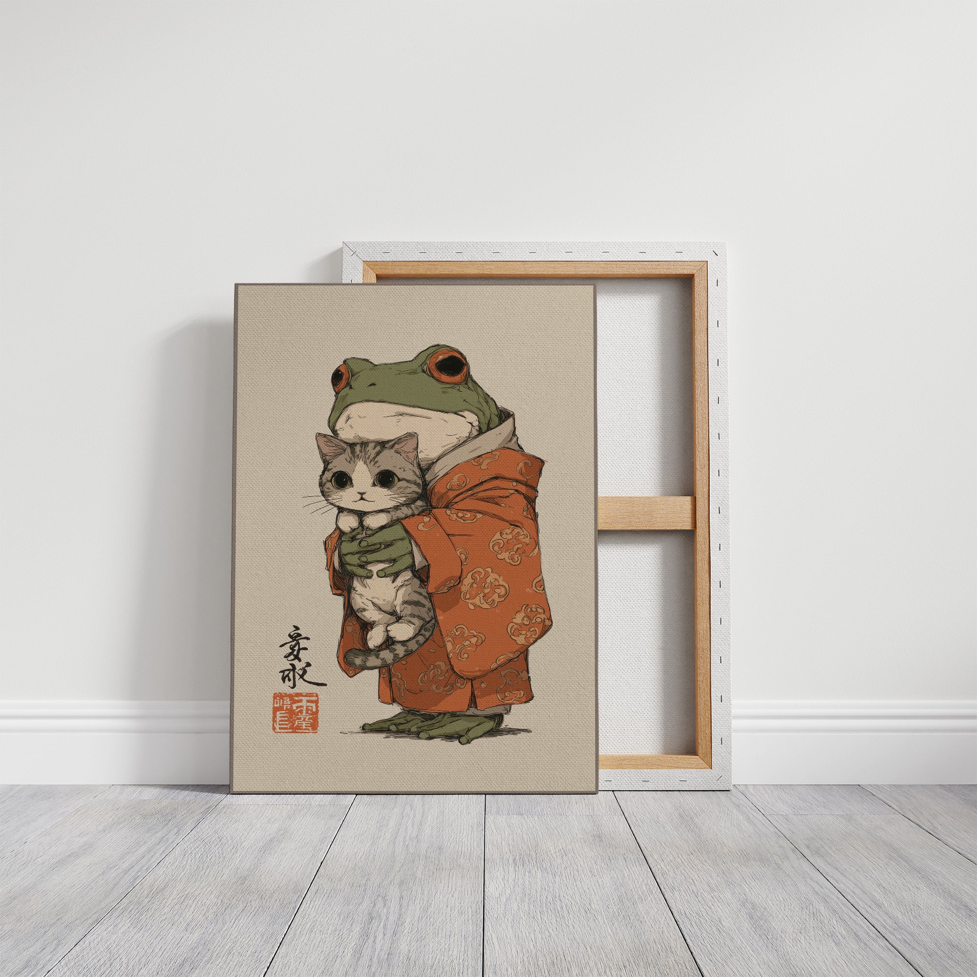 A whimsical encounter unfolds as a gentle frog cradles a wide-eyed kitten, their unlikely friendship captured in delicate brushstrokes. The frog, dressed in traditional Asian attire including a striking orange robe adorned with cloud patterns, holds the small tabby cat with tender care. Rich earth tones and coral accents create a harmonious balance, while the Japanese seal and calligraphy add an authentic artistic touch. This playful piece would bring charm and character to a child's reading nook or add a touch of storytelling magic to a modern Asian-inspired space.