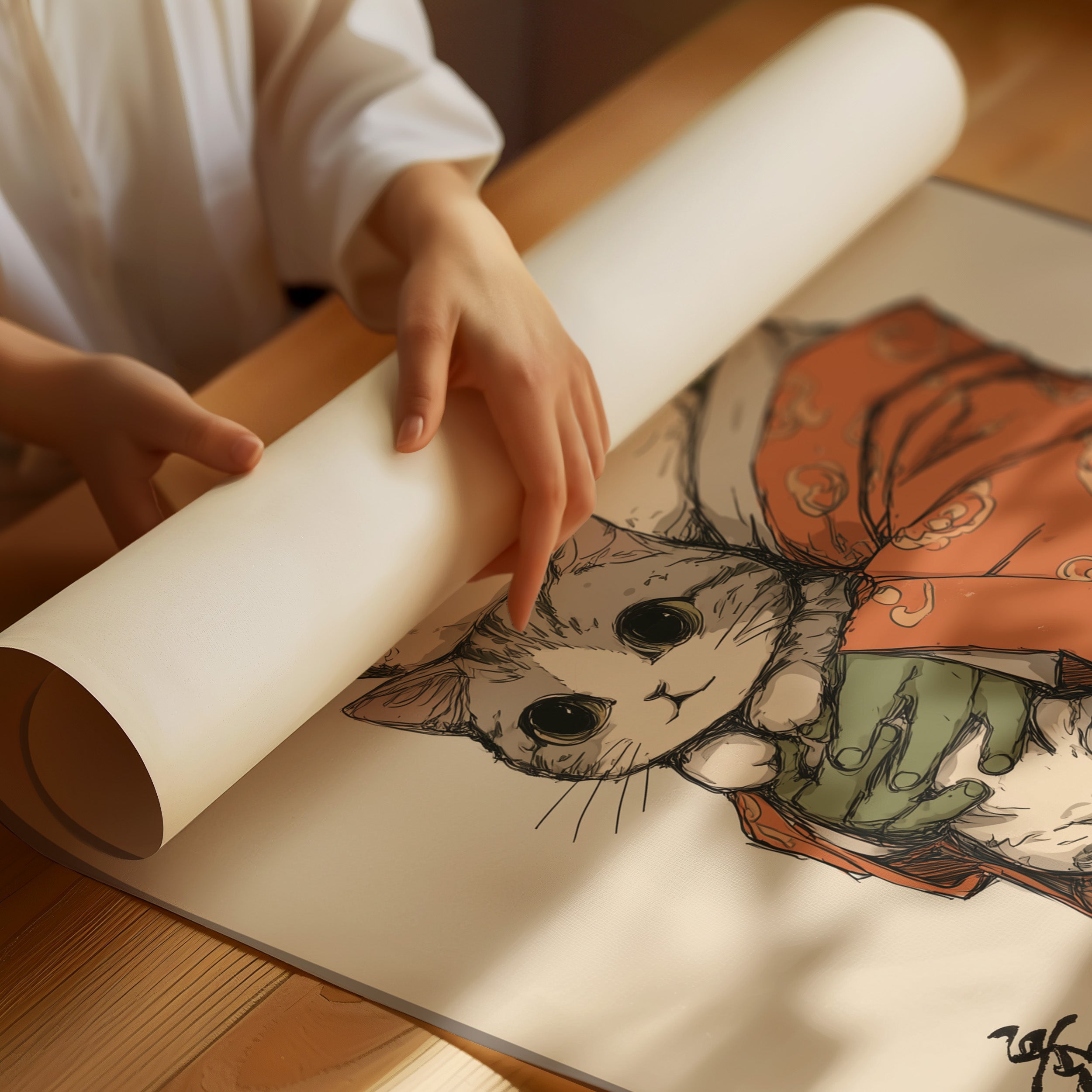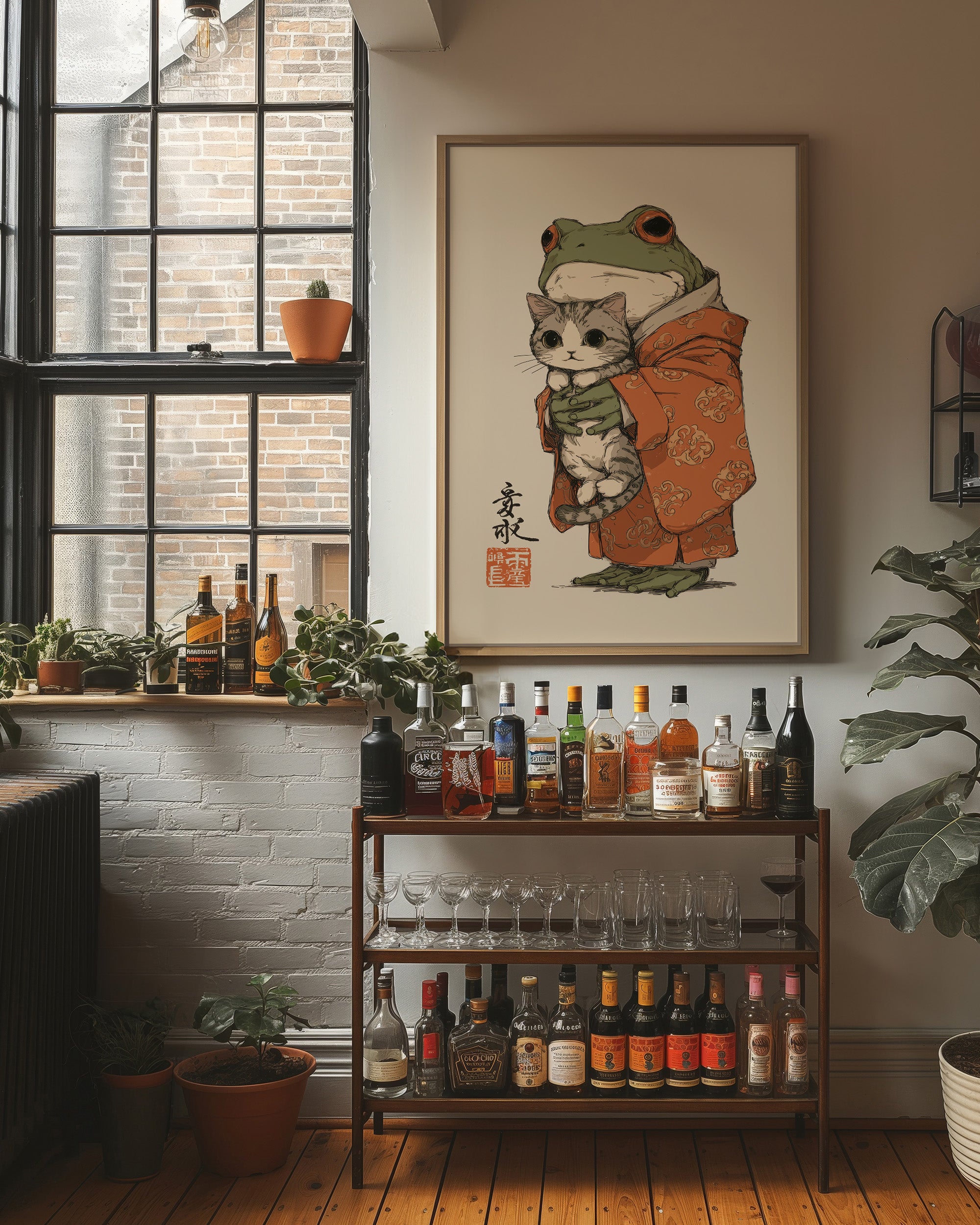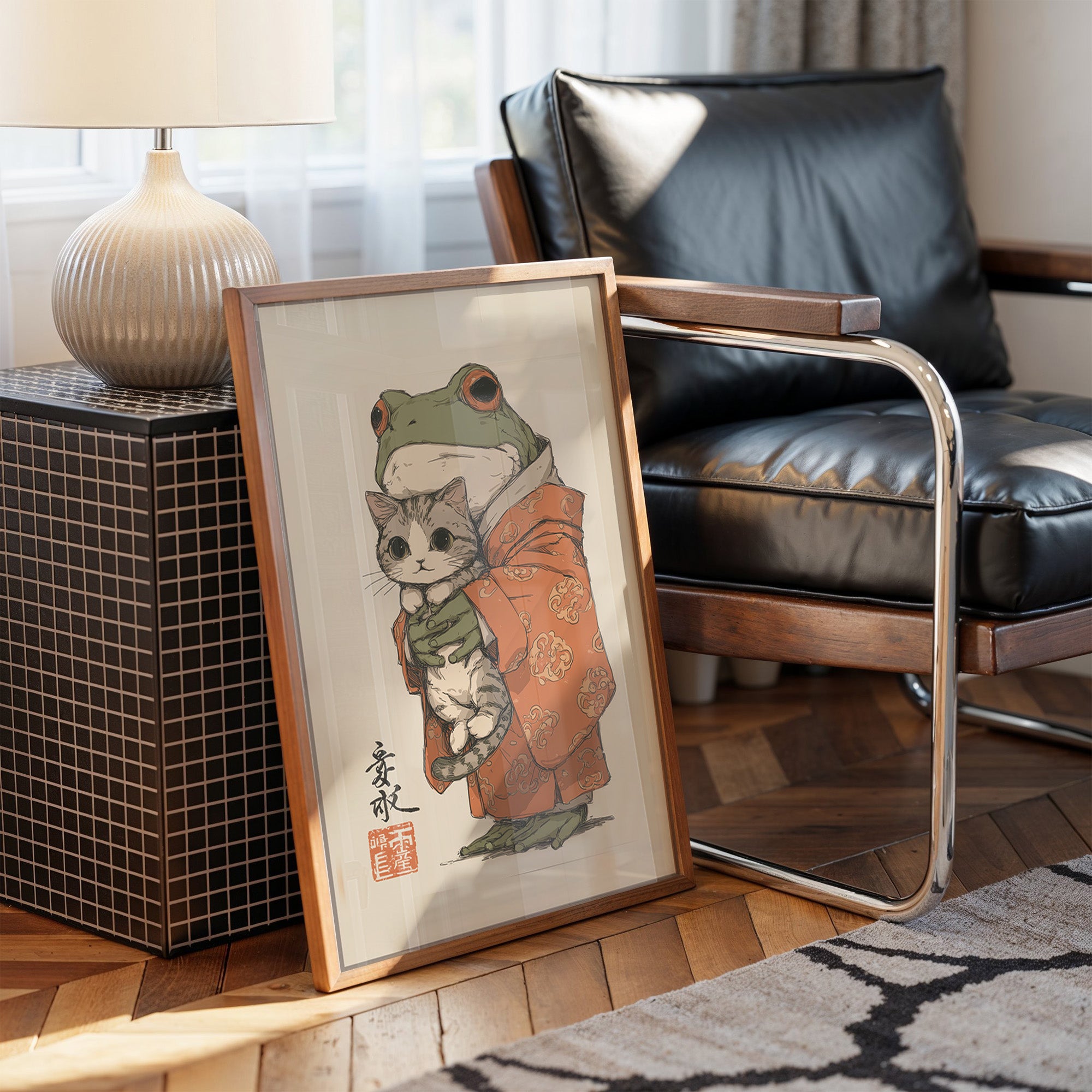 A whimsical encounter unfolds as a gentle frog cradles a wide-eyed kitten, their unlikely friendship captured in delicate brushstrokes. The frog, dressed in traditional Asian attire including a striking orange robe adorned with cloud patterns, holds the small tabby cat with tender care. Rich earth tones and coral accents create a harmonious balance, while the Japanese seal and calligraphy add an authentic artistic touch. This playful piece would bring charm and character to a child's reading nook or add a touch of storytelling magic to a modern Asian-inspired space.