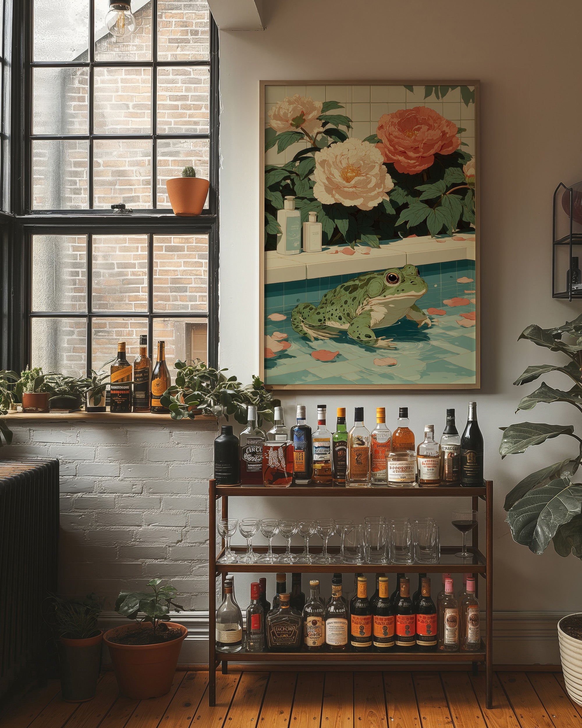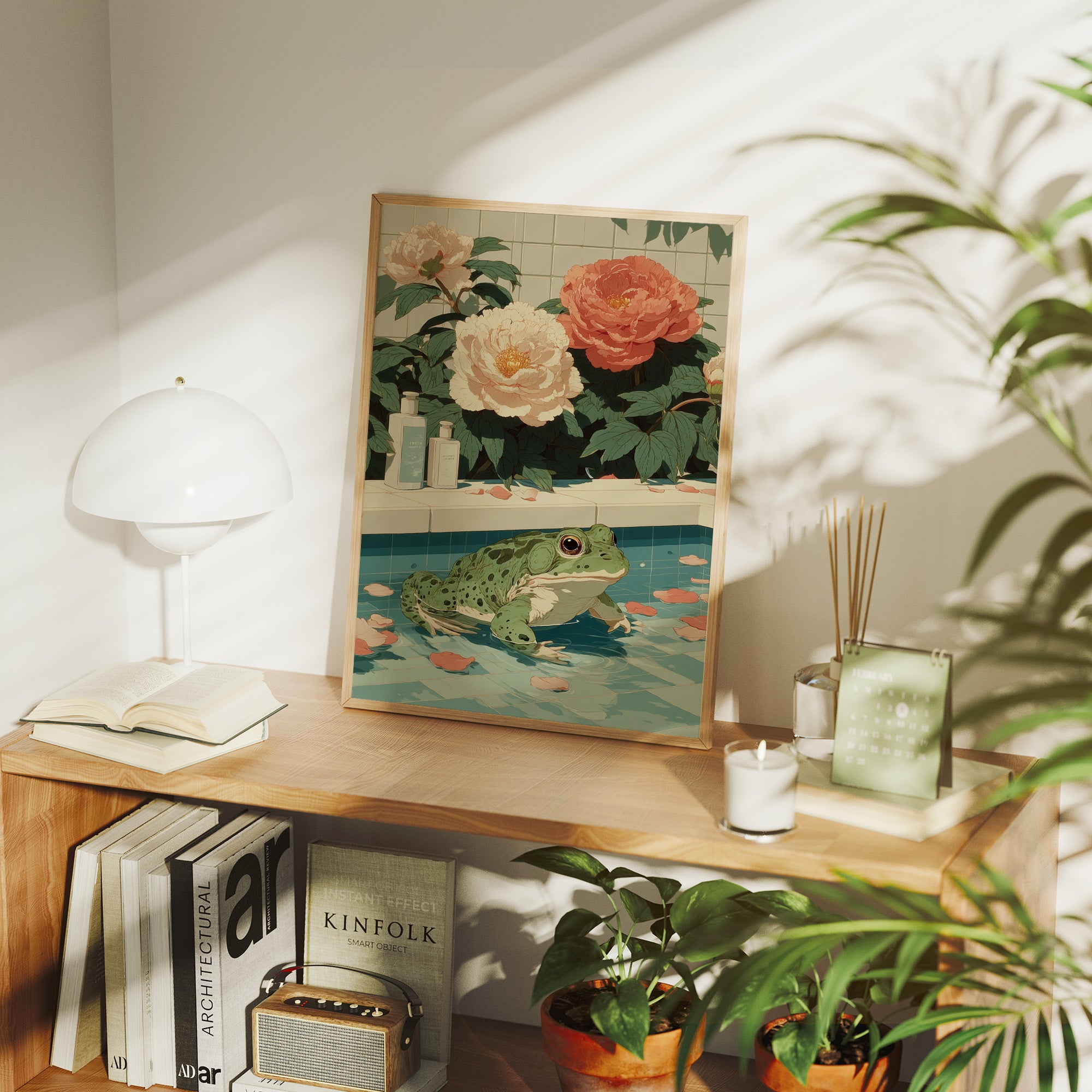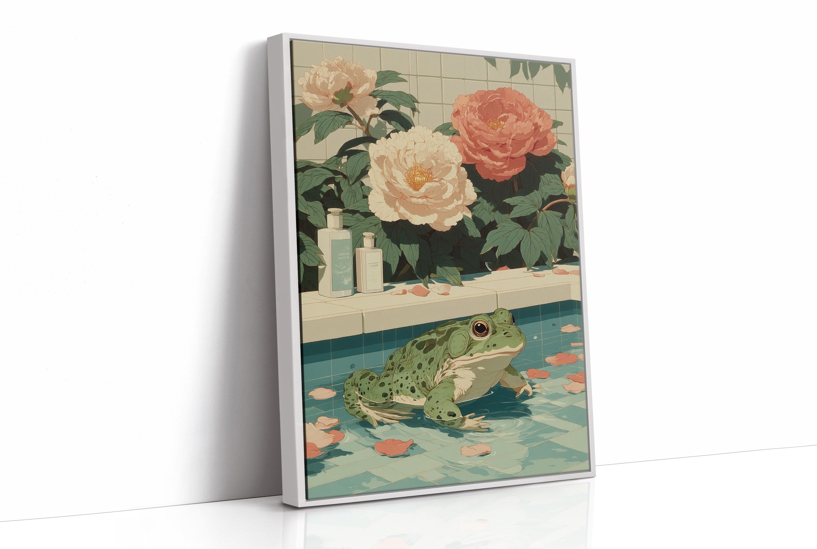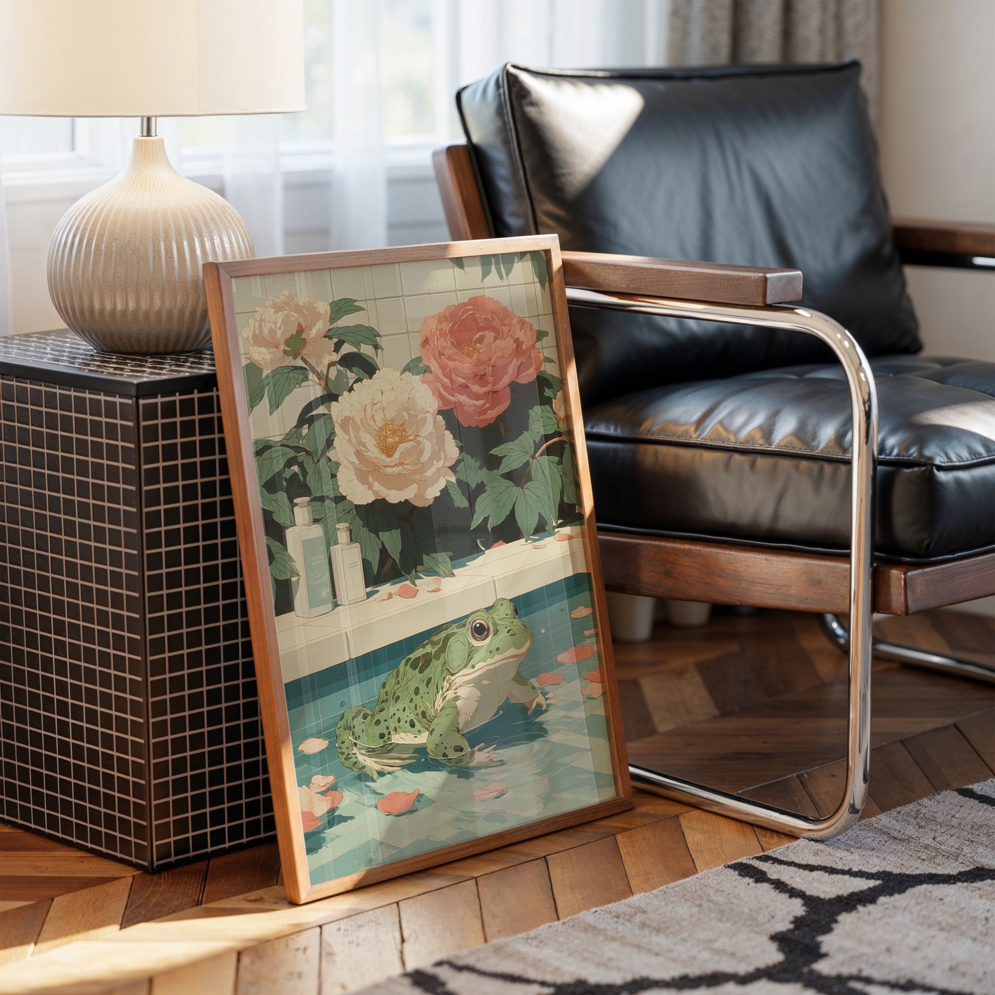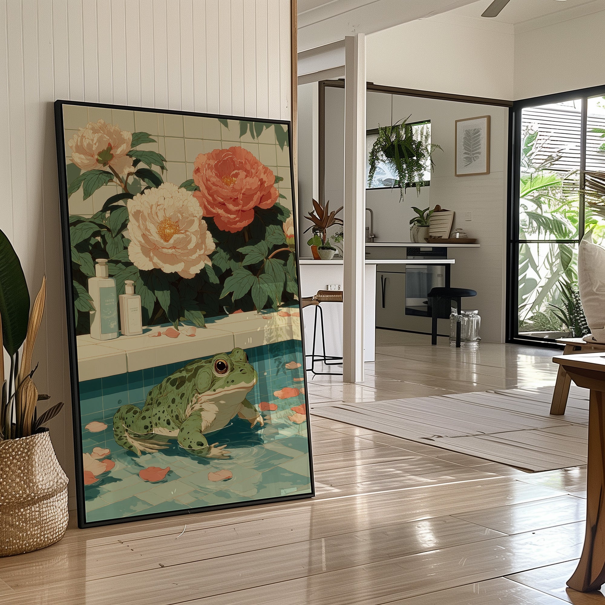 A whimsical scene unfolds where a contemplative green frog sits amid turquoise waters, surrounded by floating peony petals. The contrast between the textured amphibian and the delicate coral and cream blooms creates an enchanting narrative of unlikely beauty. The composition balances nature's raw and refined elements, with lush foliage and crystalline water playing supporting roles in this modern fairy tale setting. This piece would bring a touch of storybook charm to a reading nook, child's room, or any space seeking a blend of whimsy and sophisticated botanical art.