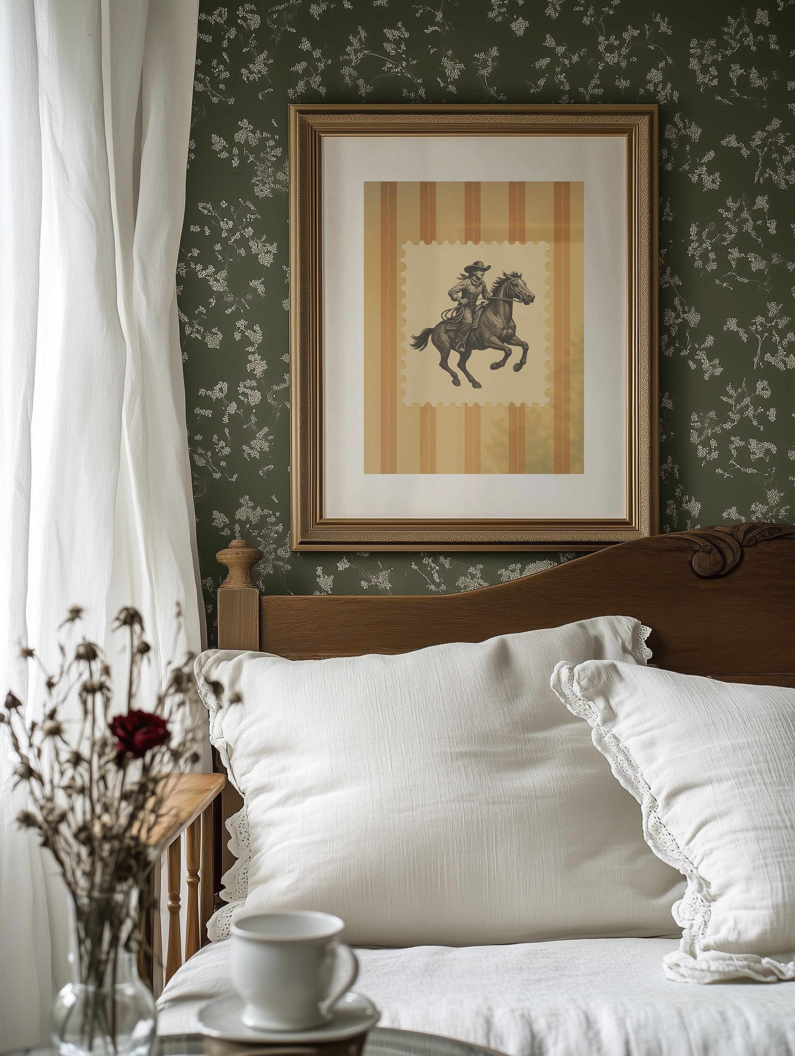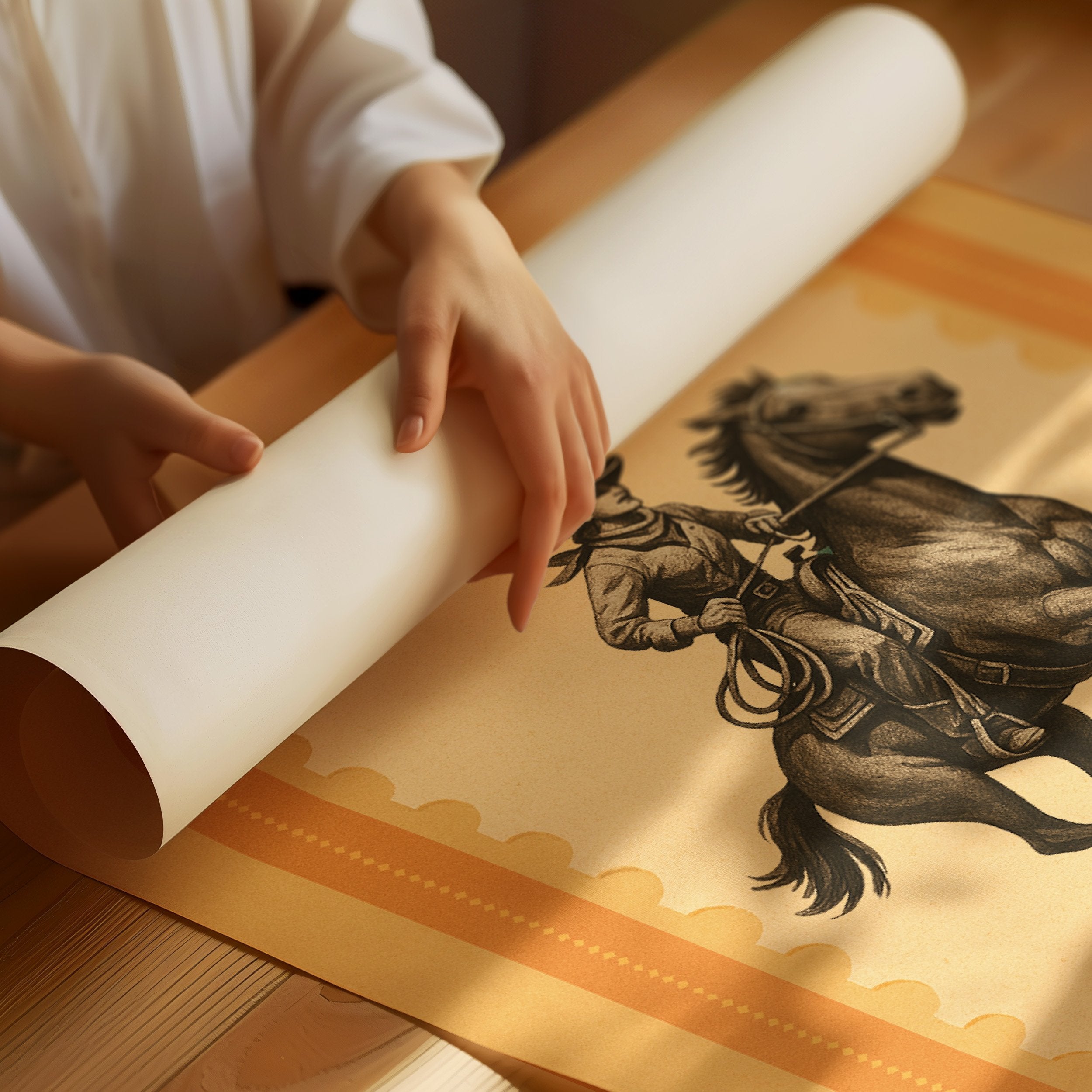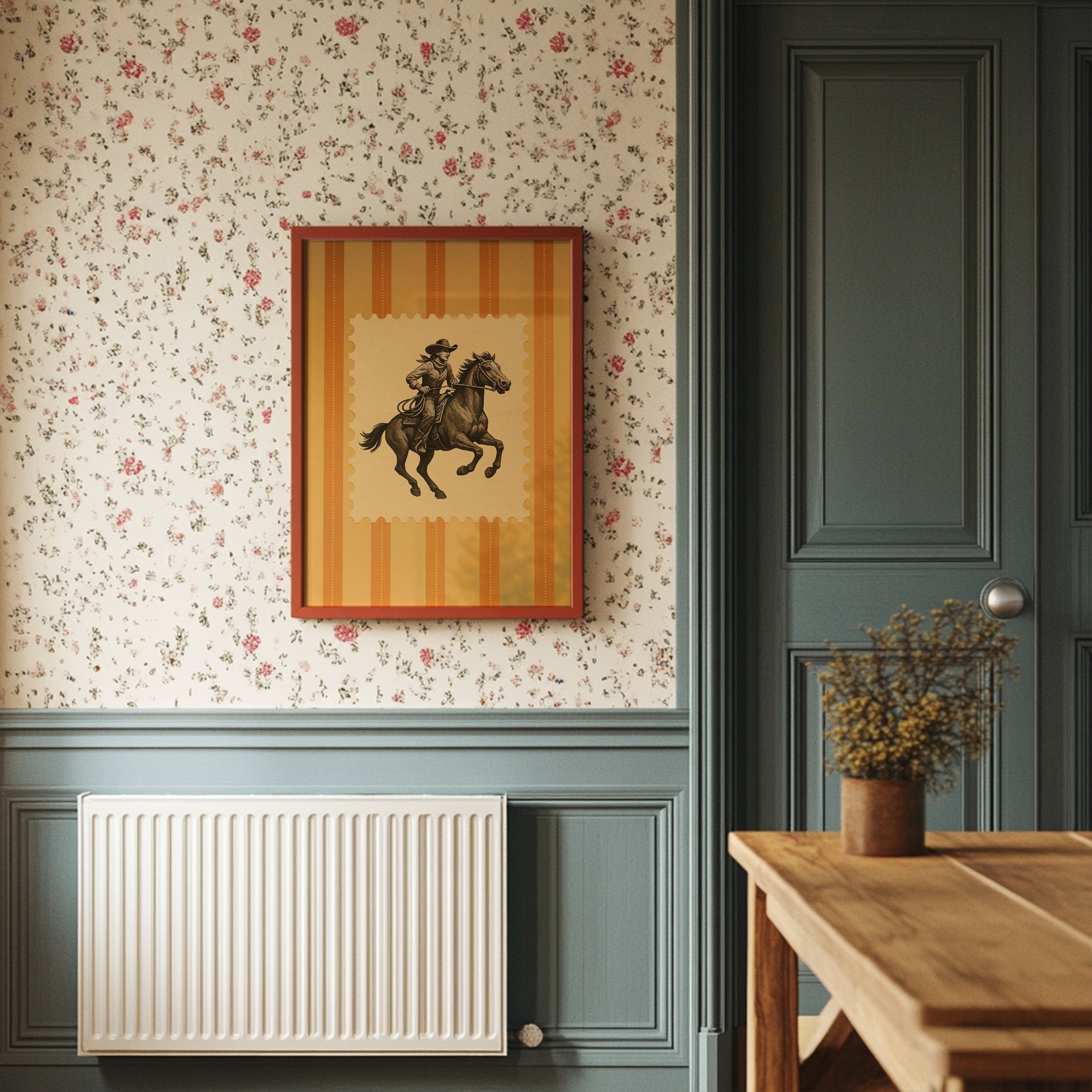Warm amber light seems to radiate from this vintage-inspired cowboy illustration, evoking the untamed spirit of the American West. The bold silhouette of rider and horse gallops across a backdrop of golden stripes, capturing a moment of determined motion frozen in time. This piece brings together nostalgia and rugged elegance, creating a conversation about heritage and adventure. This framed piece finds its perfect home in a rustic den, southwest-inspired living room, or as a focal point in a study where leather-bound books and warm lighting complete the narrative.