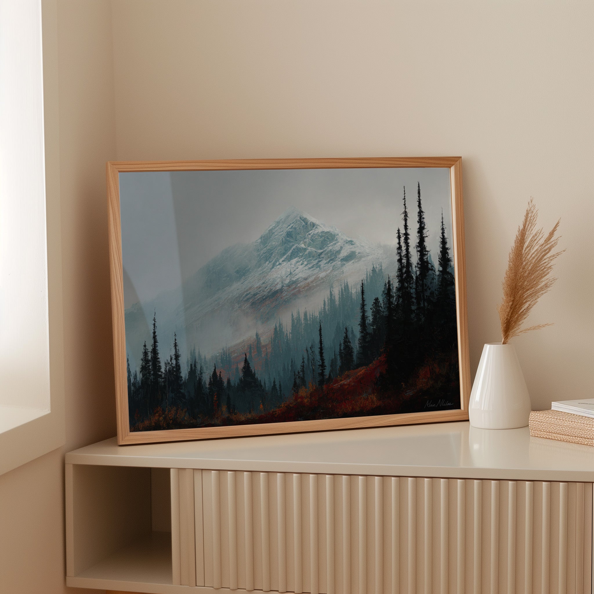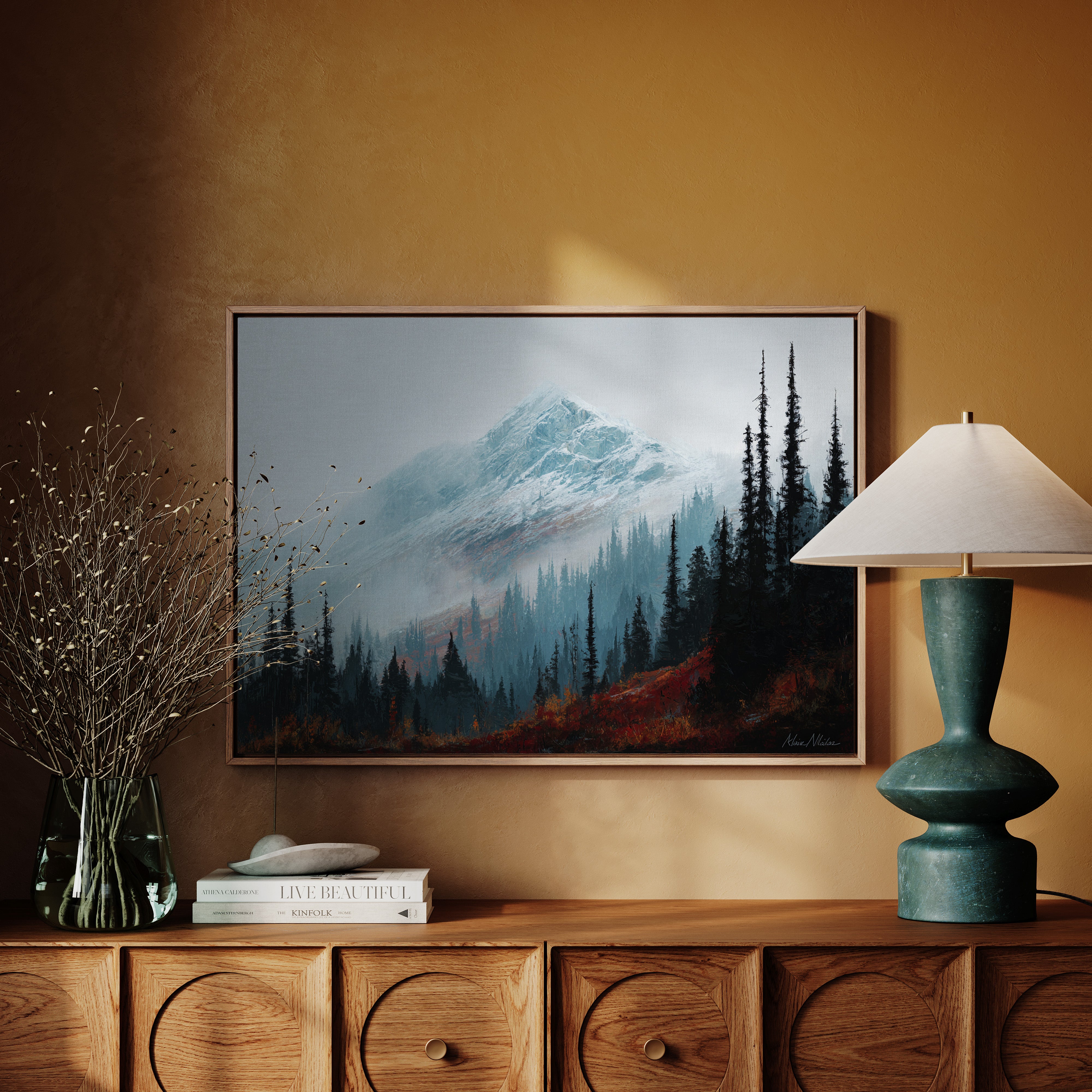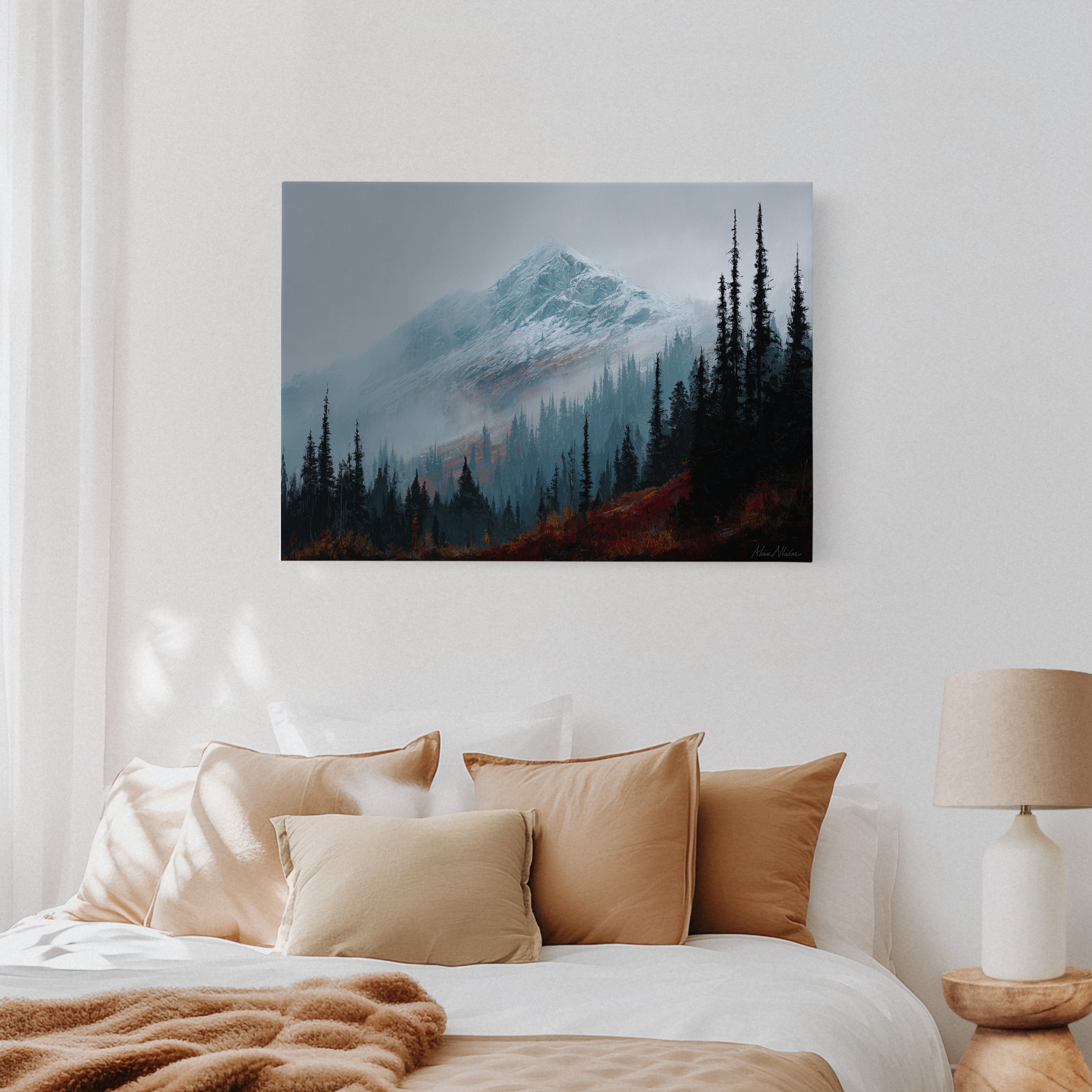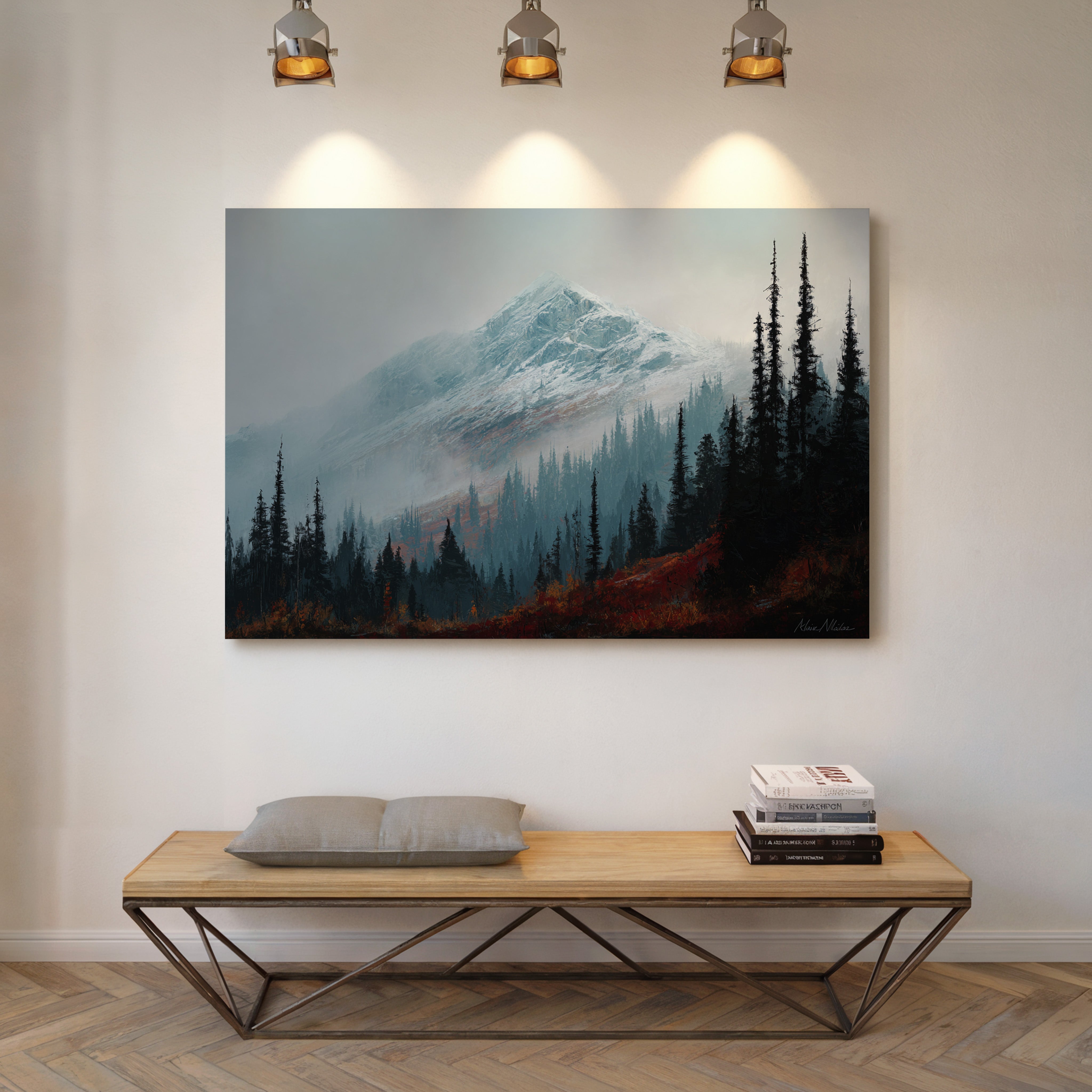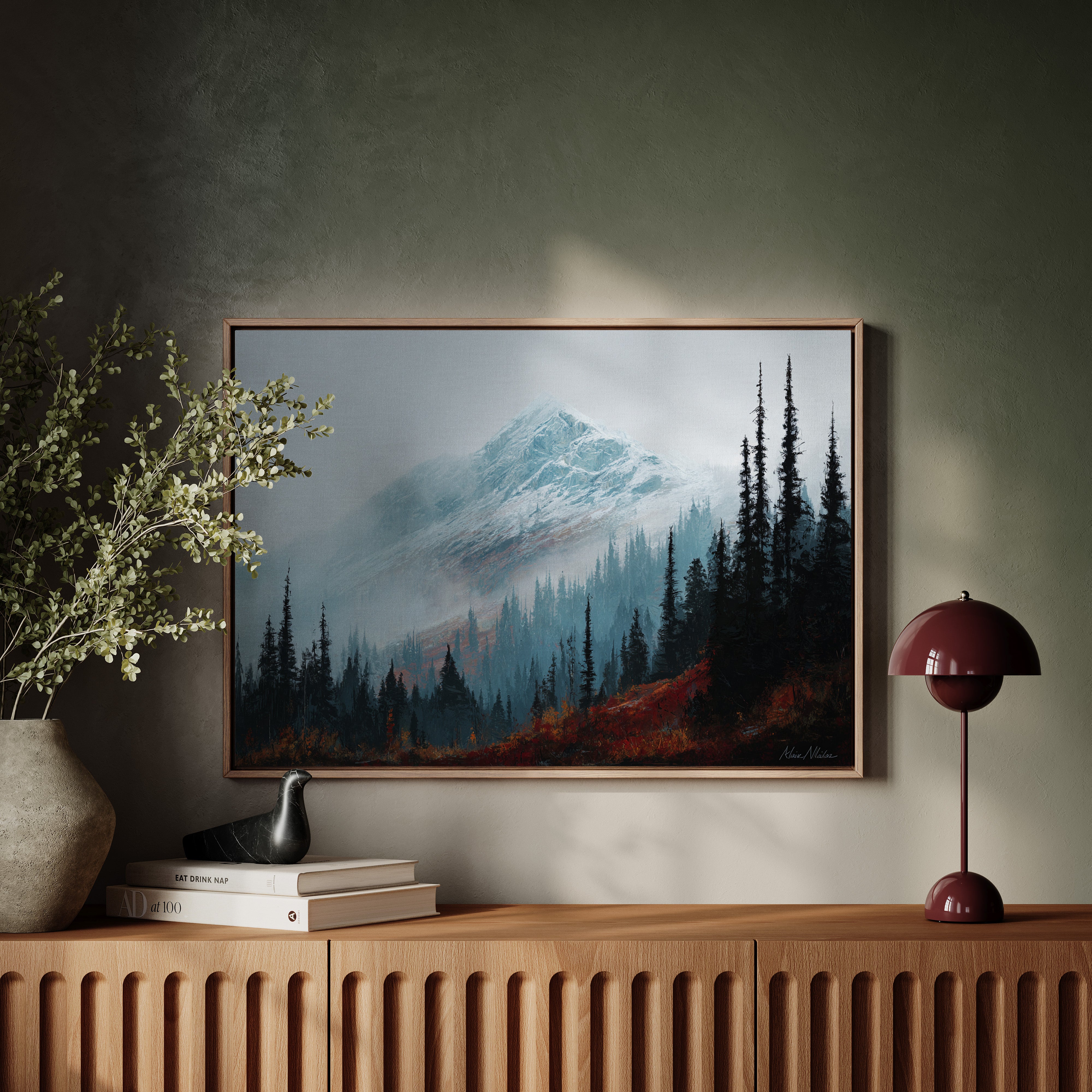 Mist clings to the mountainside where winter and autumn collide in a dramatic display of nature's transitions. The snow-capped peak rises majestically through layers of fog, while evergreen sentinels stand guard along the slopes. Below, a brilliant display of crimson and amber foliage creates a striking contrast against the cool blues and grays of the alpine landscape. The scene captures that fleeting moment when seasons overlap, where frost-kissed heights meet the warming colors of fall's final performance. This atmospheric piece would create a stunning focal point in a modern mountain home or add natural drama to a minimalist living space.