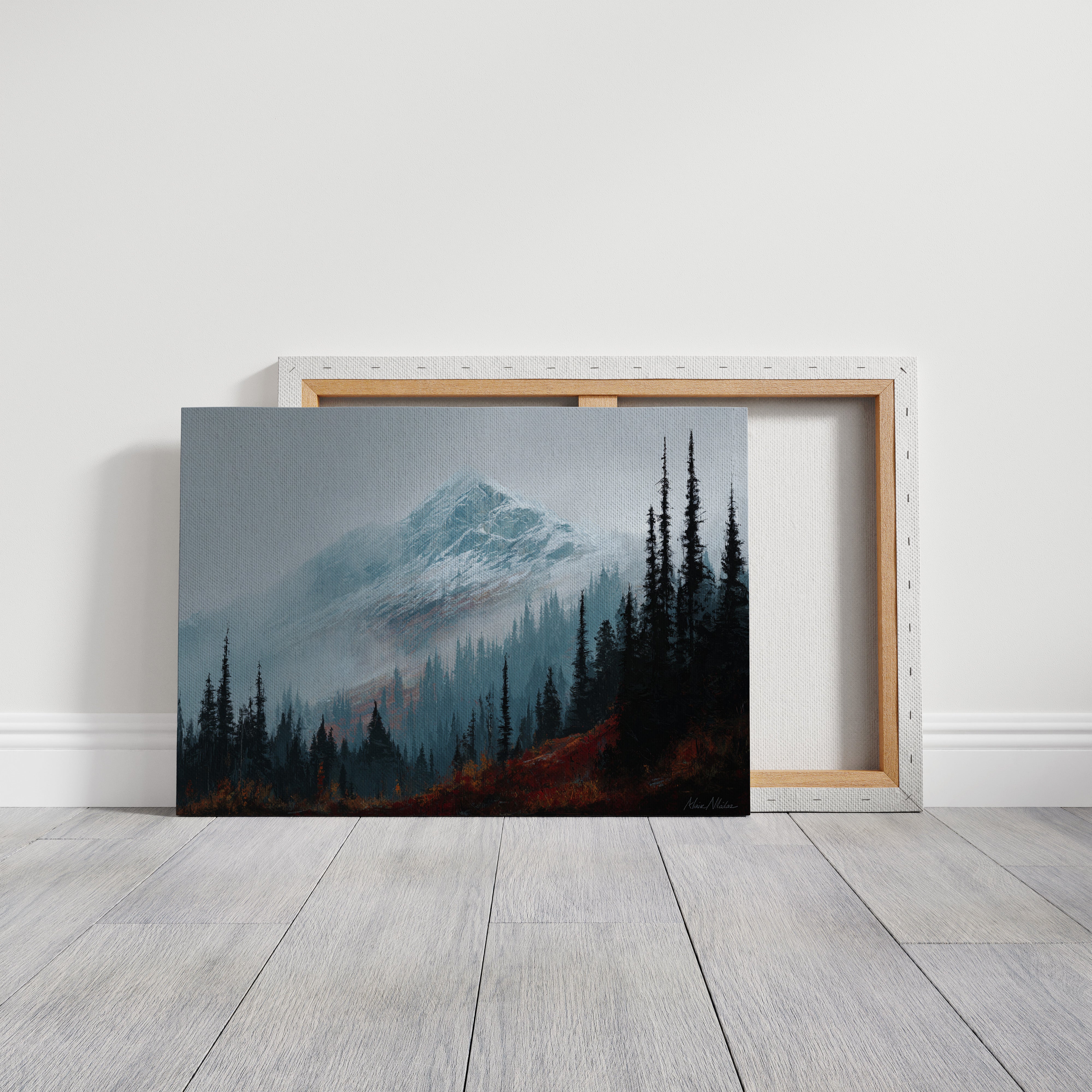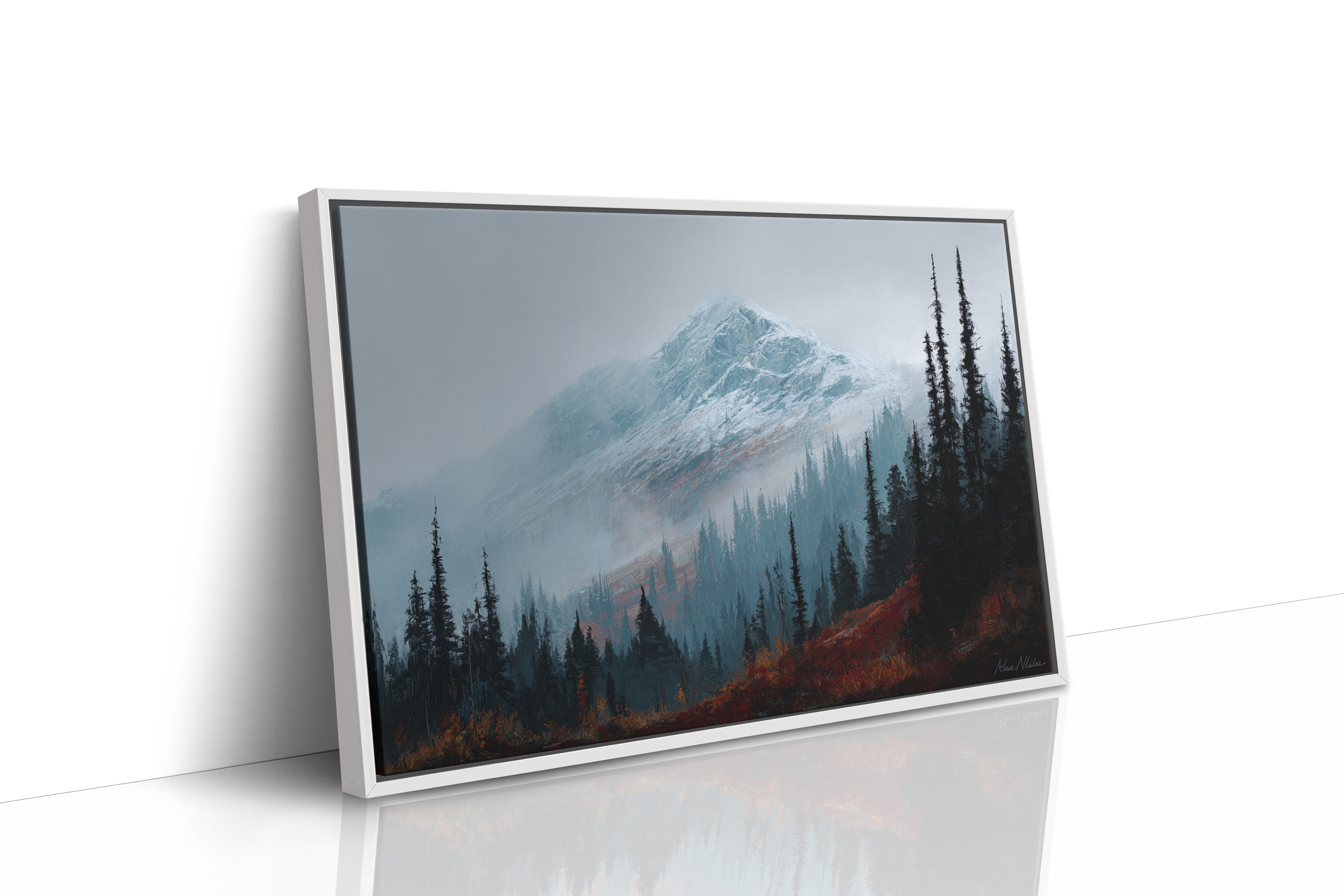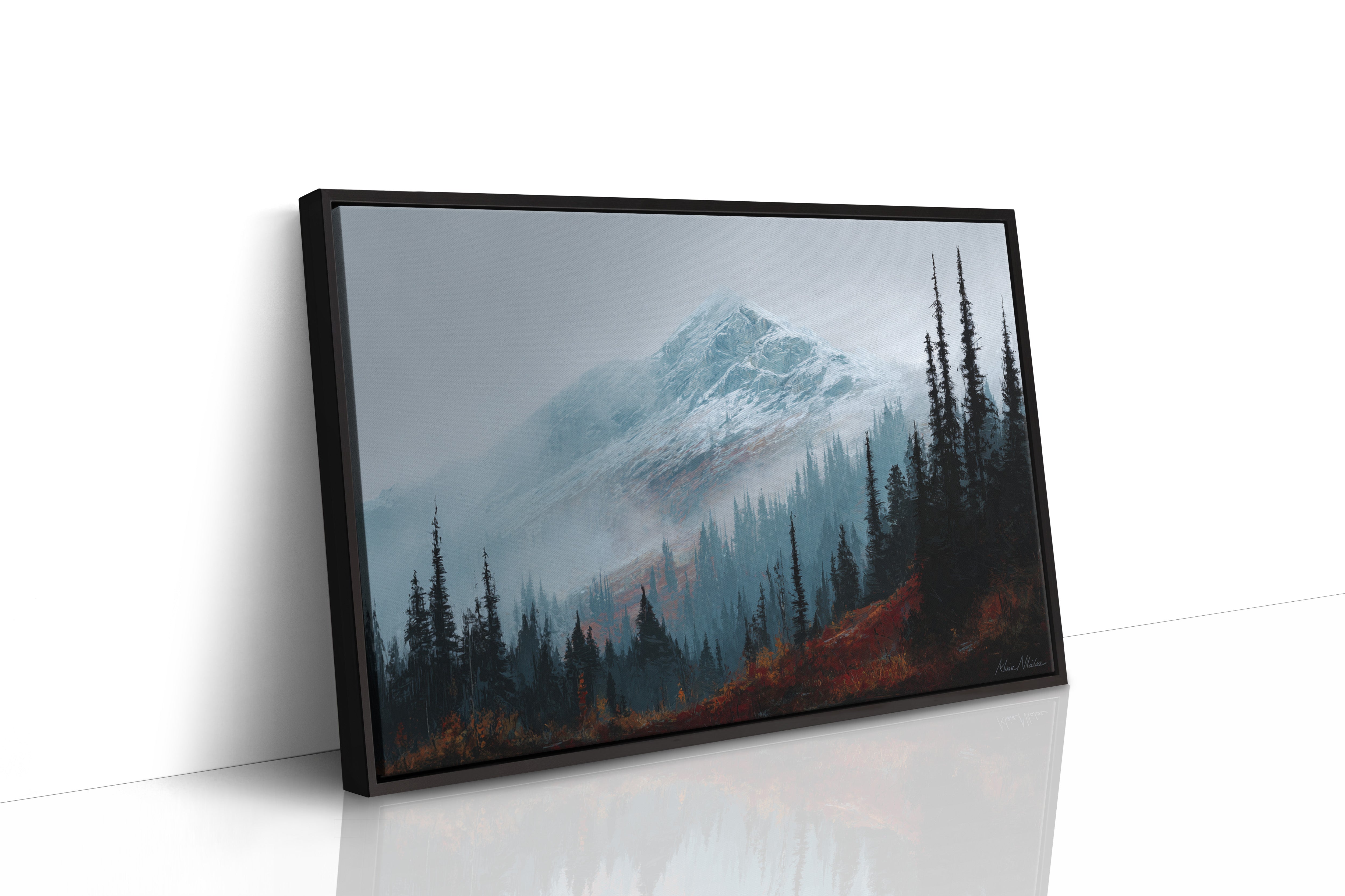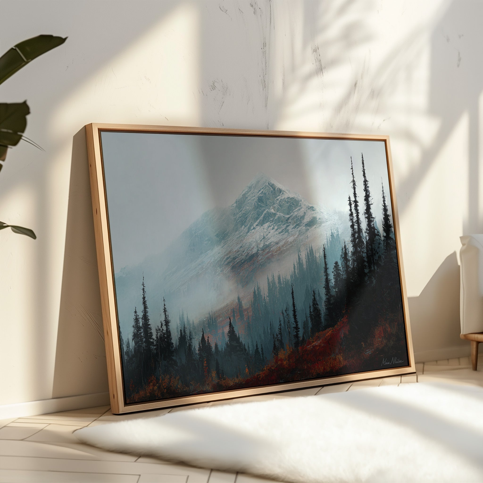 Mist clings to the mountainside where winter and autumn collide in a dramatic display of nature's transitions. The snow-capped peak rises majestically through layers of fog, while evergreen sentinels stand guard along the slopes. Below, a brilliant display of crimson and amber foliage creates a striking contrast against the cool blues and grays of the alpine landscape. The scene captures that fleeting moment when seasons overlap, where frost-kissed heights meet the warming colors of fall's final performance. This atmospheric piece would create a stunning focal point in a modern mountain home or add natural drama to a minimalist living space.