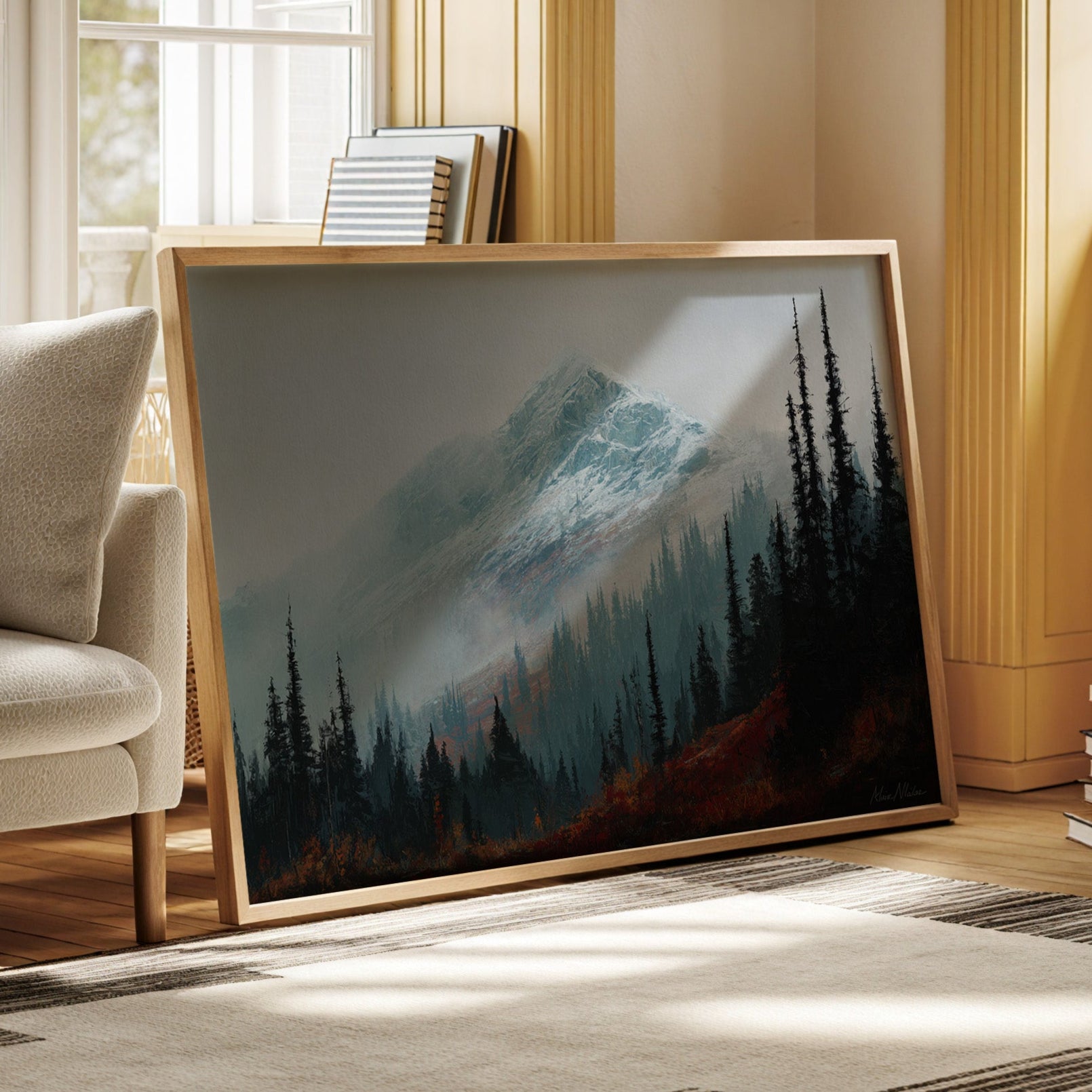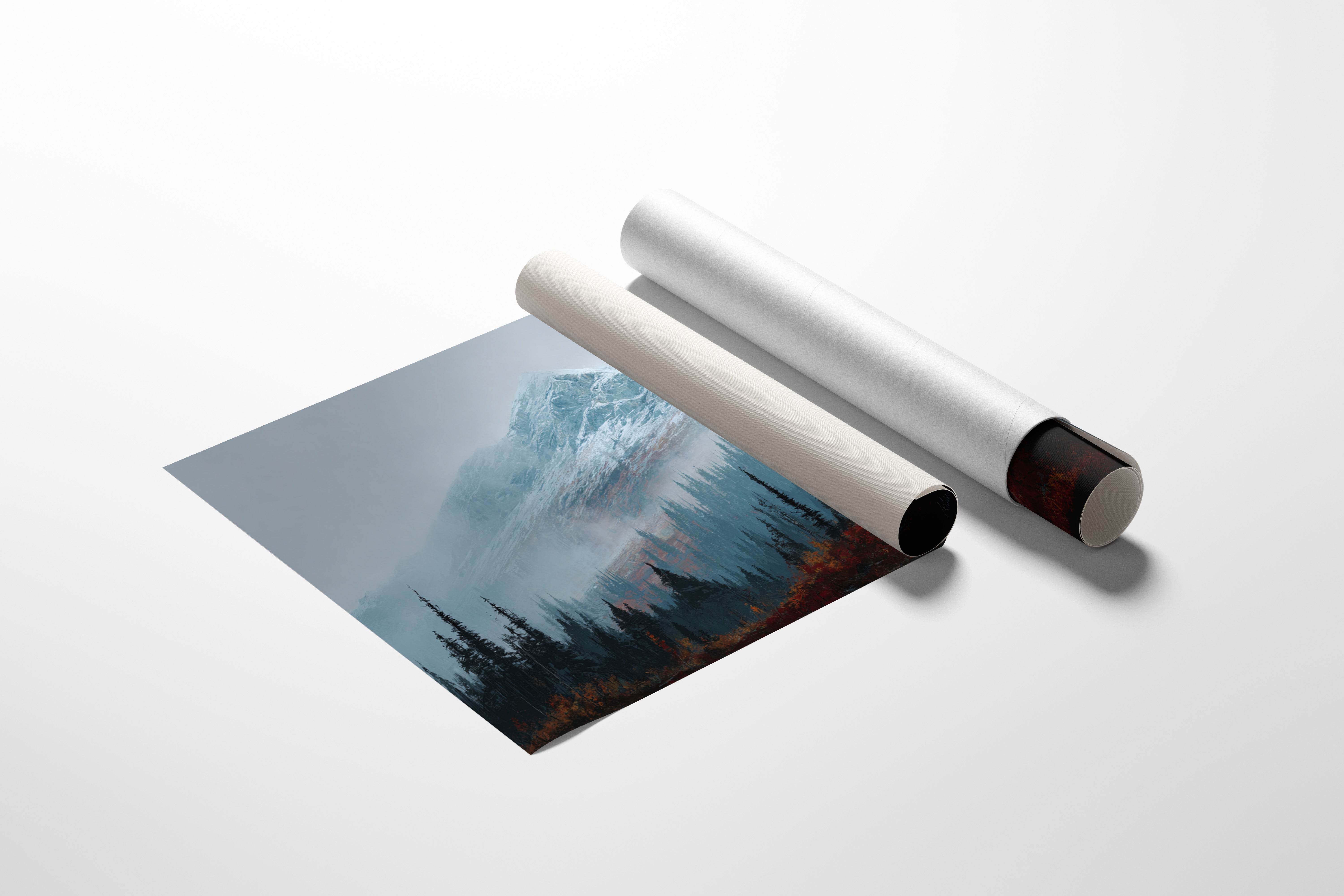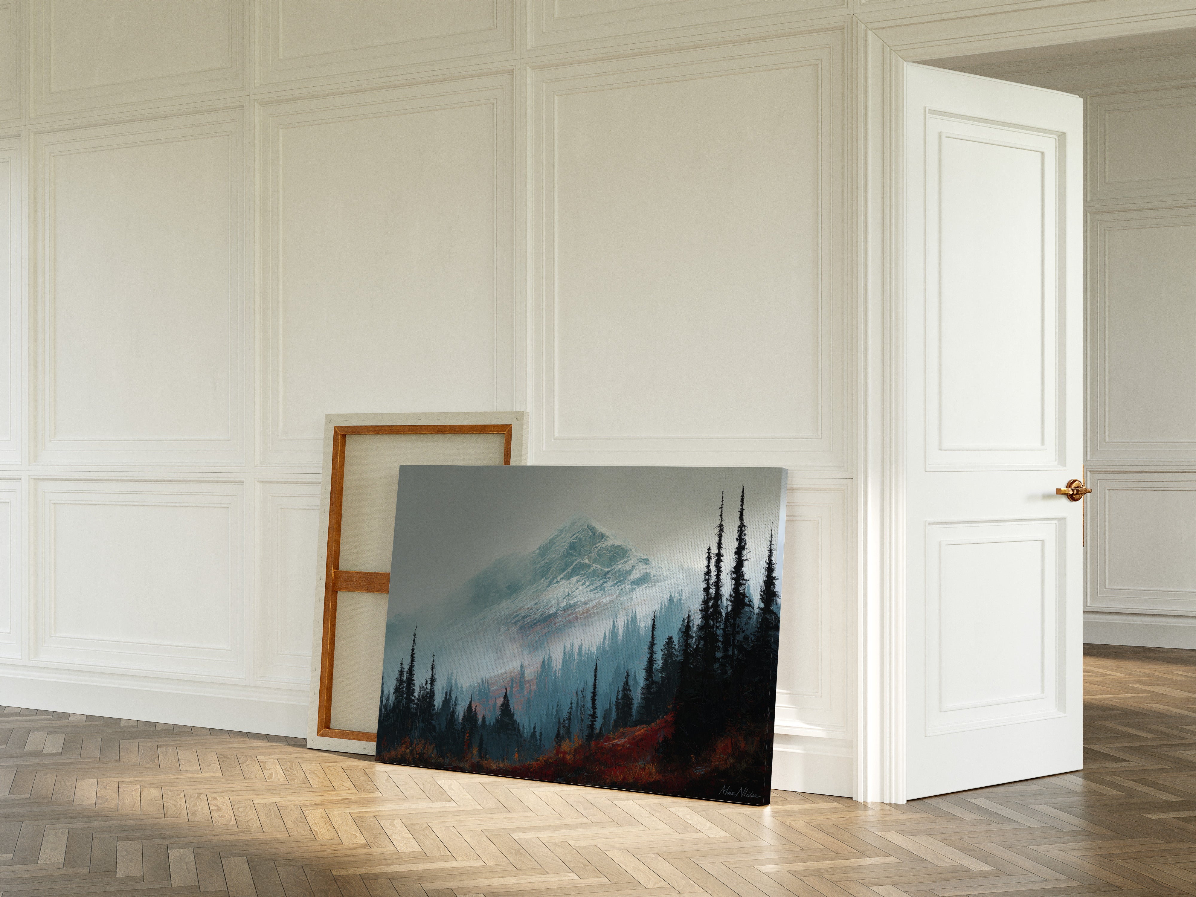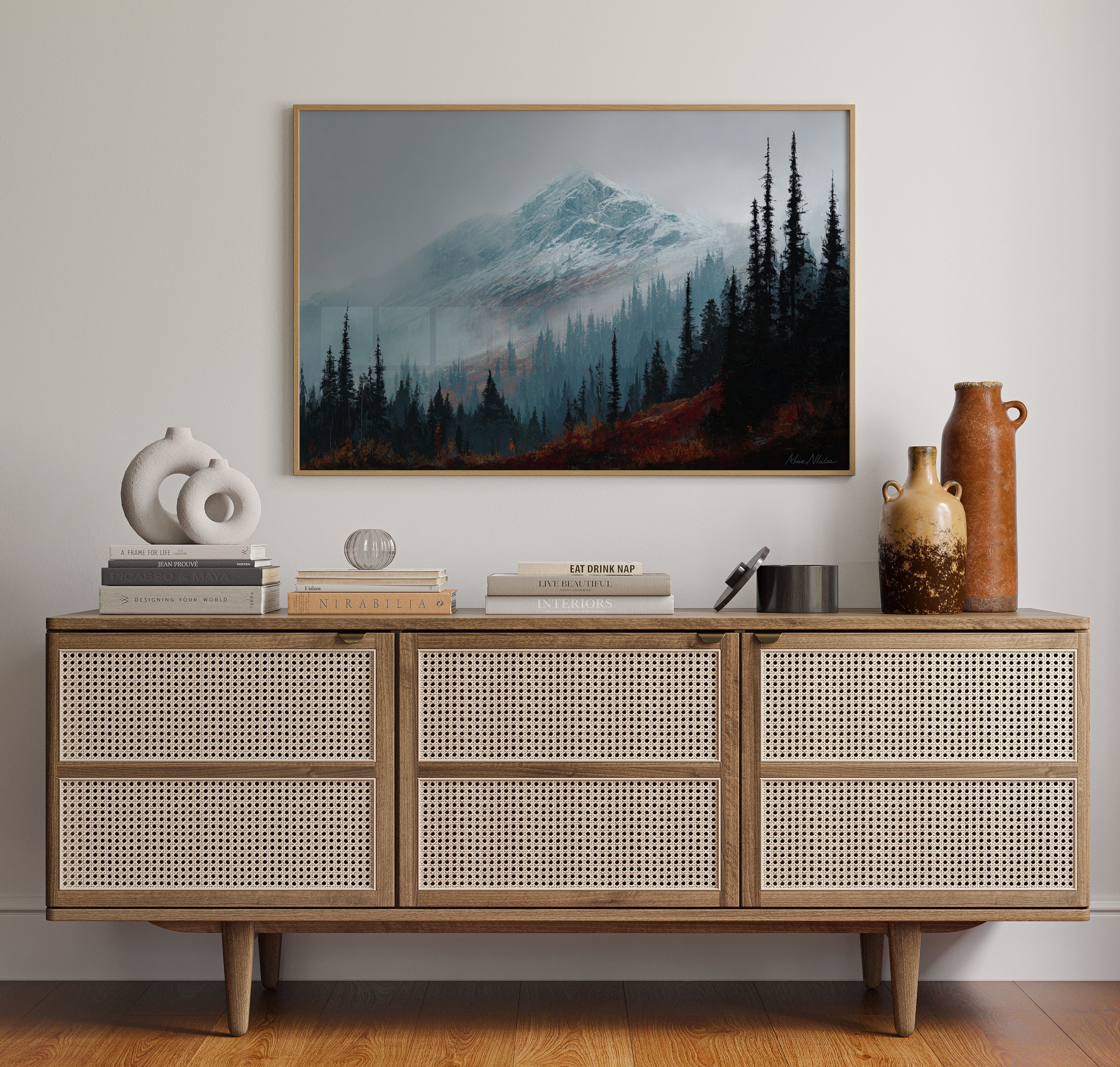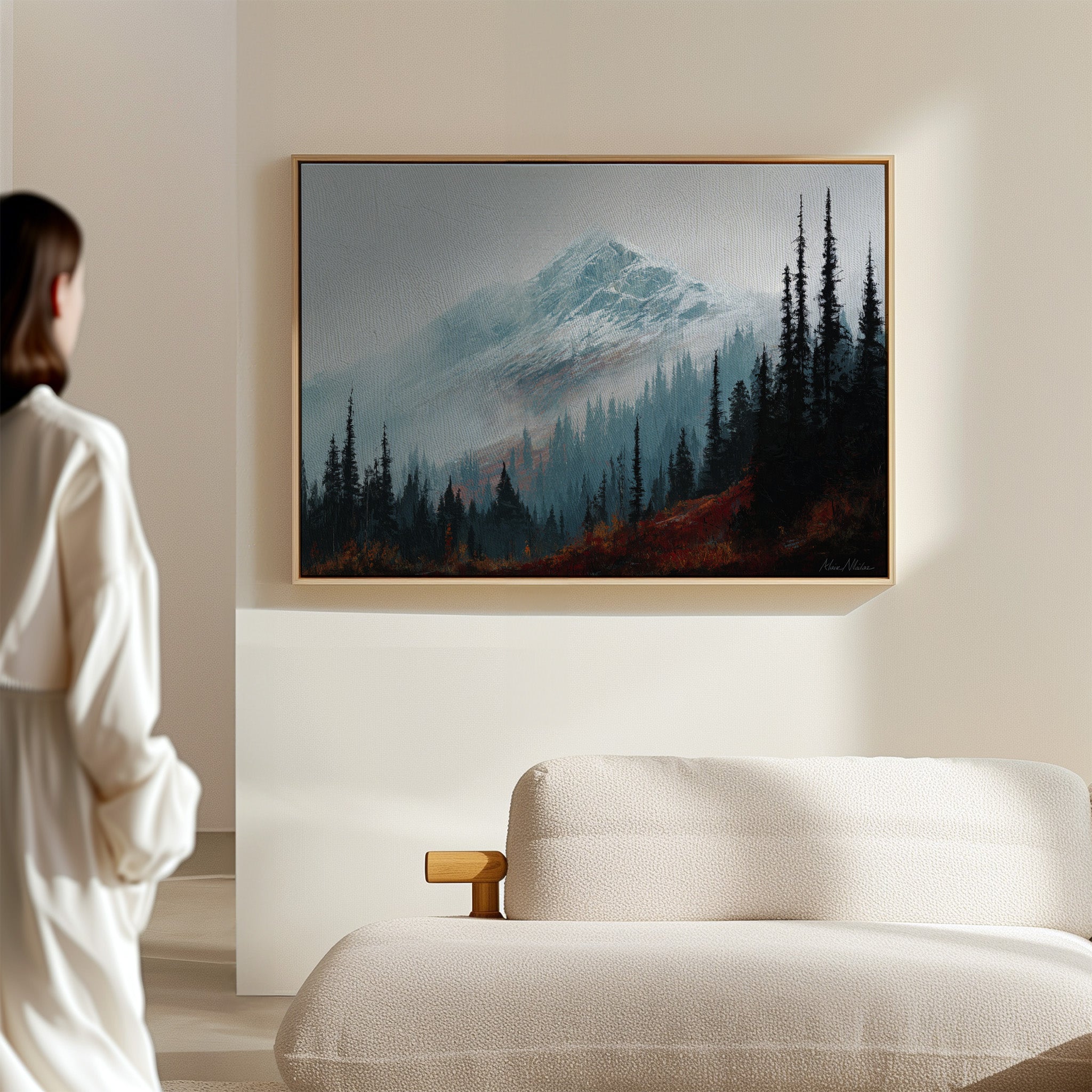 Mist clings to the mountainside where winter and autumn collide in a dramatic display of nature's transitions. The snow-capped peak rises majestically through layers of fog, while evergreen sentinels stand guard along the slopes. Below, a brilliant display of crimson and amber foliage creates a striking contrast against the cool blues and grays of the alpine landscape. The scene captures that fleeting moment when seasons overlap, where frost-kissed heights meet the warming colors of fall's final performance. This atmospheric piece would create a stunning focal point in a modern mountain home or add natural drama to a minimalist living space.
