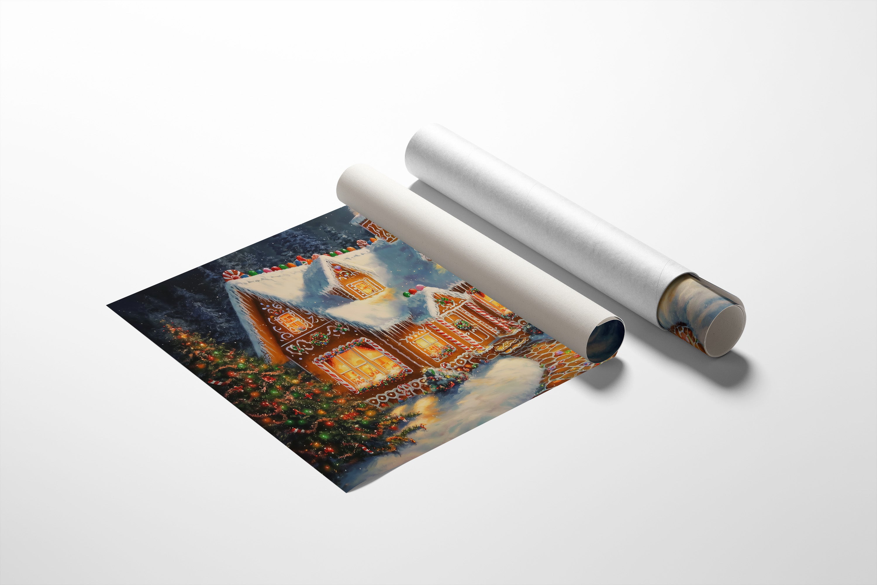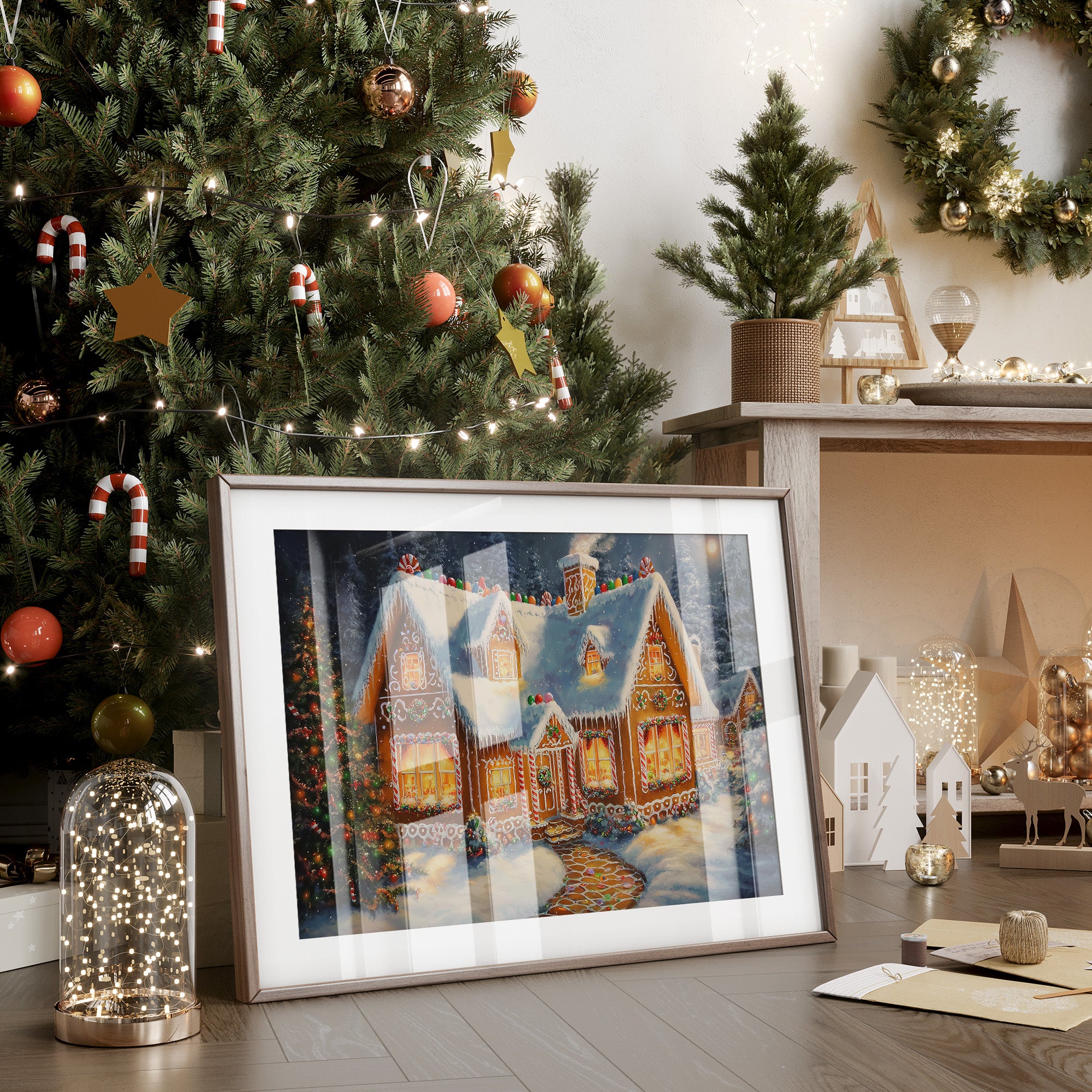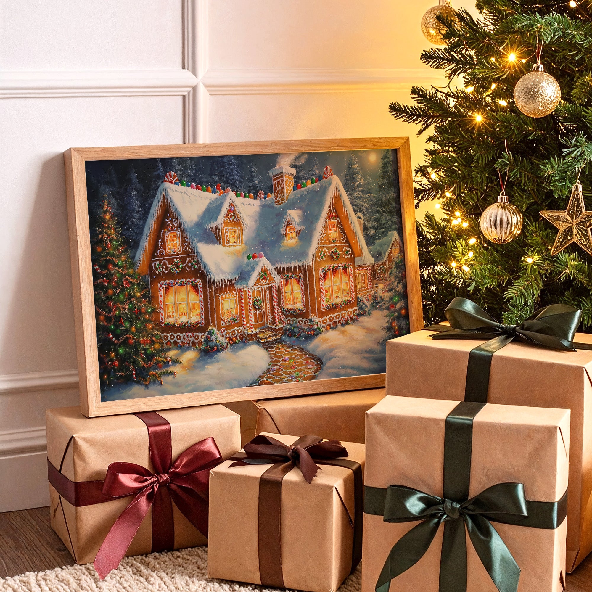 Golden light spills from sugar-frosted windows, casting warm rectangles across fresh snow. This enchanted cottage scene captures the essence of winter's most magical evening, where every decorated peak and candy-trimmed eave tells a story of holiday wonder. Delicate icing details trace whimsical patterns across gingerbread walls, while tiny colorful lights twinkle against the deep blue of a forest night. This nostalgic piece brings childhood dreams to life in any space, perfect for creating a cozy corner that celebrates the sweet spirit of the season.