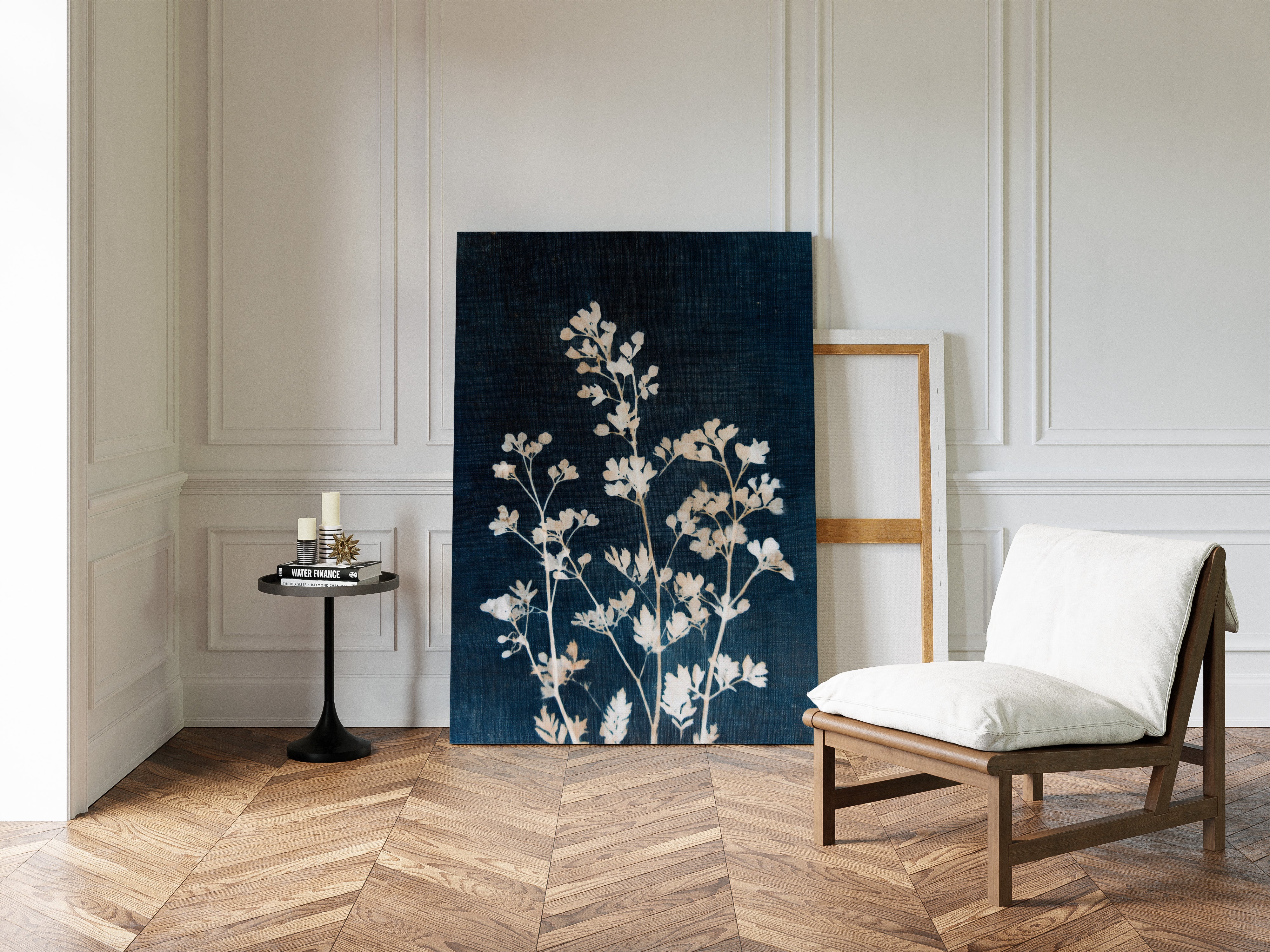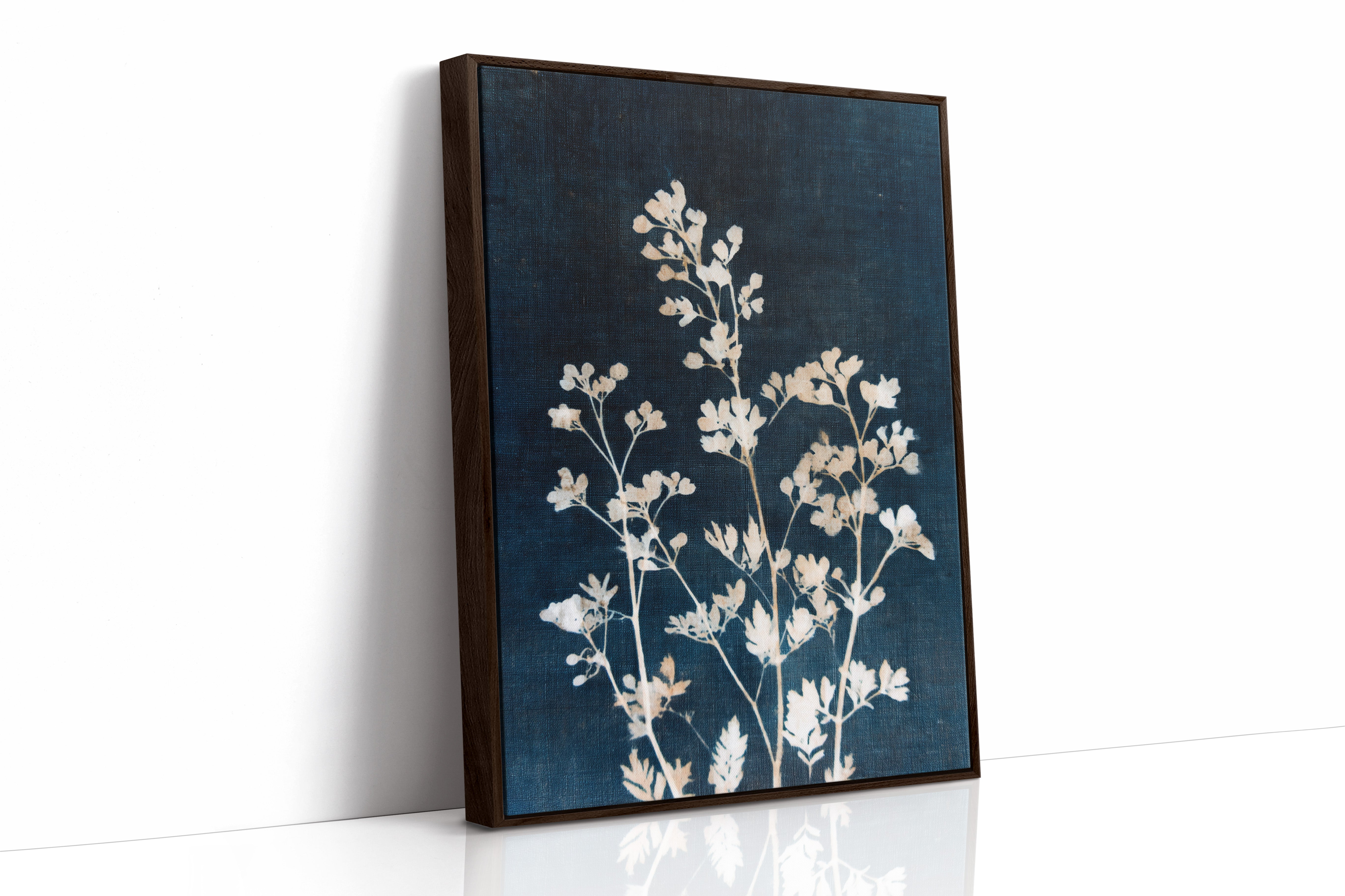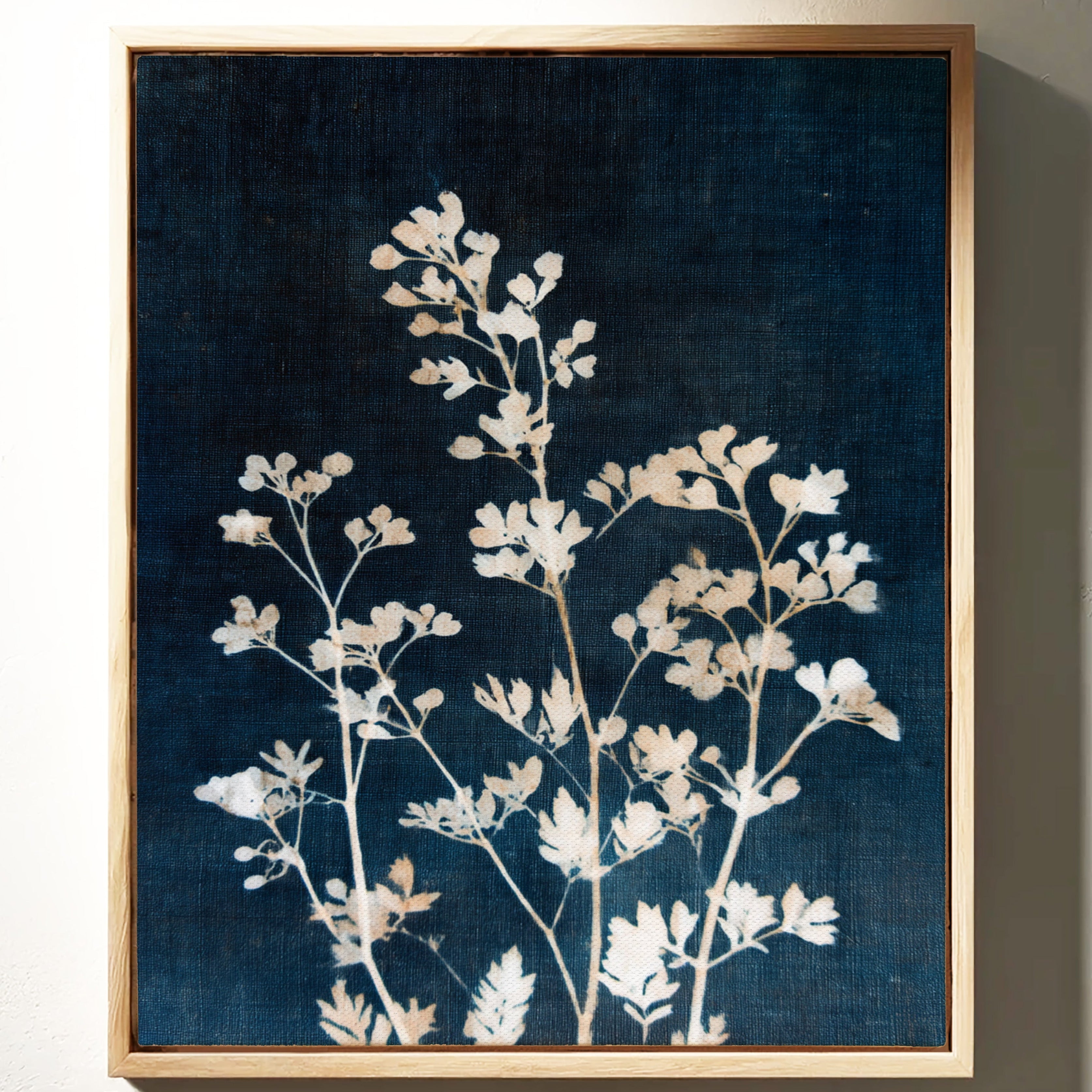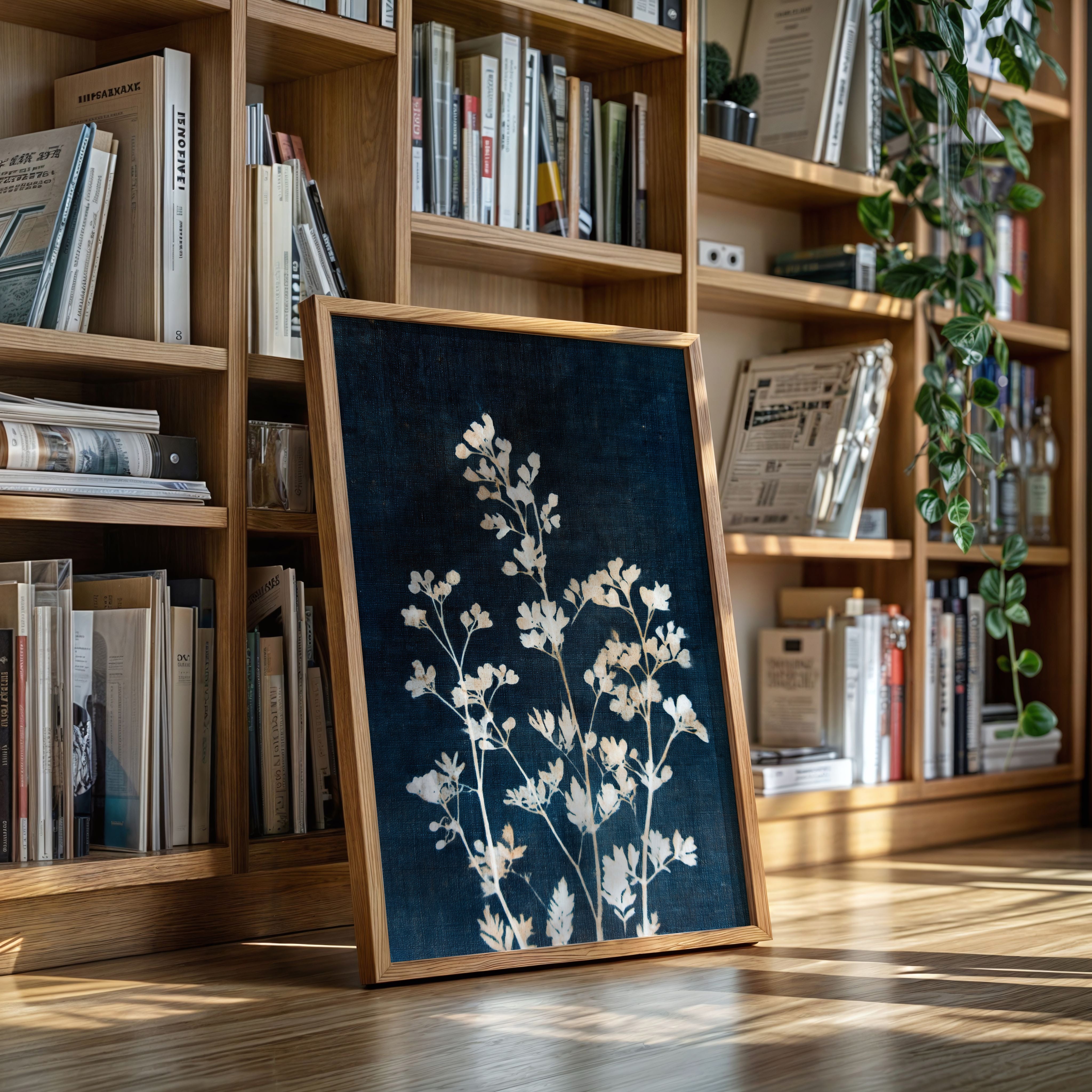 A delicate arrangement of leaves emerges like a memory, their frost-kissed edges glimmering against a deep indigo backdrop. This piece captures the essence of the artisanal, intertwining nature with the refined touch of craftsmanship. Each leaf tells a story, their intricate details and soft textures evoking a sense of tranquility and nostalgia, inviting the viewer to reflect on nature's quiet beauty. Perfect for a serene reading nook or a calming bedroom space, this piece breathes life into any corner it graces.