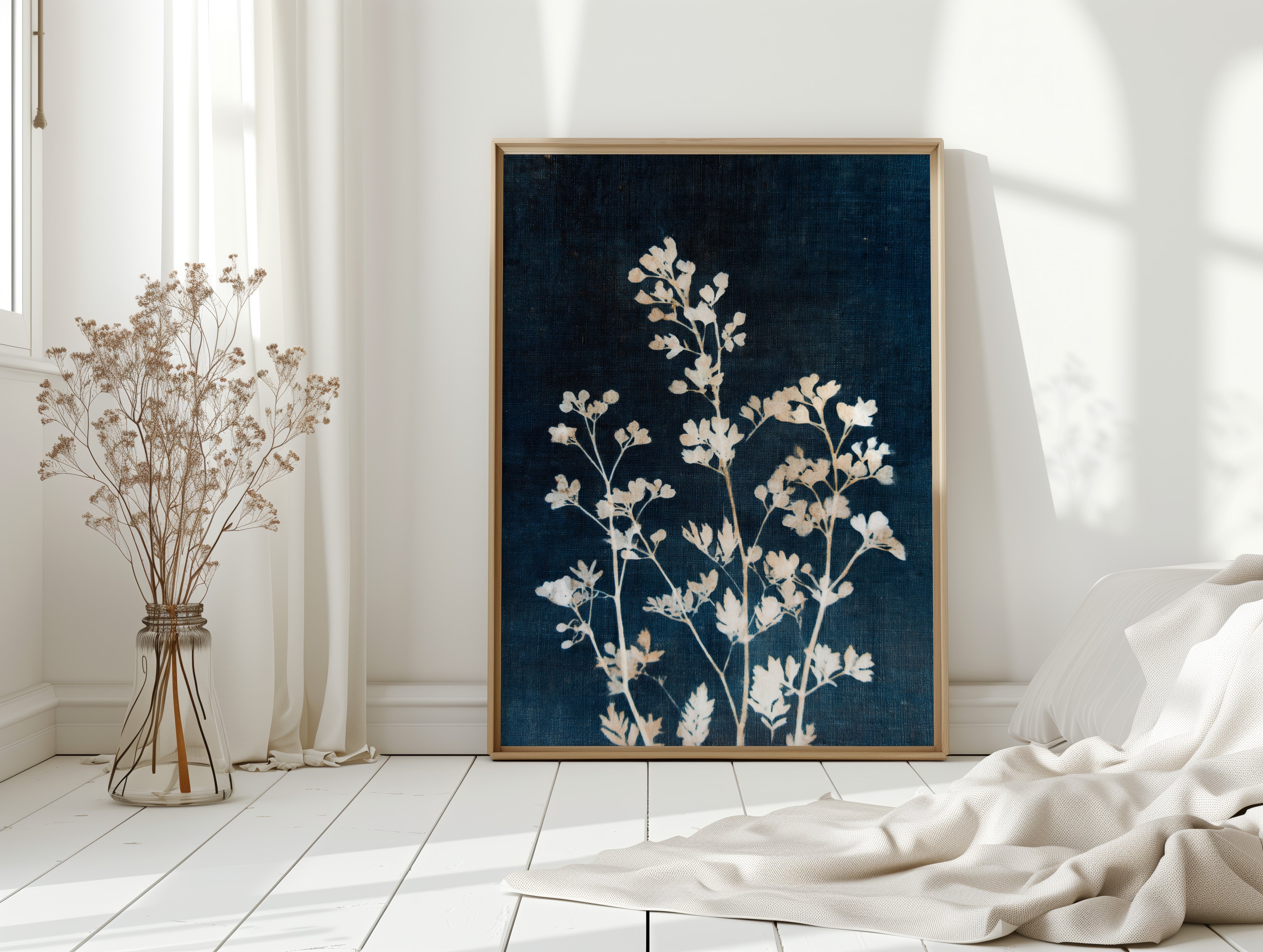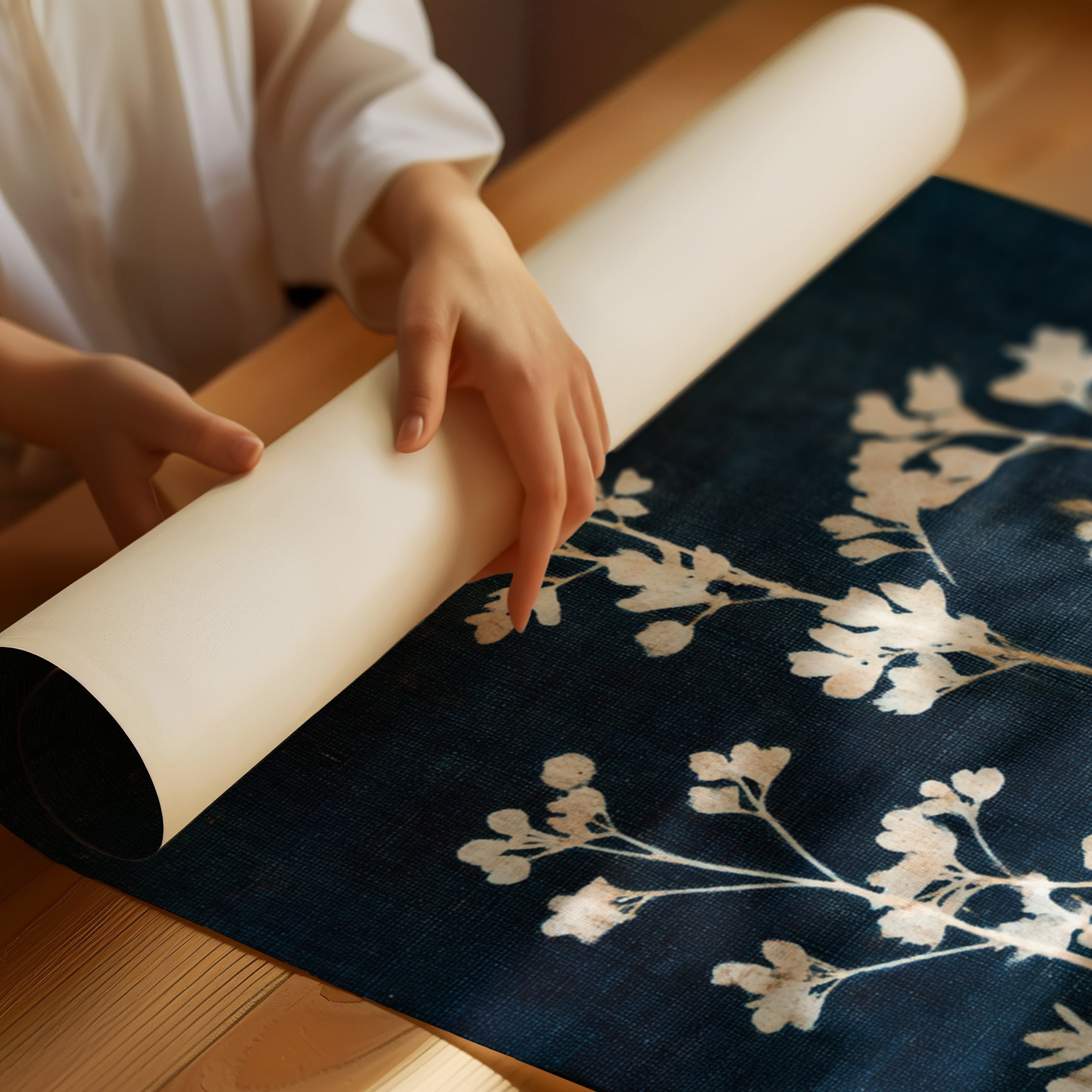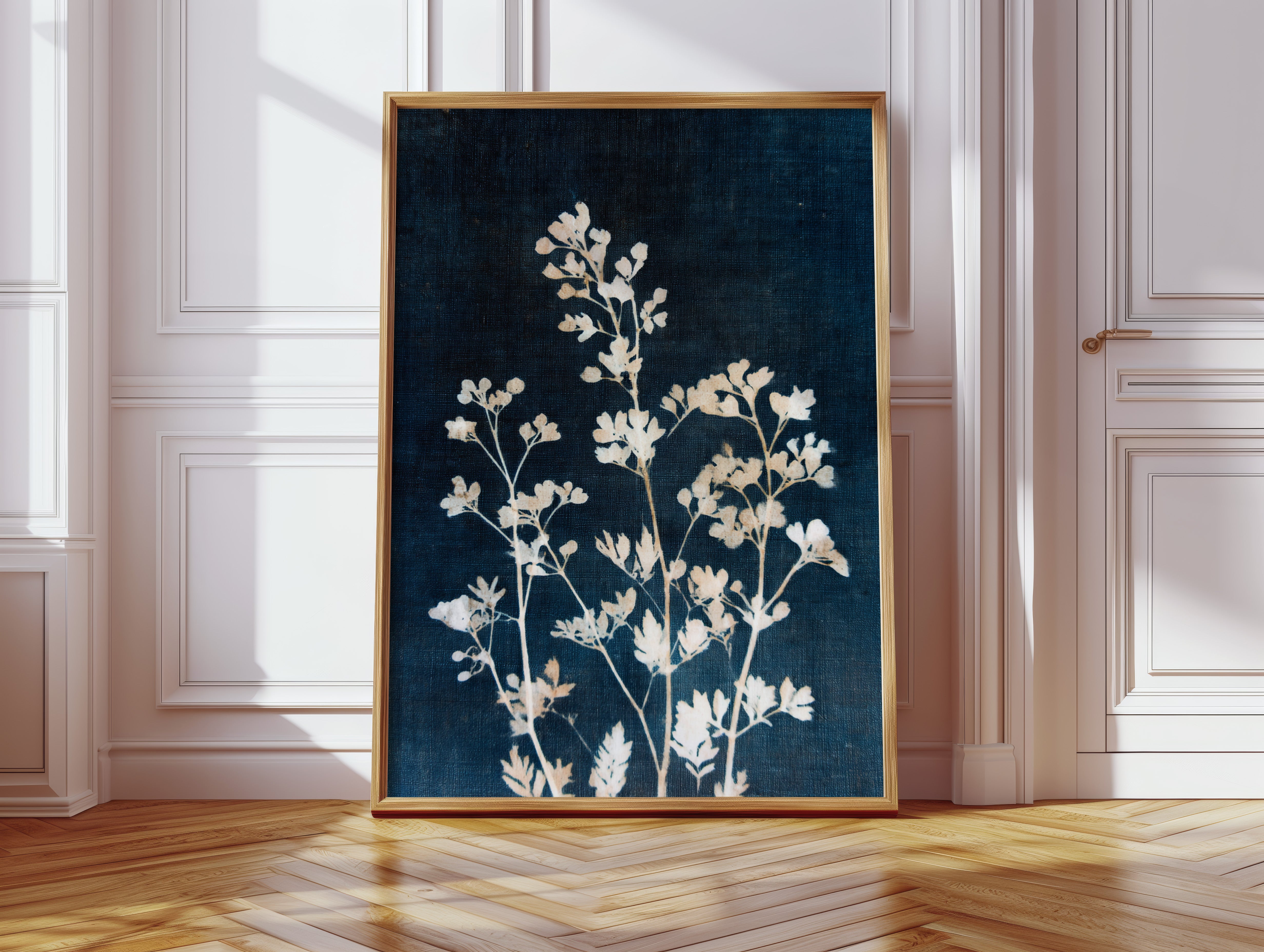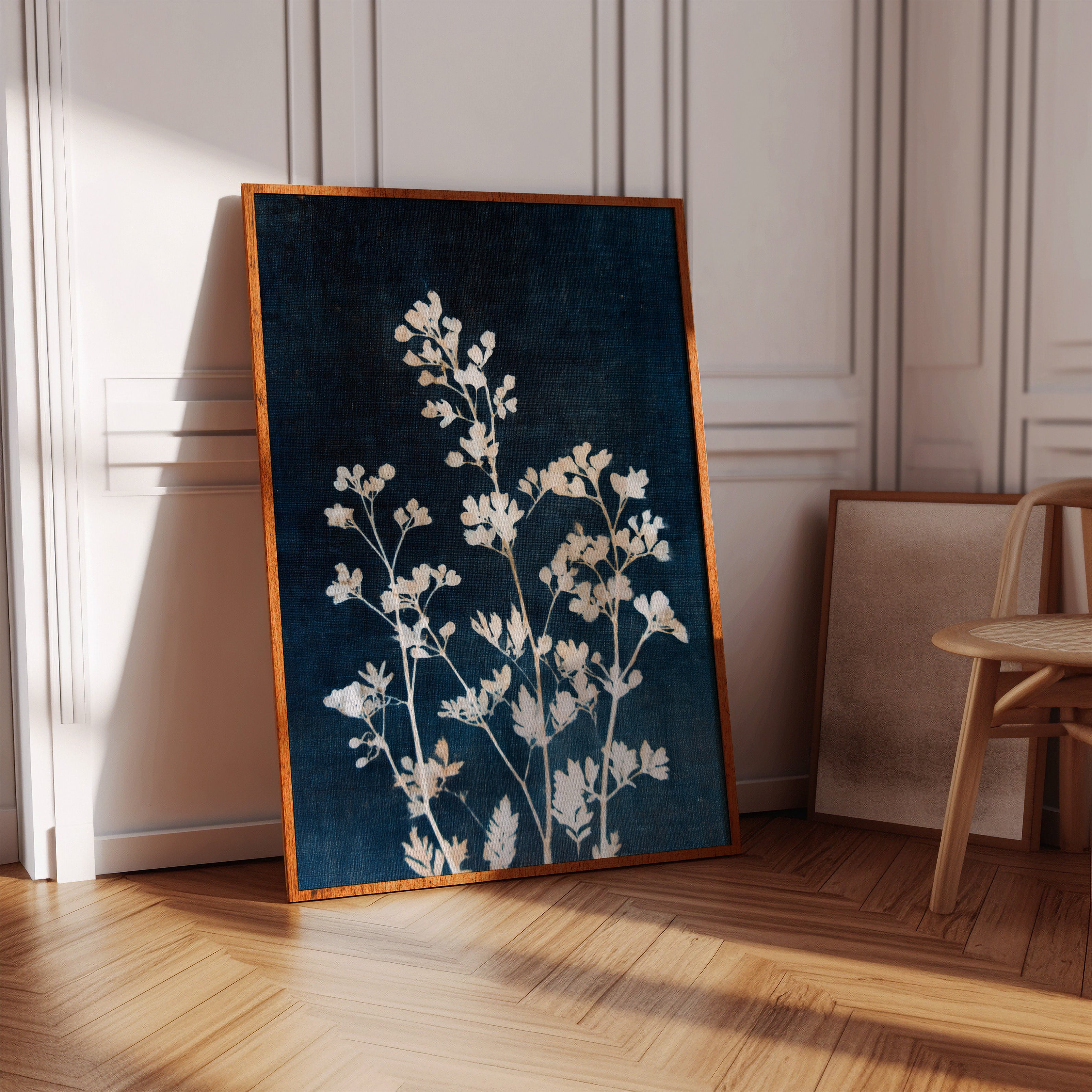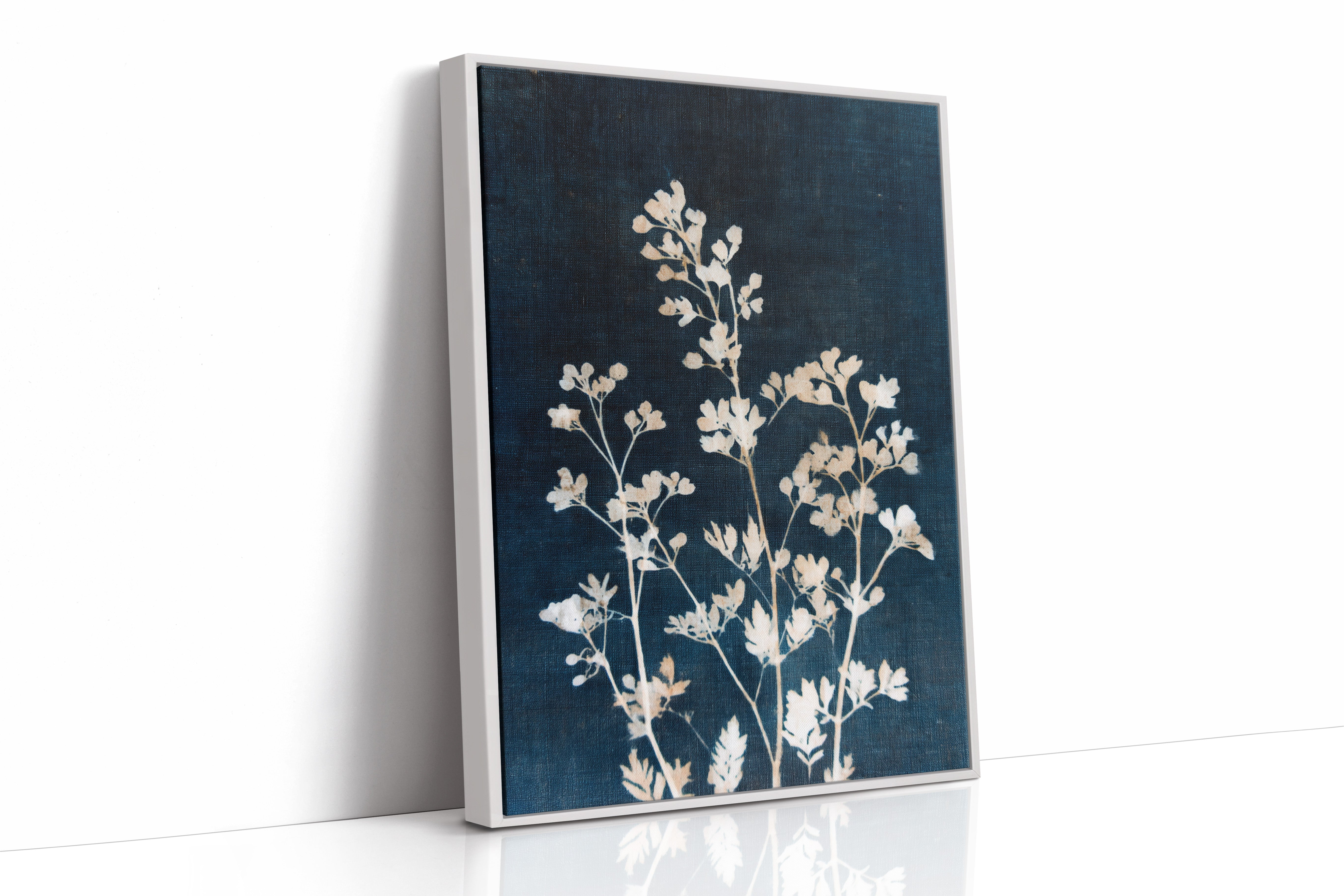 A delicate arrangement of leaves emerges like a memory, their frost-kissed edges glimmering against a deep indigo backdrop. This piece captures the essence of the artisanal, intertwining nature with the refined touch of craftsmanship. Each leaf tells a story, their intricate details and soft textures evoking a sense of tranquility and nostalgia, inviting the viewer to reflect on nature's quiet beauty. Perfect for a serene reading nook or a calming bedroom space, this piece breathes life into any corner it graces.