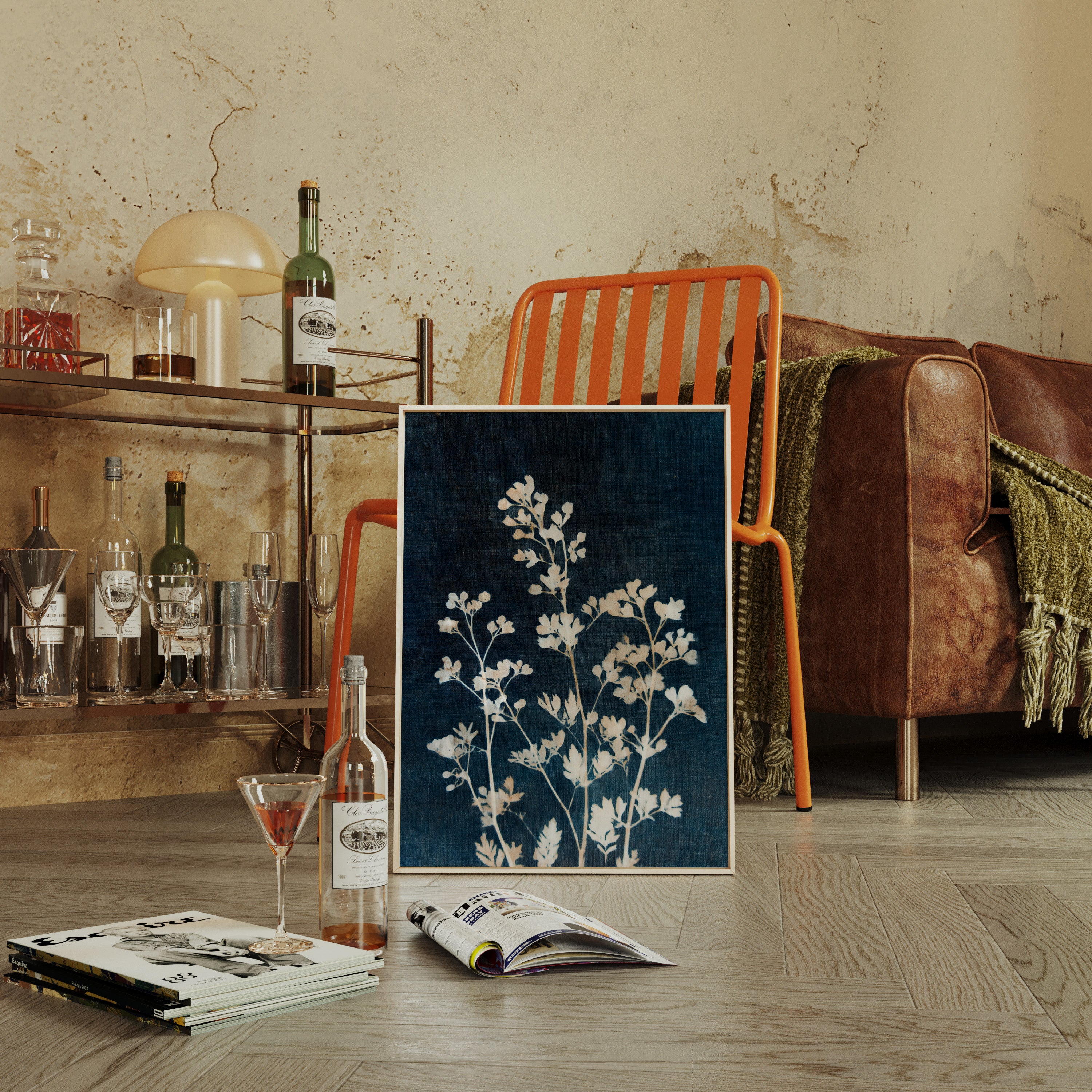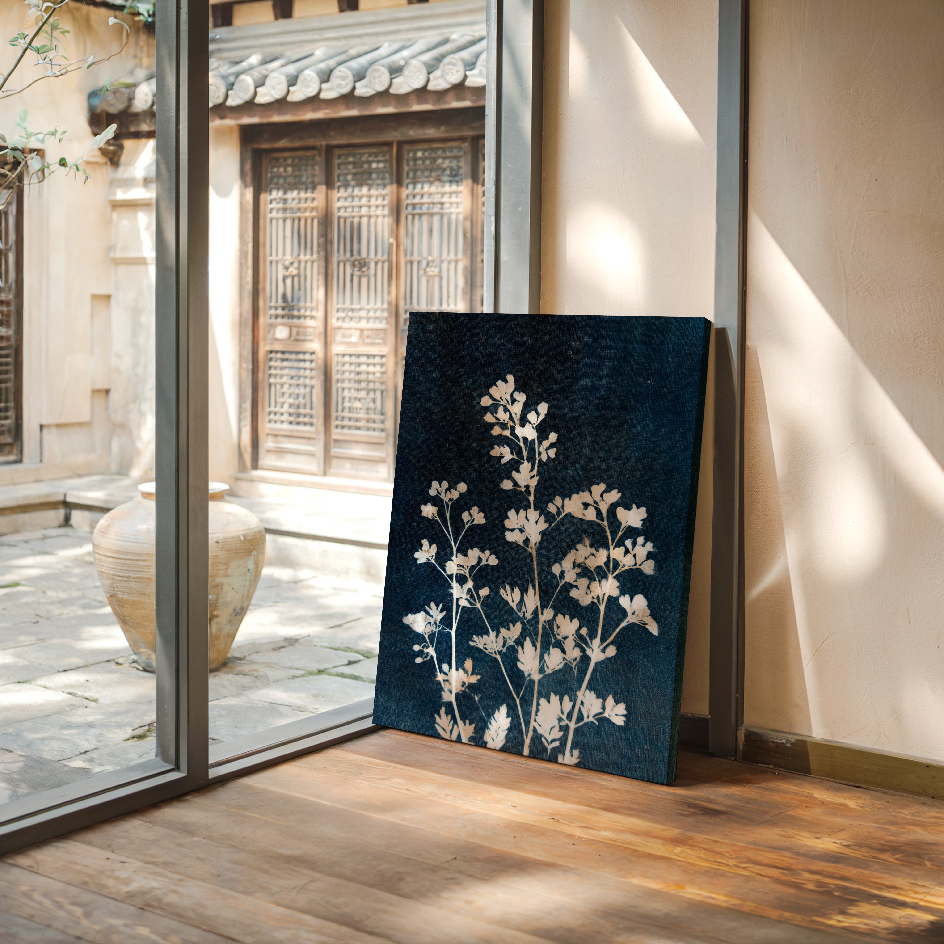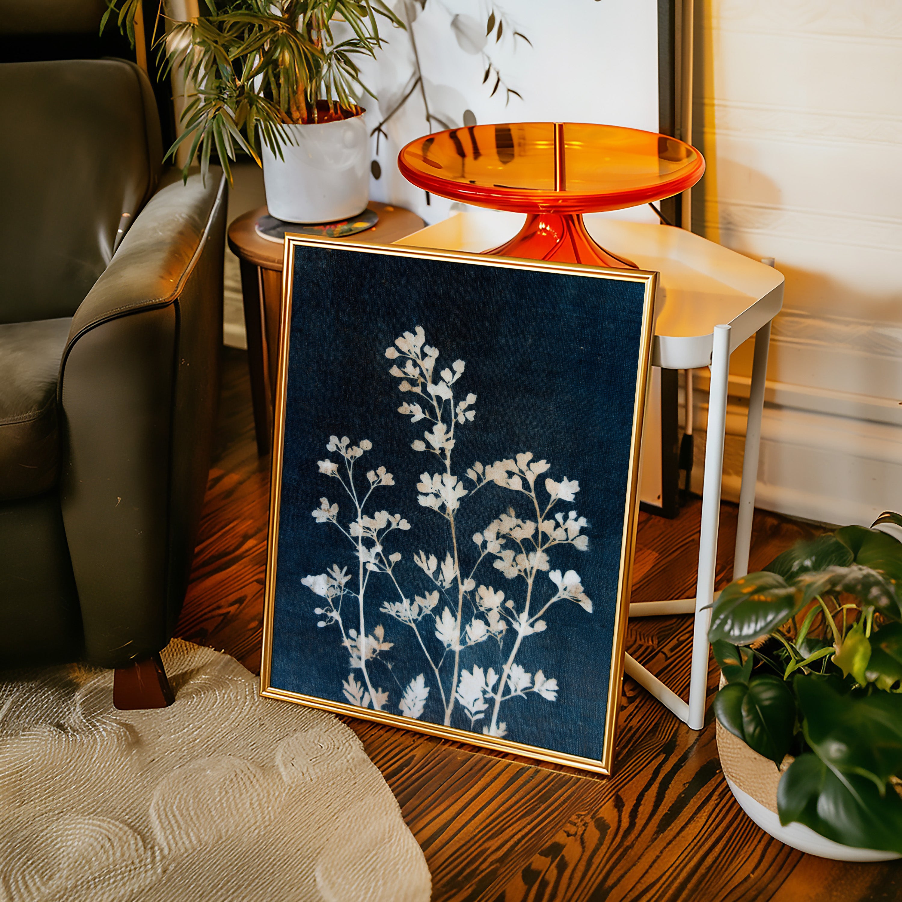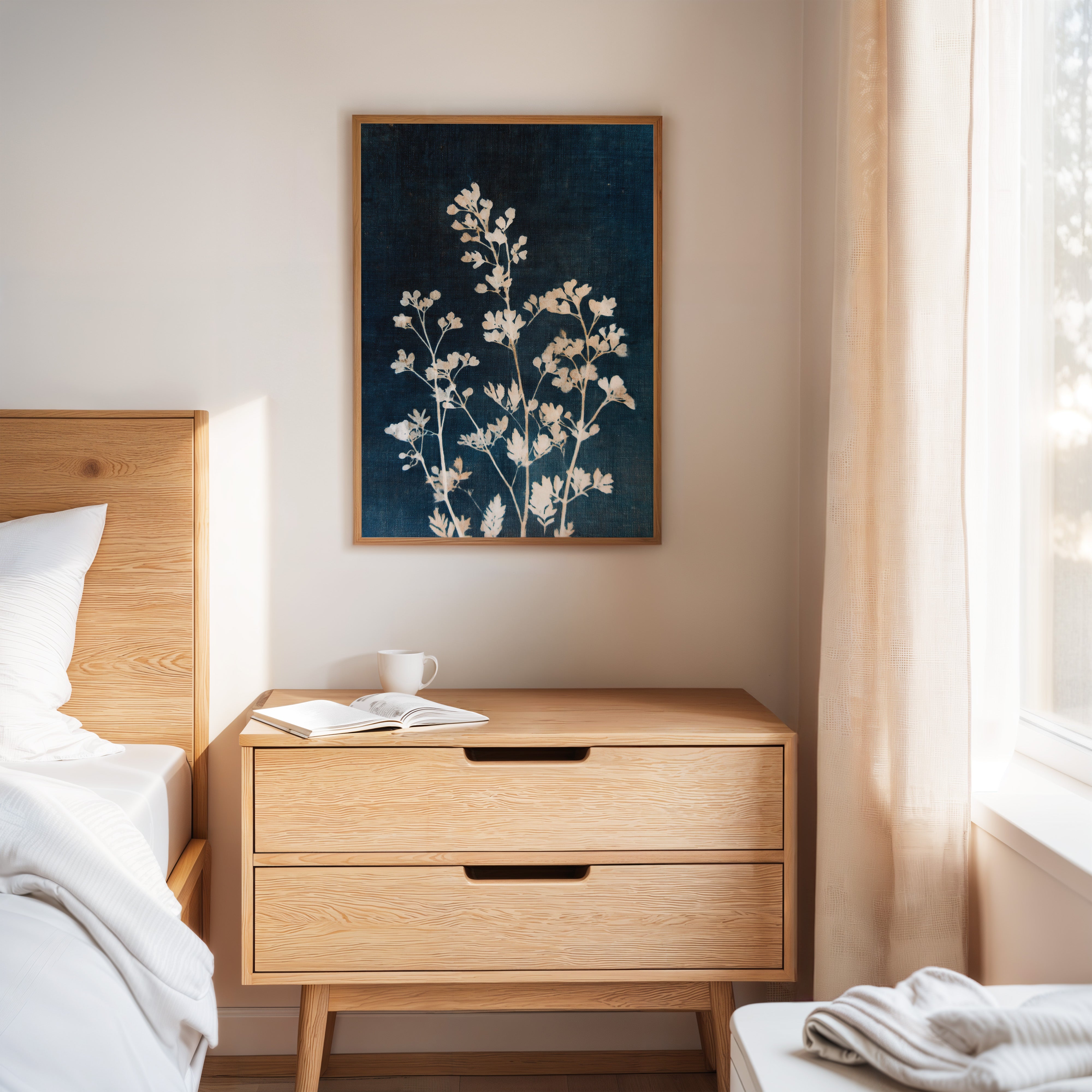 A delicate arrangement of leaves emerges like a memory, their frost-kissed edges glimmering against a deep indigo backdrop. This piece captures the essence of the artisanal, intertwining nature with the refined touch of craftsmanship. Each leaf tells a story, their intricate details and soft textures evoking a sense of tranquility and nostalgia, inviting the viewer to reflect on nature's quiet beauty. Perfect for a serene reading nook or a calming bedroom space, this piece breathes life into any corner it graces.