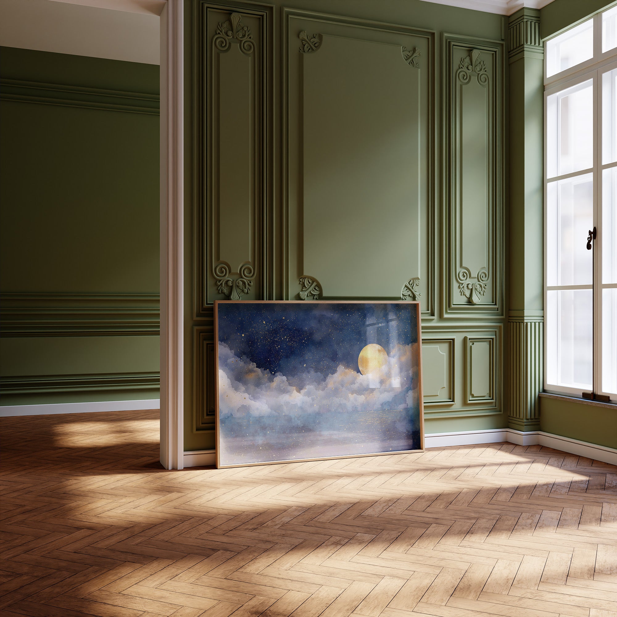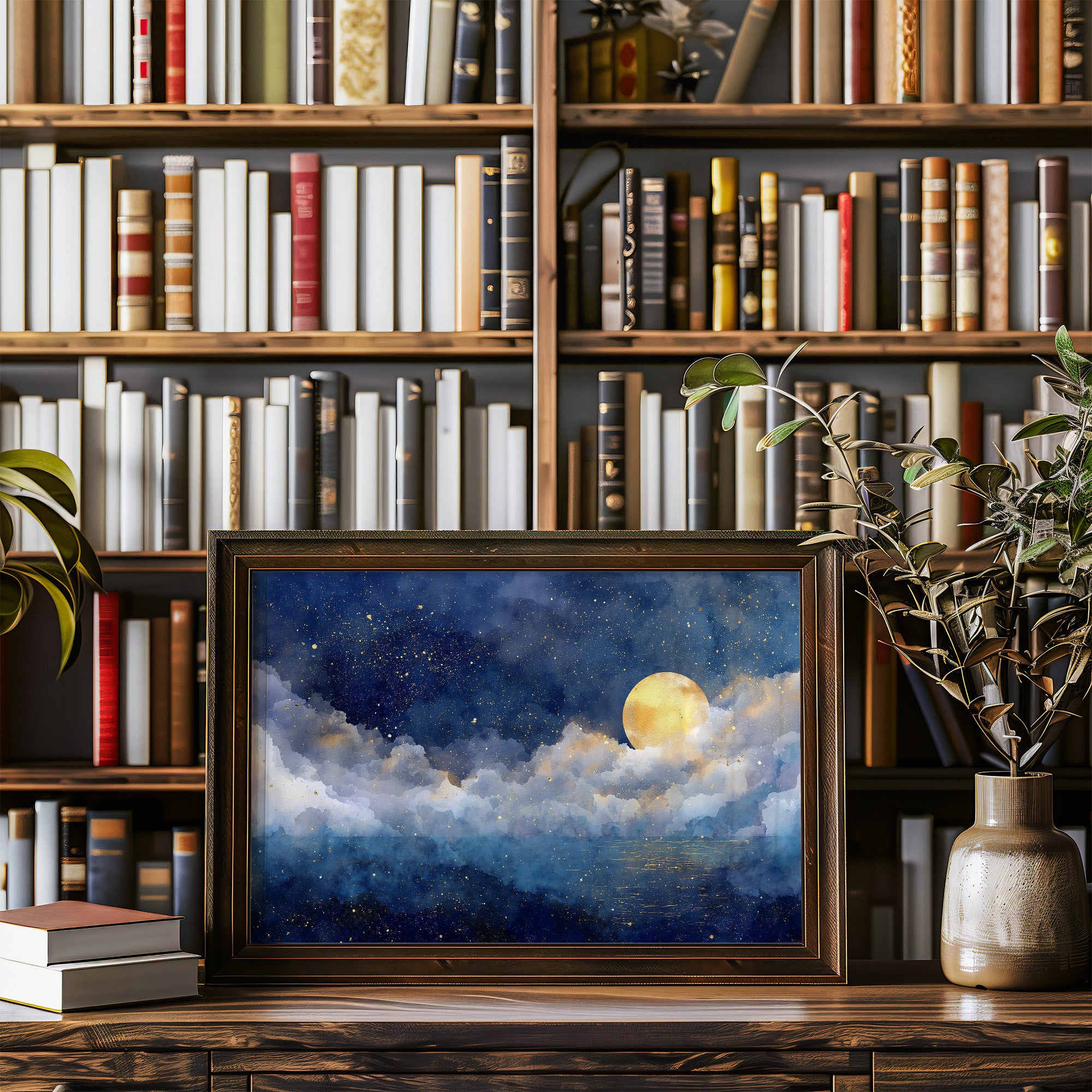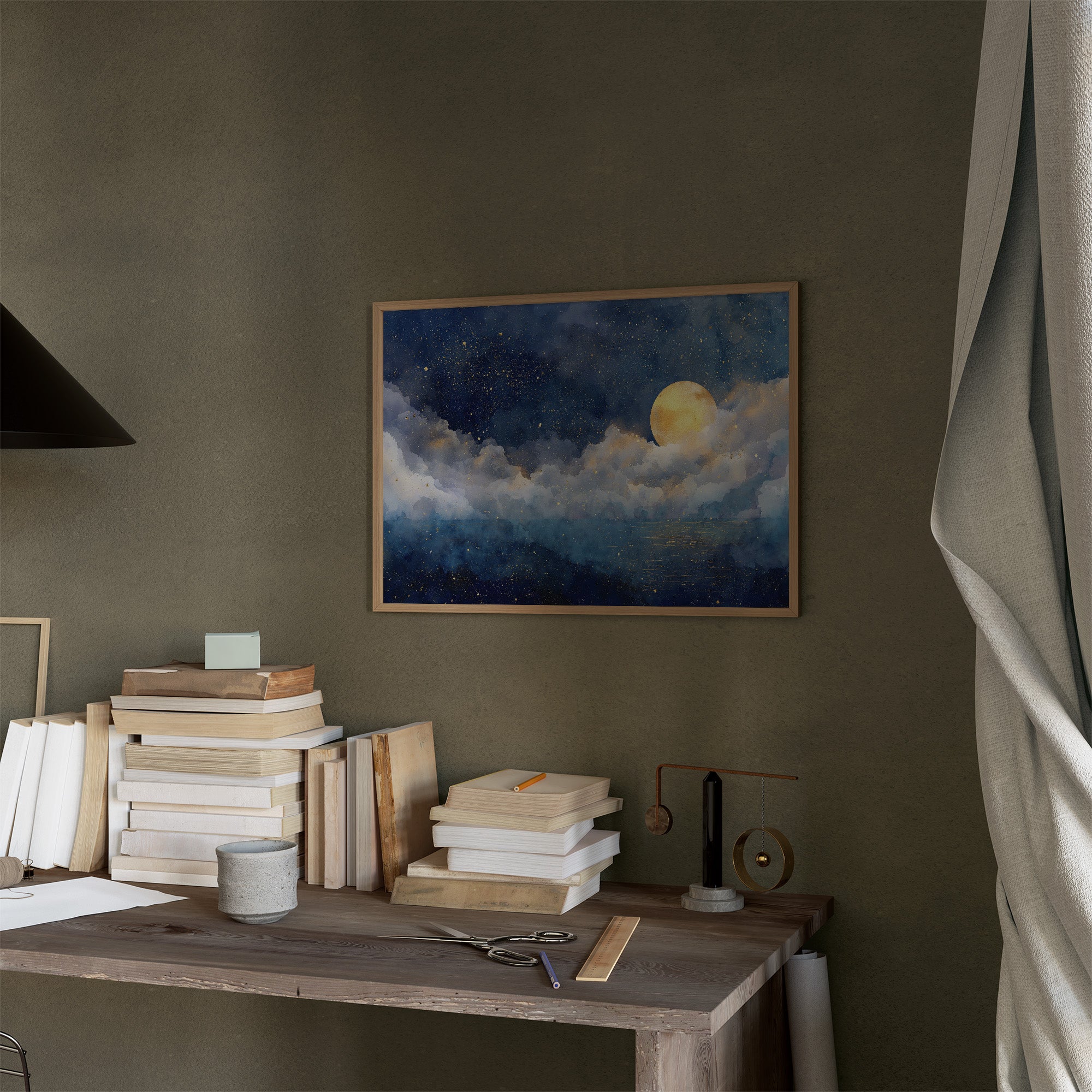 A golden moon hangs suspended in a deep indigo sky, casting its luminous reflection across distant waters. Billowing clouds drift beneath the celestial body, their edges gilded with moonlight while stars punctuate the vast expanse of night. This serene nocturnal seascape captures that perfect moment when the world feels both infinite and intimate, where cosmic wonder meets earthly tranquility. Perfect for a reading nook, home library, or bedroom space where its calming presence invites contemplation and peaceful dreams.