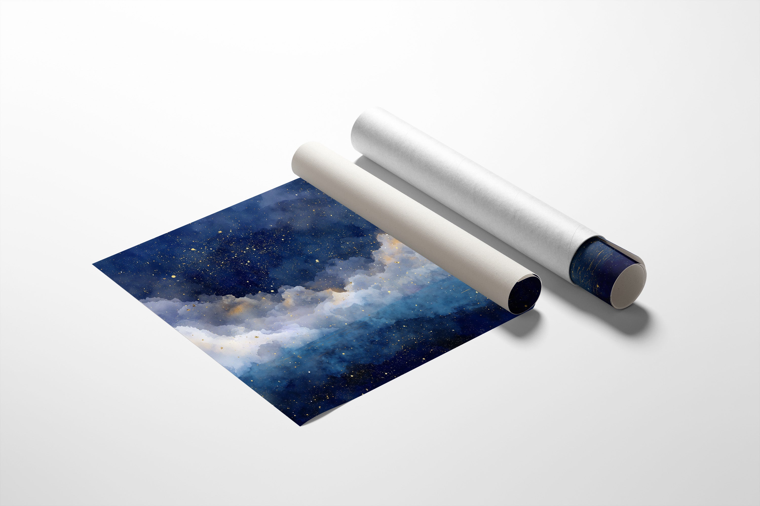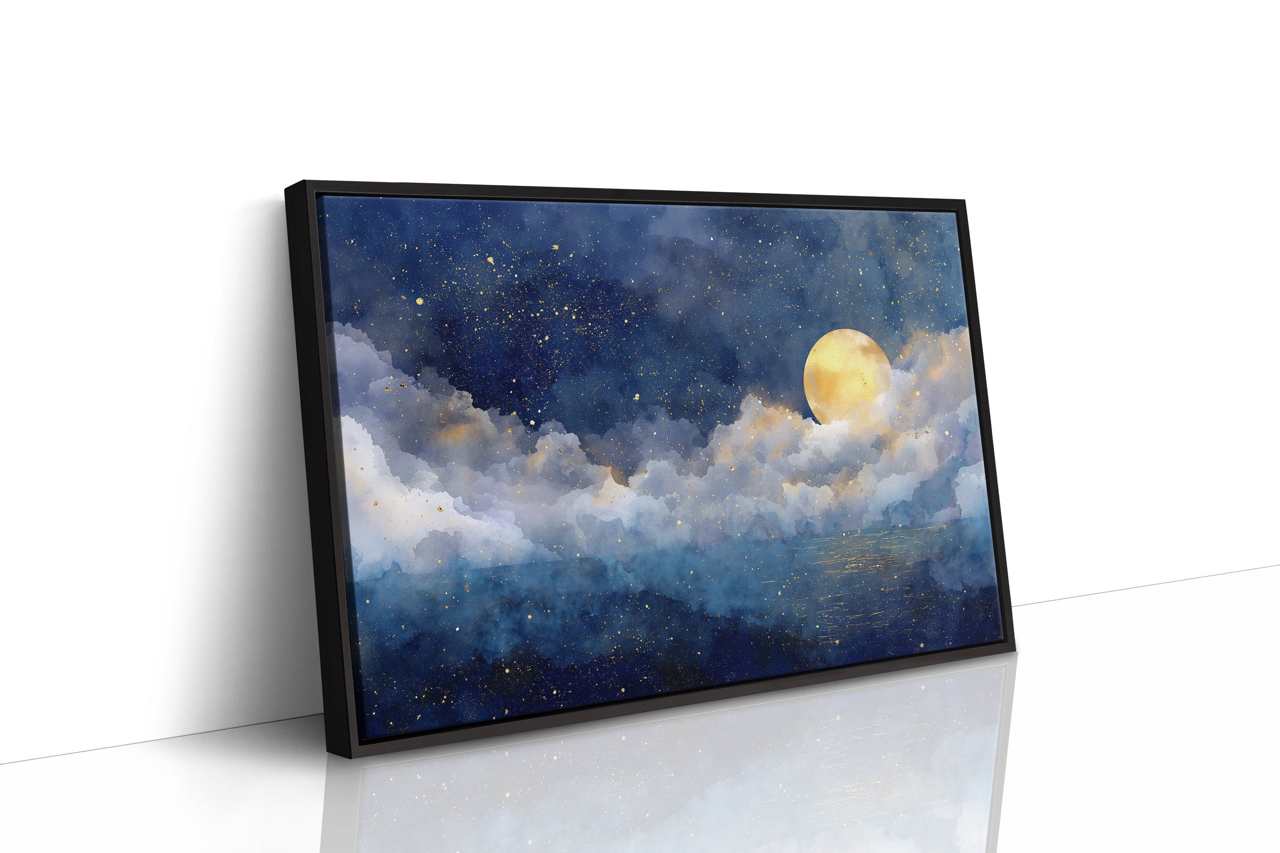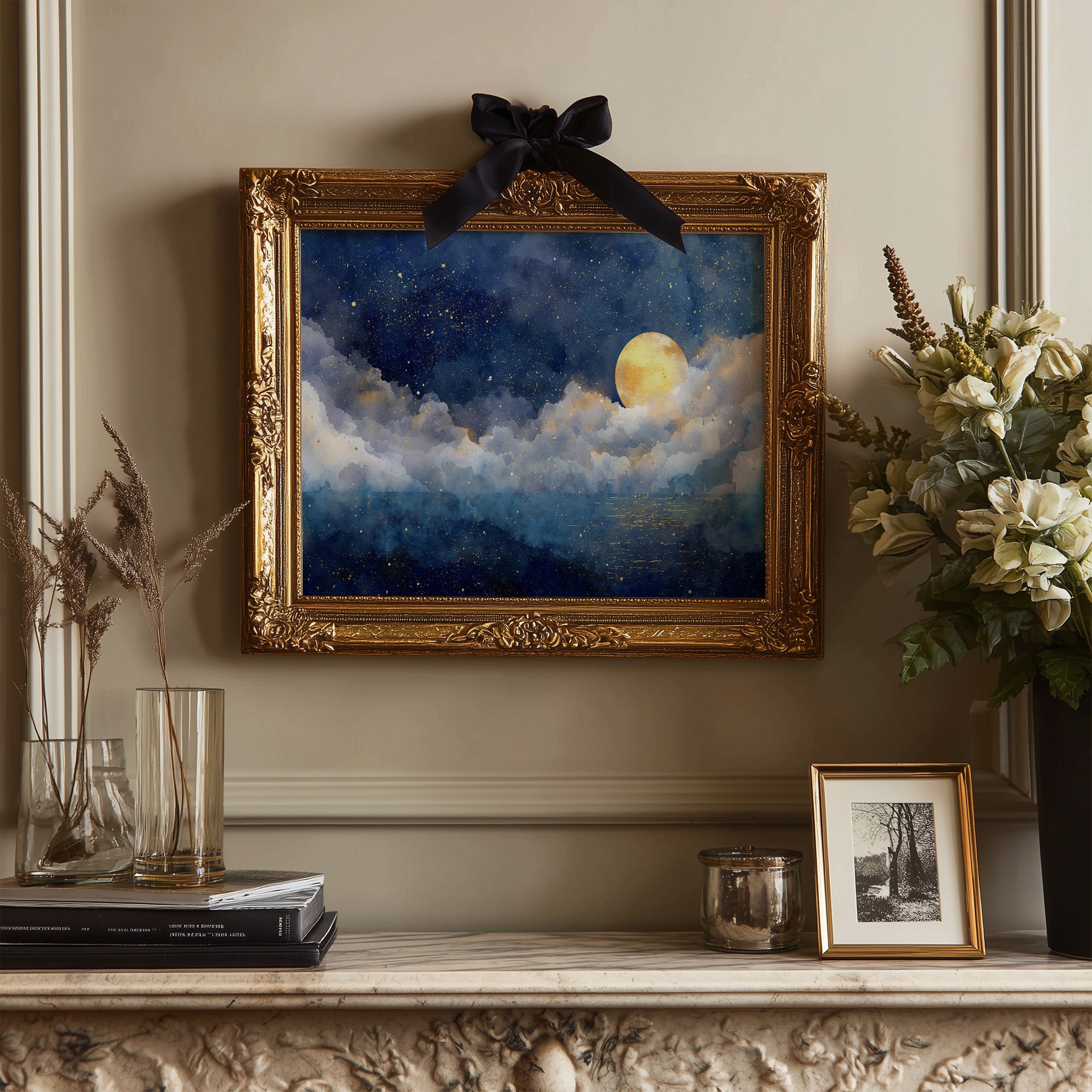 A golden moon hangs suspended in a deep indigo sky, casting its luminous reflection across distant waters. Billowing clouds drift beneath the celestial body, their edges gilded with moonlight while stars punctuate the vast expanse of night. This serene nocturnal seascape captures that perfect moment when the world feels both infinite and intimate, where cosmic wonder meets earthly tranquility. Perfect for a reading nook, home library, or bedroom space where its calming presence invites contemplation and peaceful dreams.
