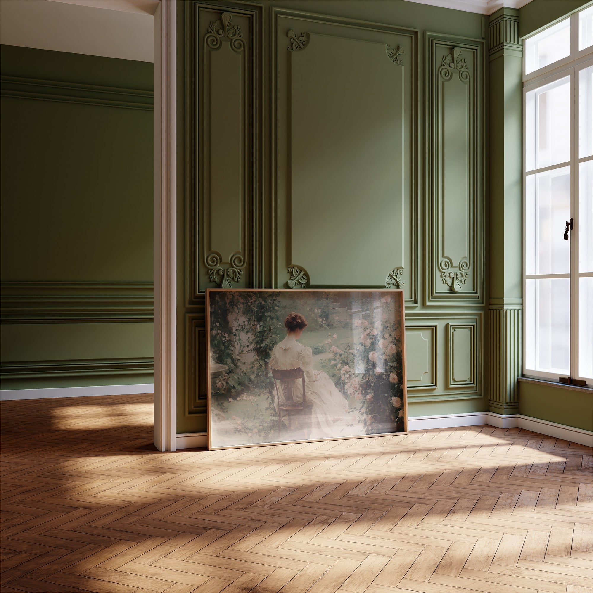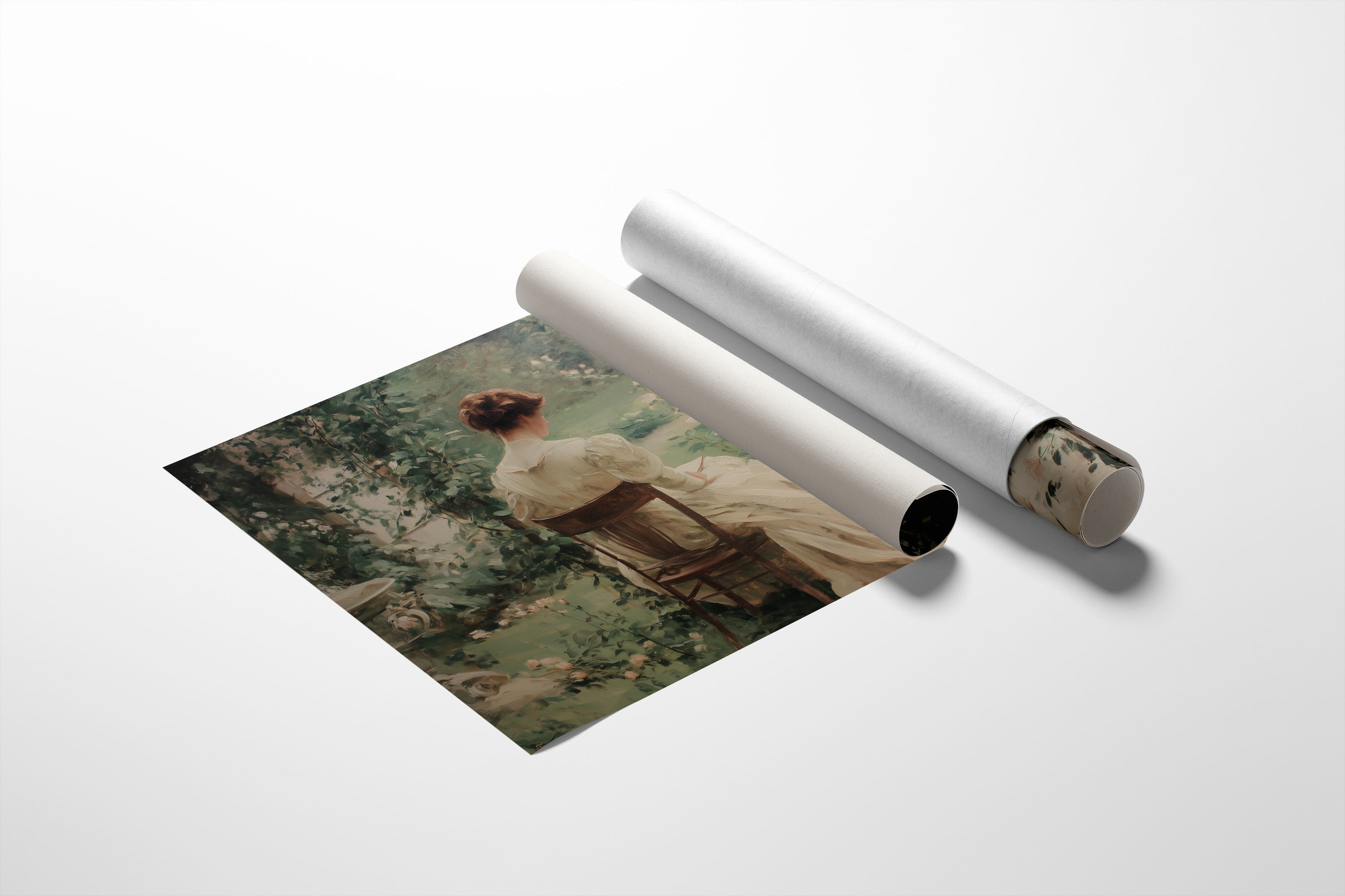 A moment suspended in time, where classic literature meets romantic artistry. The vintage painting of a woman seated in a rose garden rests elegantly against wooden bookshelves filled with volumes in various bindings and colors. The soft palette of the artworkcream dress against verdant foliage and blush rosescreates a striking contrast with the rich wood tones and leather-bound books behind it. This thoughtful arrangement brings together the parallel escapes of reading and visual storytelling.