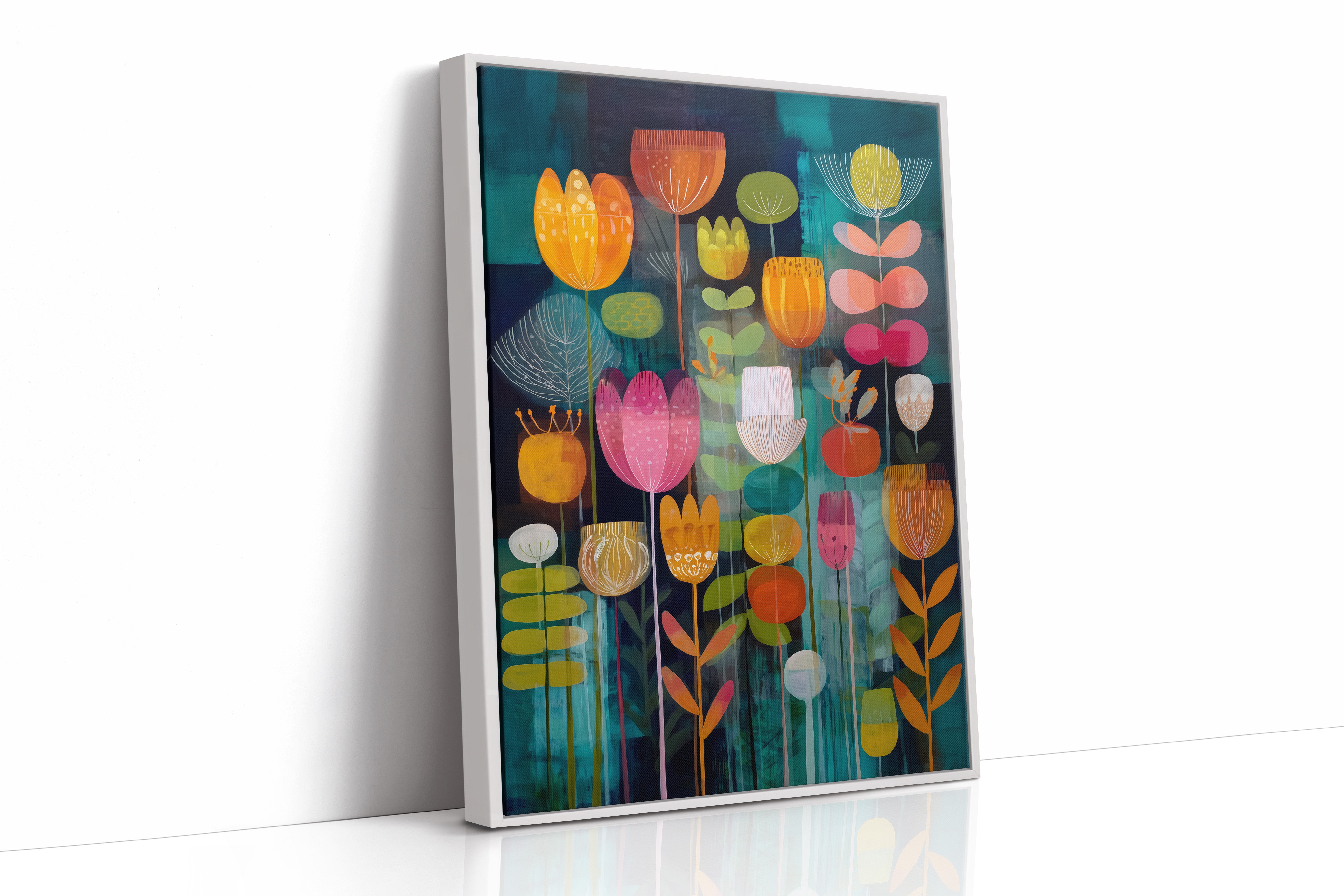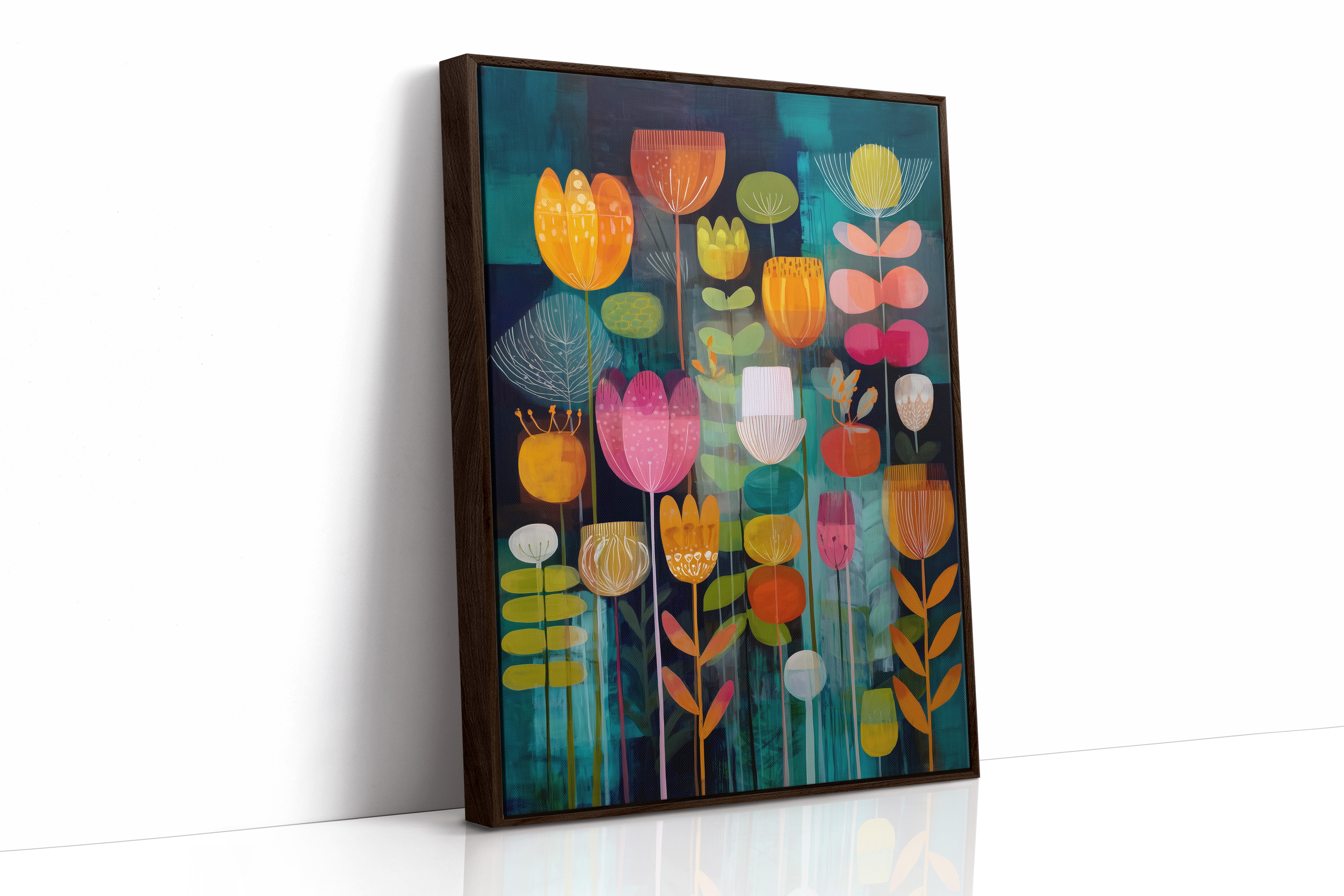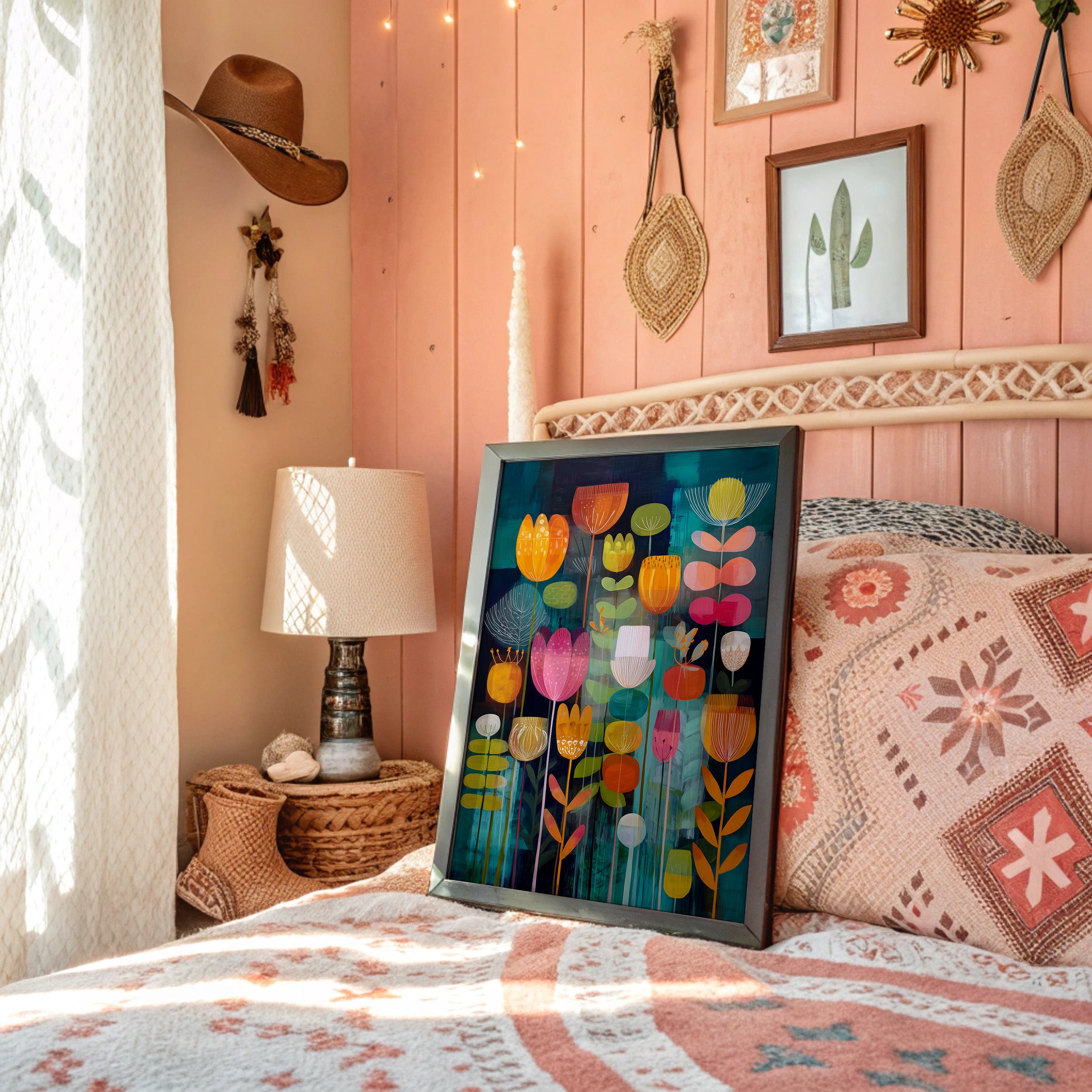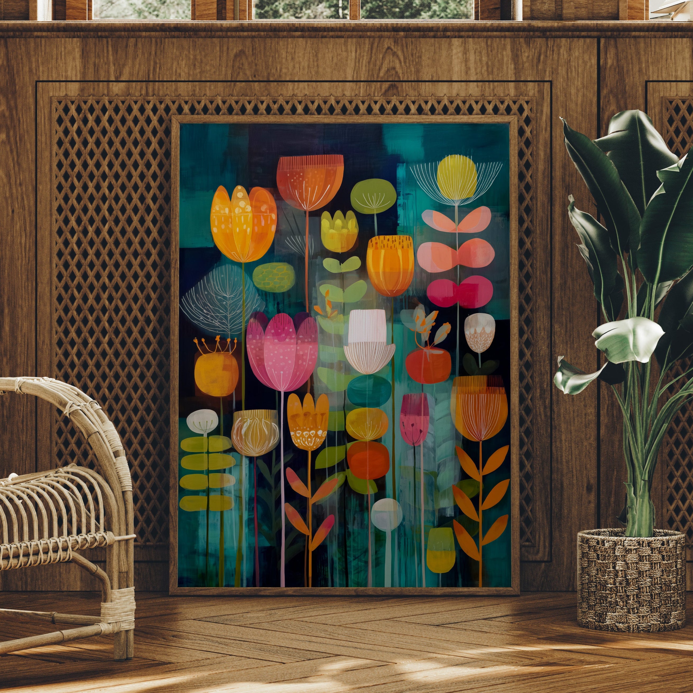 A vibrant botanical symphony emerges against a deep turquoise backdrop, where modern tulips and abstract blooms dance in a midnight garden. Bold coral, yellow, and pink petals stretch upward like nature's lanterns, their stems creating rhythmic lines that guide the eye through this contemporary floral landscape. This piece marries mid-century modern design with folk art whimsy, creating a statement that feels both timeless and fresh. Perfect for bringing bold artistic energy to modern rustic spaces or adding a pop of color to minimal contemporary rooms.
