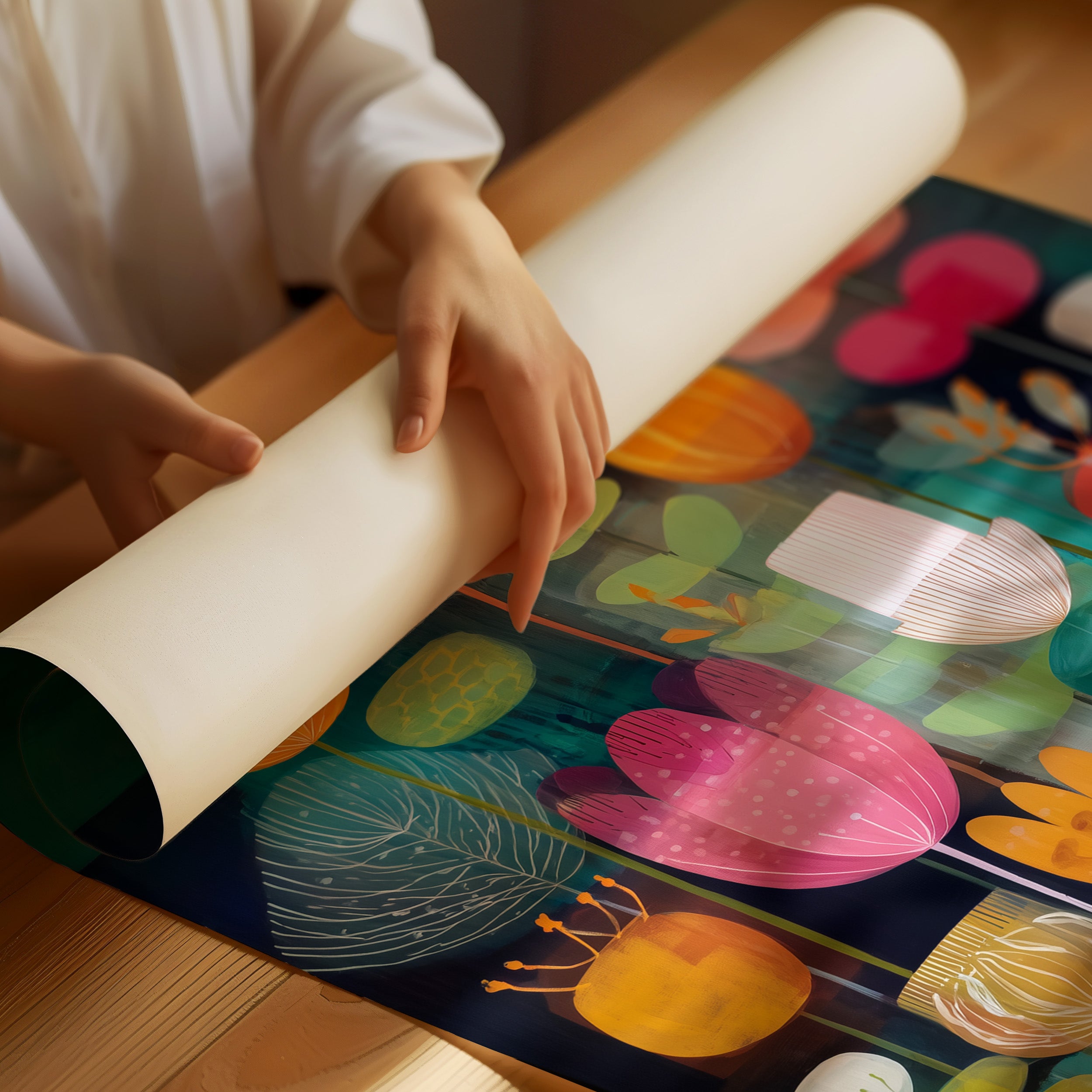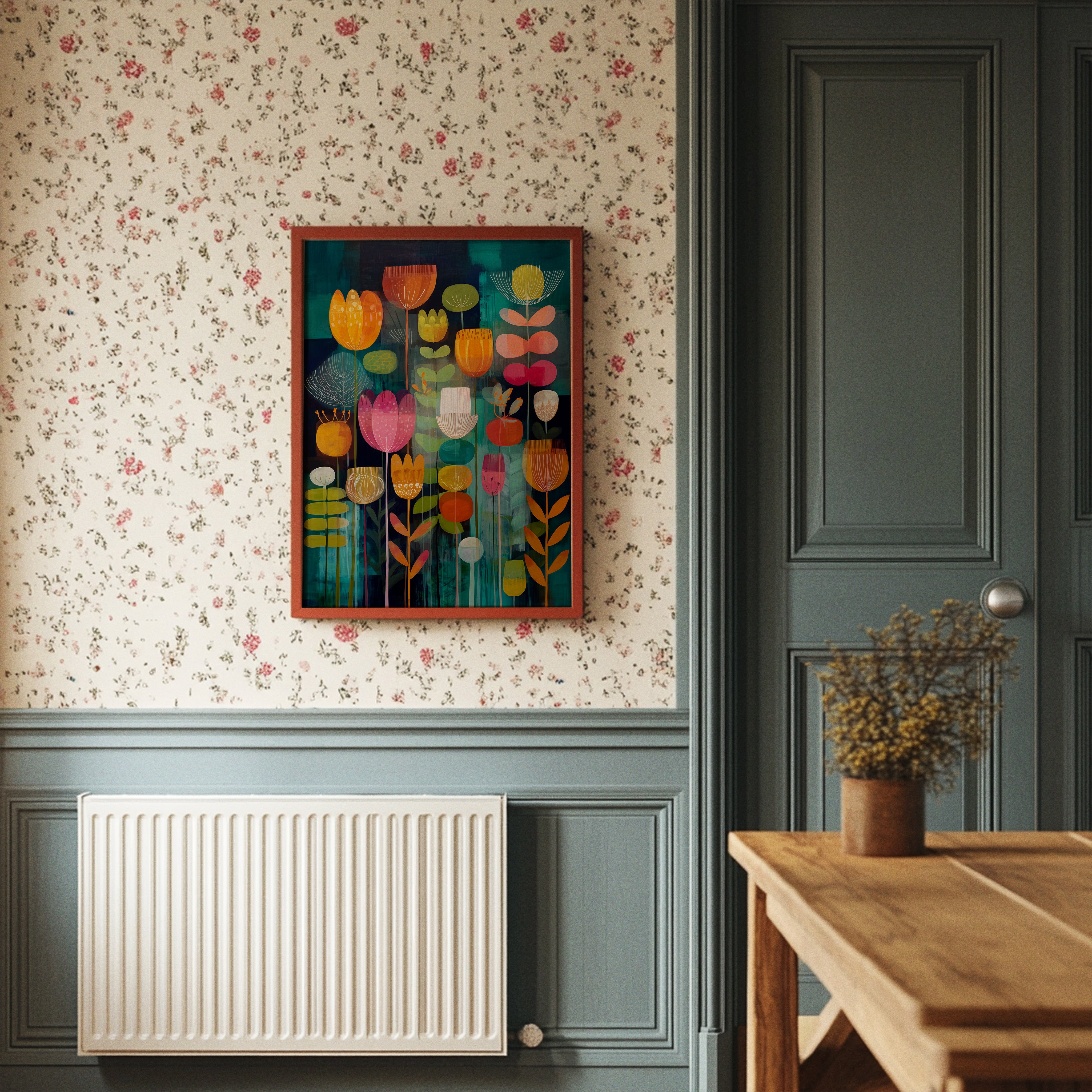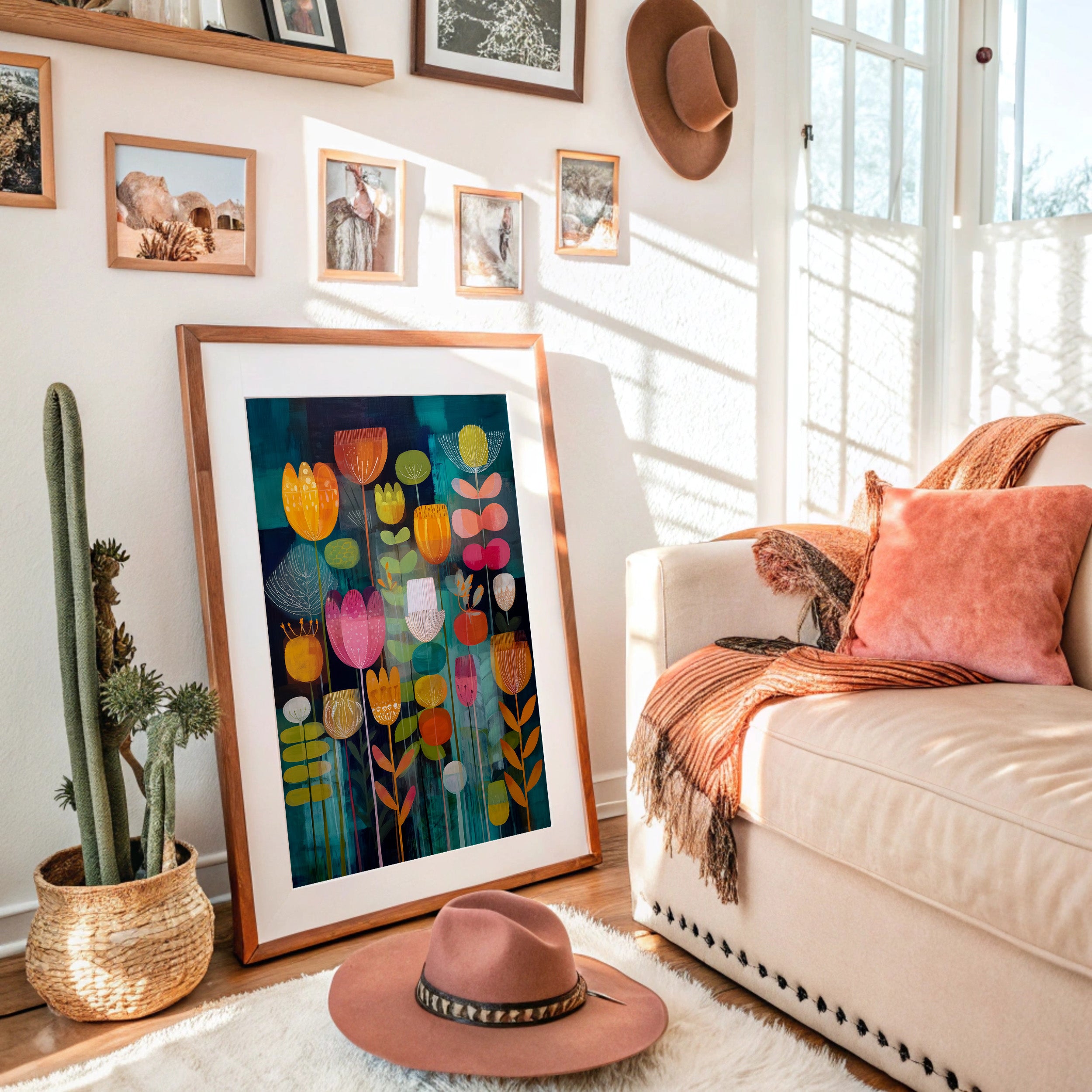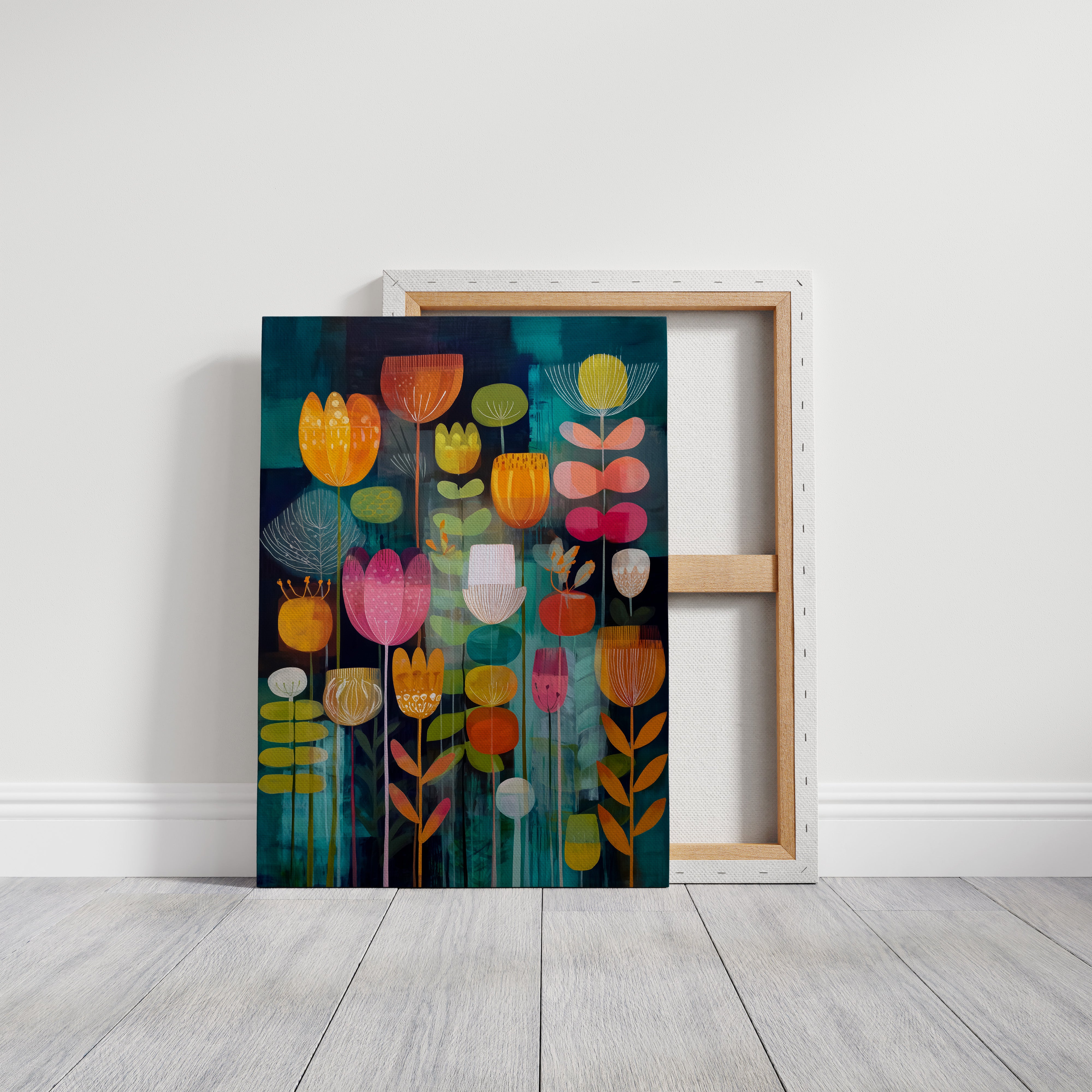 A vibrant botanical symphony emerges against a deep turquoise backdrop, where modern tulips and abstract blooms dance in a midnight garden. Bold coral, yellow, and pink petals stretch upward like nature's lanterns, their stems creating rhythmic lines that guide the eye through this contemporary floral landscape. This piece marries mid-century modern design with folk art whimsy, creating a statement that feels both timeless and fresh. Perfect for bringing bold artistic energy to modern rustic spaces or adding a pop of color to minimal contemporary rooms.
