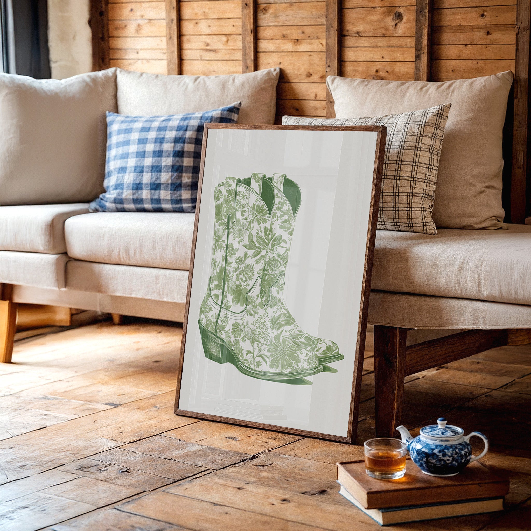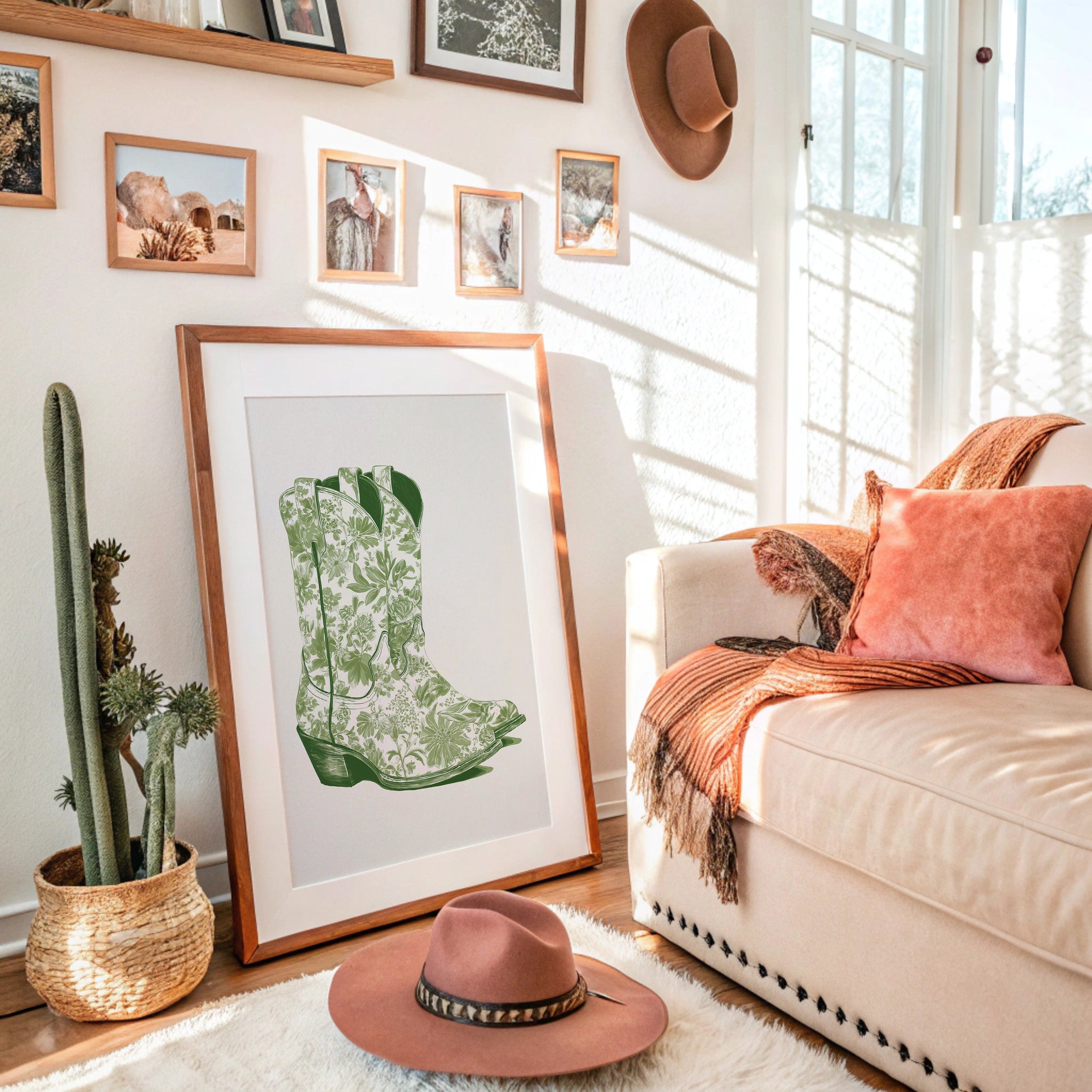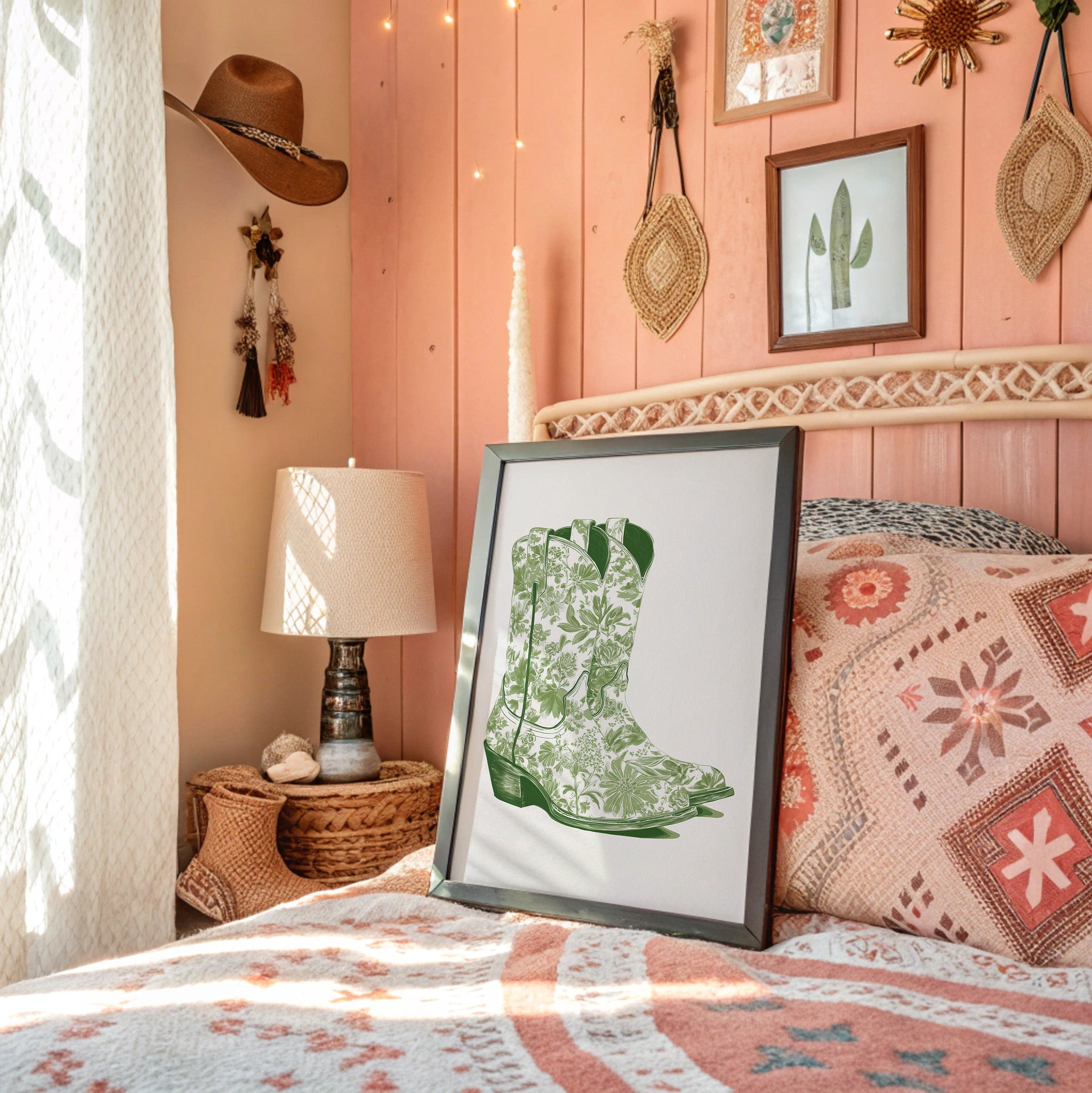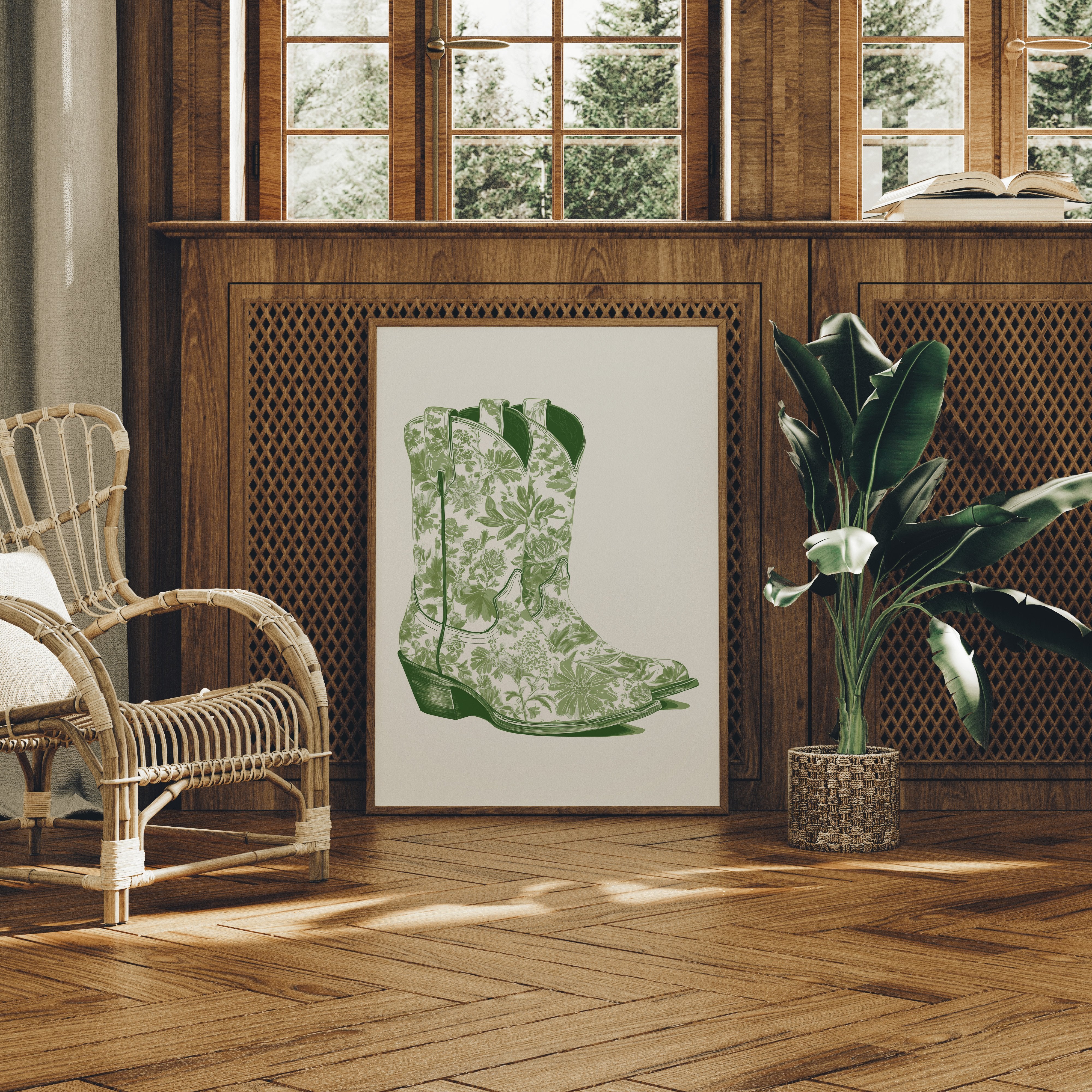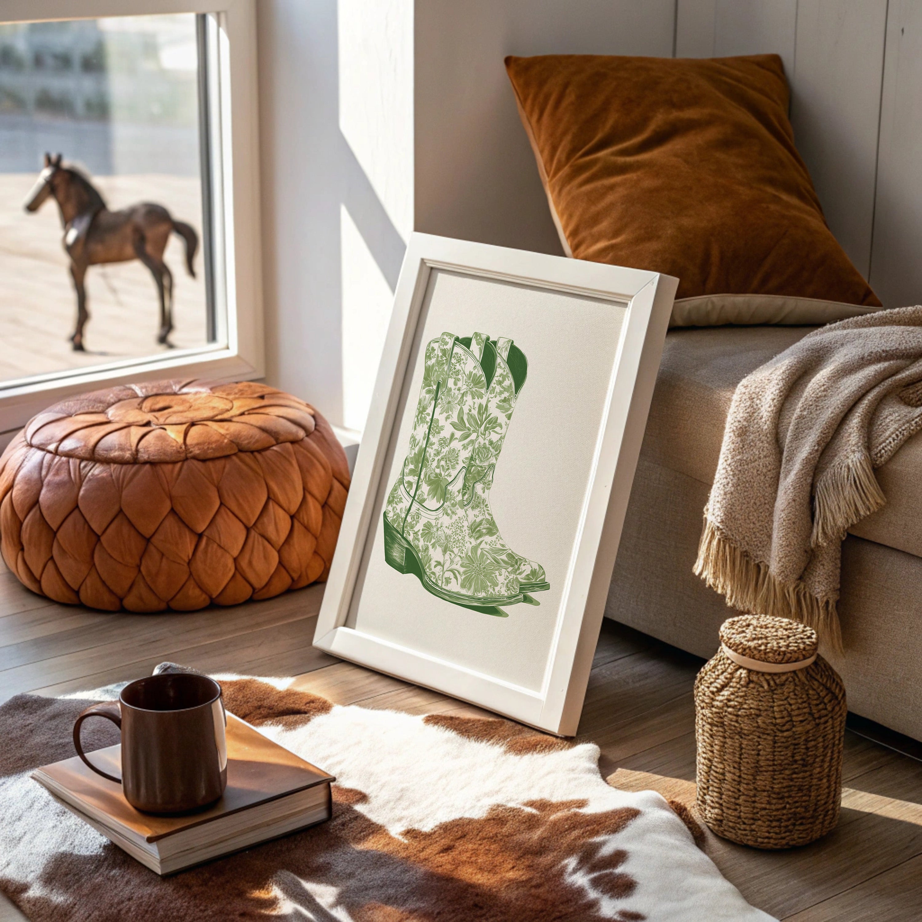 Delicate sage blooms dance across weathered leather, telling tales of meadows and morning dew. This piece from our Contemporary collection reimagines classic Western style through a botanical lens. The intricate floral pattern weaves through the iconic cowboy boot silhouette, creating a harmonious blend of rugged and refined – where wildflowers meet worn leather and pastoral charm meets modern design. Perfect for adding a touch of sophisticated whimsy to a modern farmhouse bedroom or bringing unexpected elegance to a rustic living space. Each petal and vine seems to carry memories of sun-drenched prairie walks and garden gatherings.