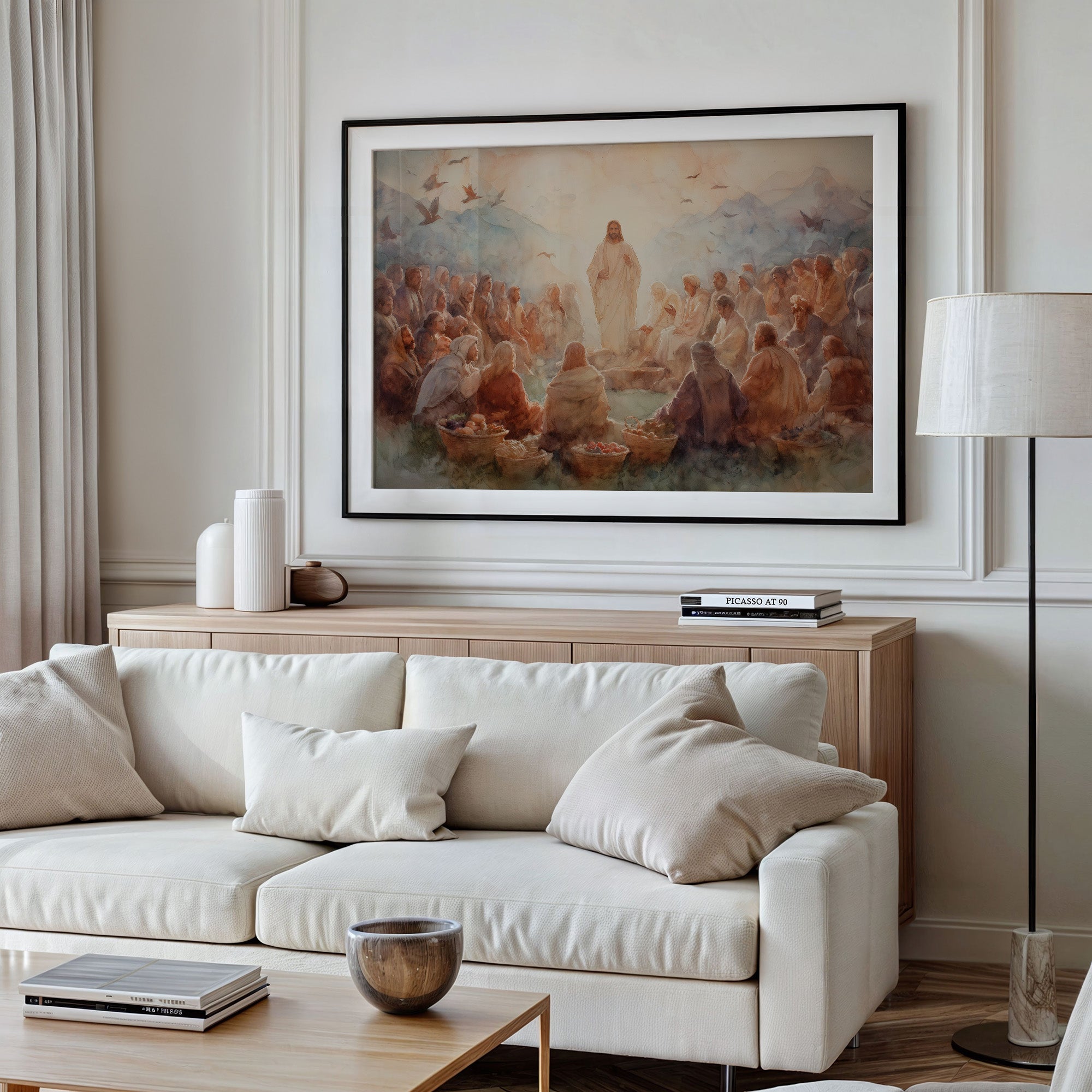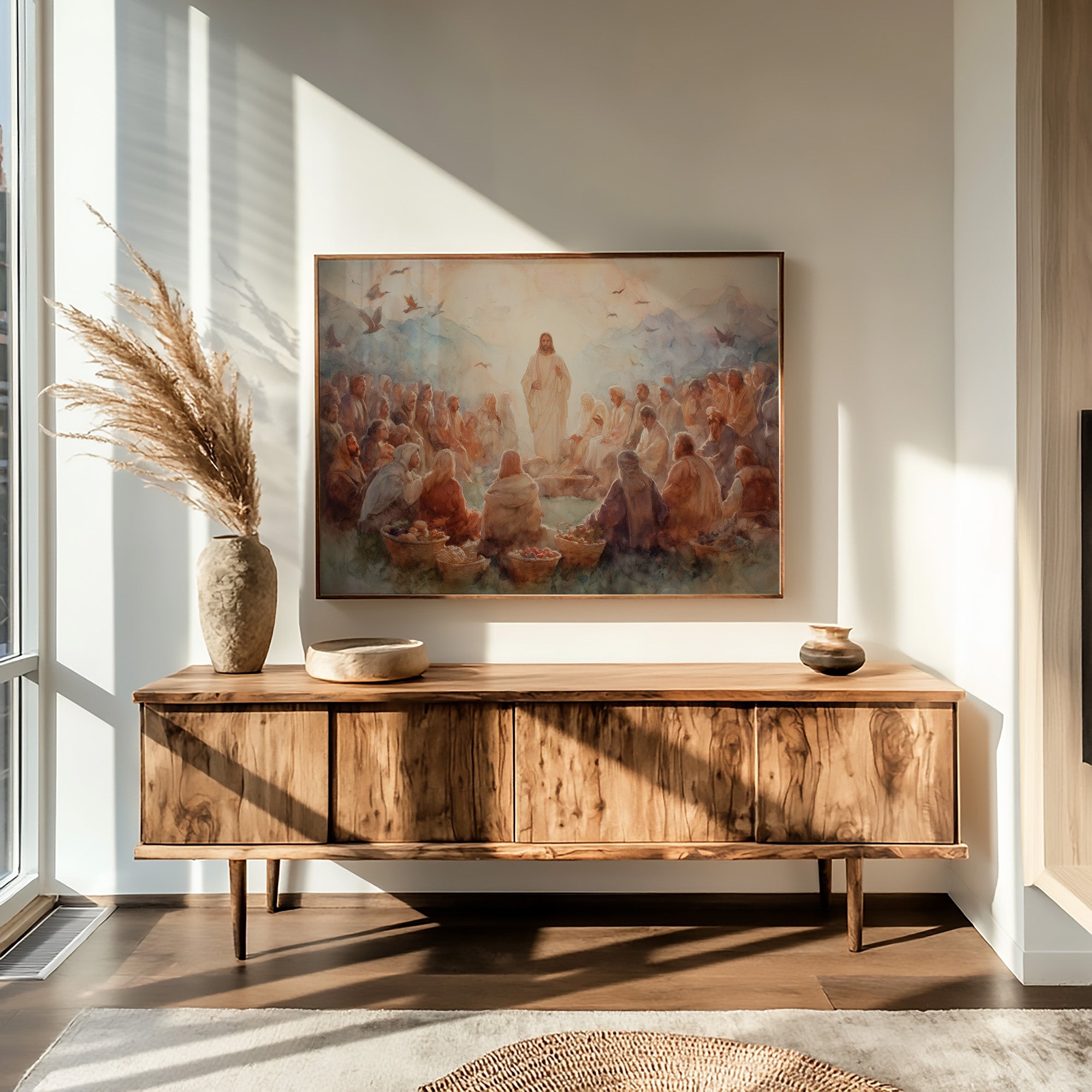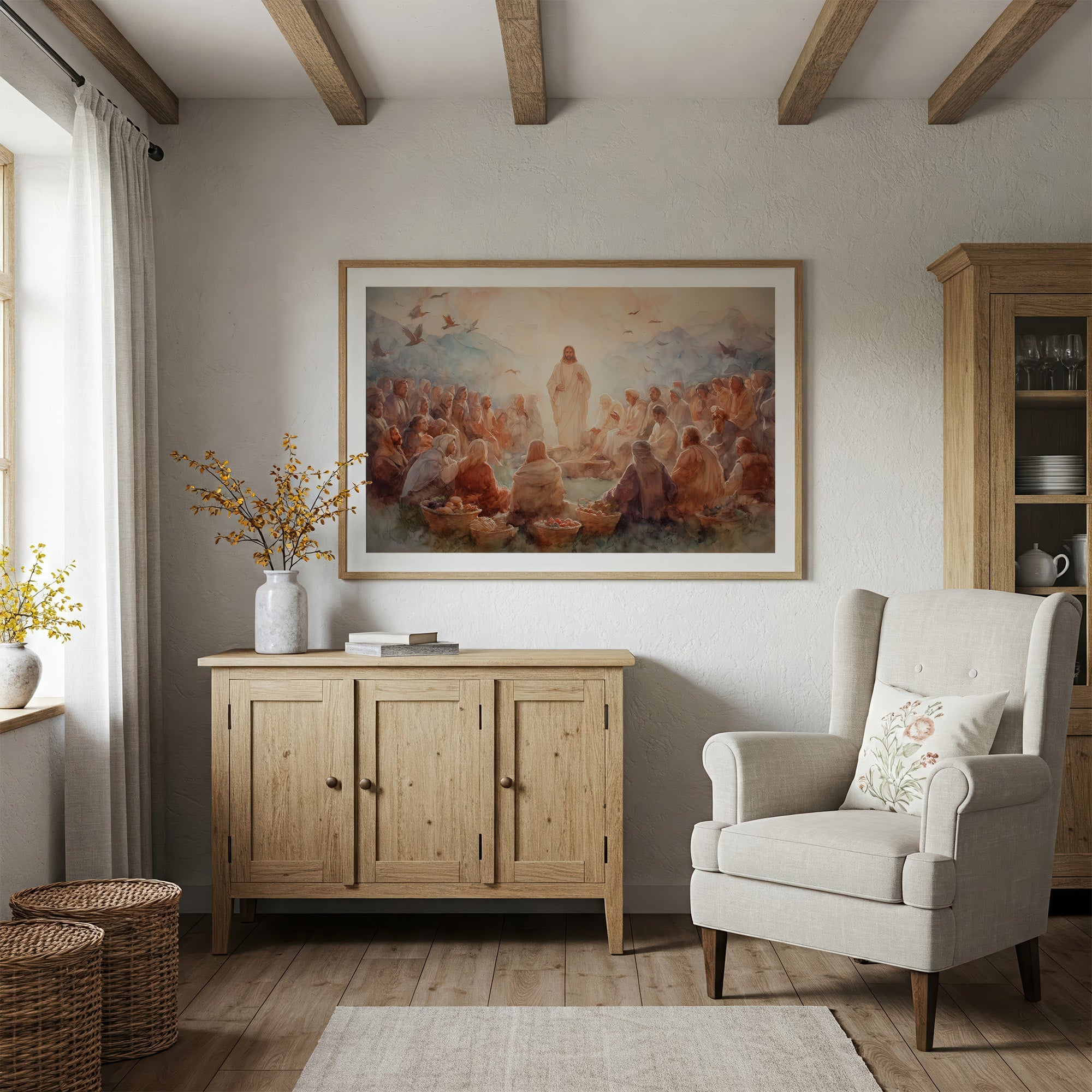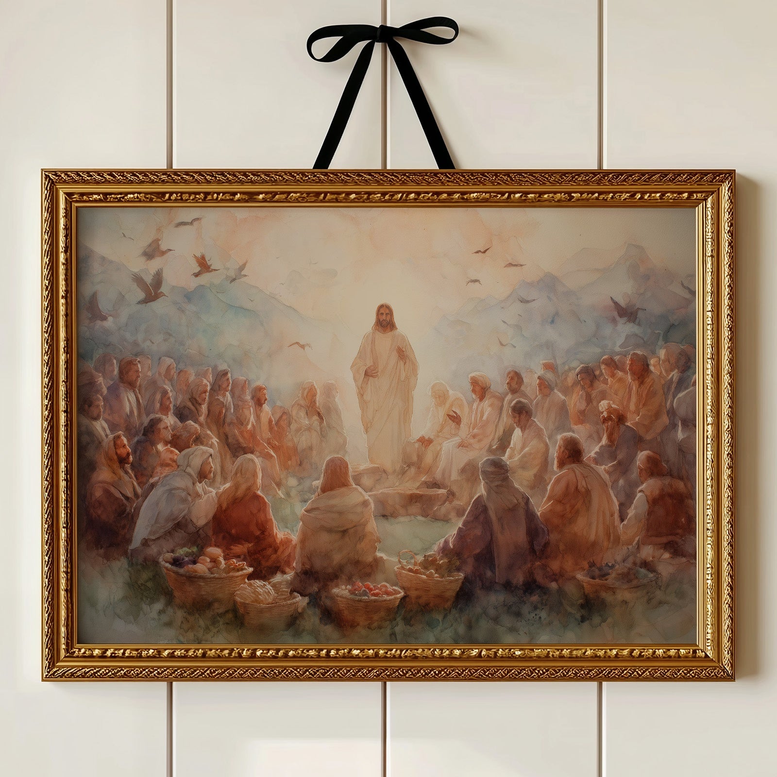 A serene moment captured in warm, diffused hues where figures gather around a central luminous presence. The painting blends ethereal light with earthy tones, creating a spiritual atmosphere where humanity connects in reverent attention. Birds soar overhead against misty mountains, while baskets of offerings rest among the seated assembly, all rendered in gentle watercolor-like strokes that blur the boundary between the physical and metaphysical realms. This contemplative piece brings a sense of peace and transcendence to a reading nook, home office, or meditation space.