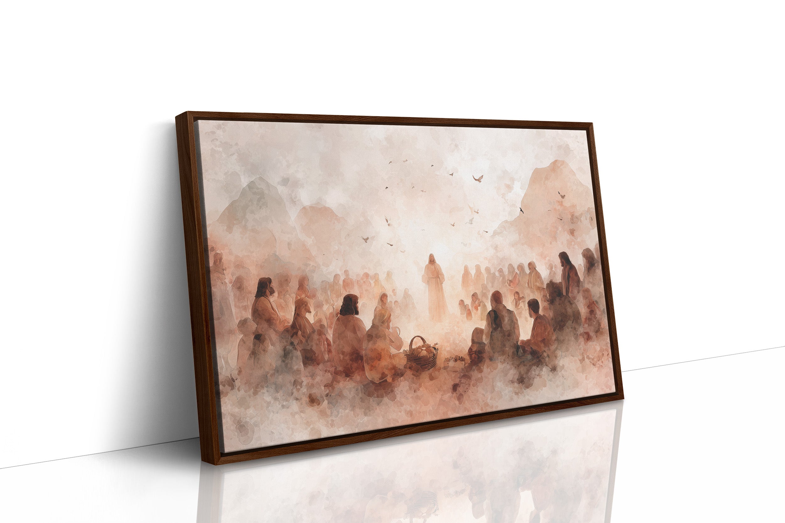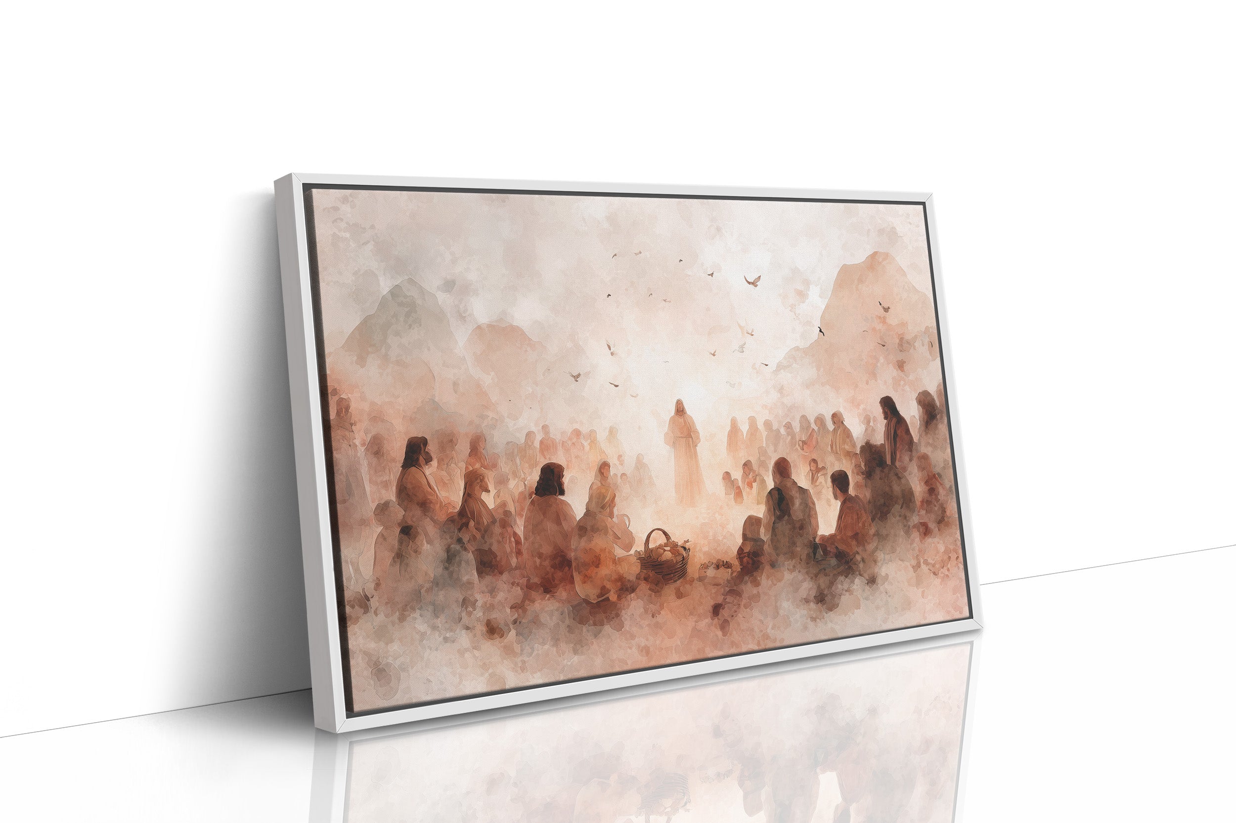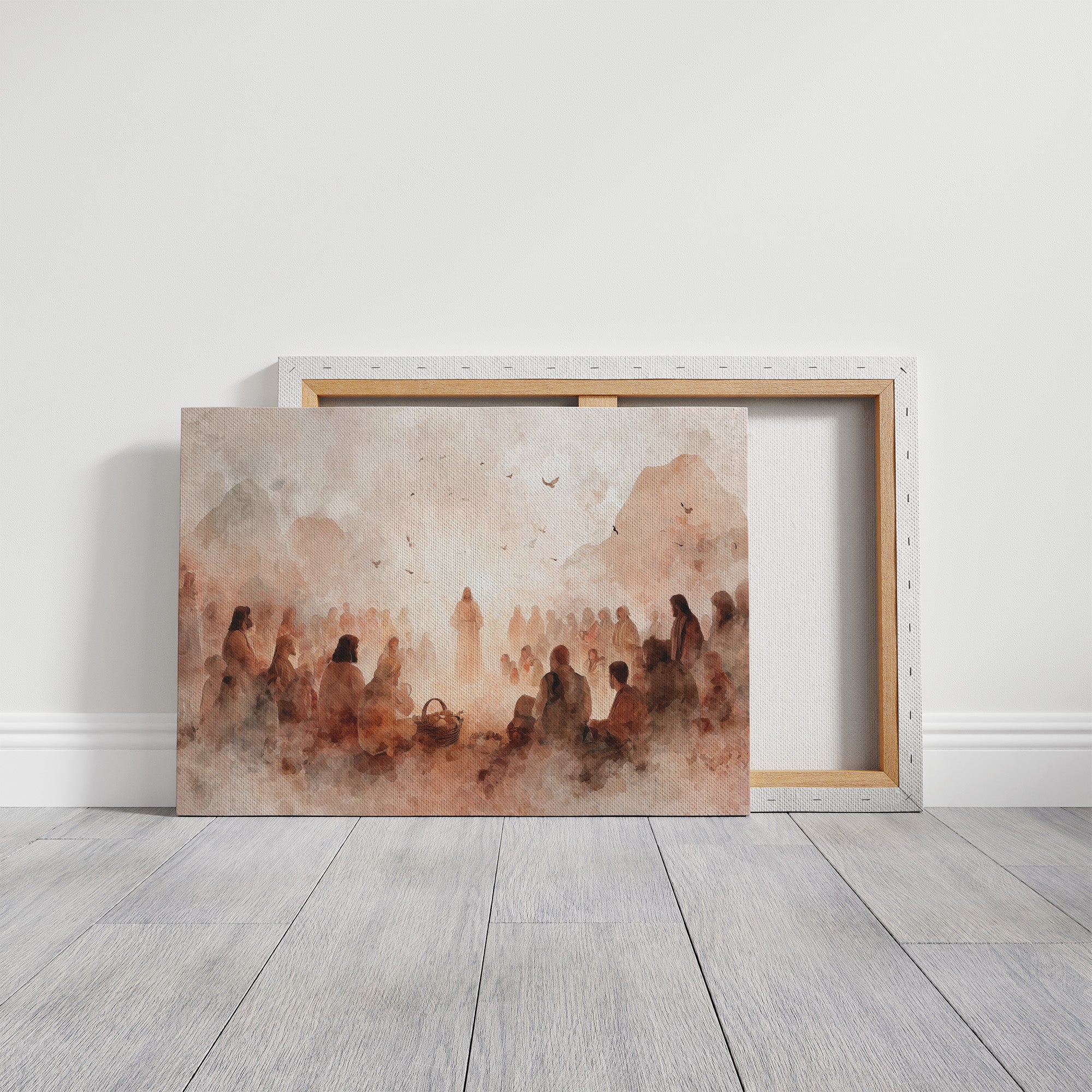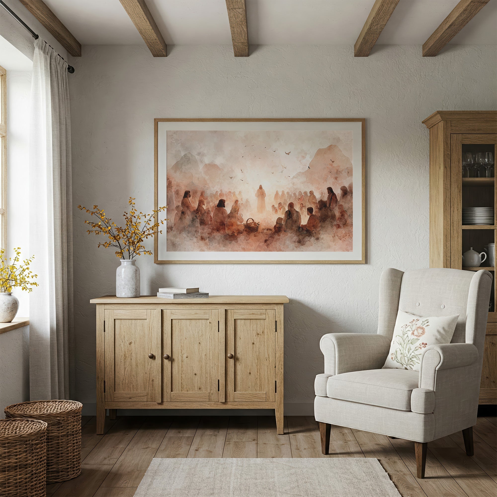 Muted peach tones wash over a gathering of figures, their forms softly blending into a hazy dreamscape. The central figure stands illuminated, creating a focal point that draws the eye through layers of ethereal color and delicate silhouettes. Mountain shadows frame the scene while birds soar overhead, adding movement to this tranquil spiritual narrative. Perfect for a reading nook or meditation space where its gentle palette and contemplative scene can inspire moments of reflection.